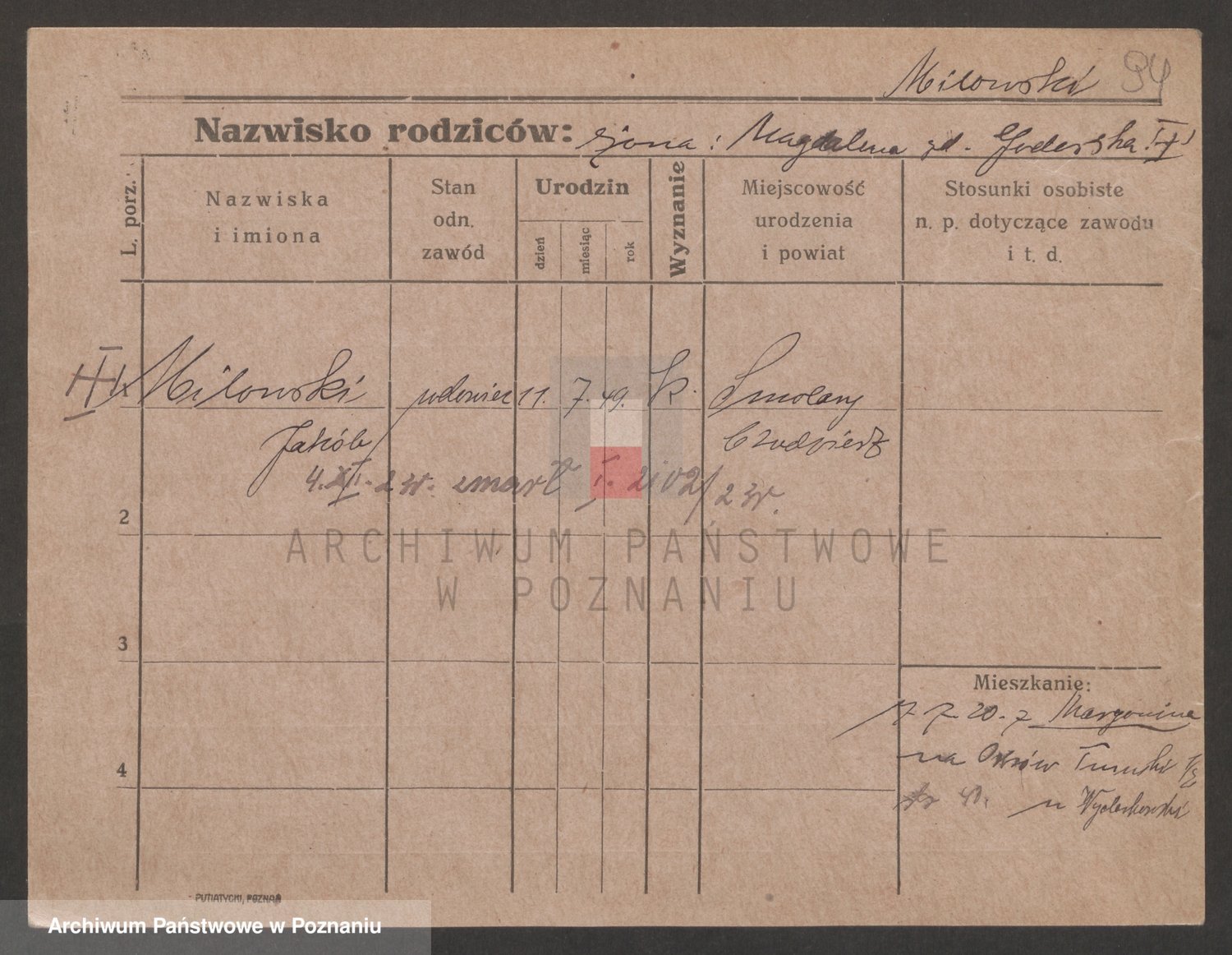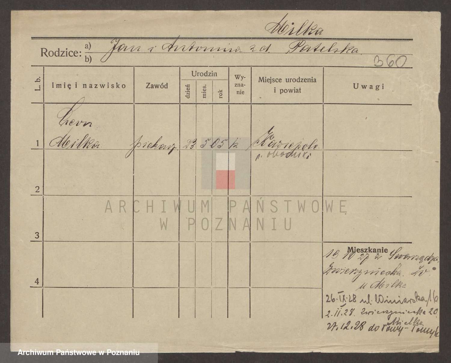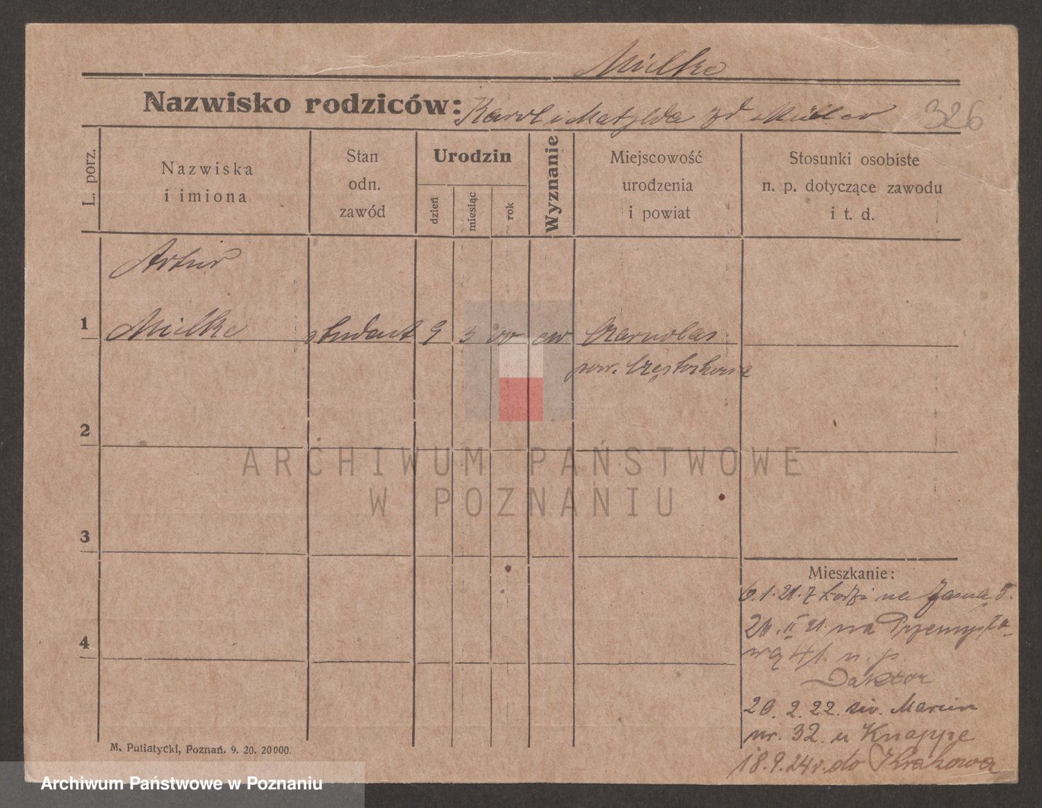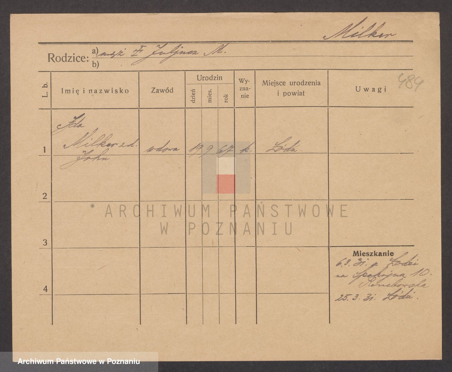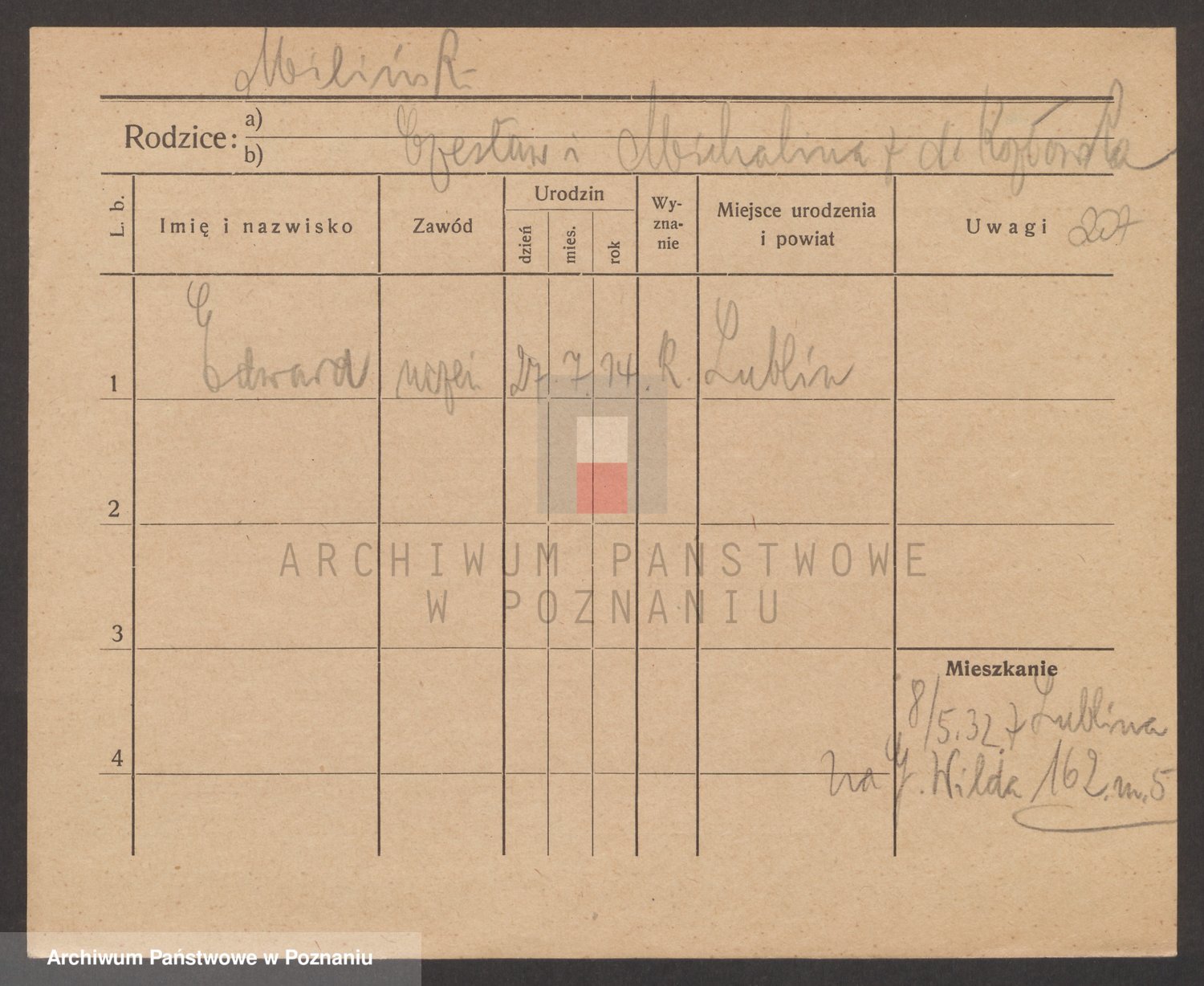 Podgląd karty osobowej dostępny jest po kliknięciu na nazwisko lub ikonkę karty. Można dokonywać powiększenia (ikony na górze) lub przechodzić między kolejnymi skanami (strzałki po bokach).