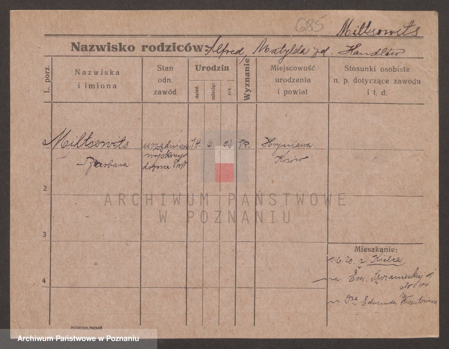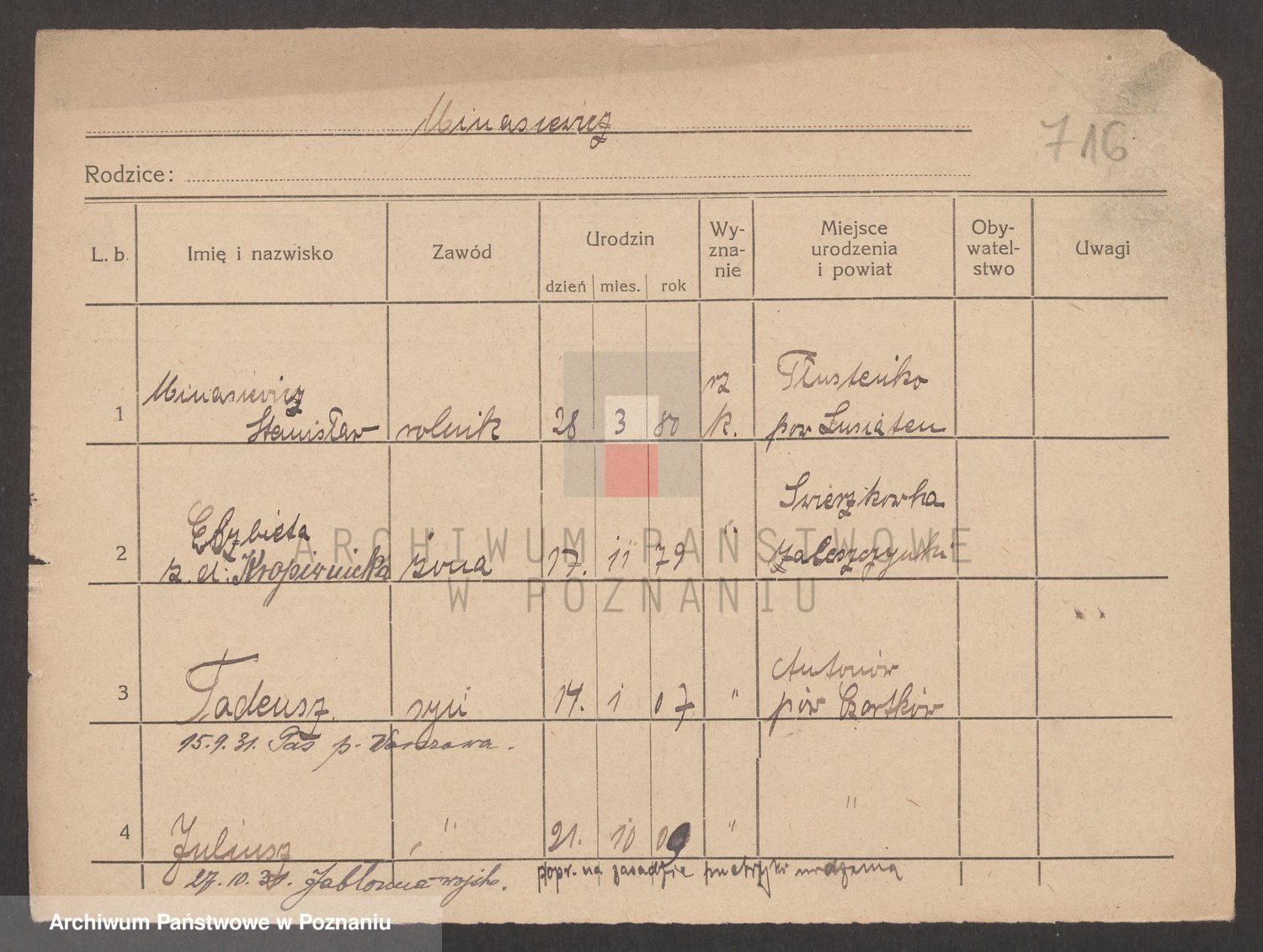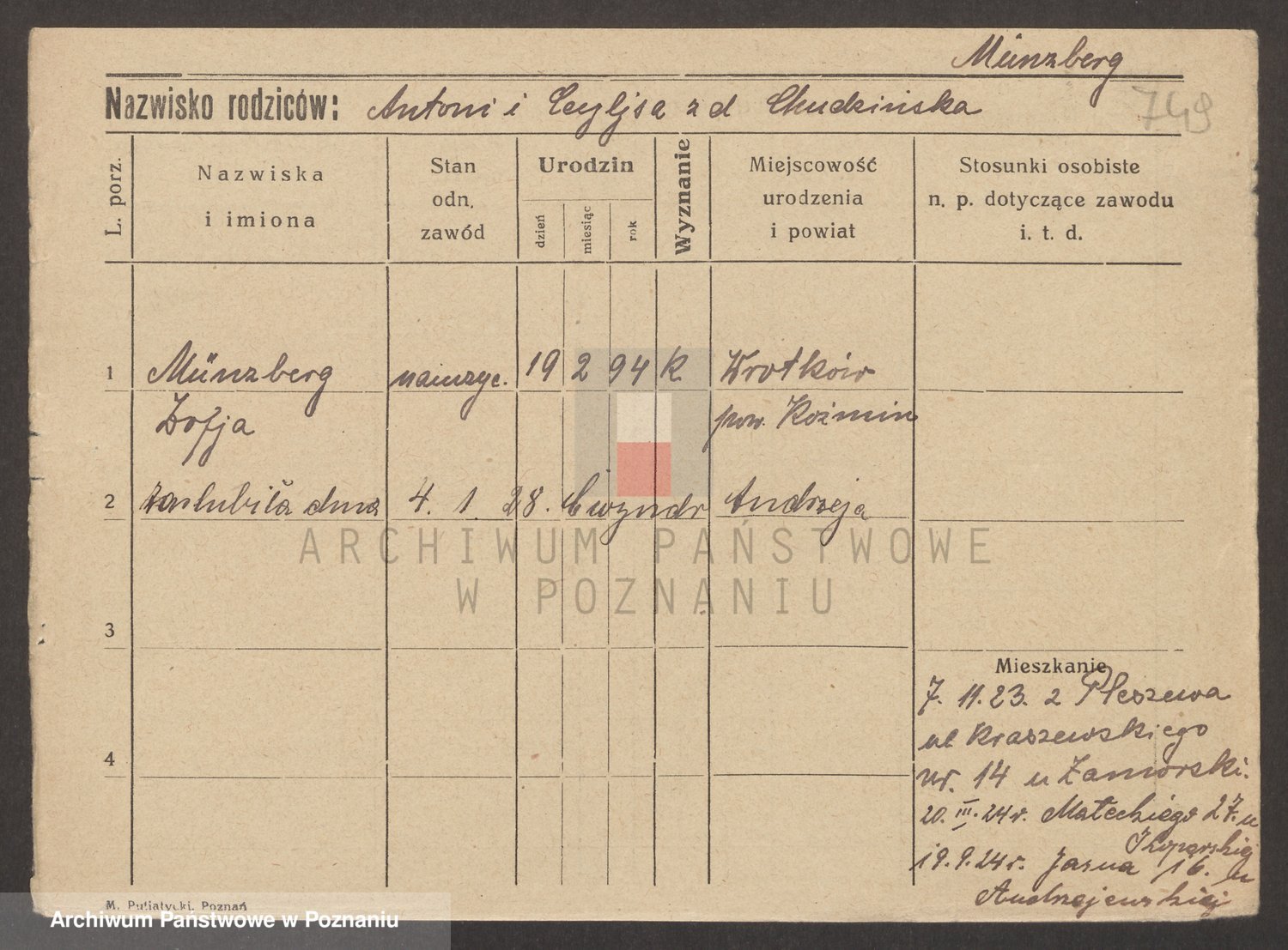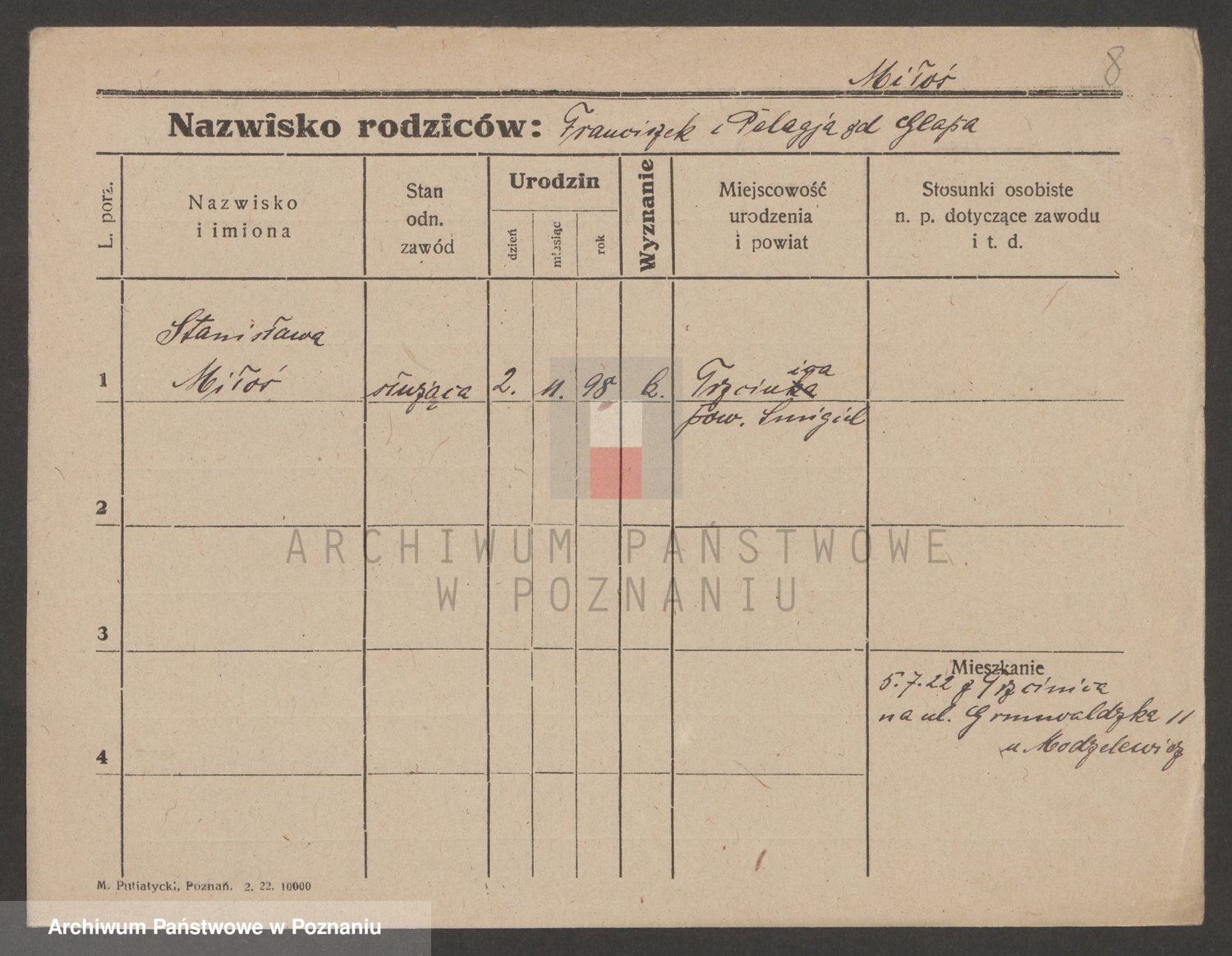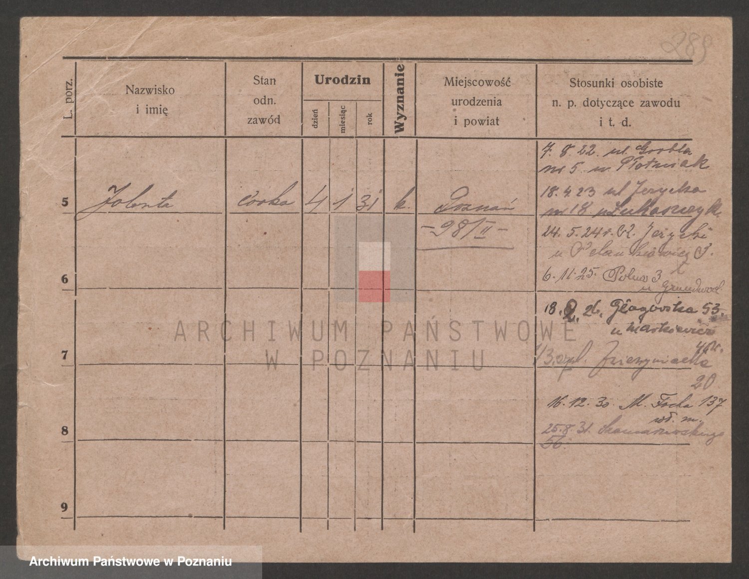 Podgląd karty osobowej dostępny jest po kliknięciu na nazwisko lub ikonkę karty. Można dokonywać powiększenia (ikony na górze) lub przechodzić między kolejnymi skanami (strzałki po bokach).