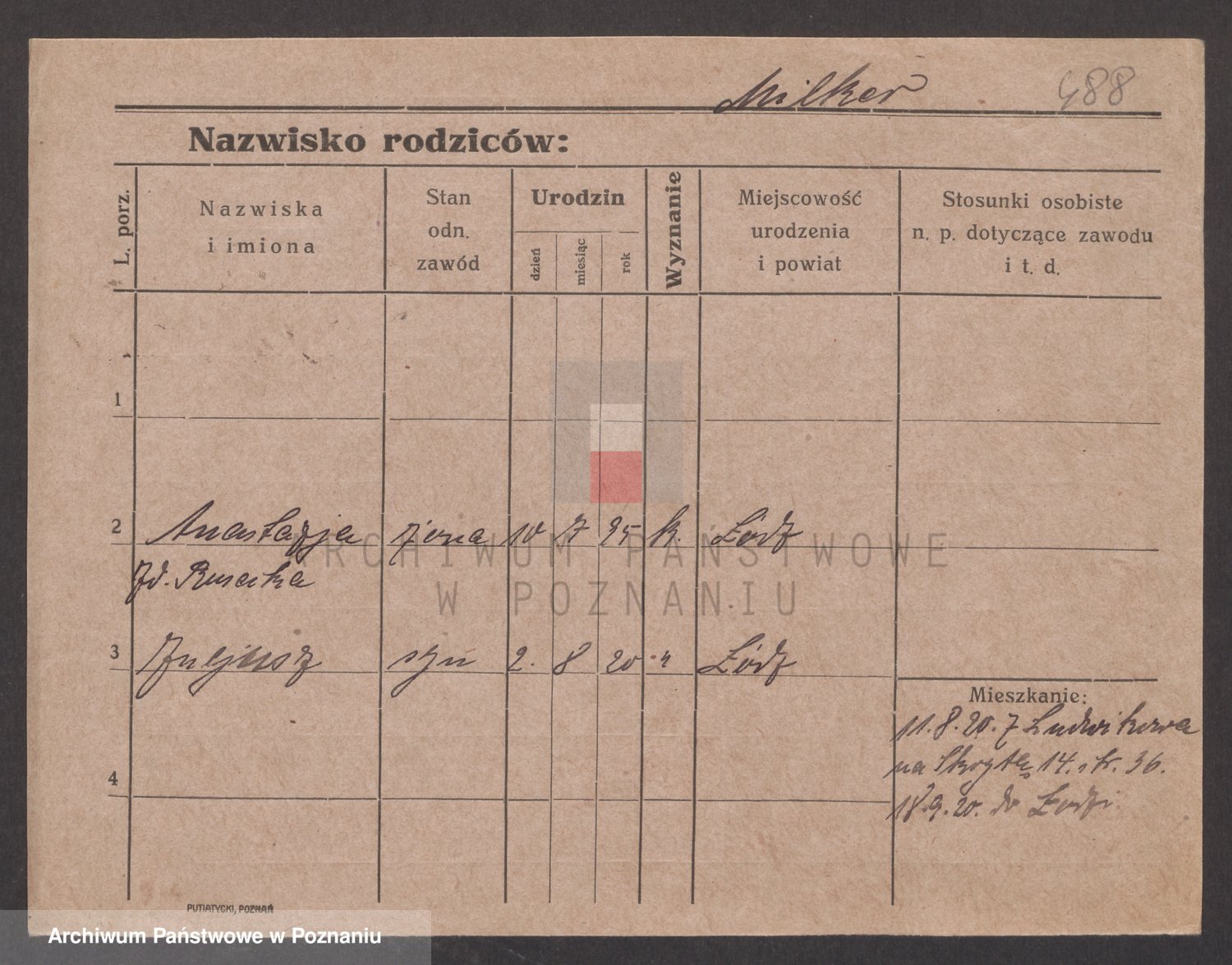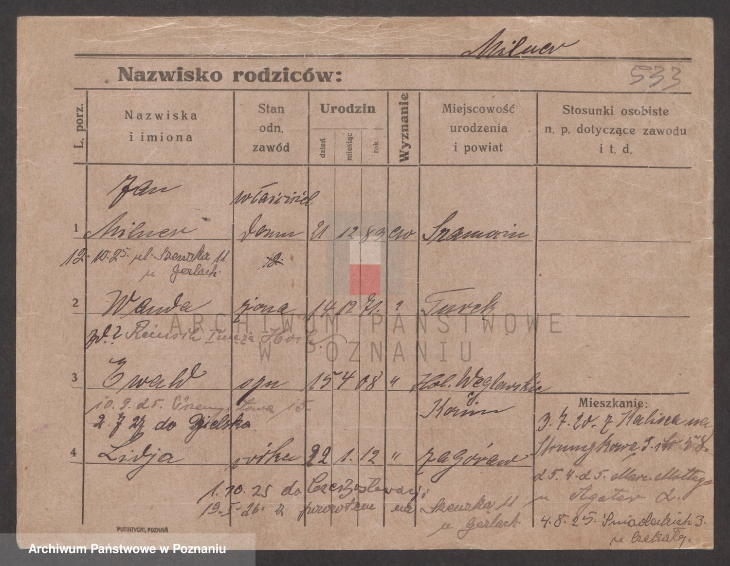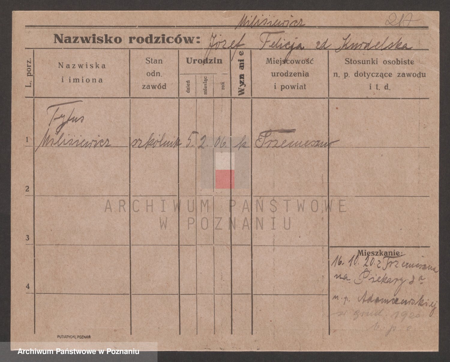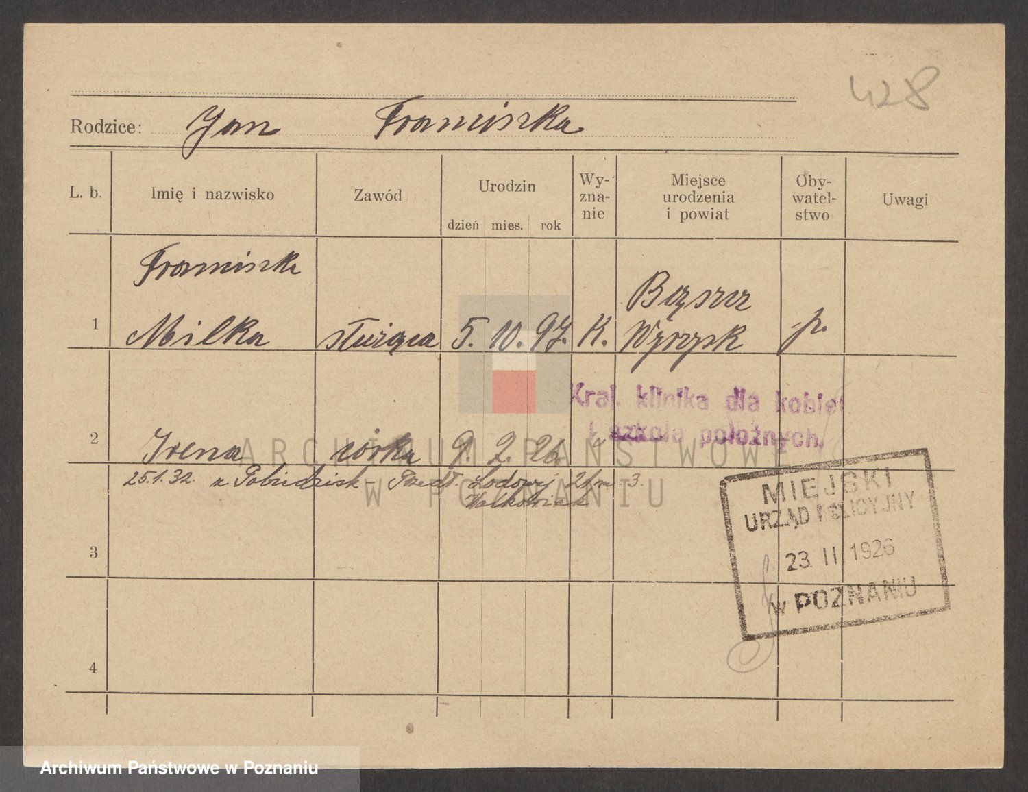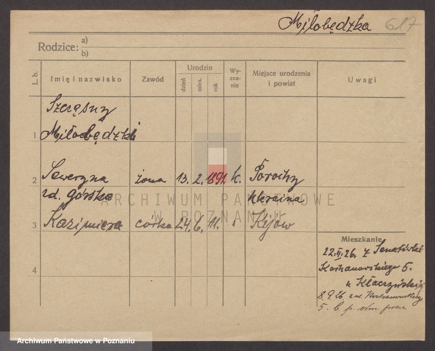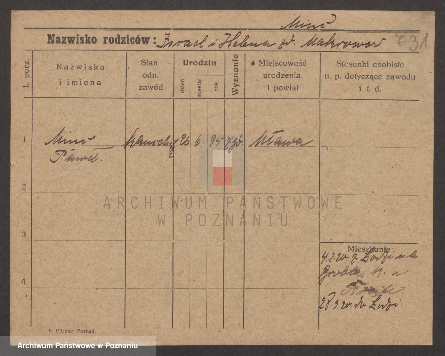 Podgląd karty osobowej dostępny jest po kliknięciu na nazwisko lub ikonkę karty. Można dokonywać powiększenia (ikony na górze) lub przechodzić między kolejnymi skanami (strzałki po bokach).
