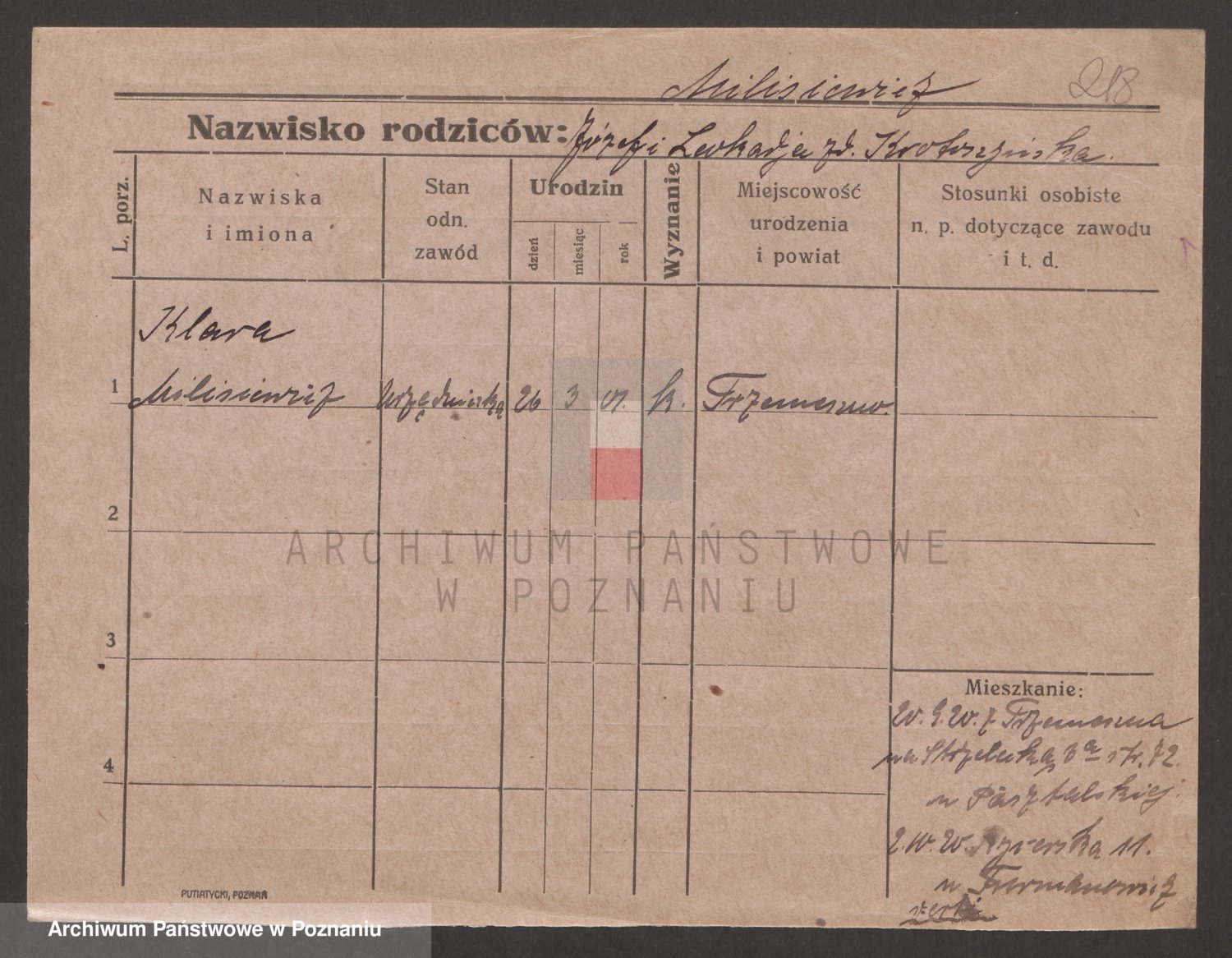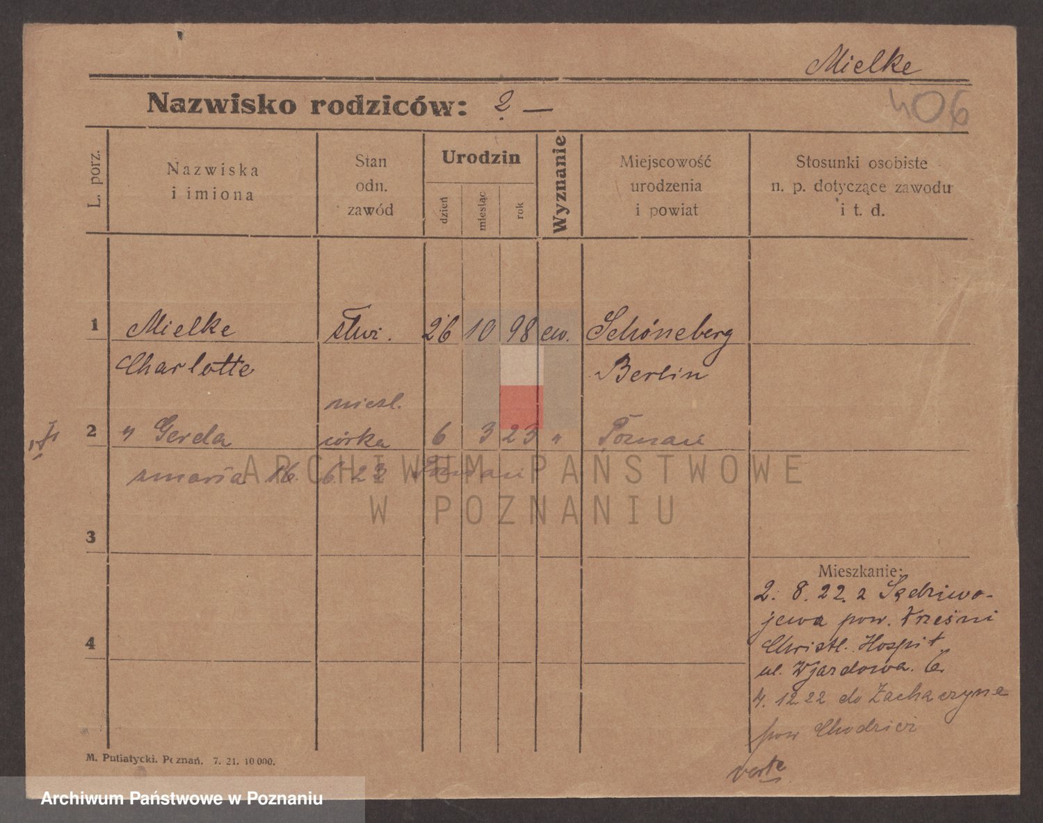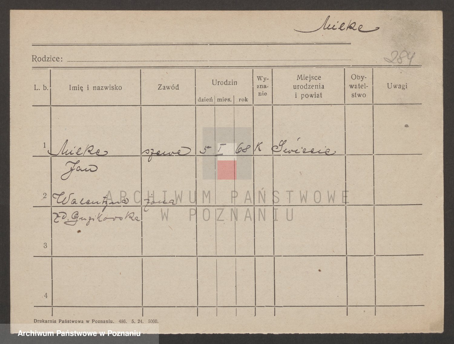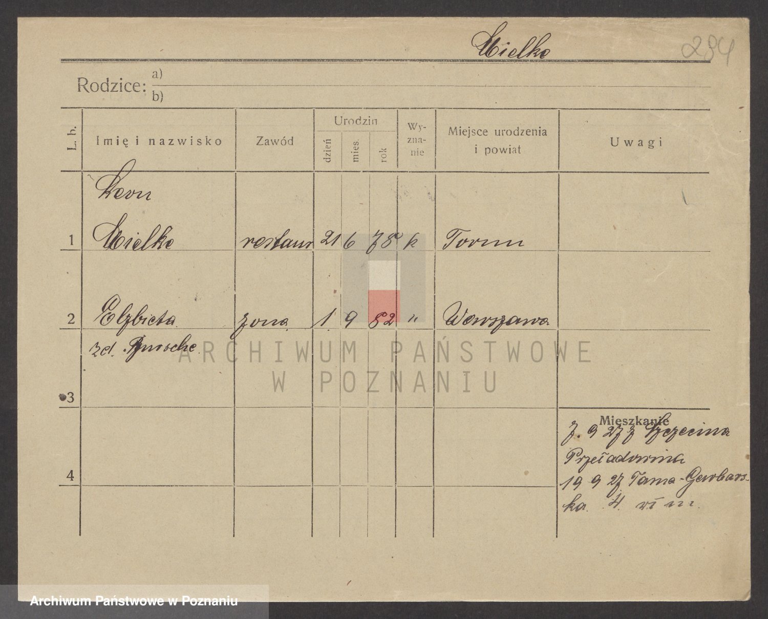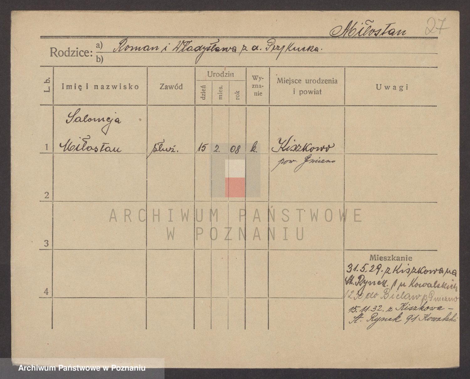 Podgląd karty osobowej dostępny jest po kliknięciu na nazwisko lub ikonkę karty. Można dokonywać powiększenia (ikony na górze) lub przechodzić między kolejnymi skanami (strzałki po bokach).