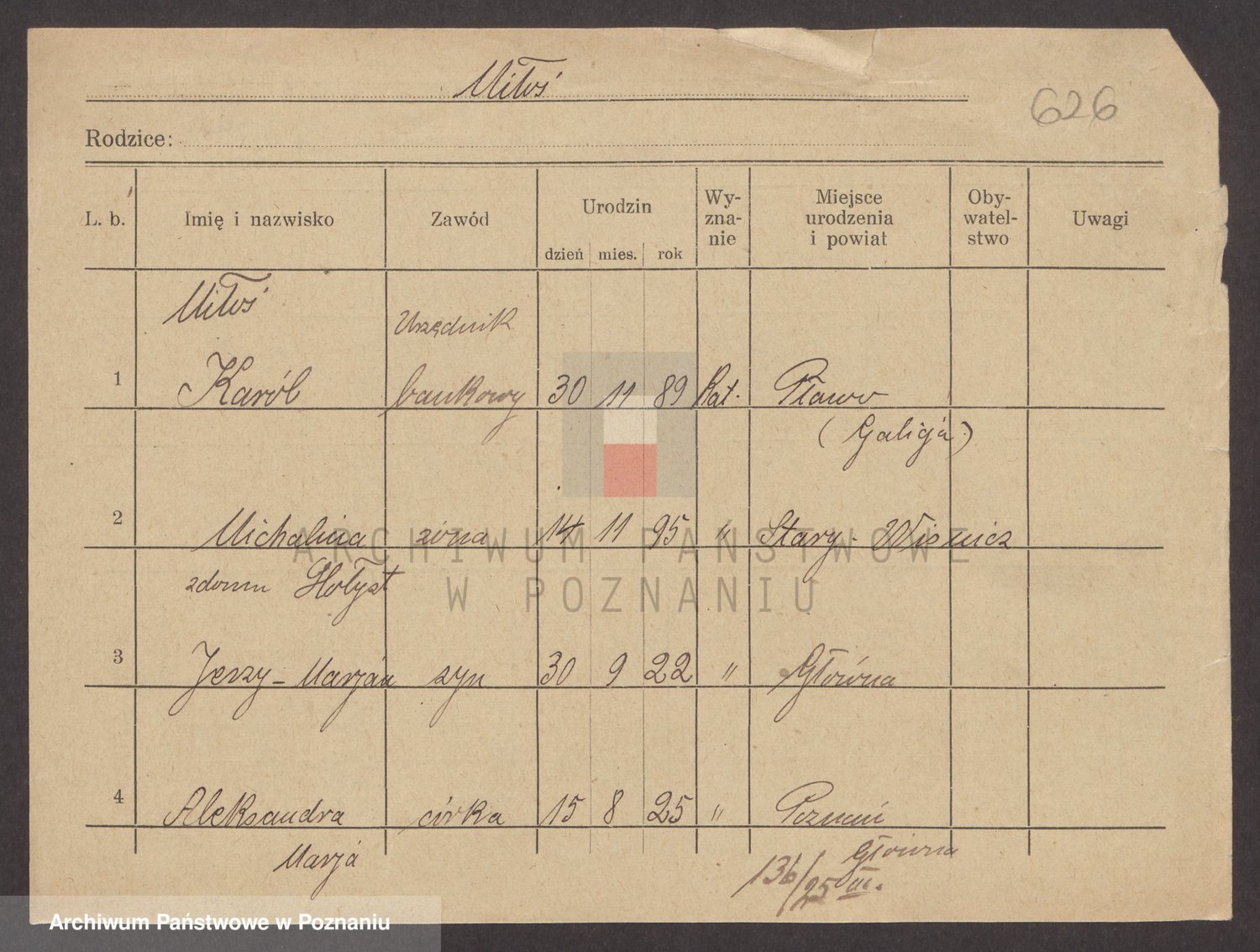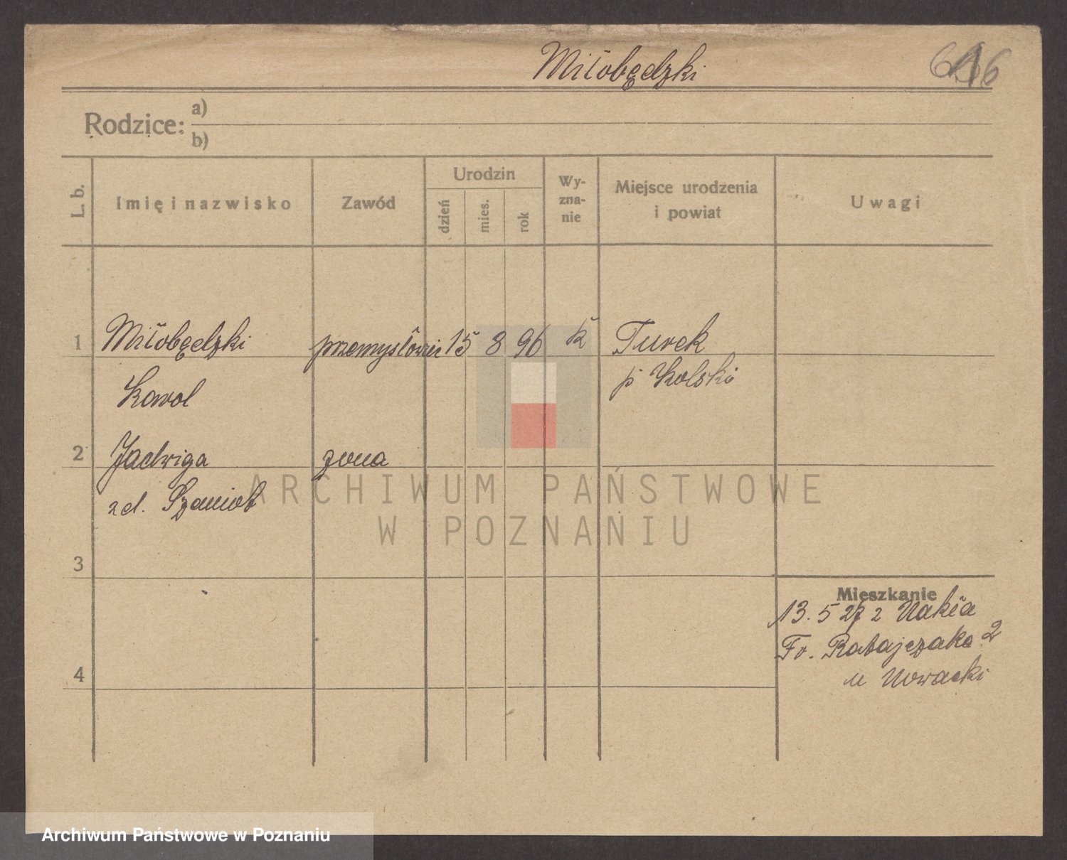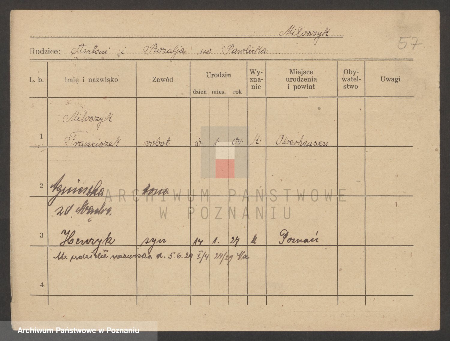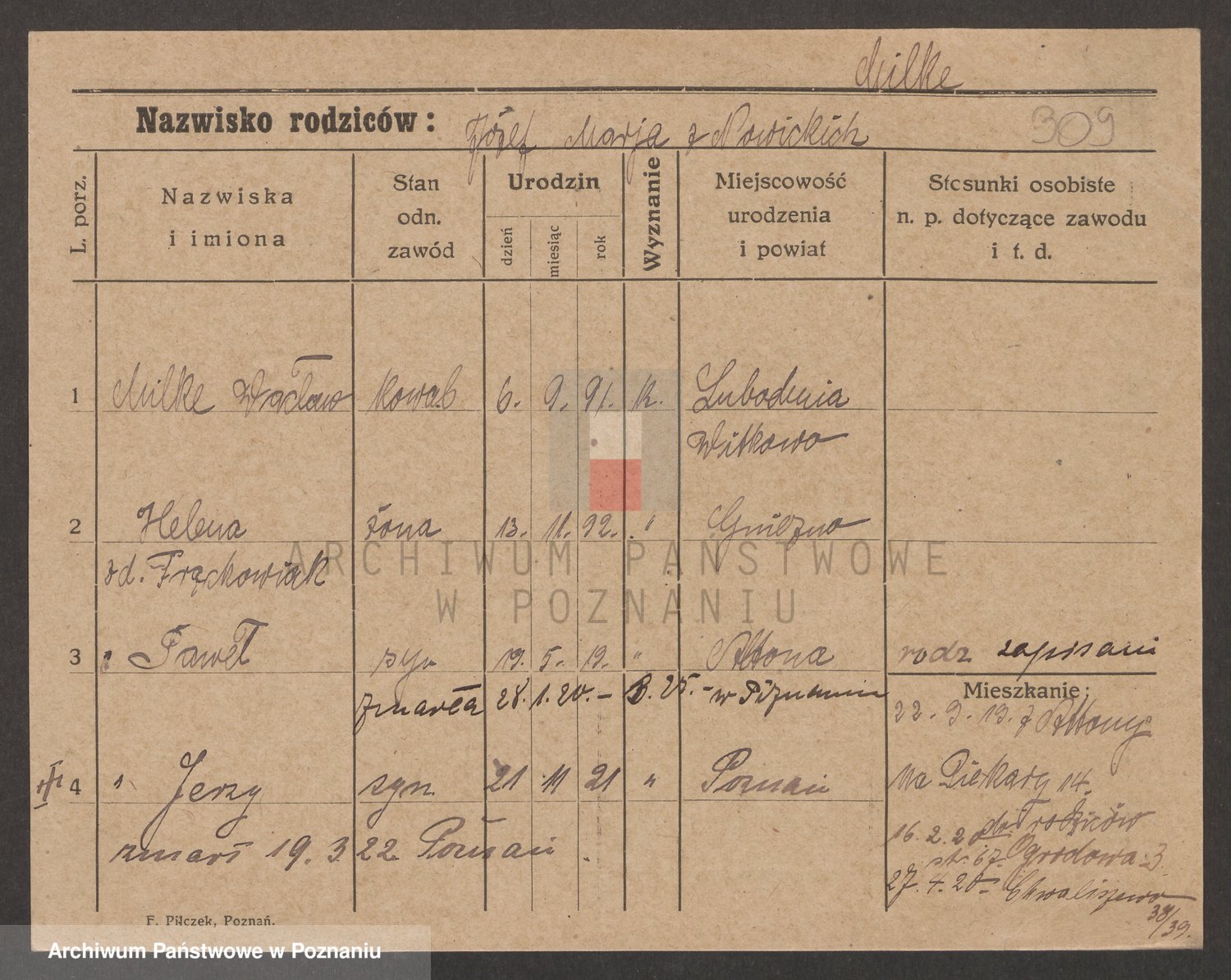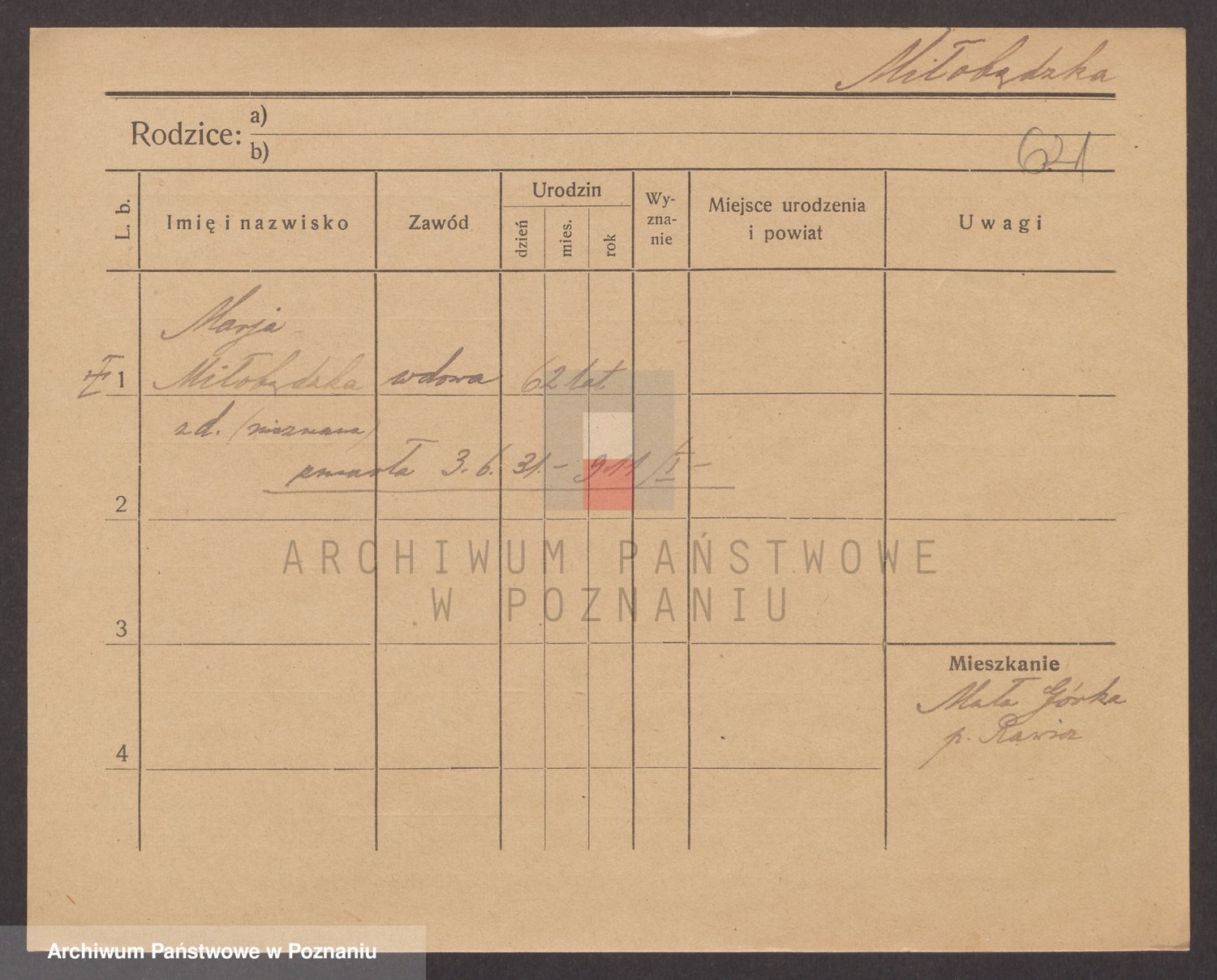 Podgląd karty osobowej dostępny jest po kliknięciu na nazwisko lub ikonkę karty. Można dokonywać powiększenia (ikony na górze) lub przechodzić między kolejnymi skanami (strzałki po bokach).