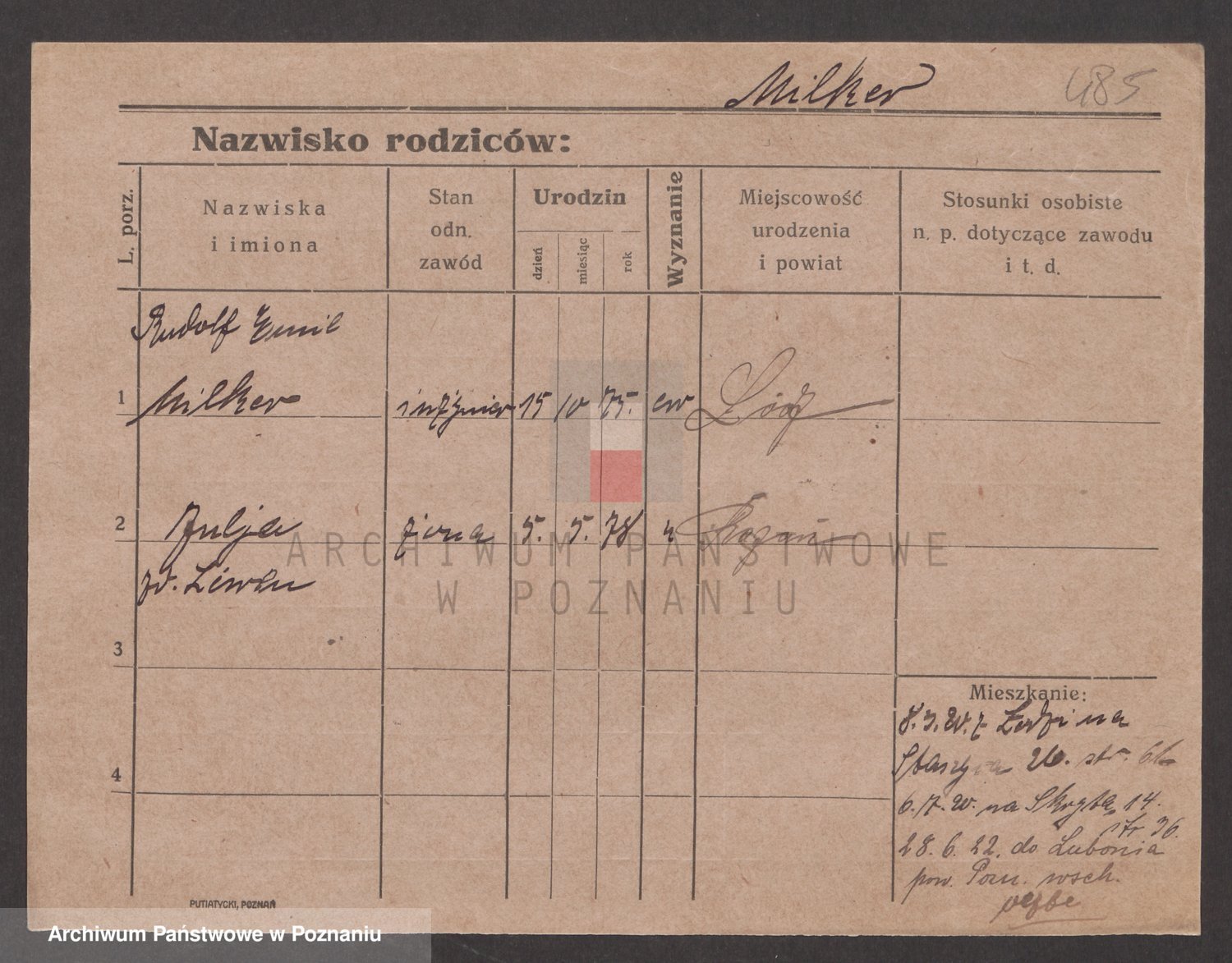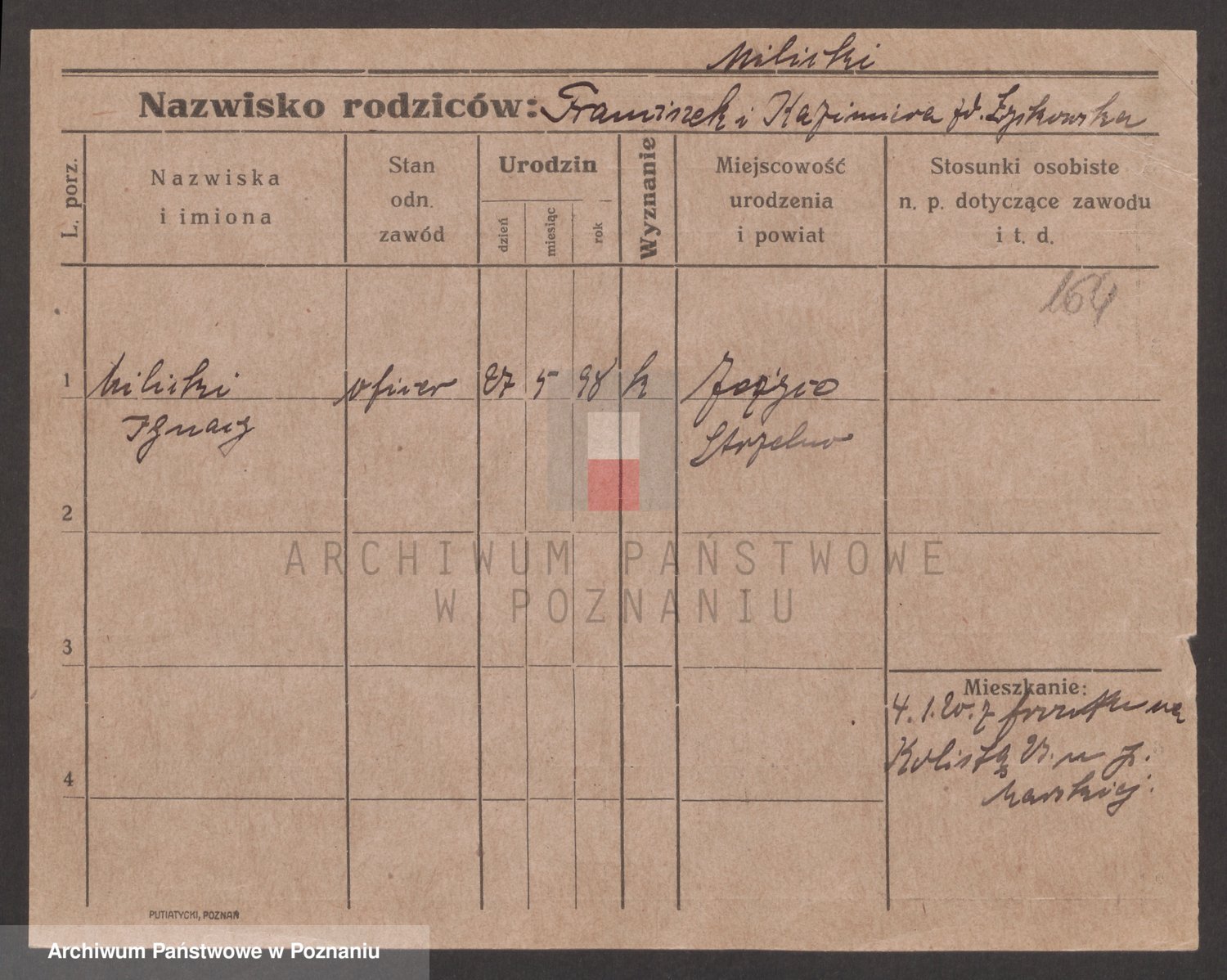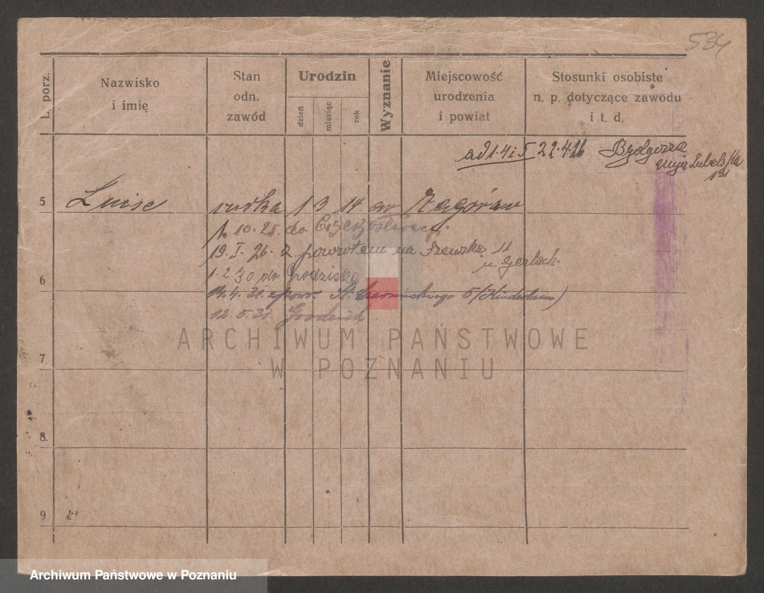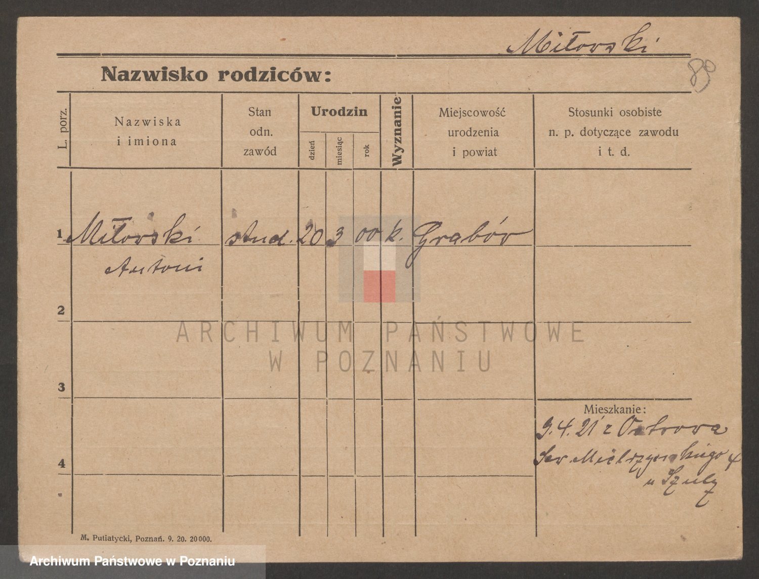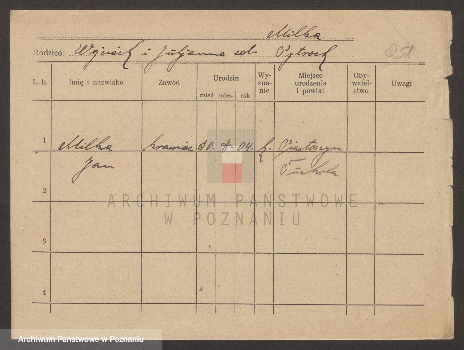Podgląd karty osobowej dostępny jest po kliknięciu na nazwisko lub ikonkę karty. Można dokonywać powiększenia (ikony na górze) lub przechodzić między kolejnymi skanami (strzałki po bokach).