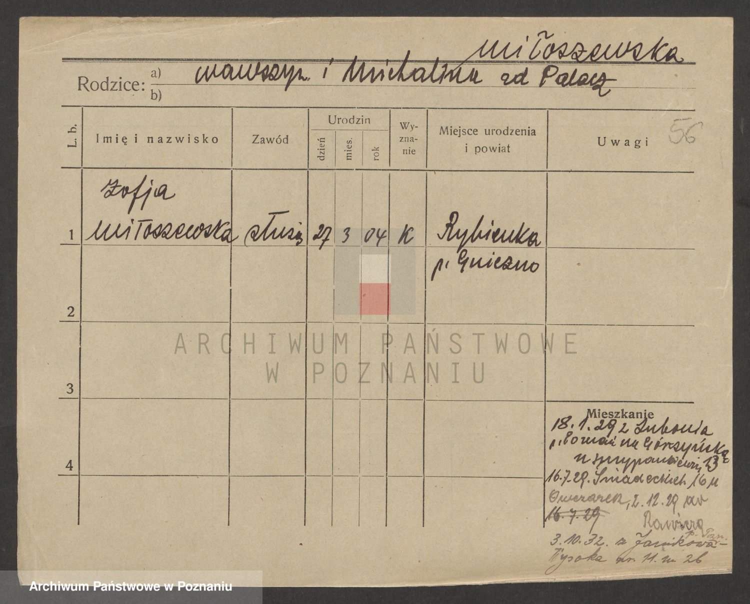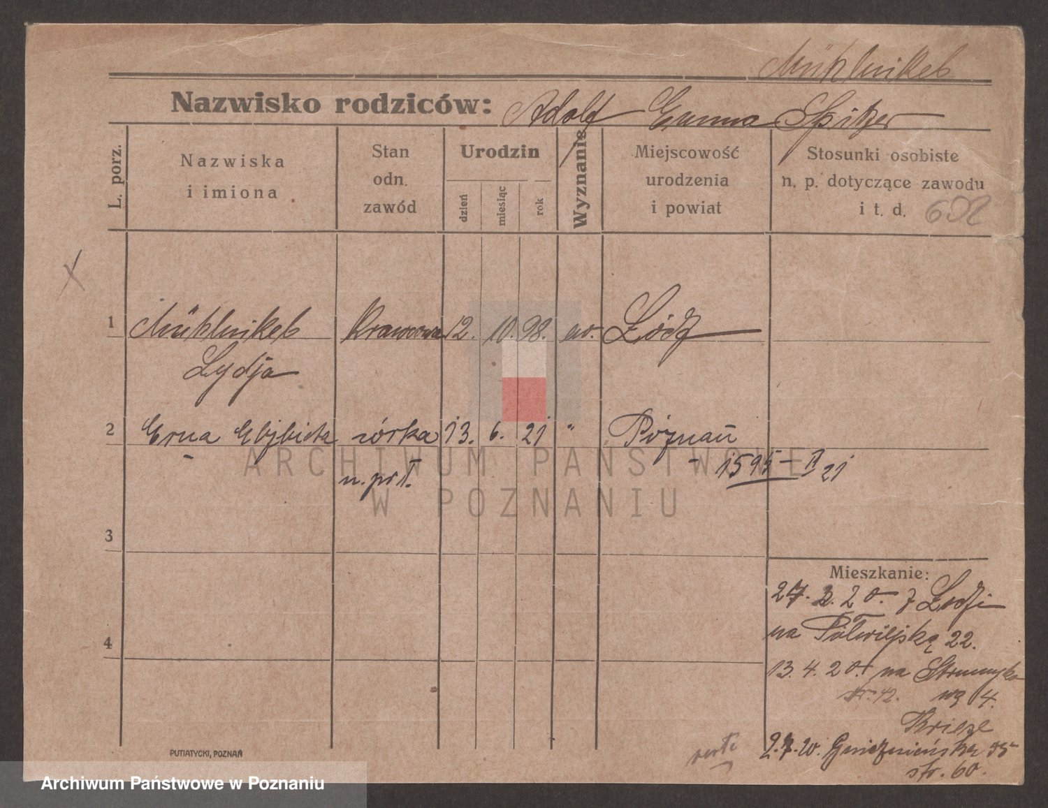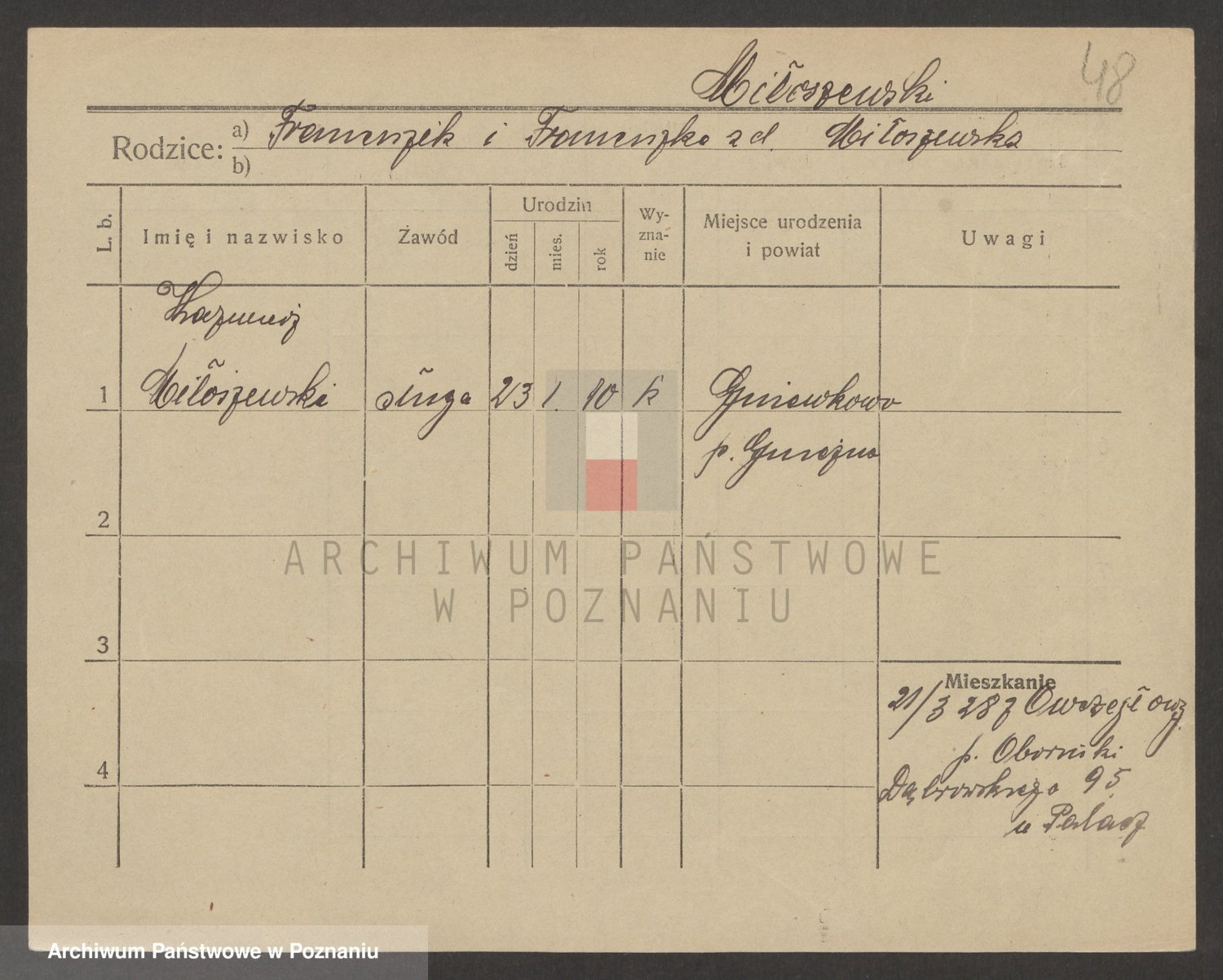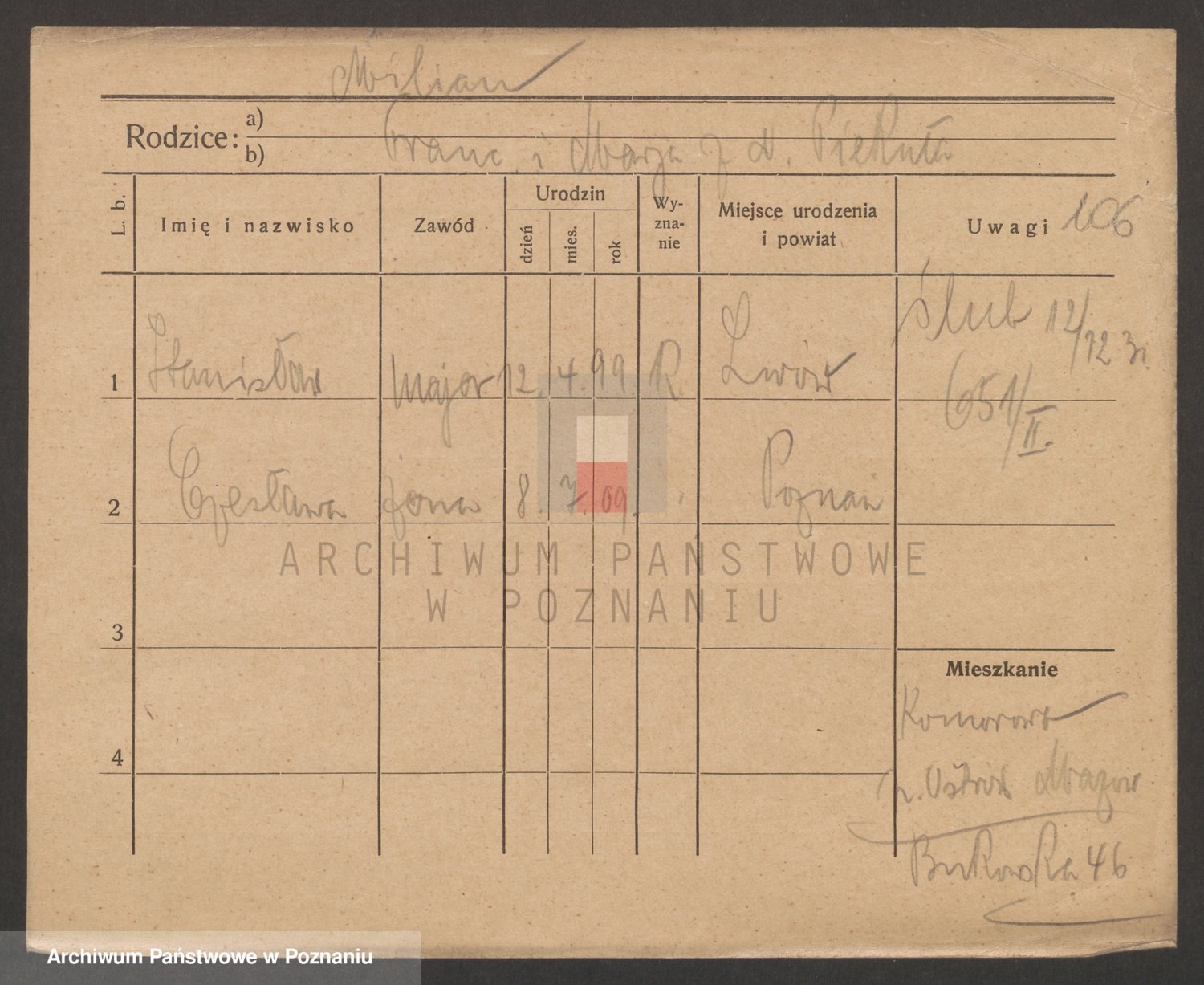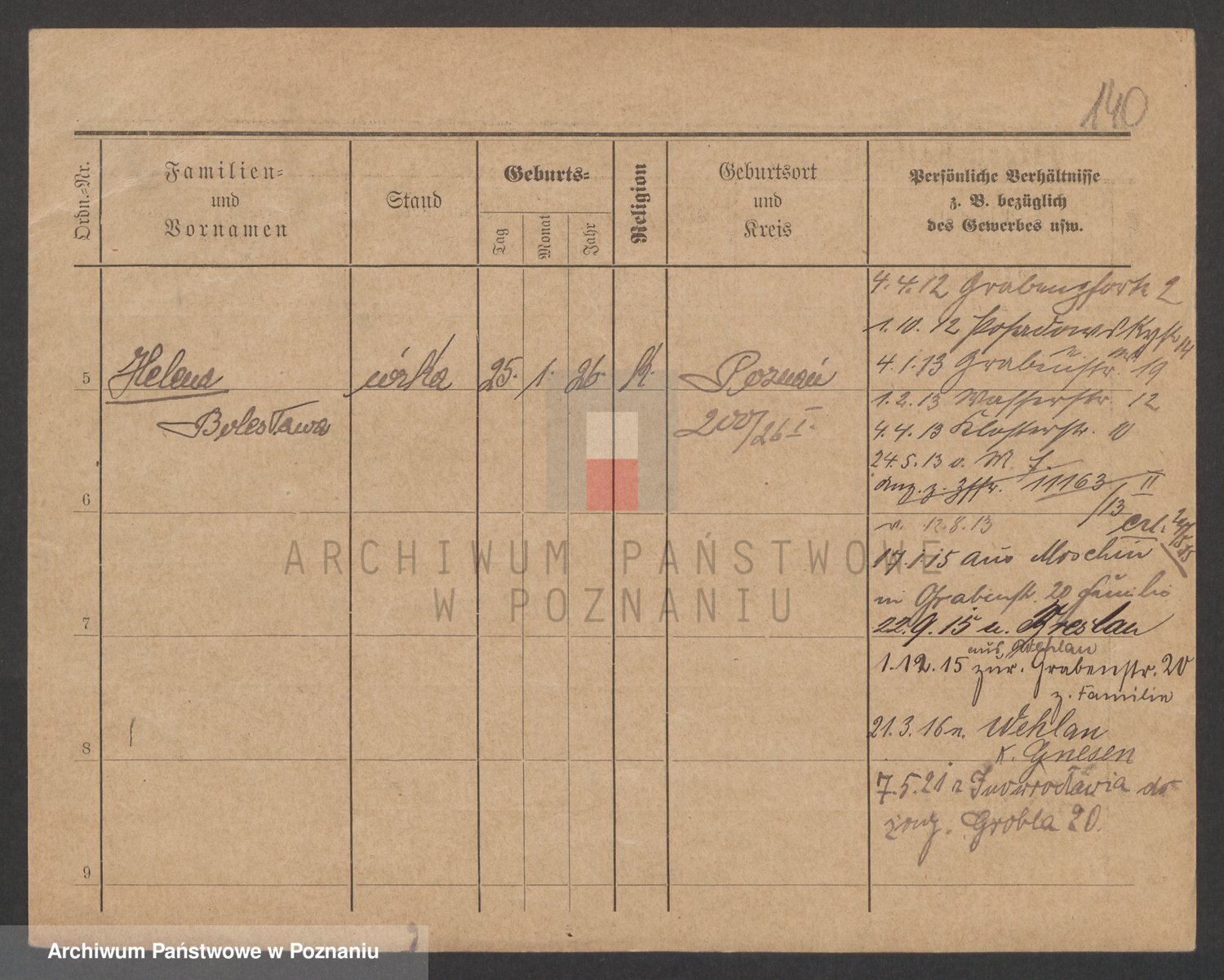 Podgląd karty osobowej dostępny jest po kliknięciu na nazwisko lub ikonkę karty. Można dokonywać powiększenia (ikony na górze) lub przechodzić między kolejnymi skanami (strzałki po bokach).