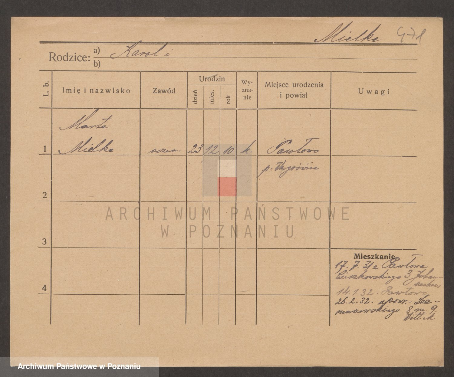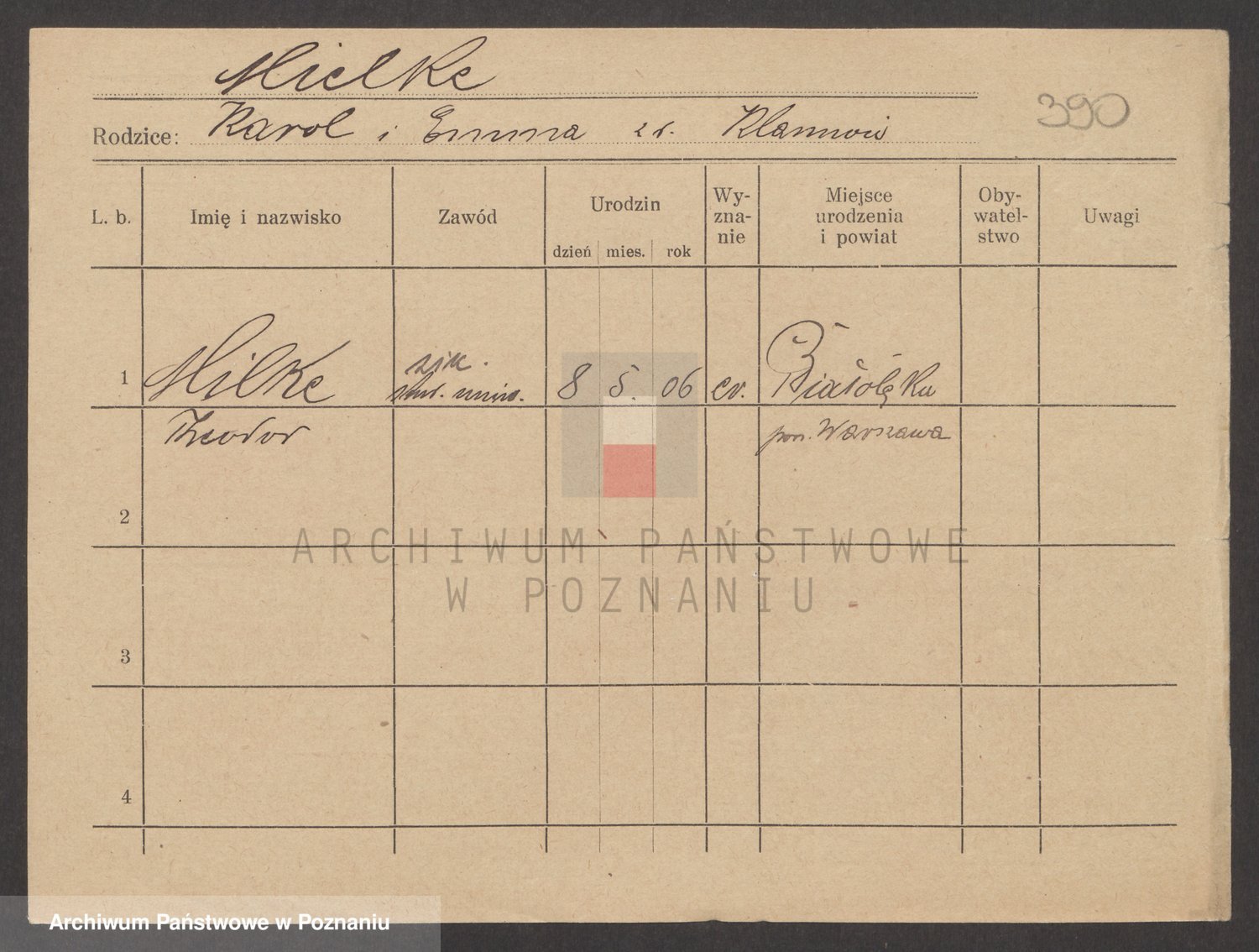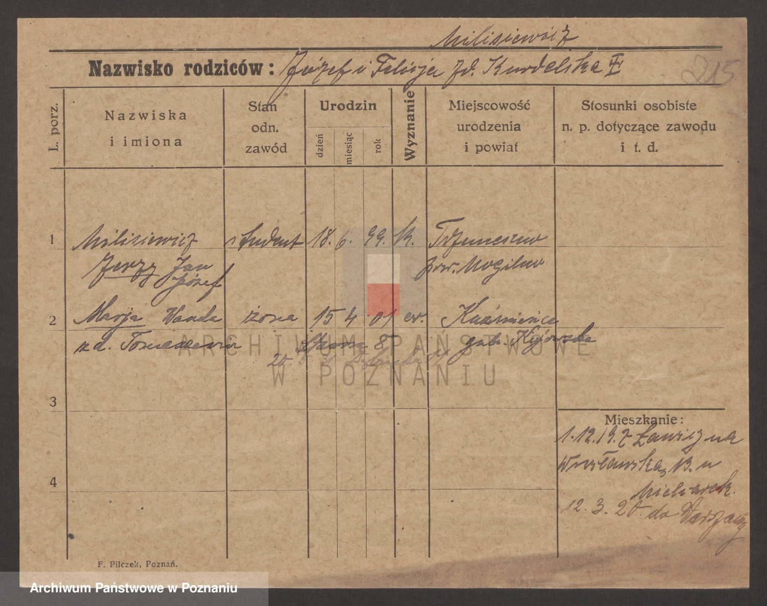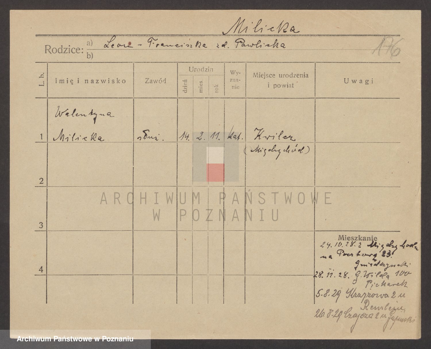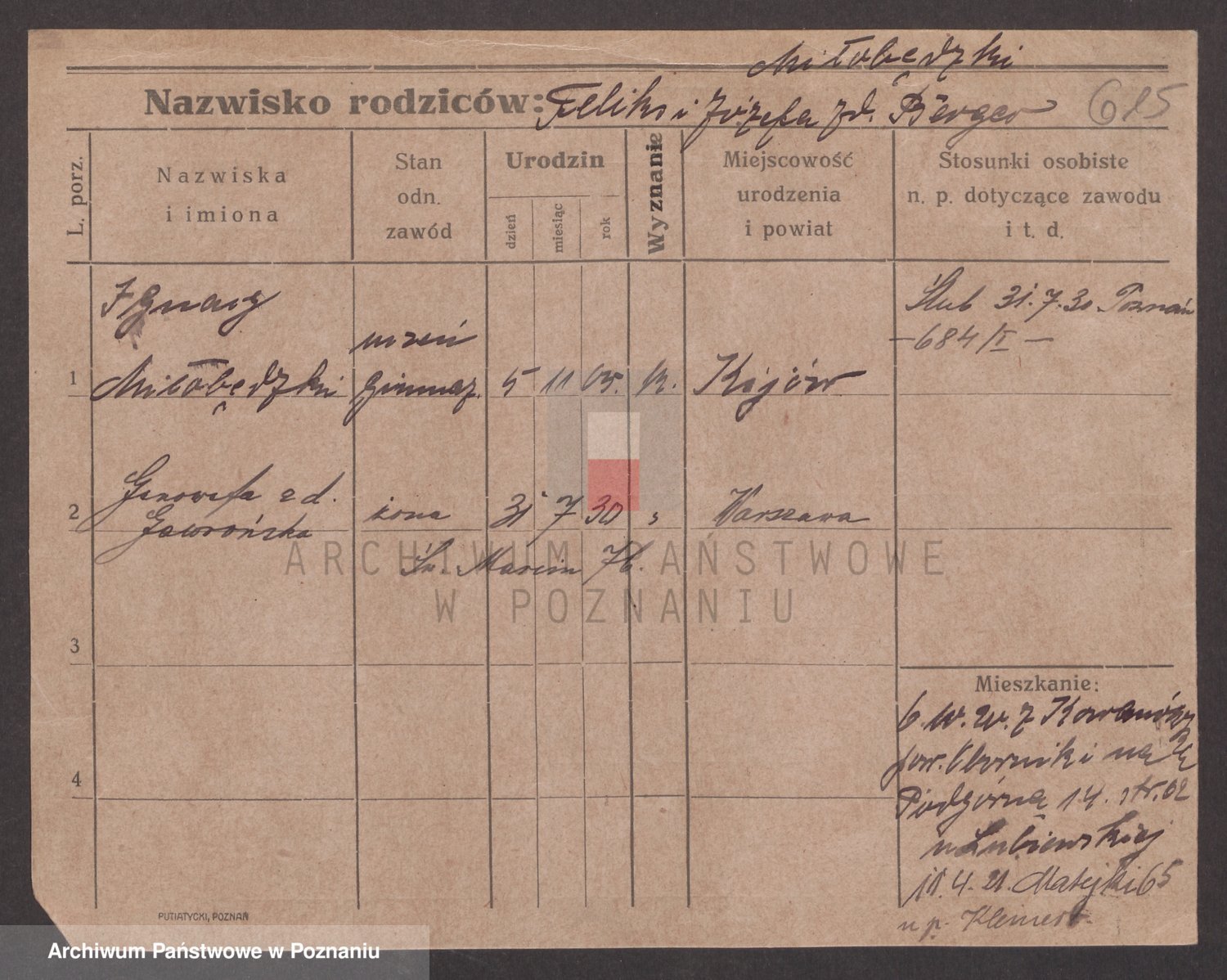 Podgląd karty osobowej dostępny jest po kliknięciu na nazwisko lub ikonkę karty. Można dokonywać powiększenia (ikony na górze) lub przechodzić między kolejnymi skanami (strzałki po bokach).