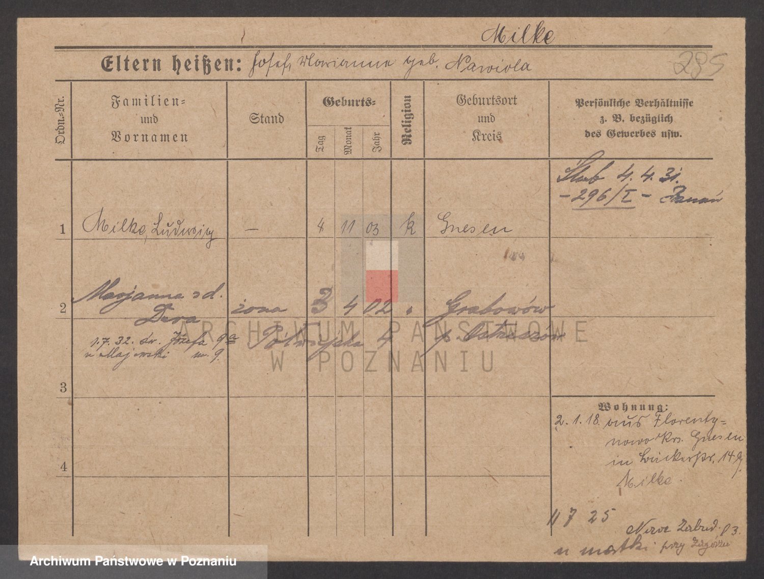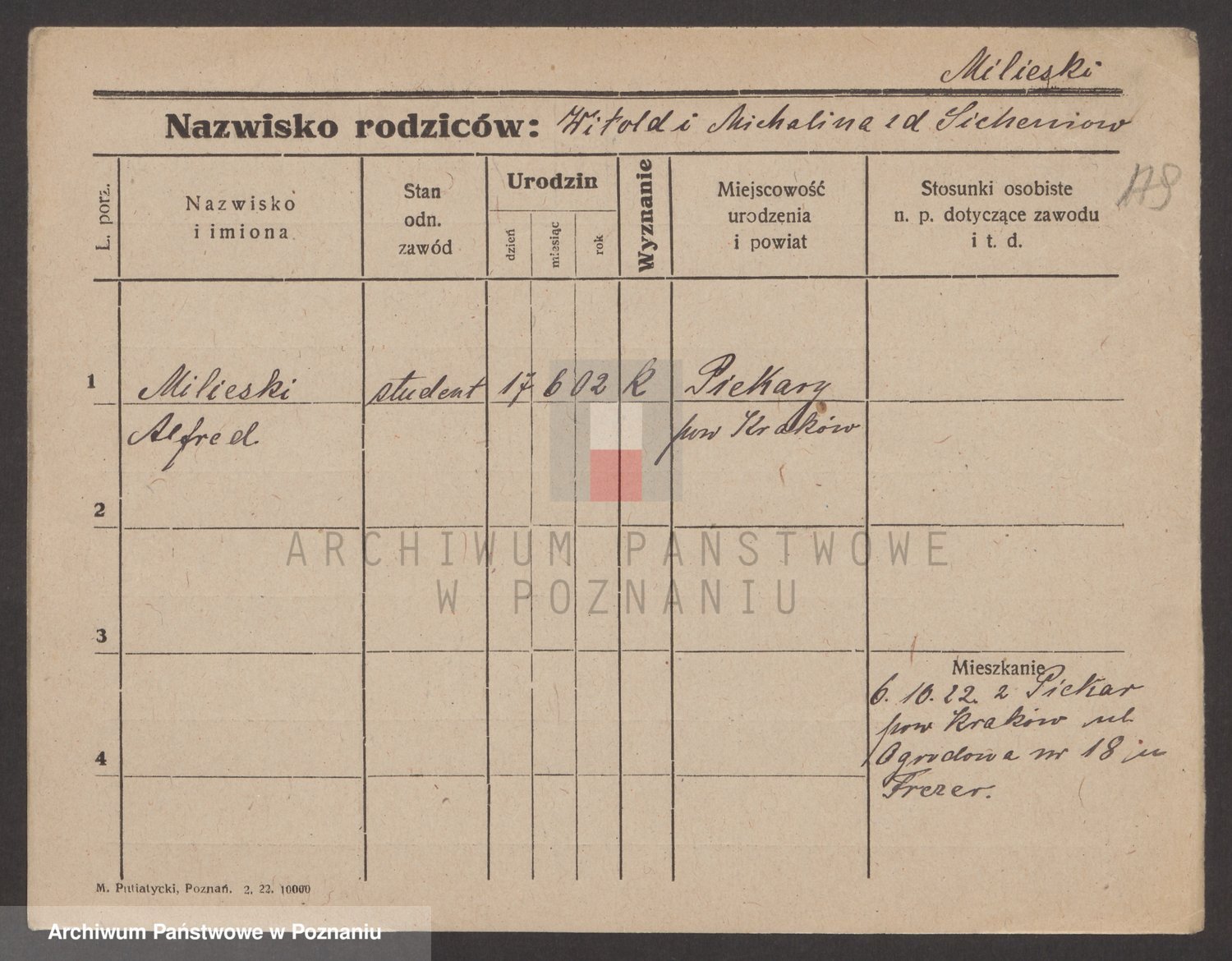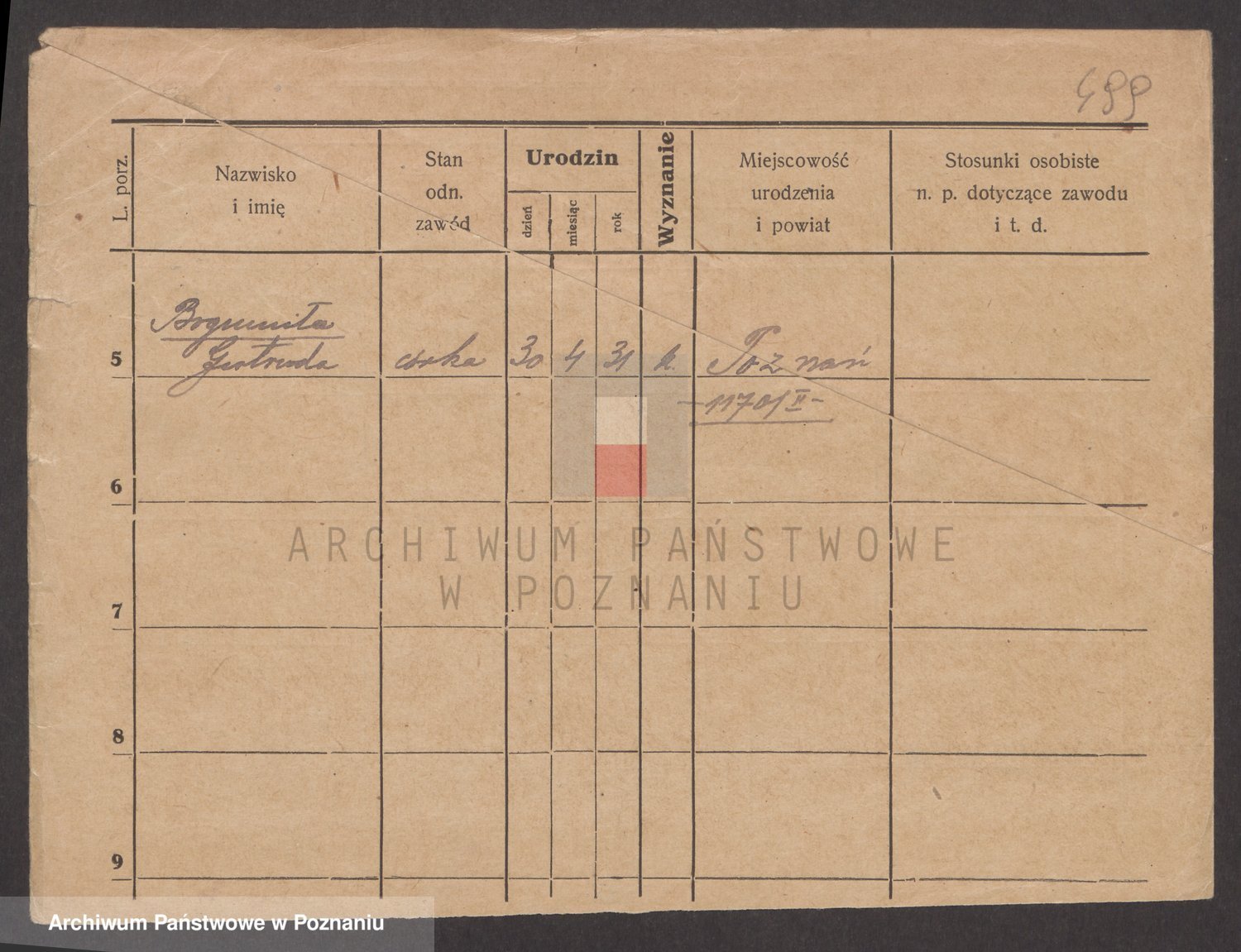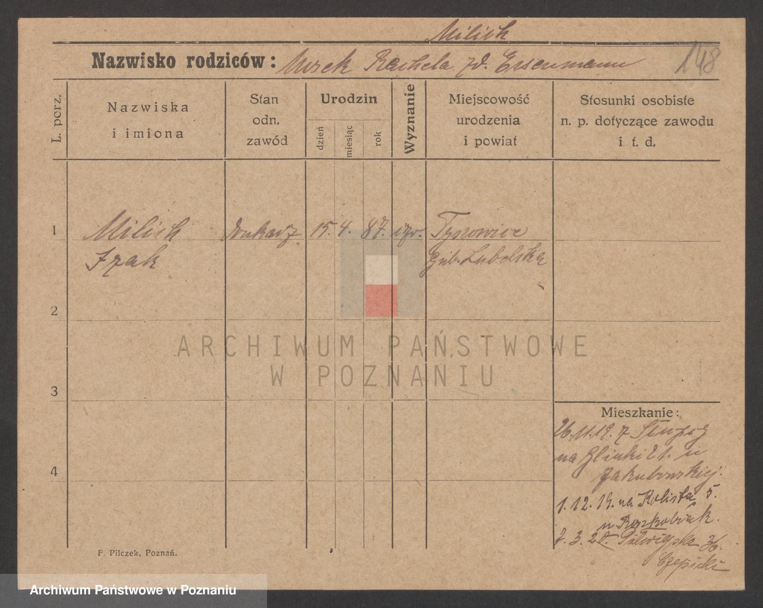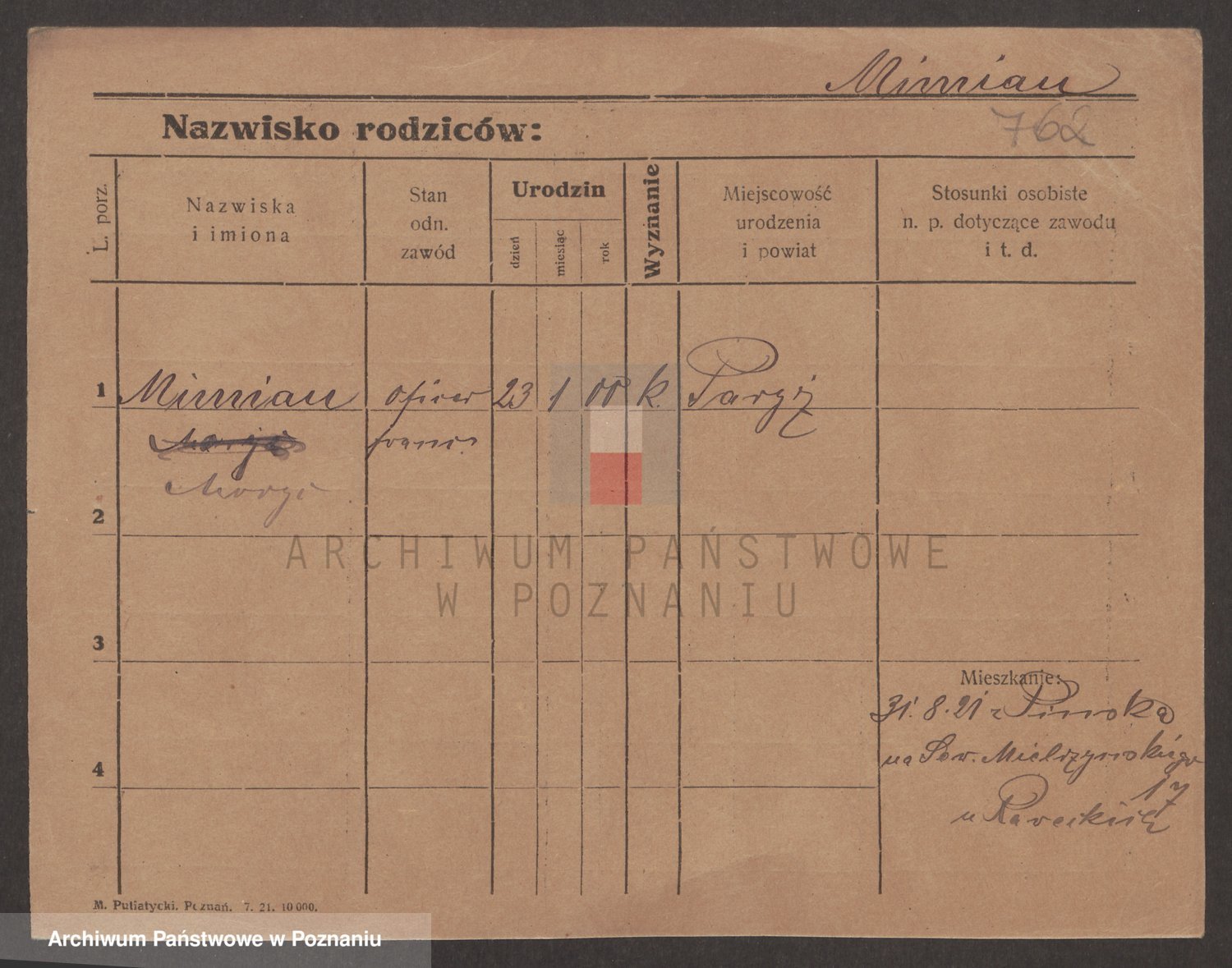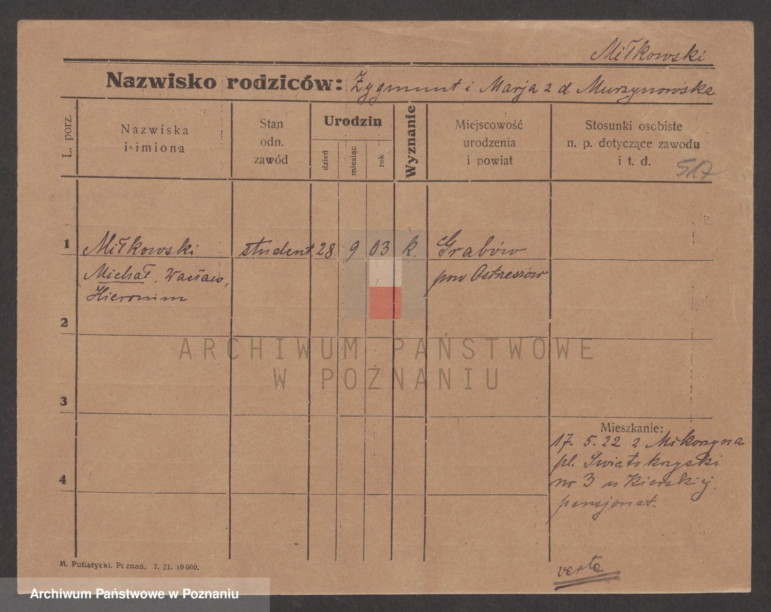 Podgląd karty osobowej dostępny jest po kliknięciu na nazwisko lub ikonkę karty. Można dokonywać powiększenia (ikony na górze) lub przechodzić między kolejnymi skanami (strzałki po bokach).