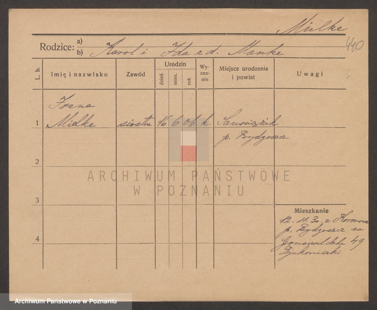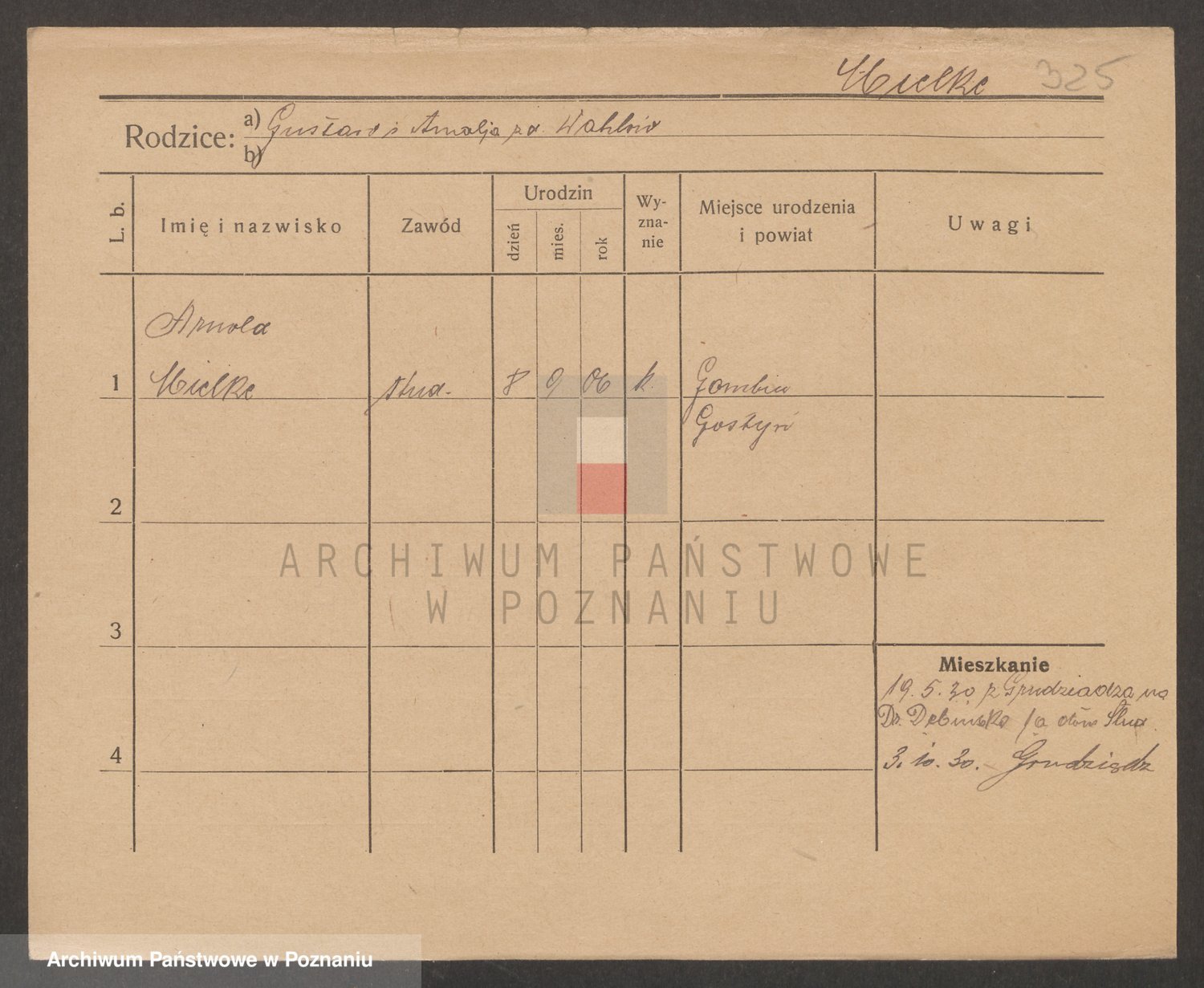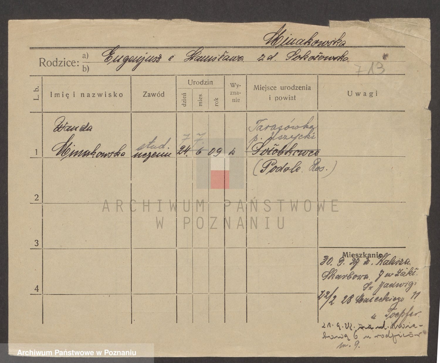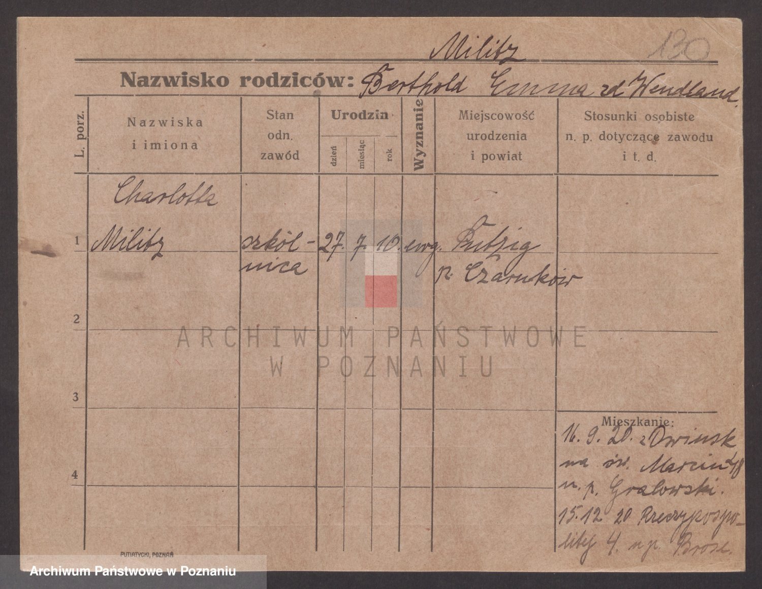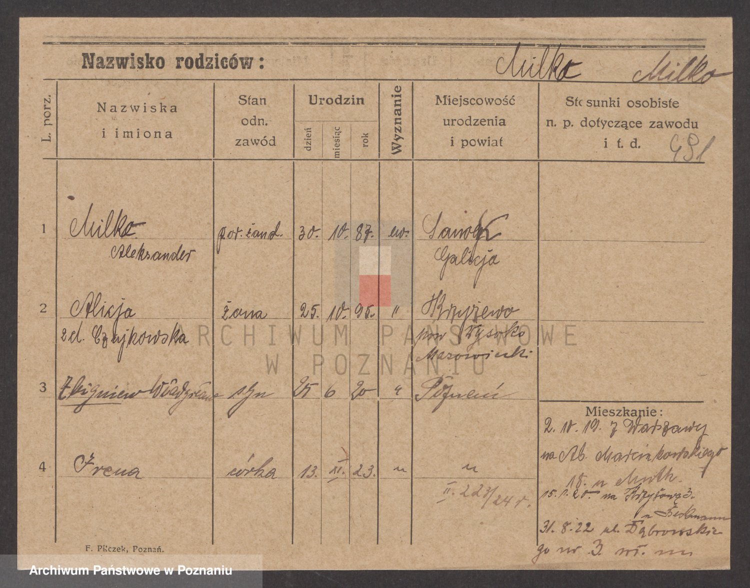 Podgląd karty osobowej dostępny jest po kliknięciu na nazwisko lub ikonkę karty. Można dokonywać powiększenia (ikony na górze) lub przechodzić między kolejnymi skanami (strzałki po bokach).