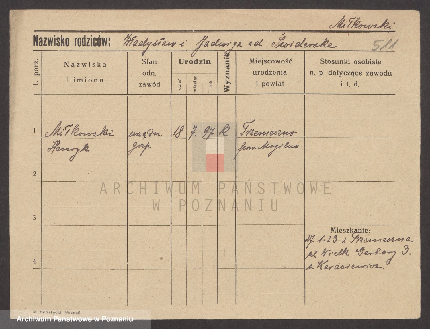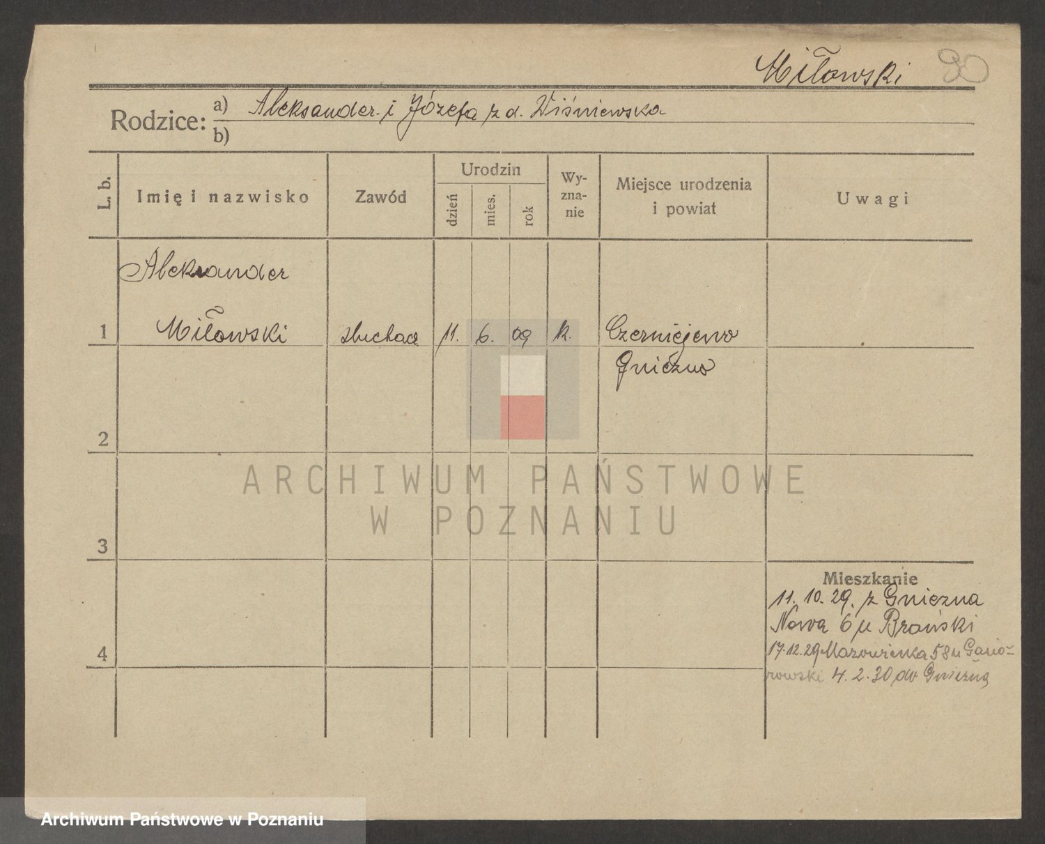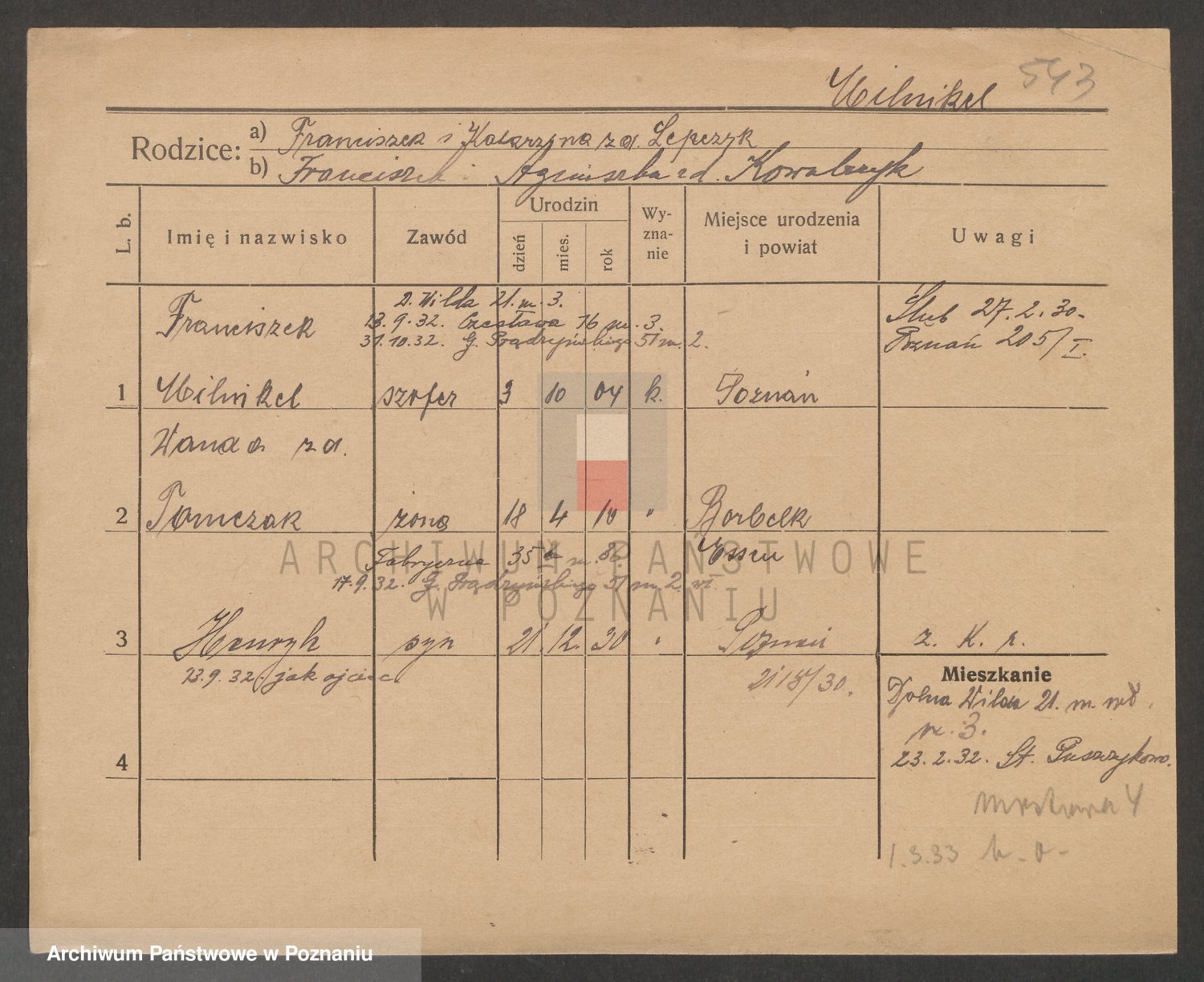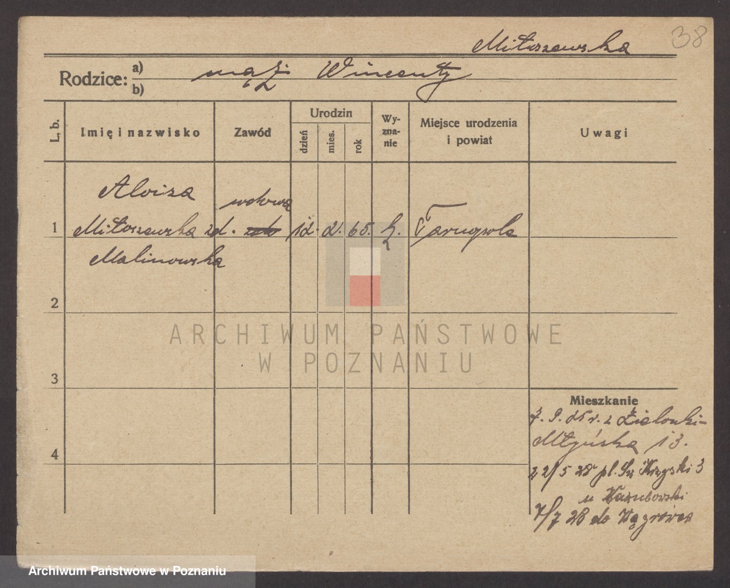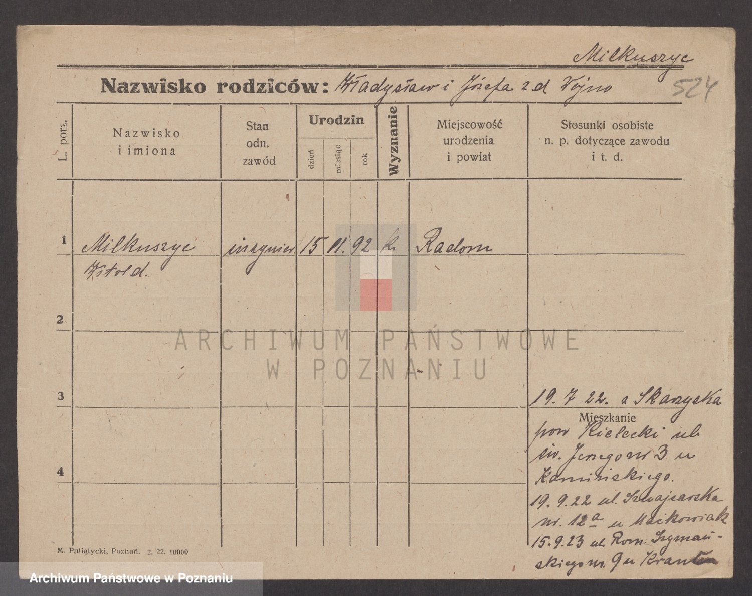 Podgląd karty osobowej dostępny jest po kliknięciu na nazwisko lub ikonkę karty. Można dokonywać powiększenia (ikony na górze) lub przechodzić między kolejnymi skanami (strzałki po bokach).