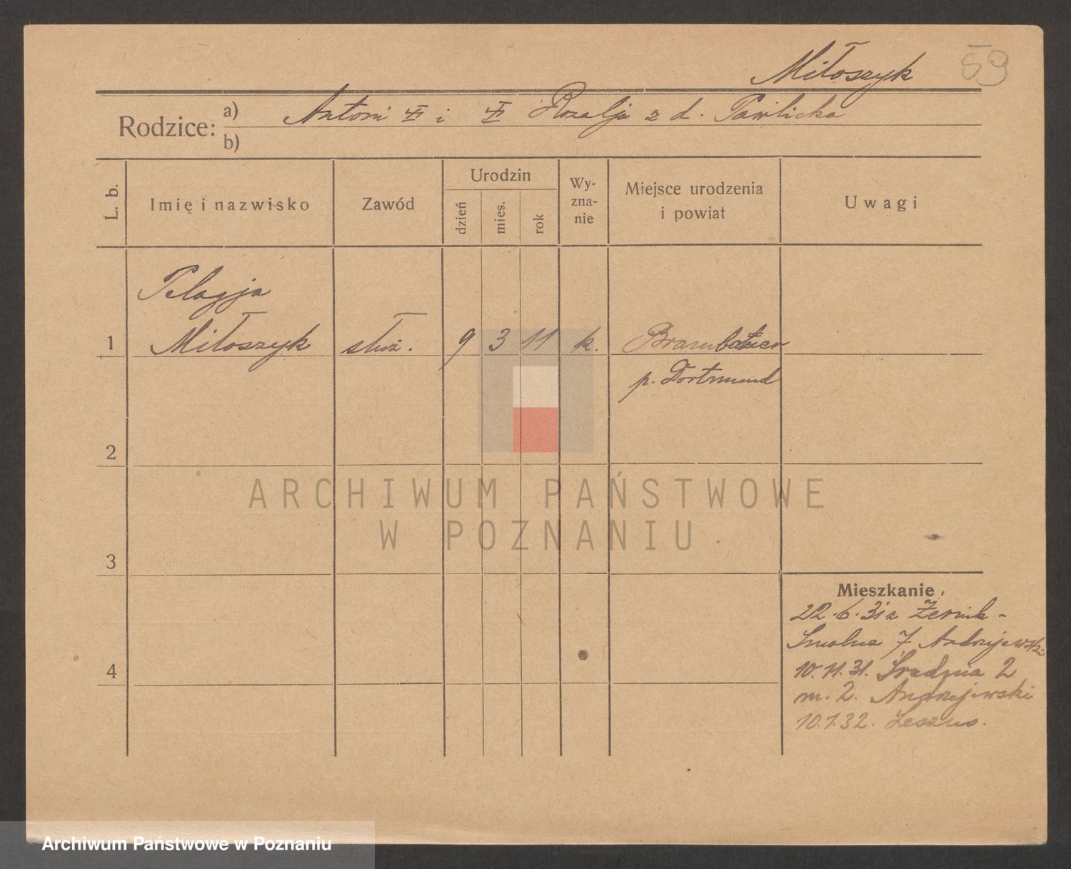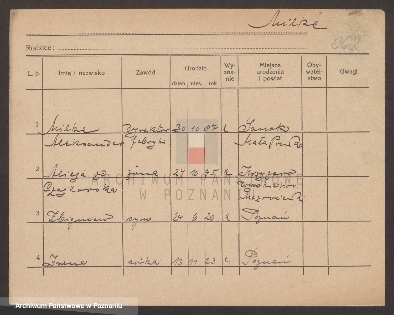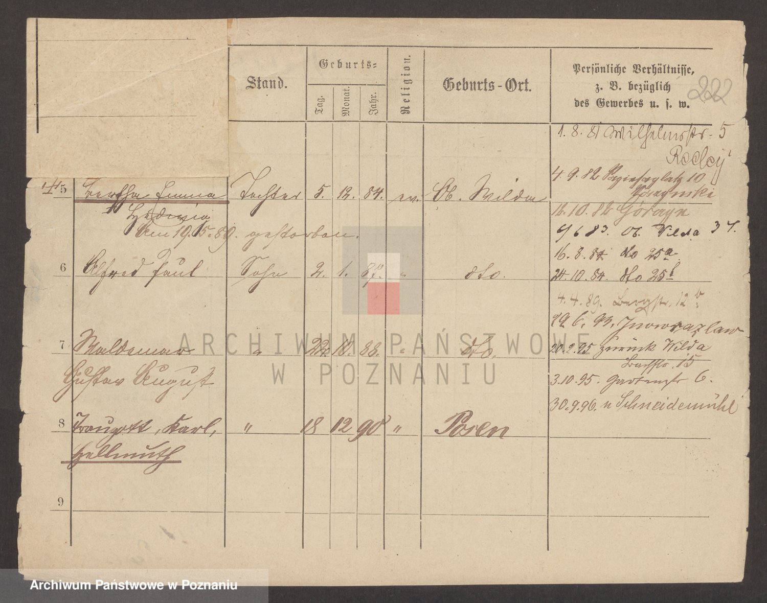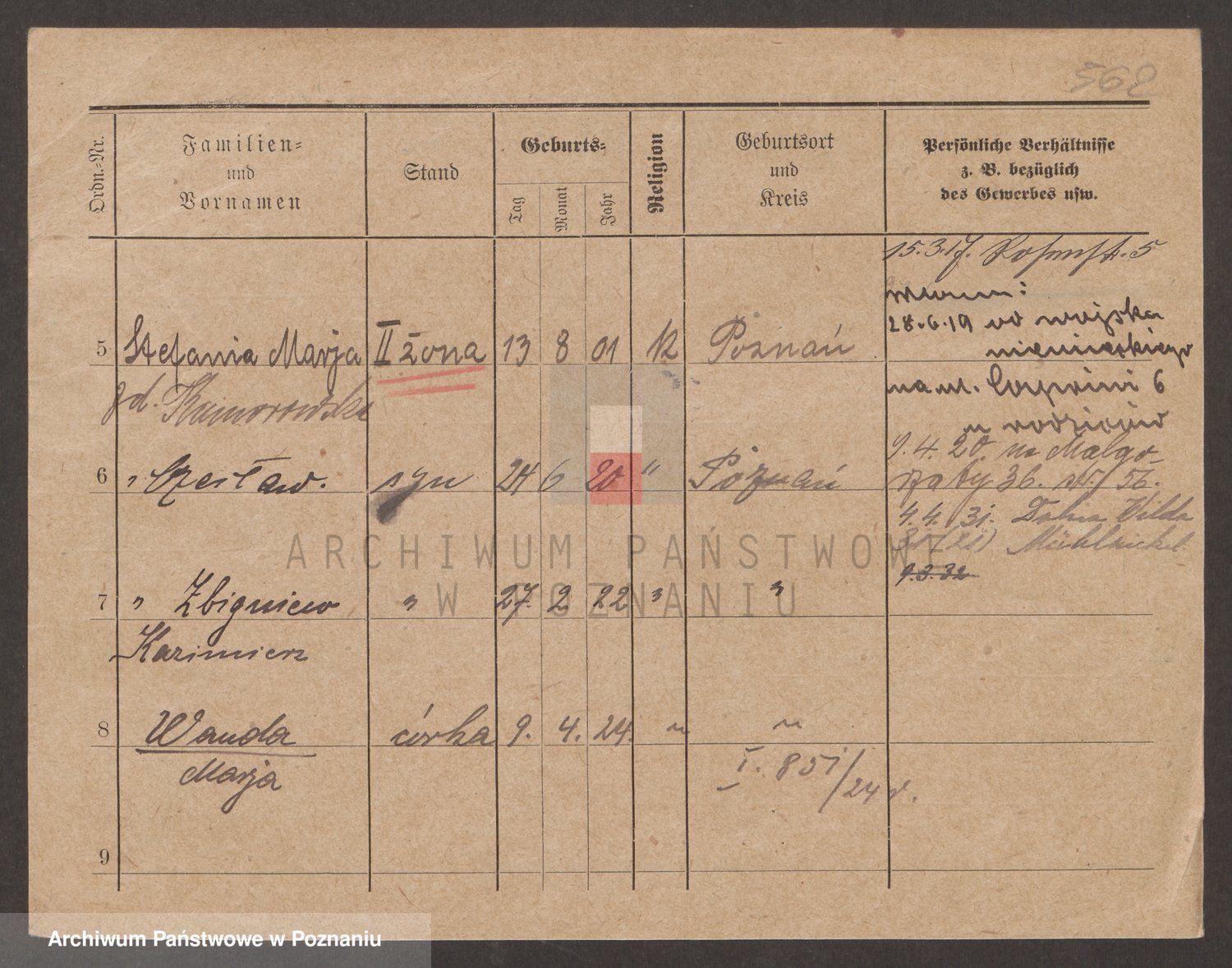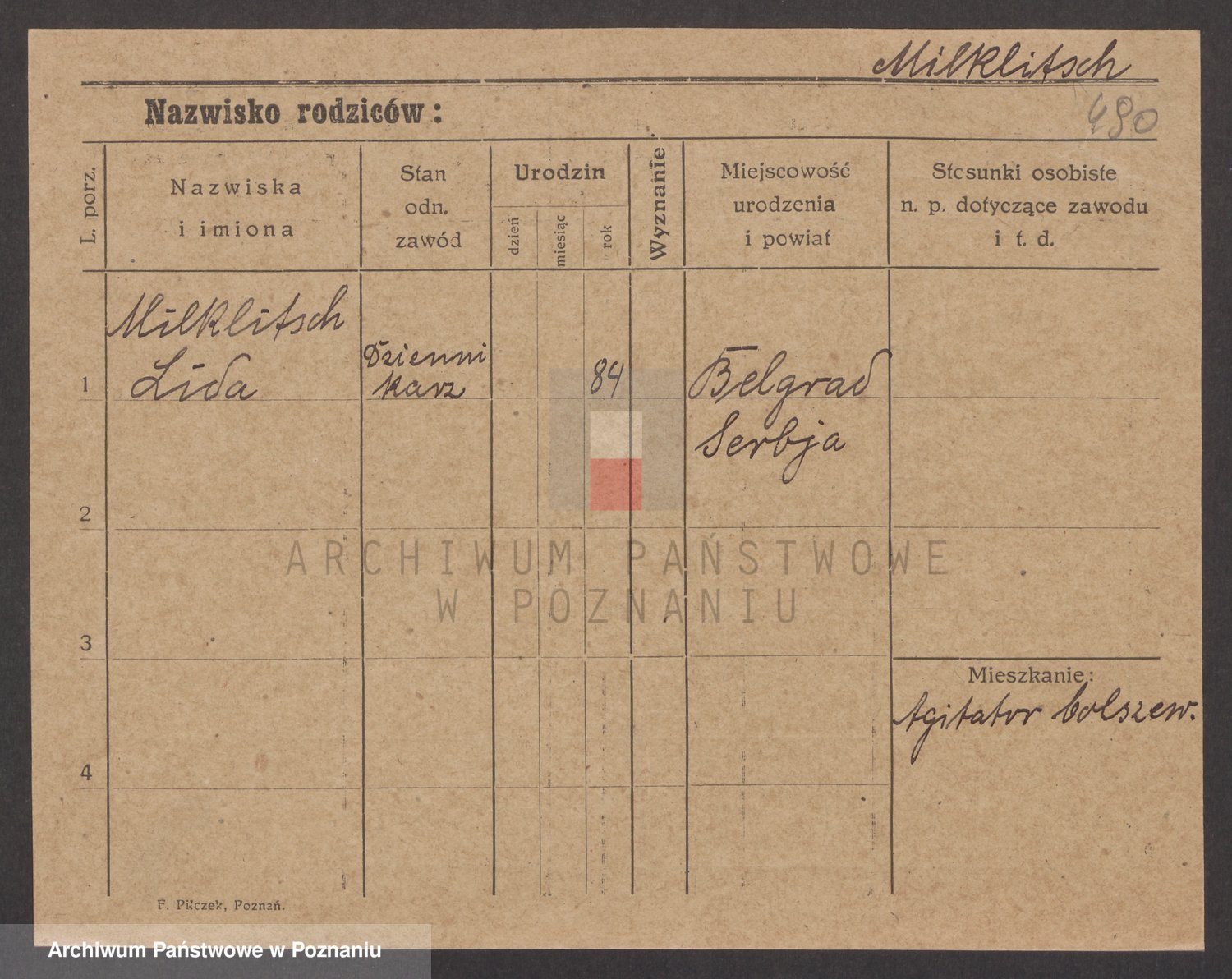 Podgląd karty osobowej dostępny jest po kliknięciu na nazwisko lub ikonkę karty. Można dokonywać powiększenia (ikony na górze) lub przechodzić między kolejnymi skanami (strzałki po bokach).