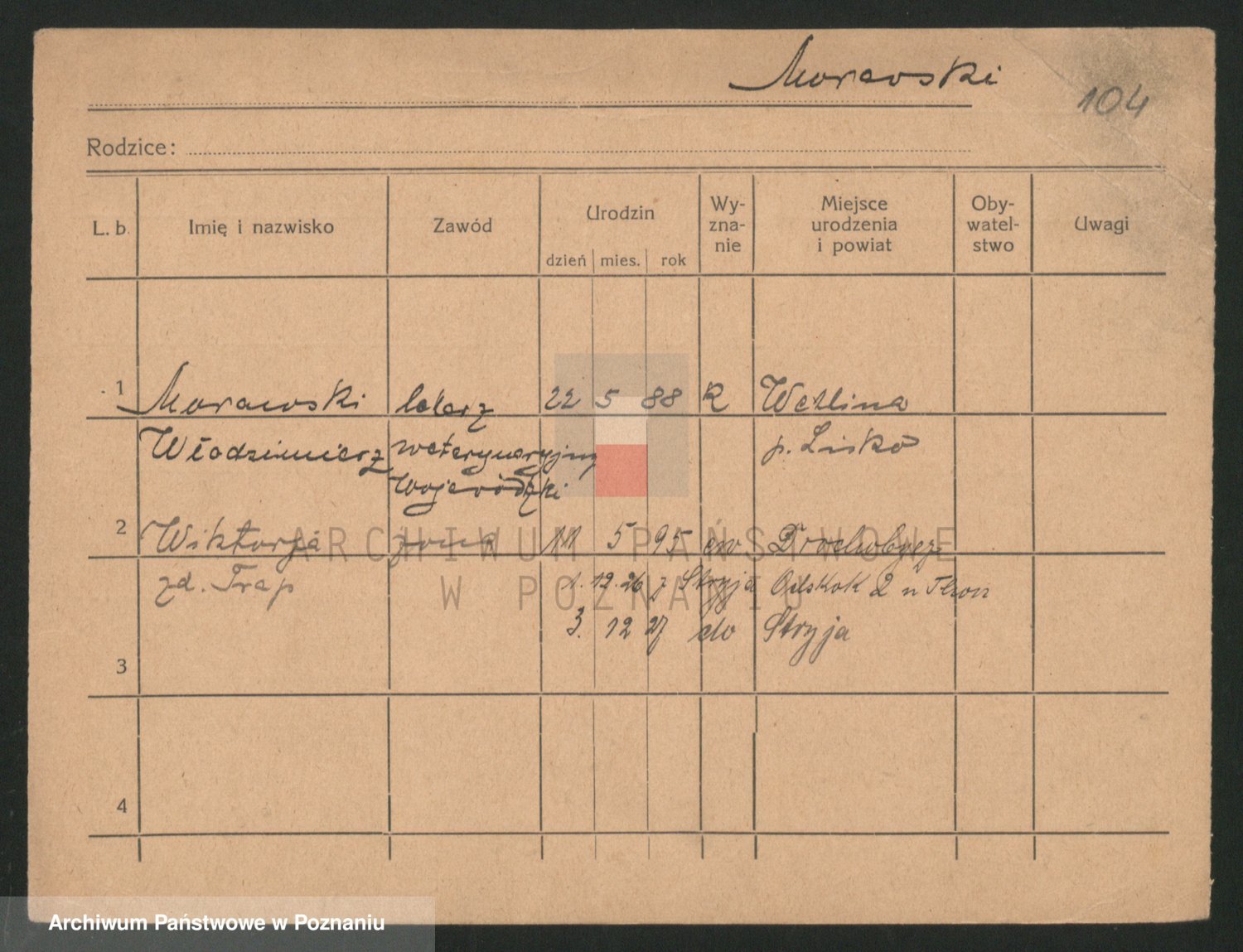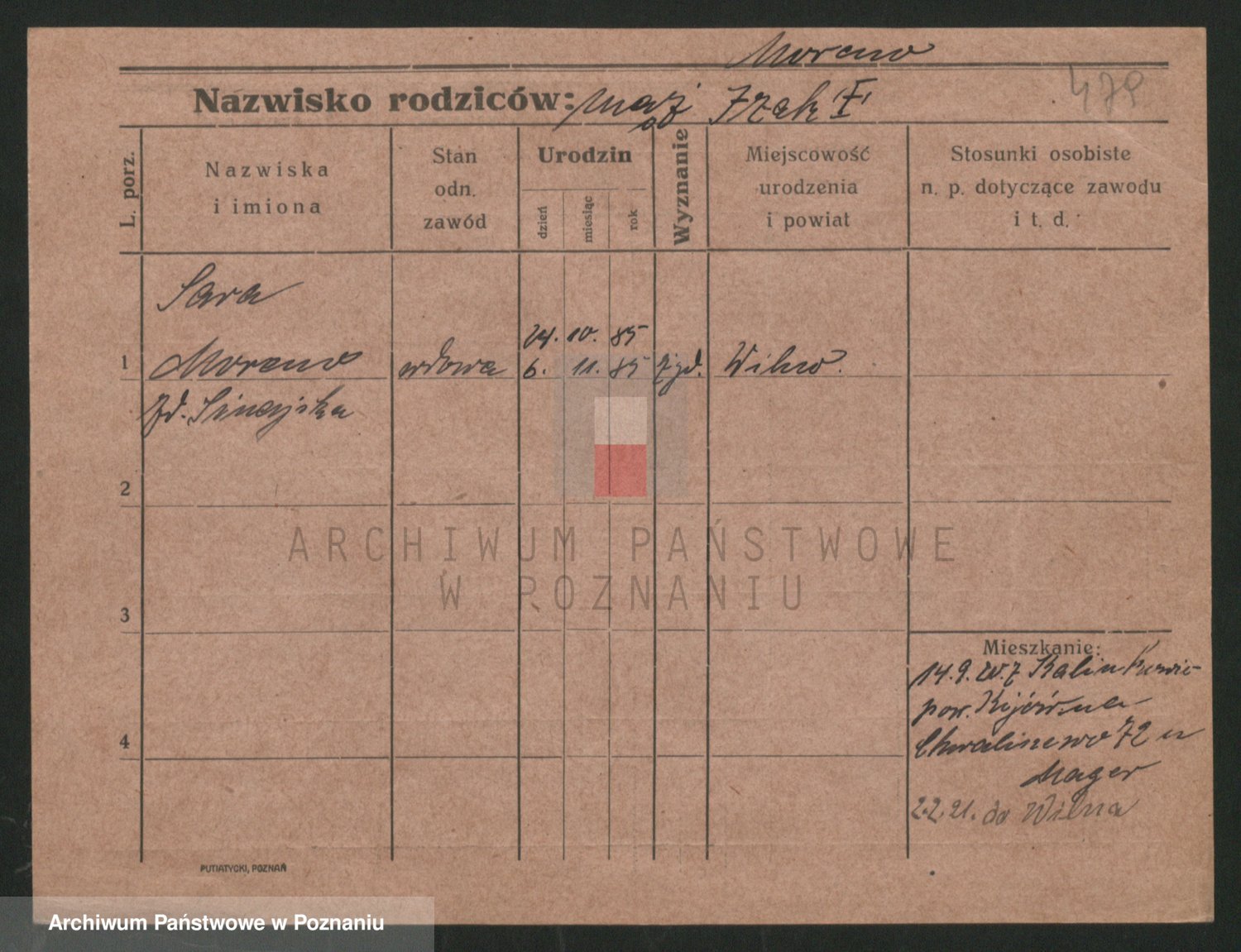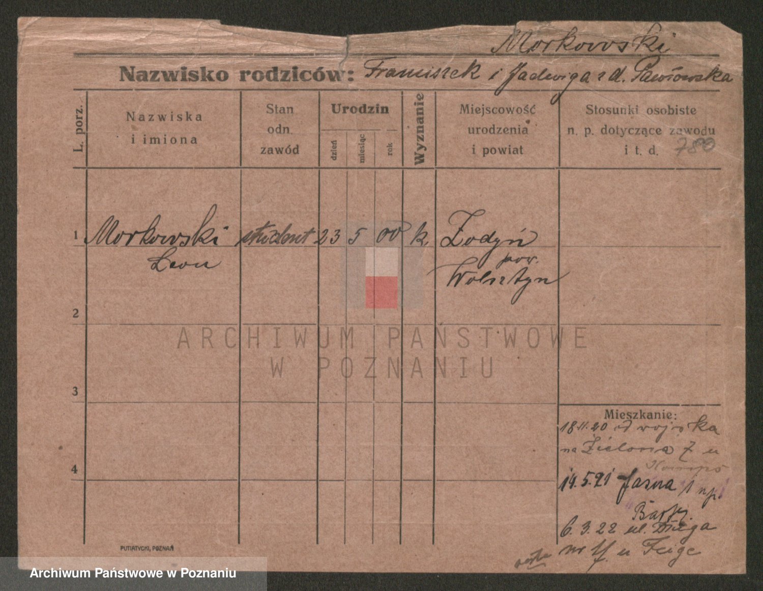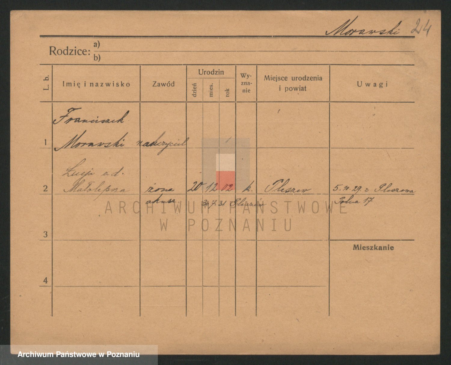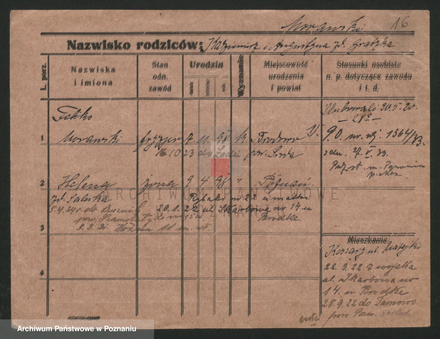 Podgląd karty osobowej dostępny jest po kliknięciu na nazwisko lub ikonkę karty. Można dokonywać powiększenia (ikony na górze) lub przechodzić między kolejnymi skanami (strzałki po bokach).