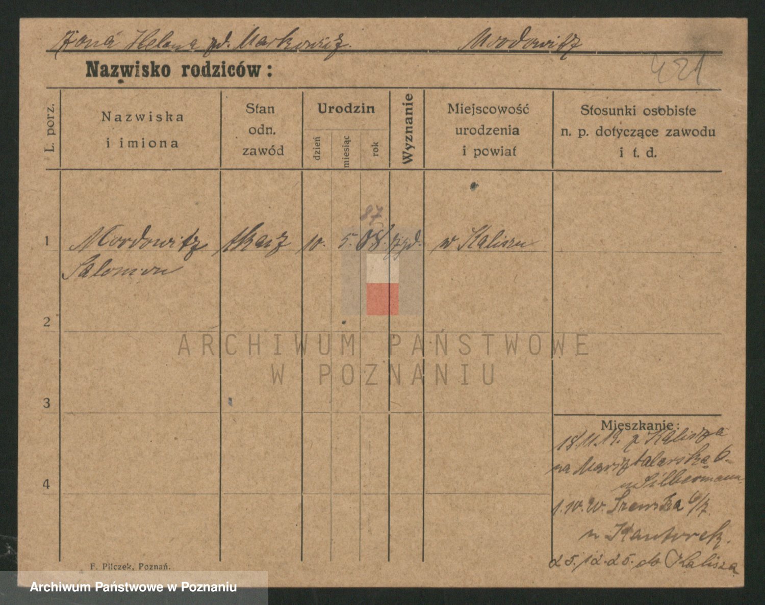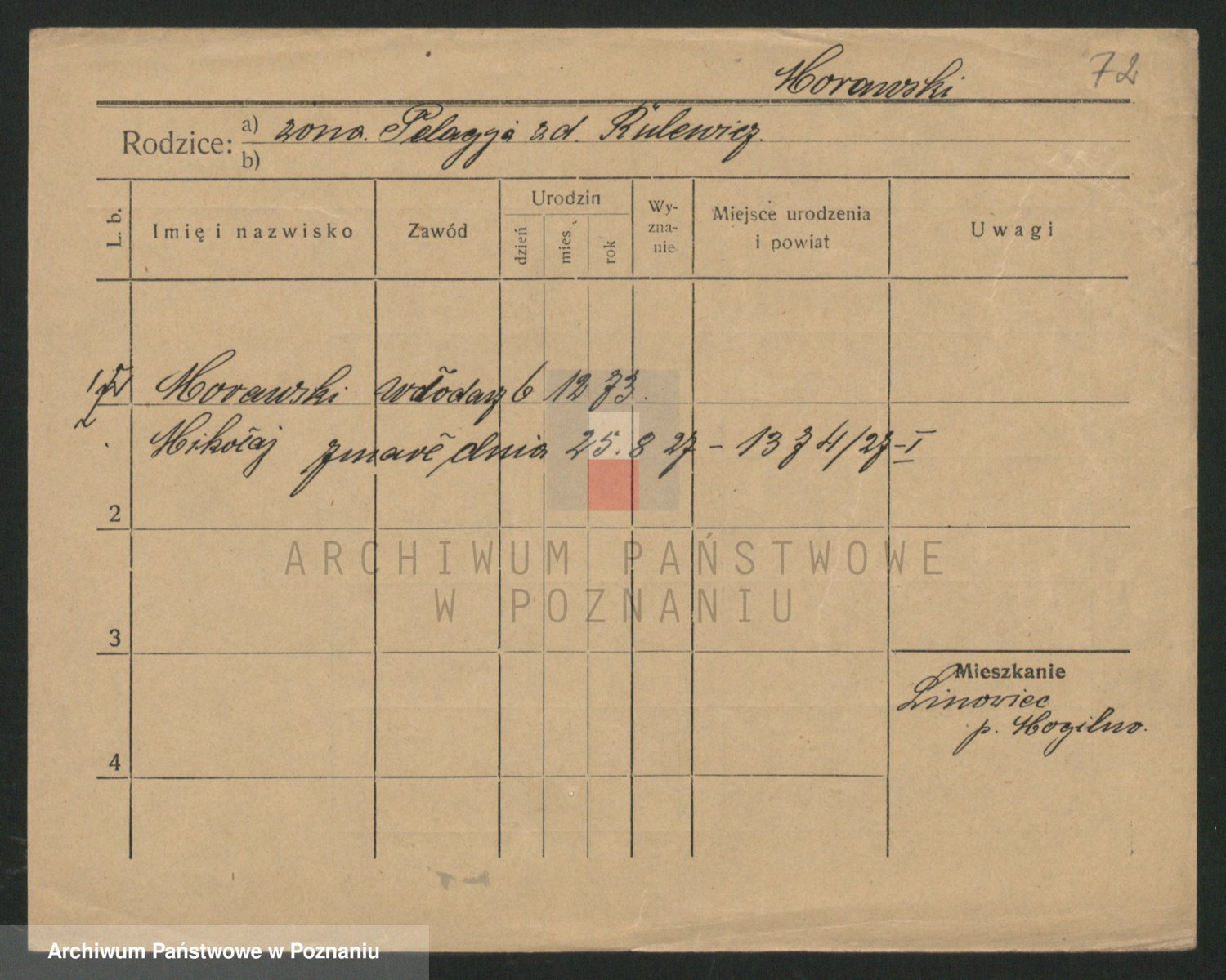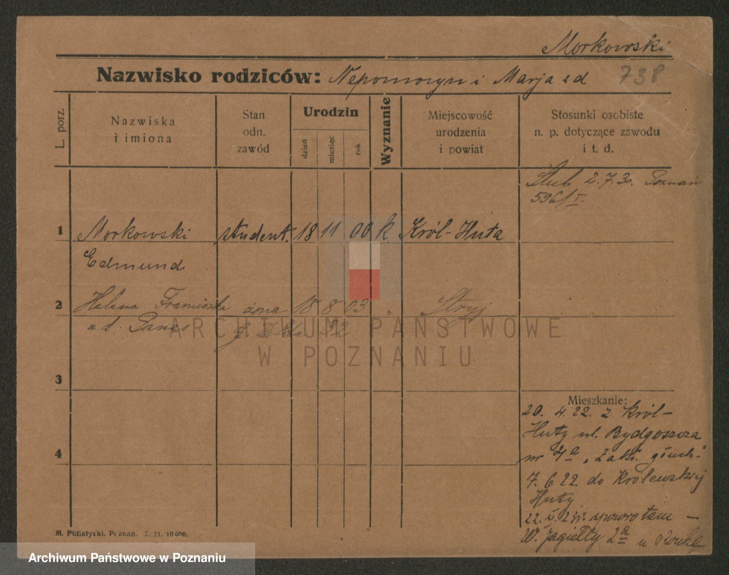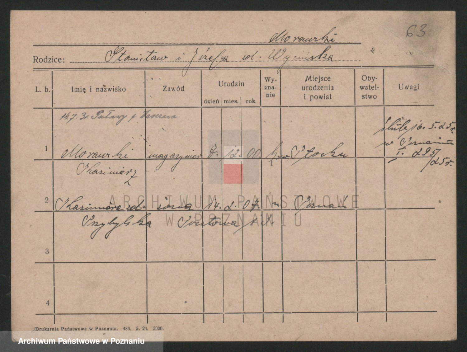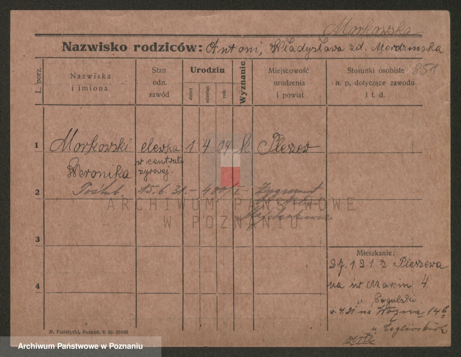 Podgląd karty osobowej dostępny jest po kliknięciu na nazwisko lub ikonkę karty. Można dokonywać powiększenia (ikony na górze) lub przechodzić między kolejnymi skanami (strzałki po bokach).
