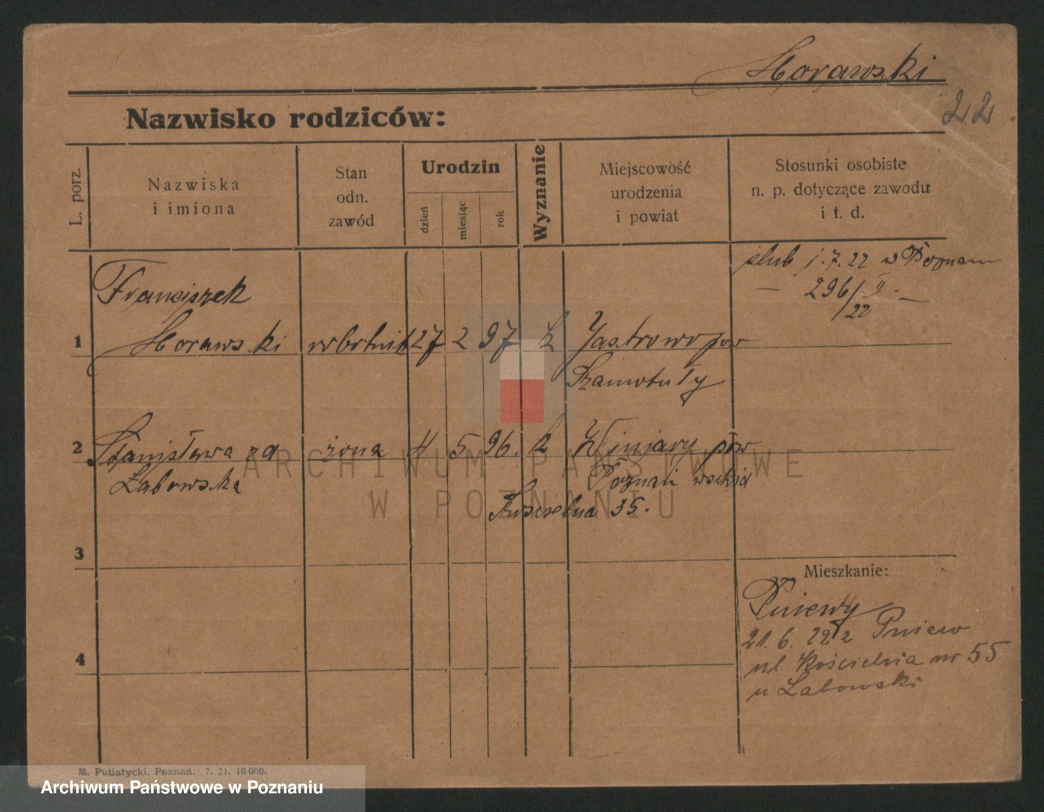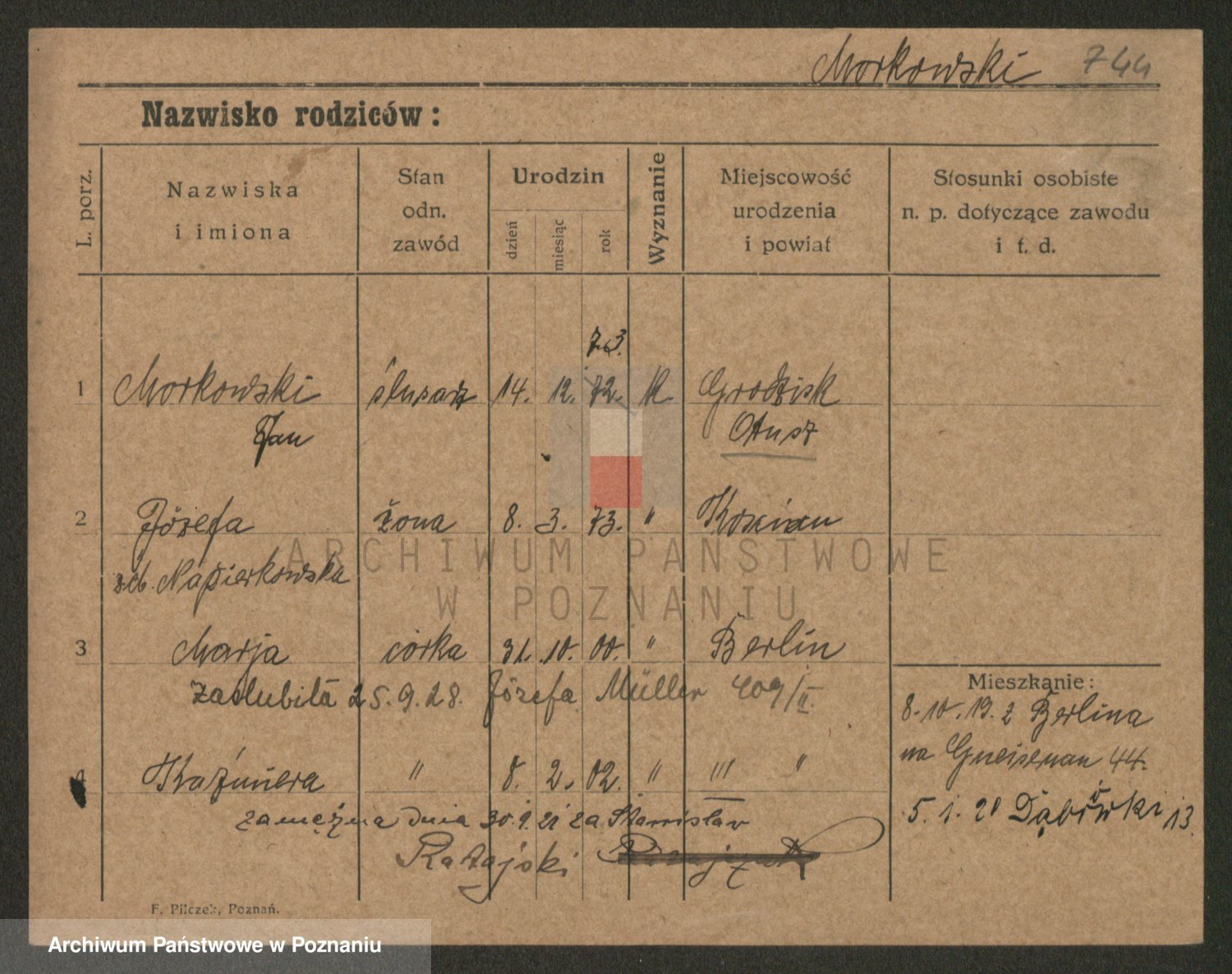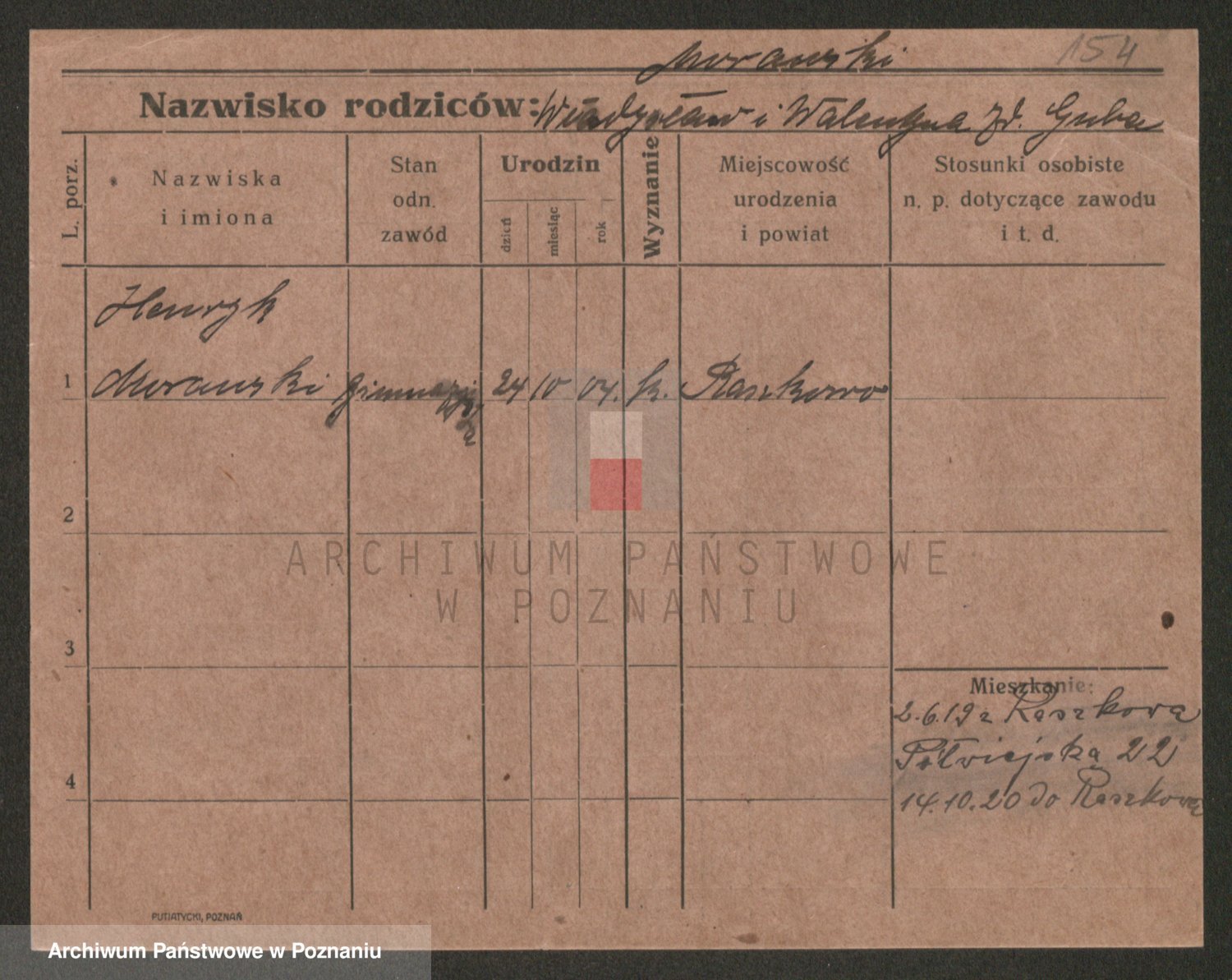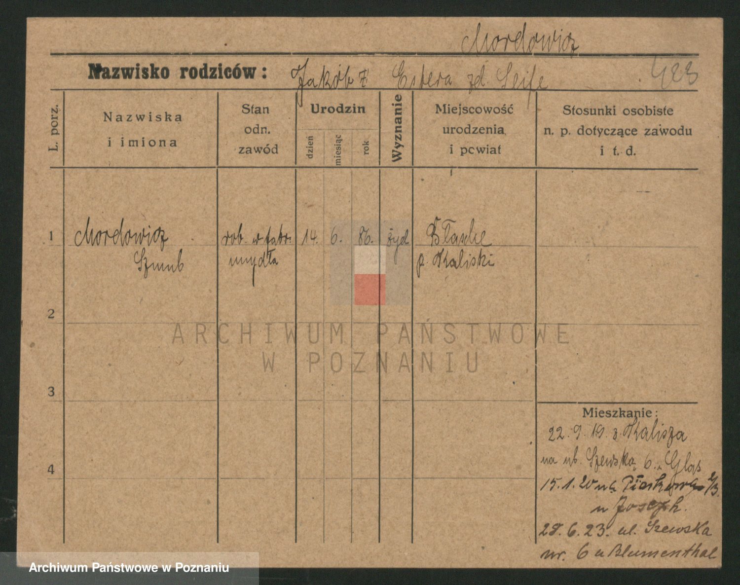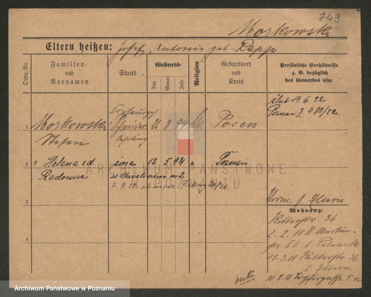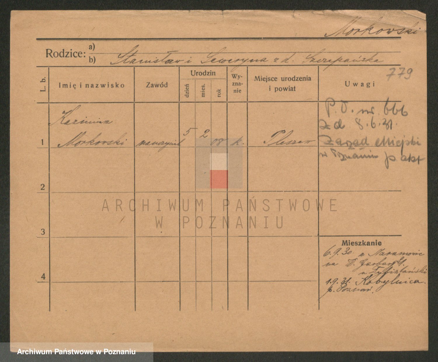 Podgląd karty osobowej dostępny jest po kliknięciu na nazwisko lub ikonkę karty. Można dokonywać powiększenia (ikony na górze) lub przechodzić między kolejnymi skanami (strzałki po bokach).