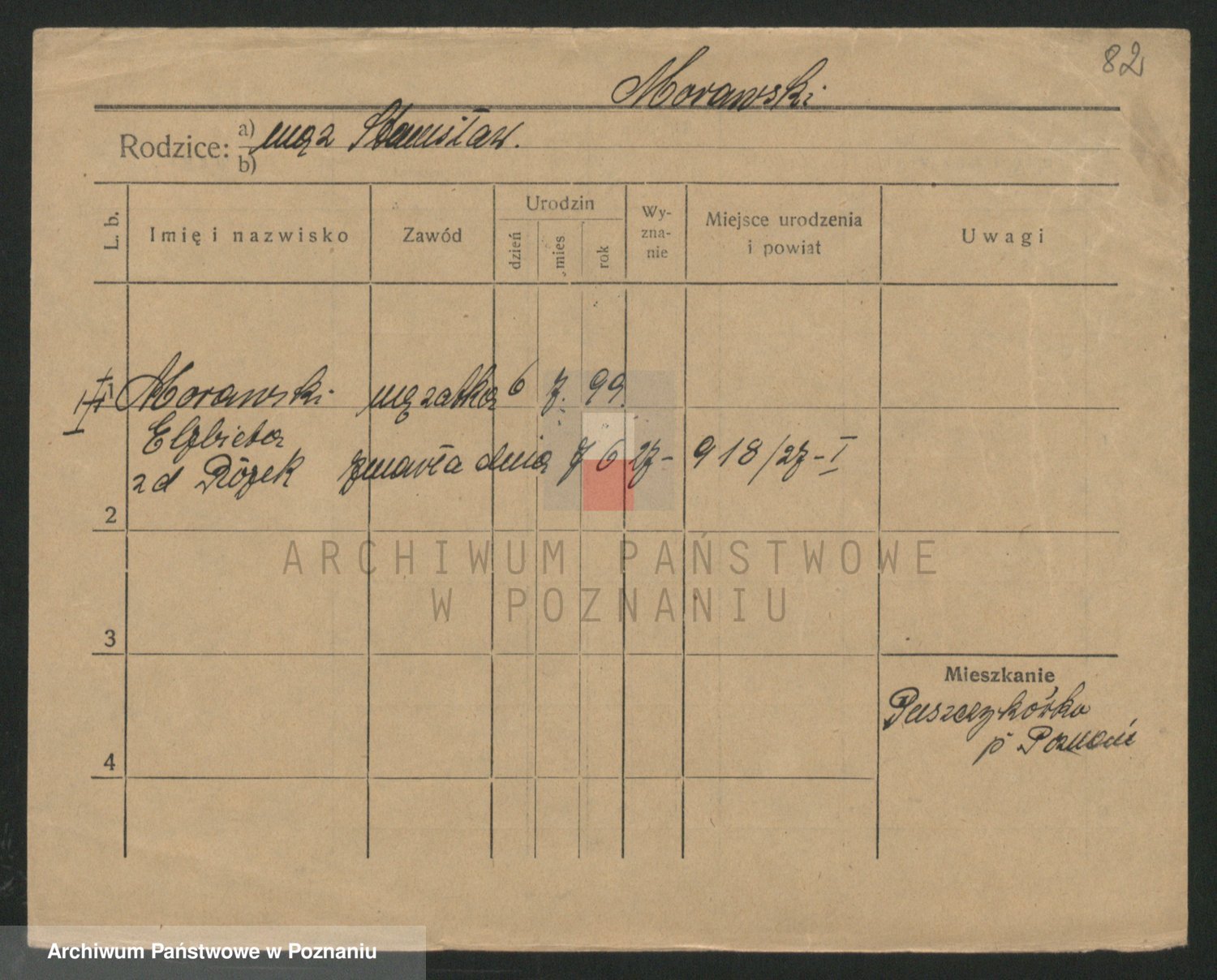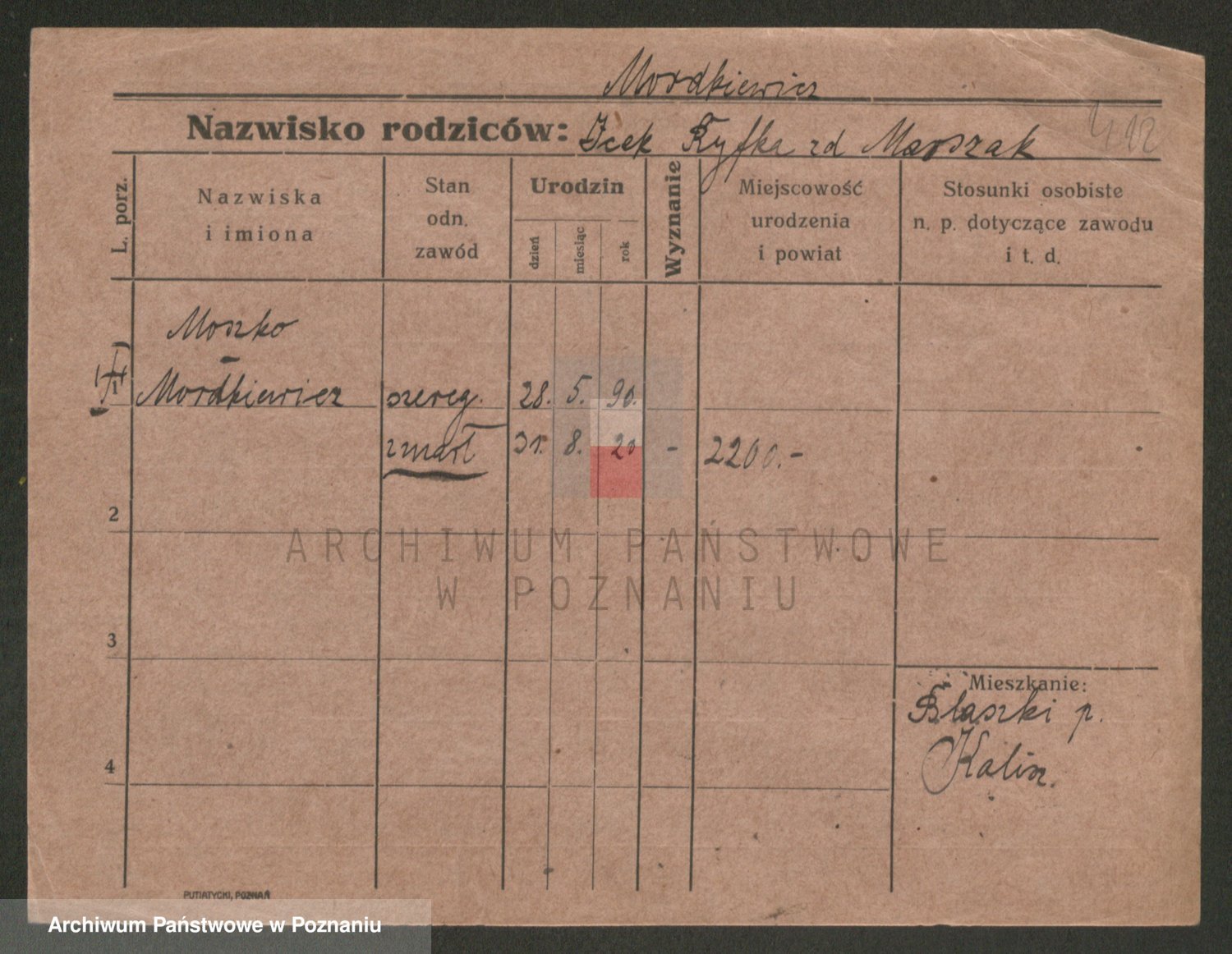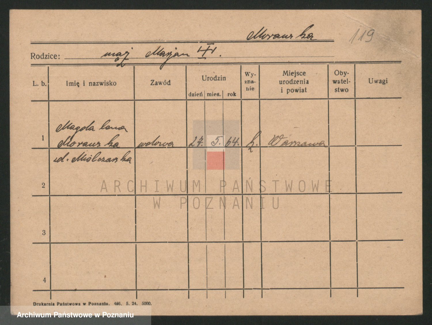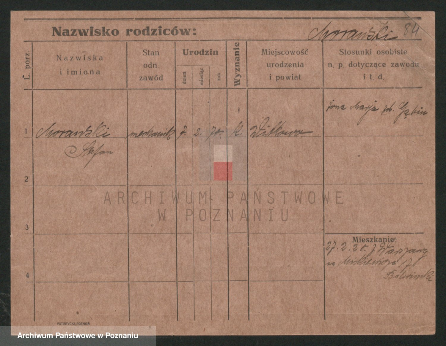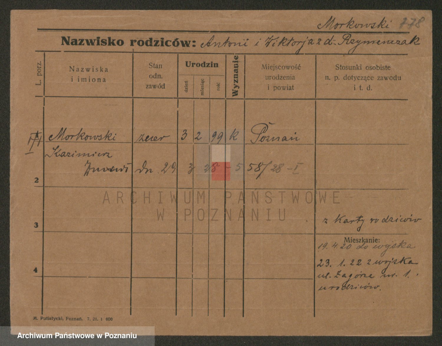 Podgląd karty osobowej dostępny jest po kliknięciu na nazwisko lub ikonkę karty. Można dokonywać powiększenia (ikony na górze) lub przechodzić między kolejnymi skanami (strzałki po bokach).