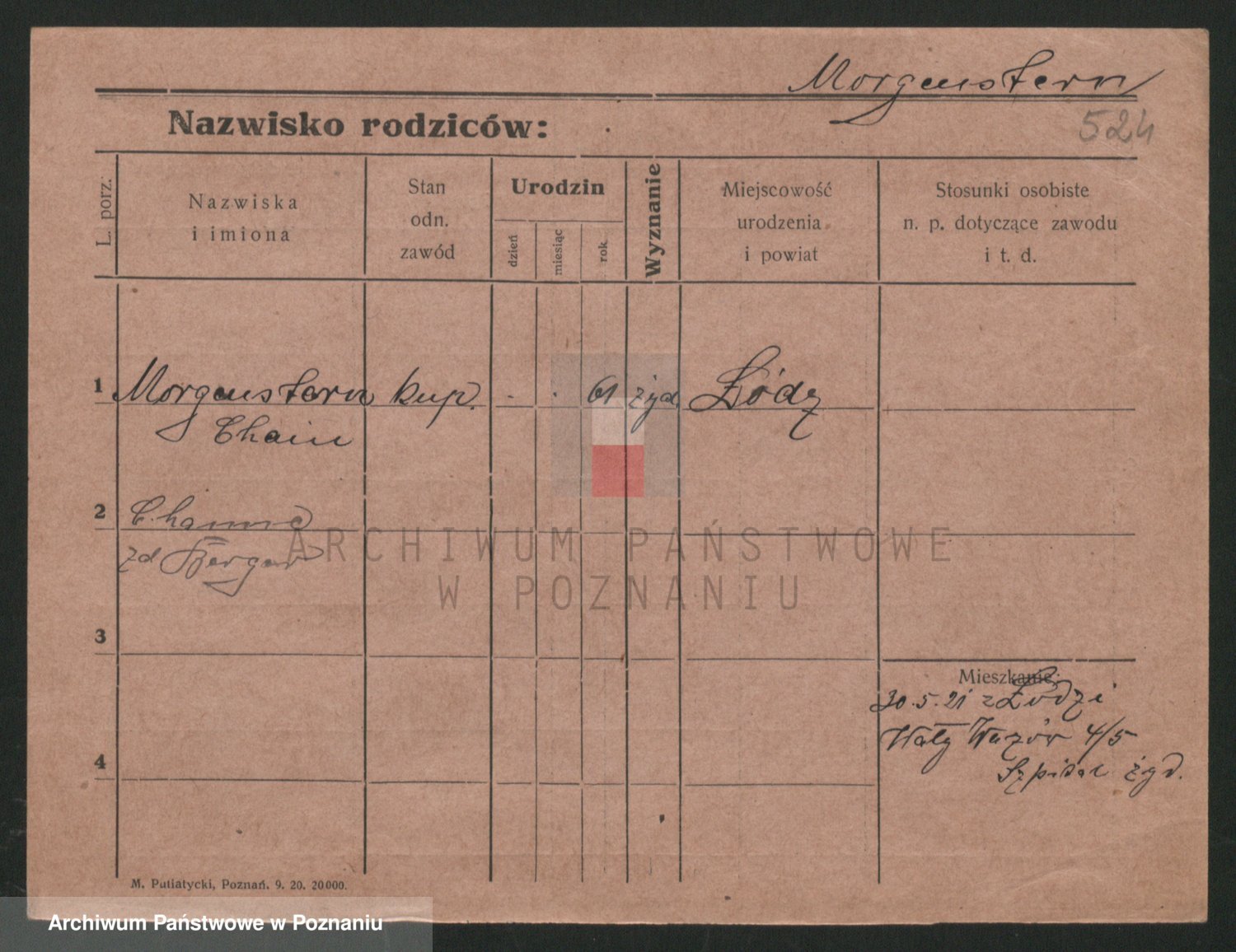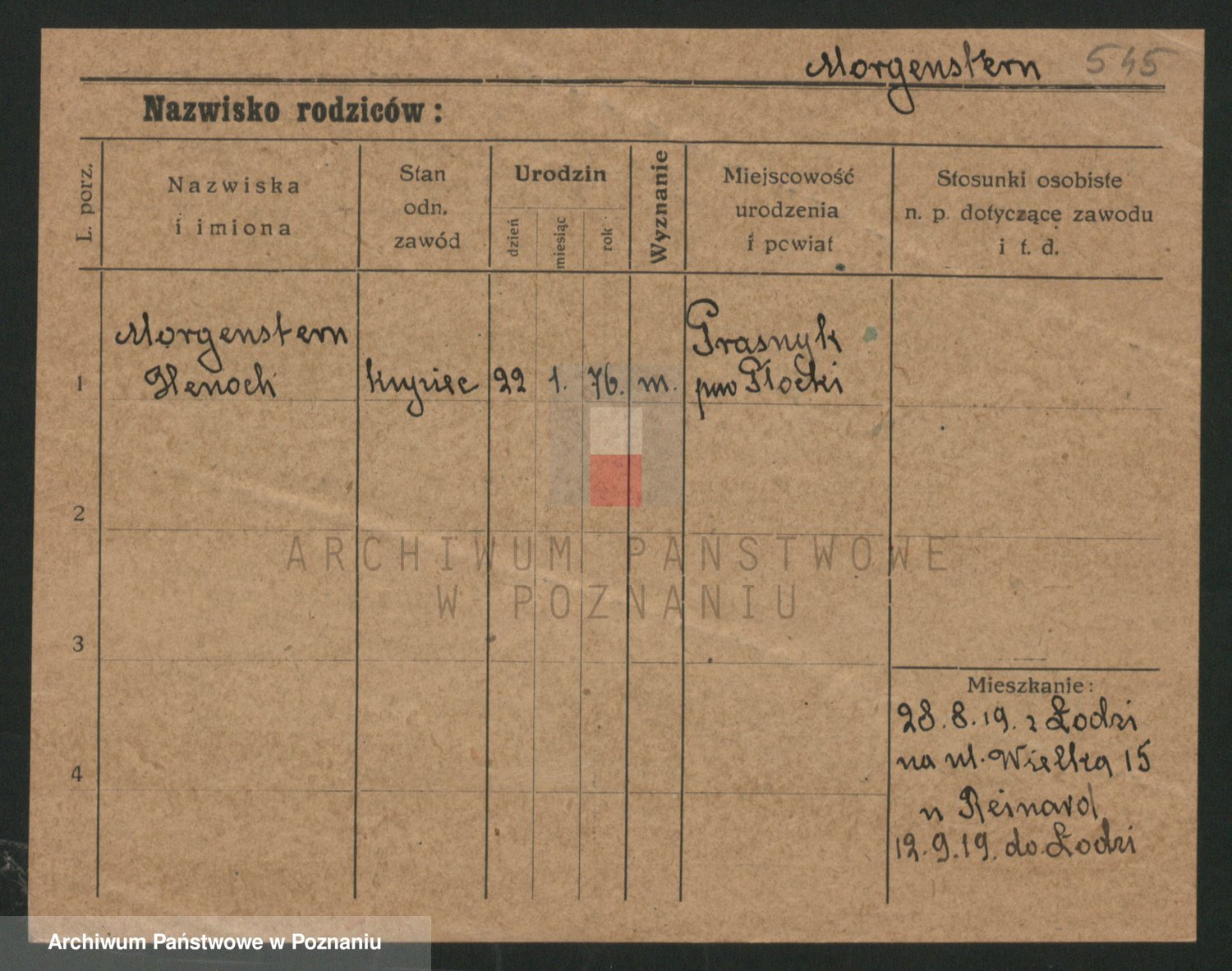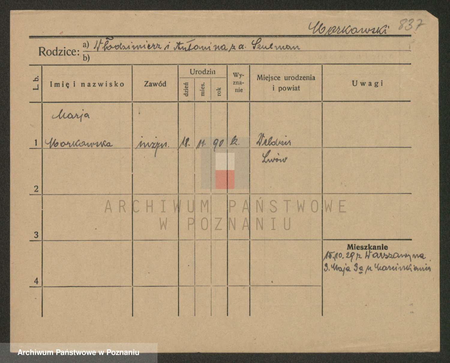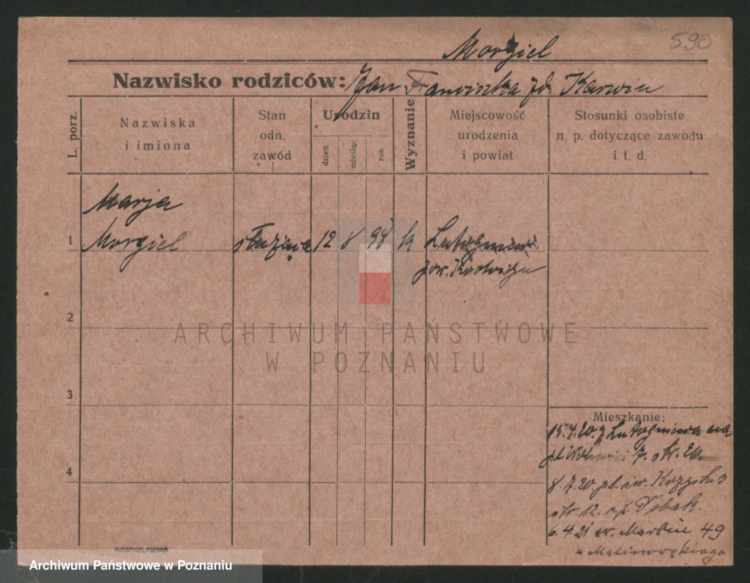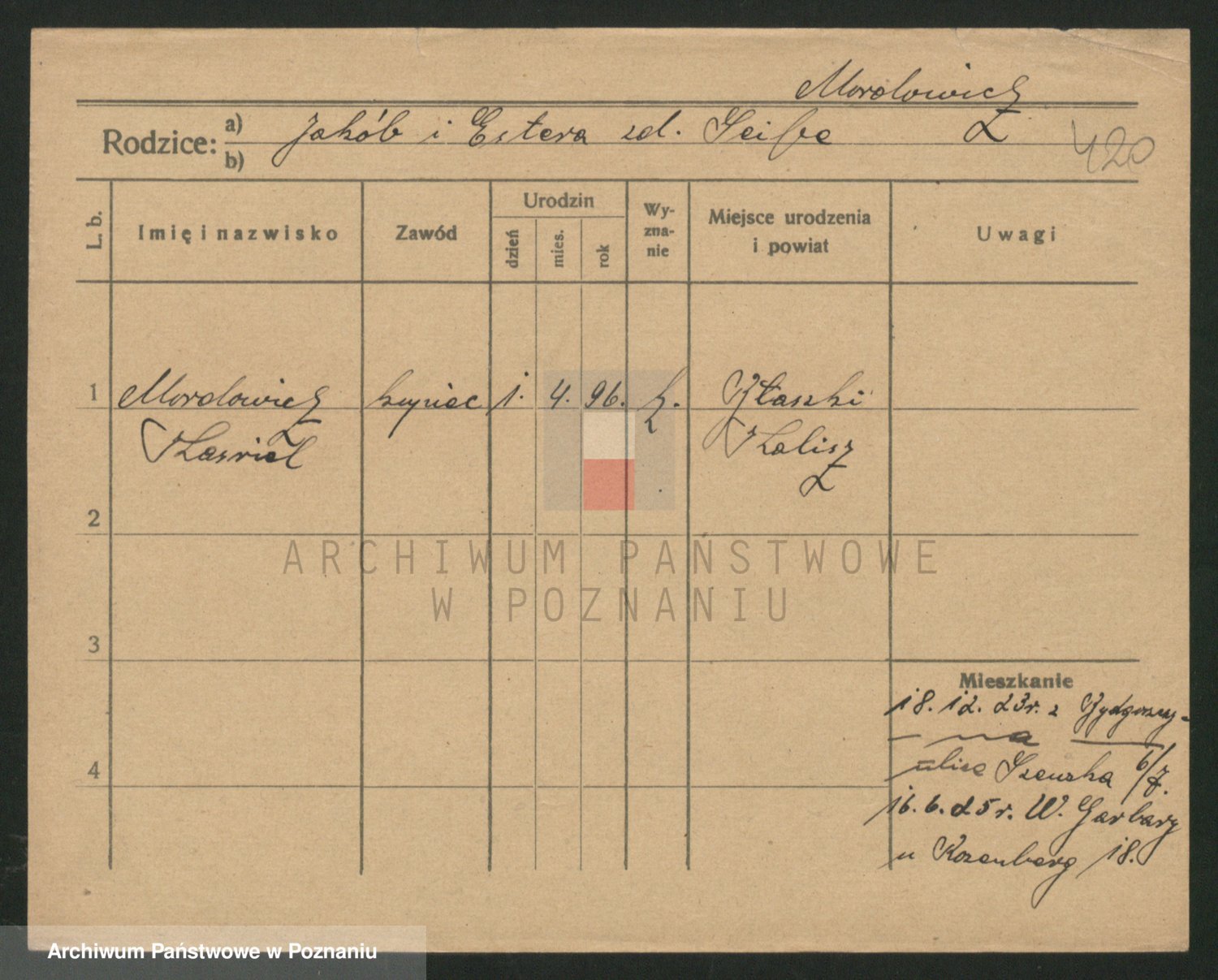 Podgląd karty osobowej dostępny jest po kliknięciu na nazwisko lub ikonkę karty. Można dokonywać powiększenia (ikony na górze) lub przechodzić między kolejnymi skanami (strzałki po bokach).