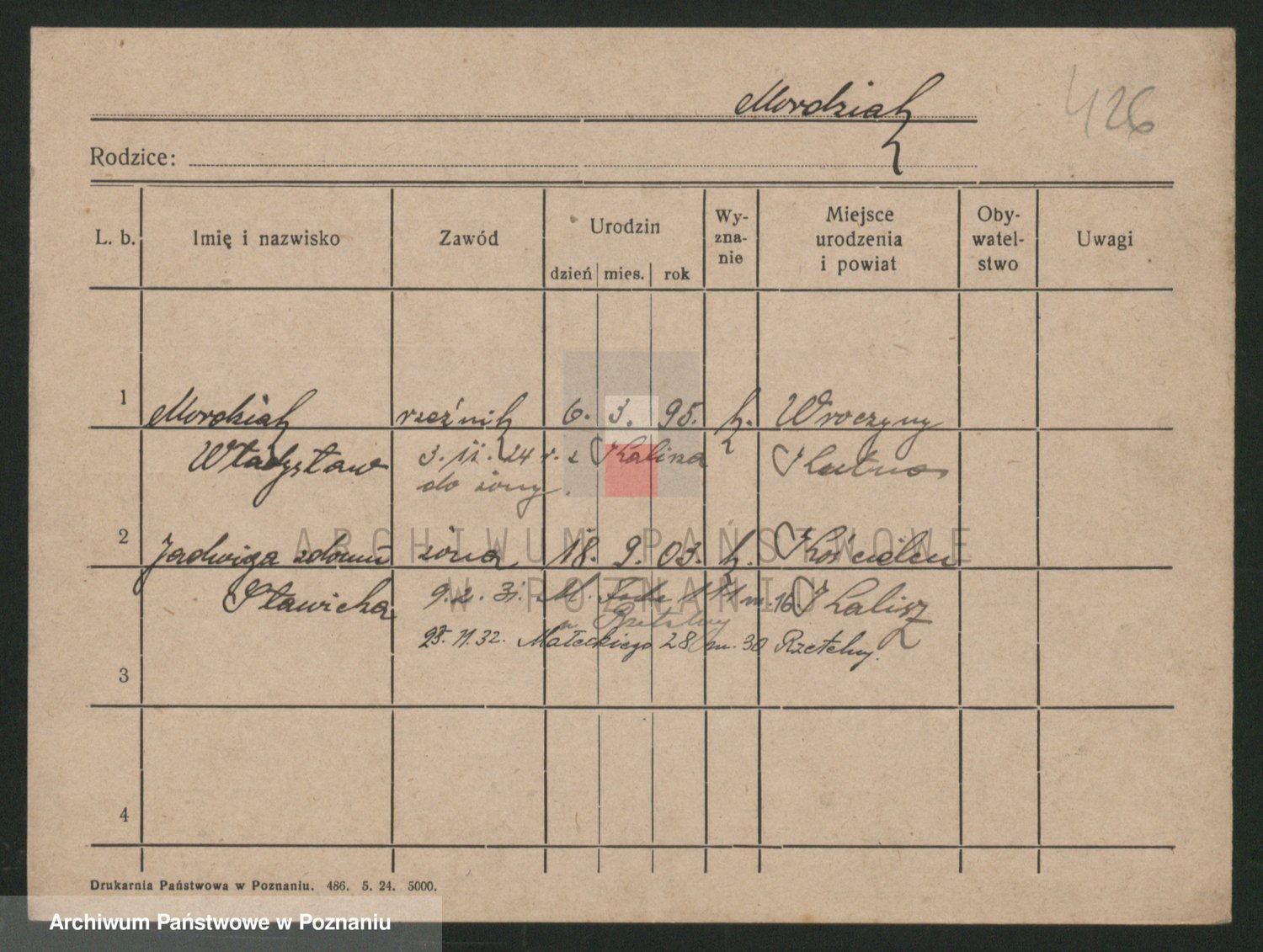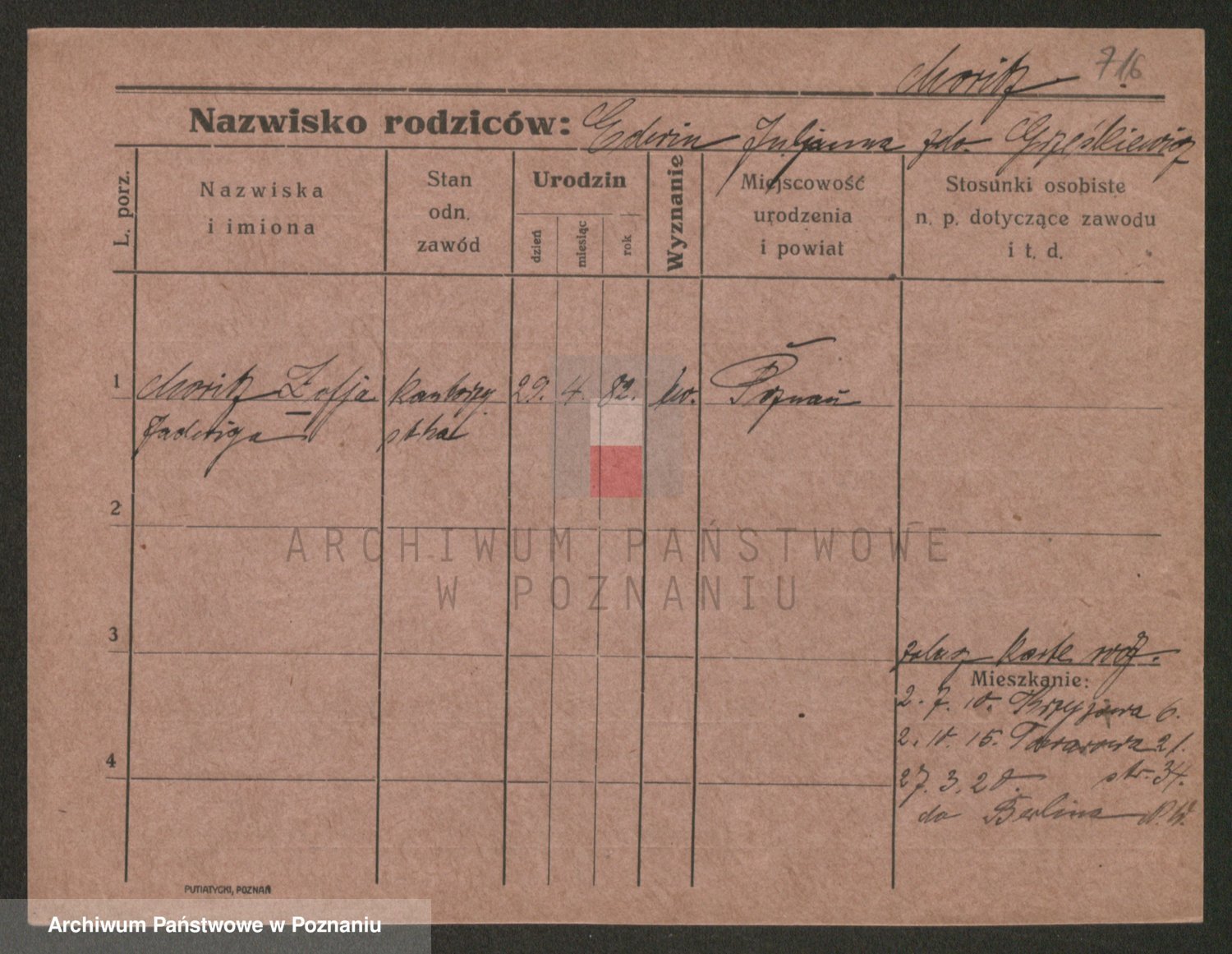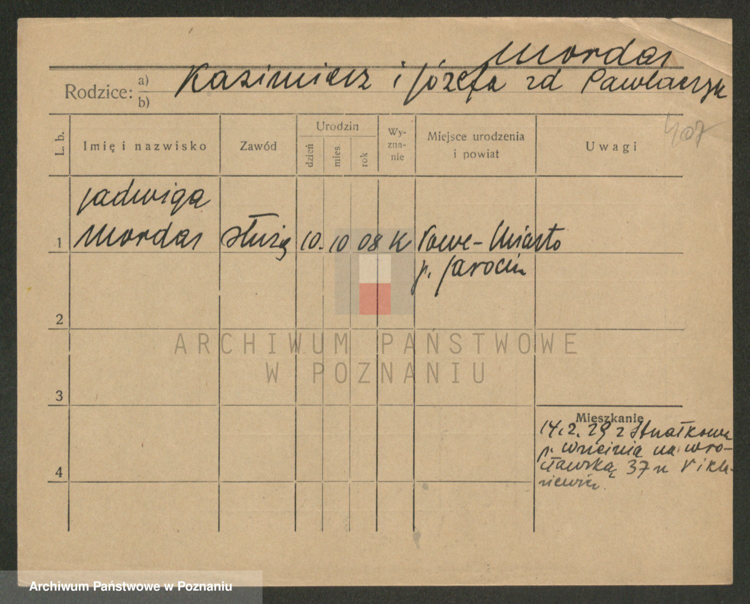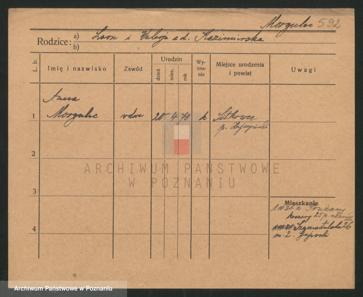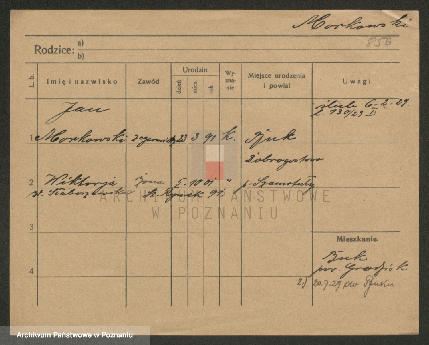 Podgląd karty osobowej dostępny jest po kliknięciu na nazwisko lub ikonkę karty. Można dokonywać powiększenia (ikony na górze) lub przechodzić między kolejnymi skanami (strzałki po bokach).