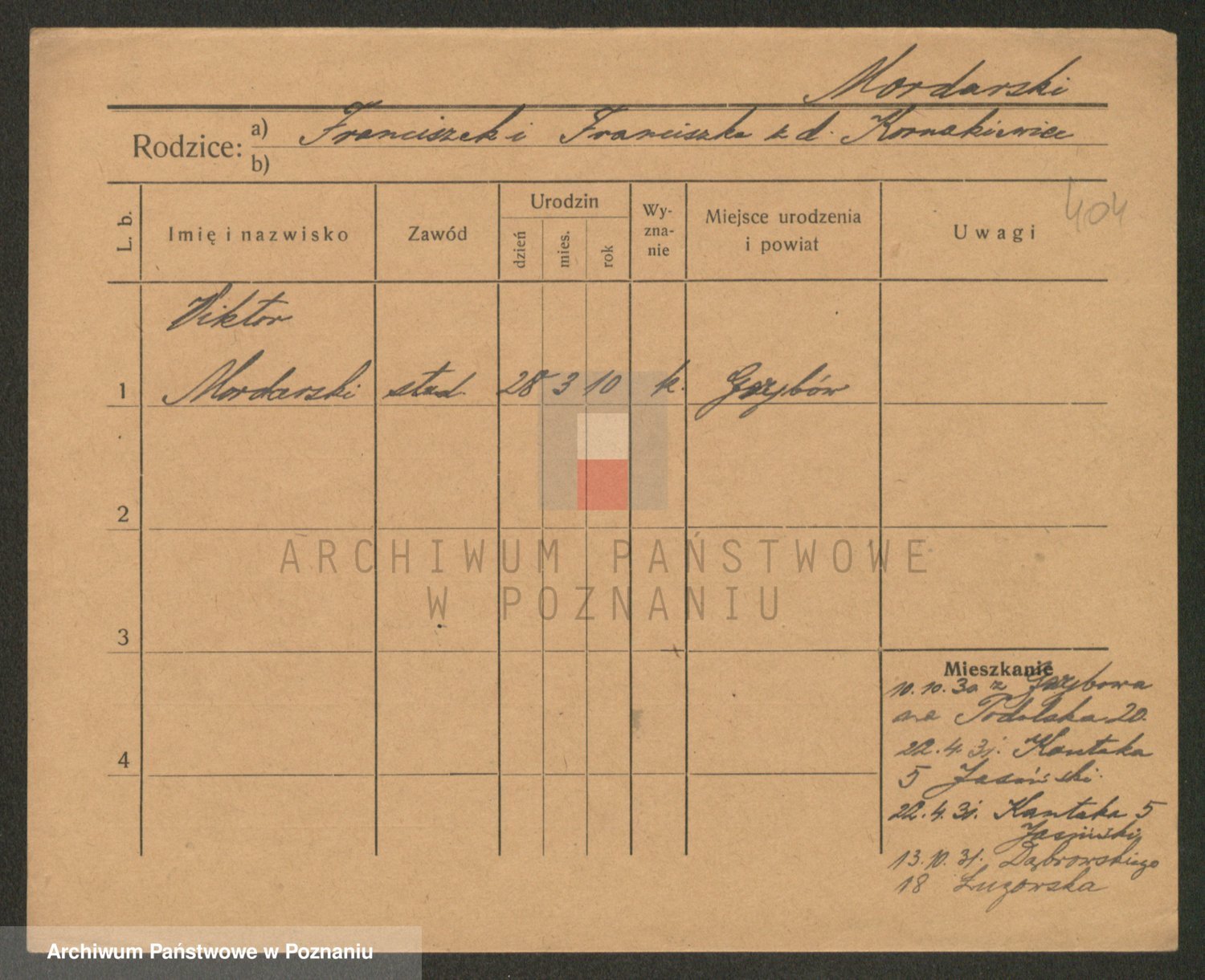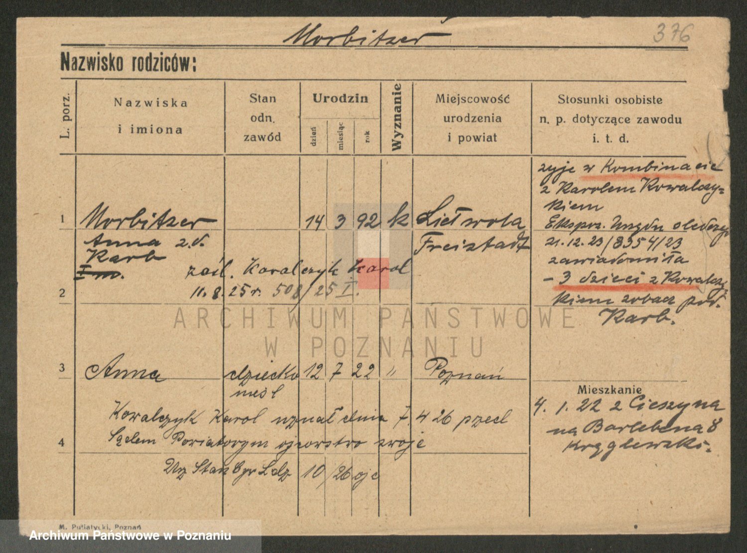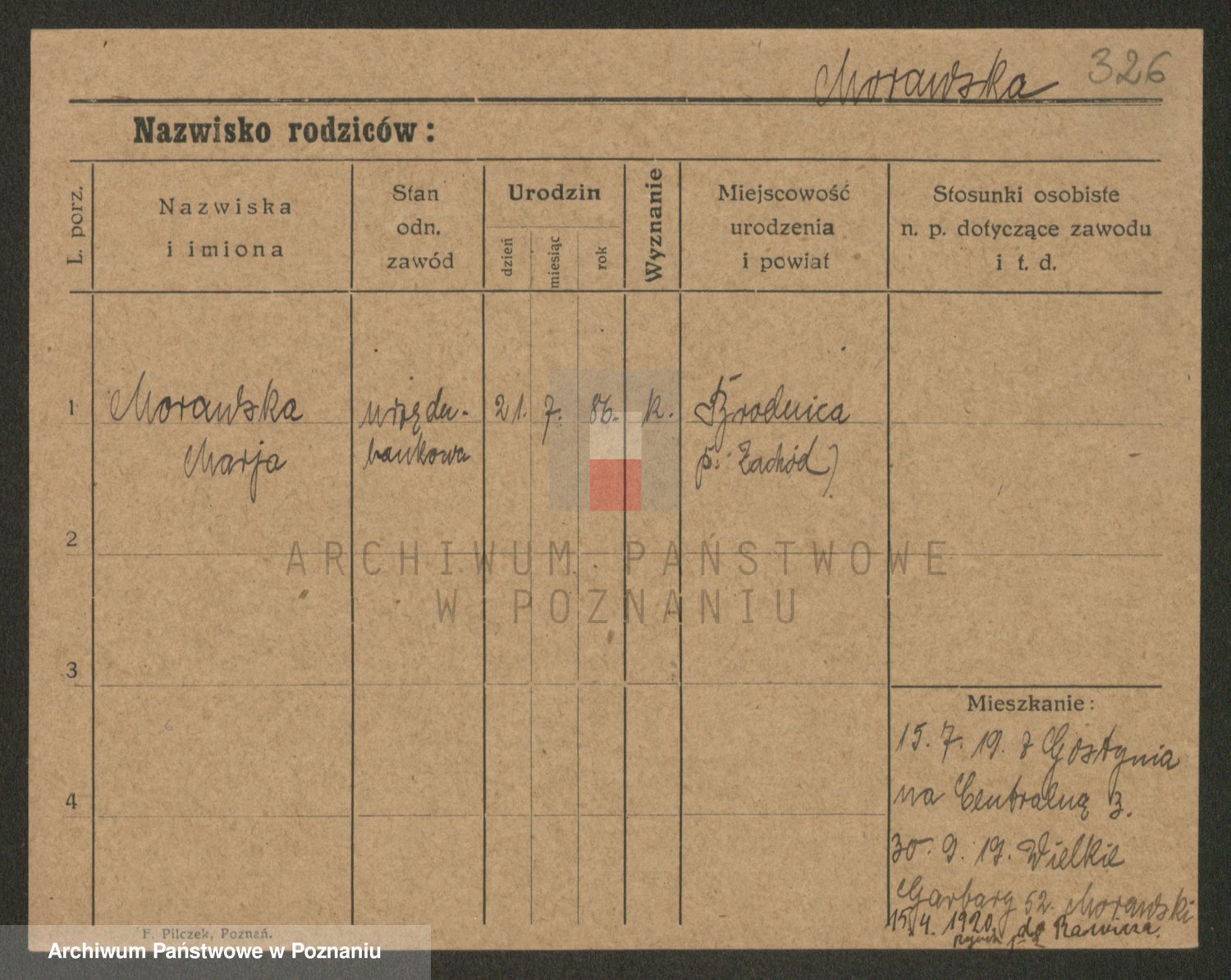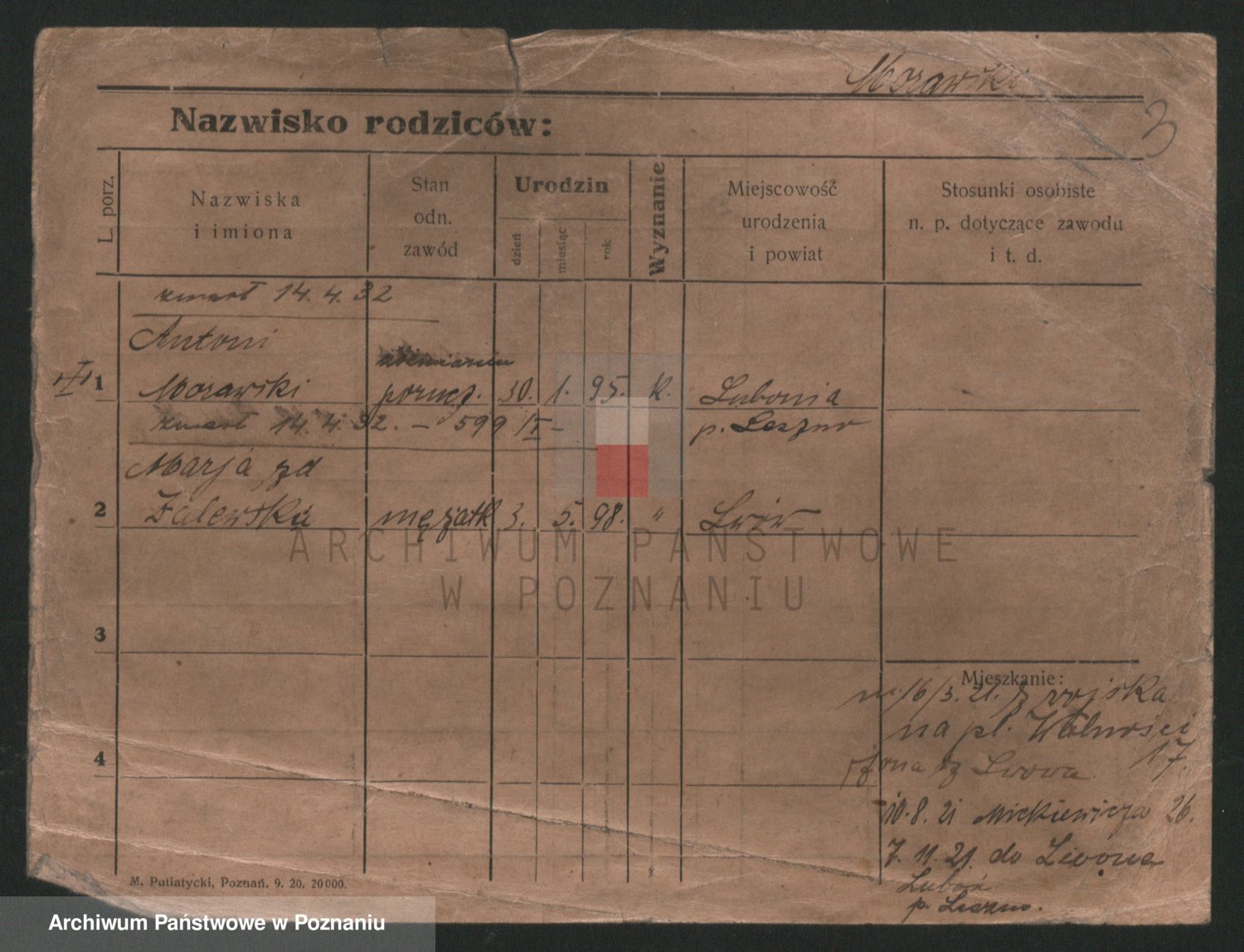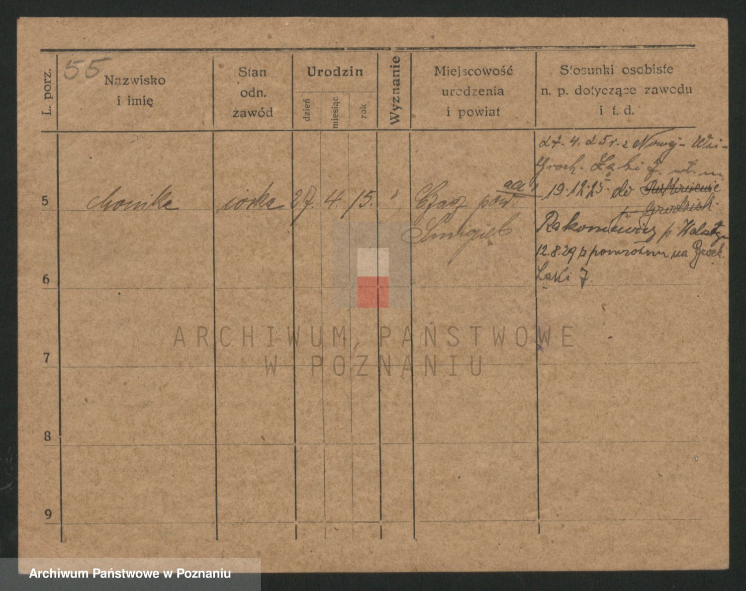 Podgląd karty osobowej dostępny jest po kliknięciu na nazwisko lub ikonkę karty. Można dokonywać powiększenia (ikony na górze) lub przechodzić między kolejnymi skanami (strzałki po bokach).