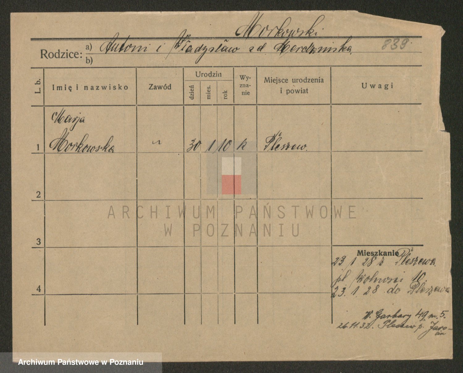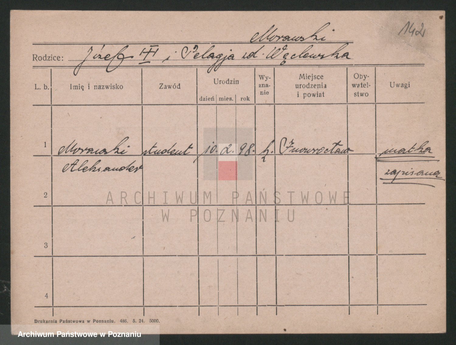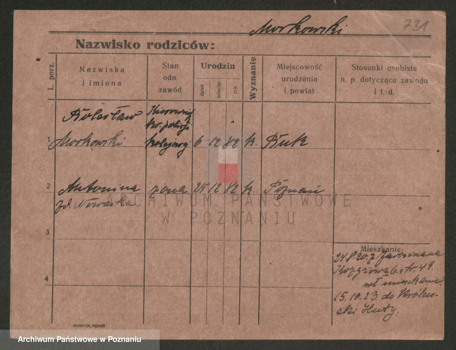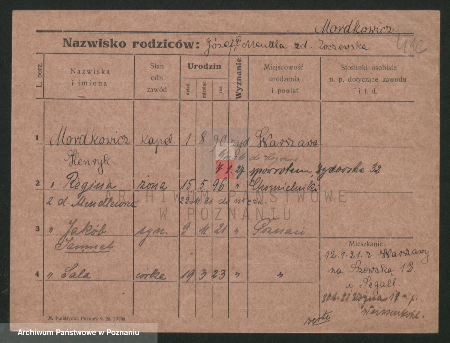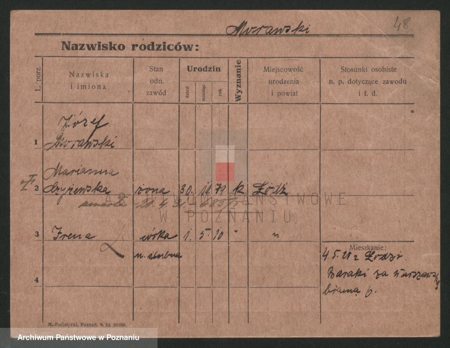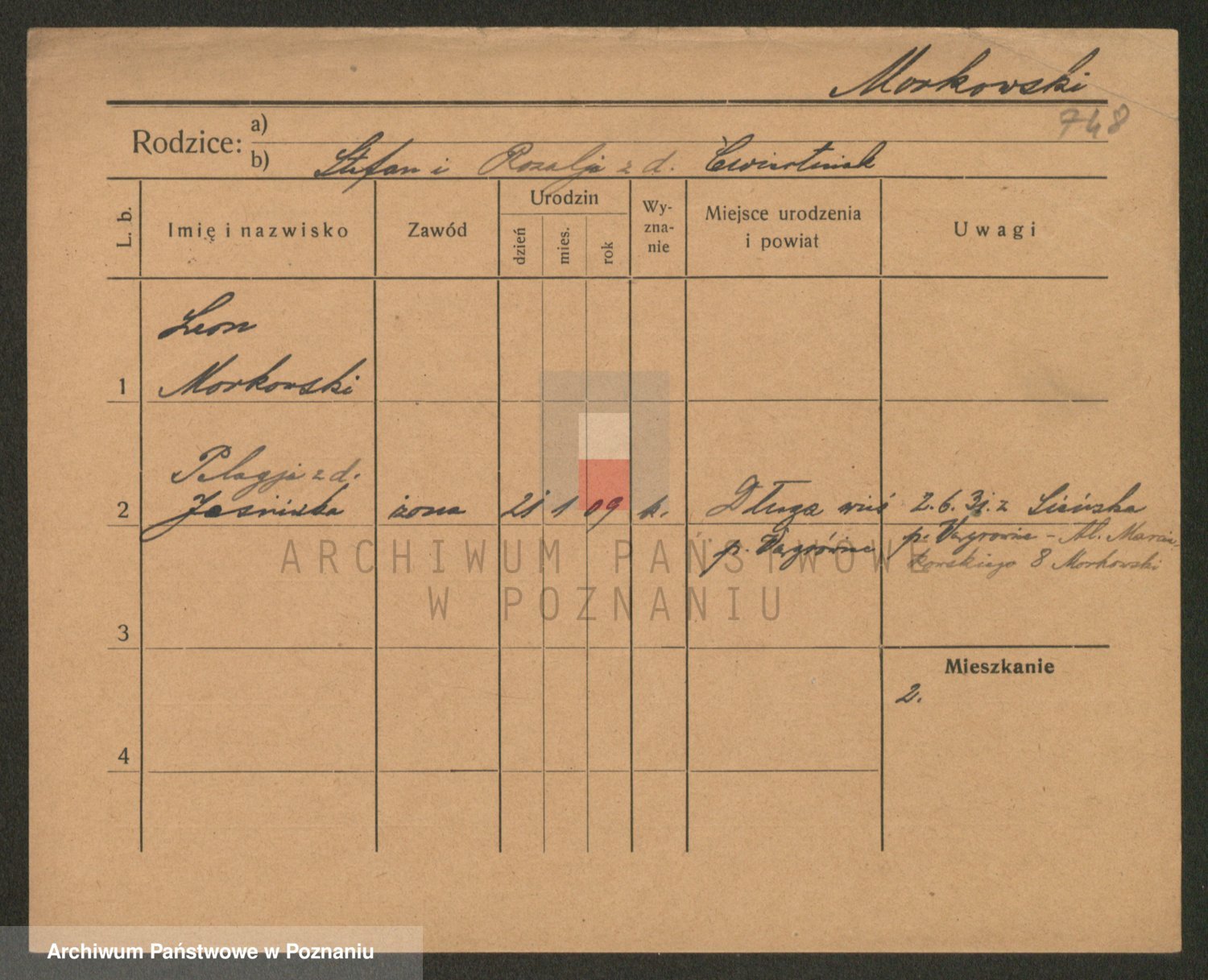 Podgląd karty osobowej dostępny jest po kliknięciu na nazwisko lub ikonkę karty. Można dokonywać powiększenia (ikony na górze) lub przechodzić między kolejnymi skanami (strzałki po bokach).