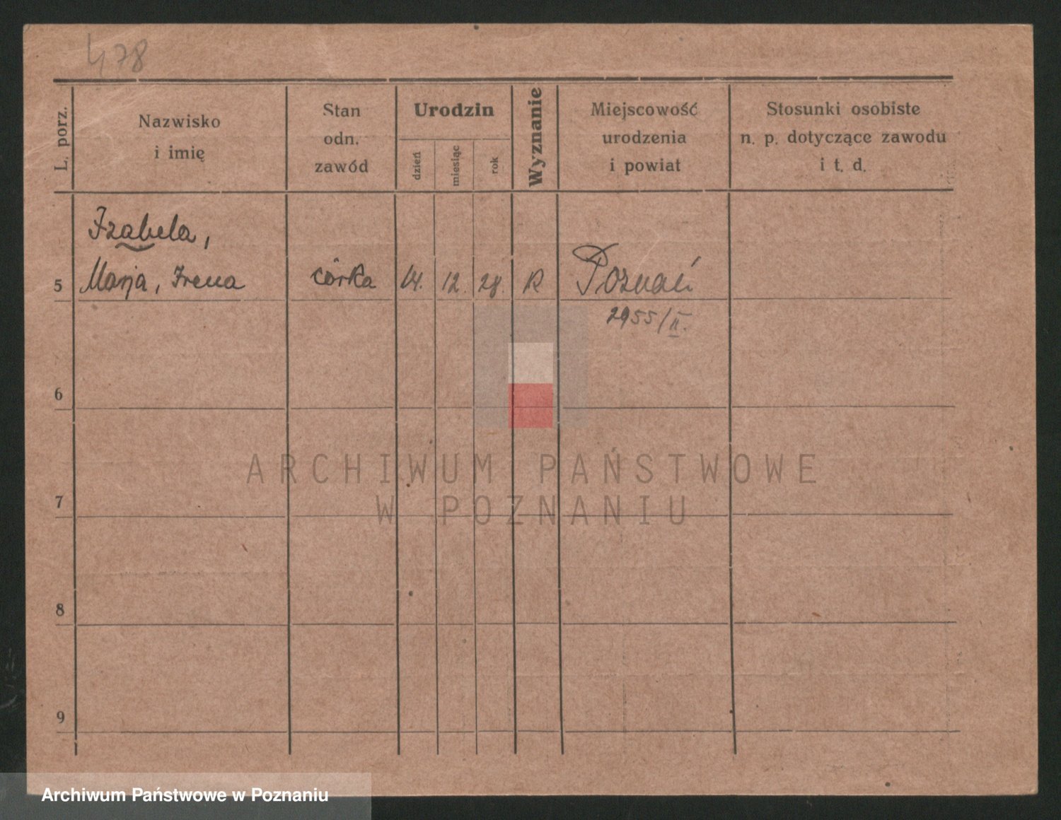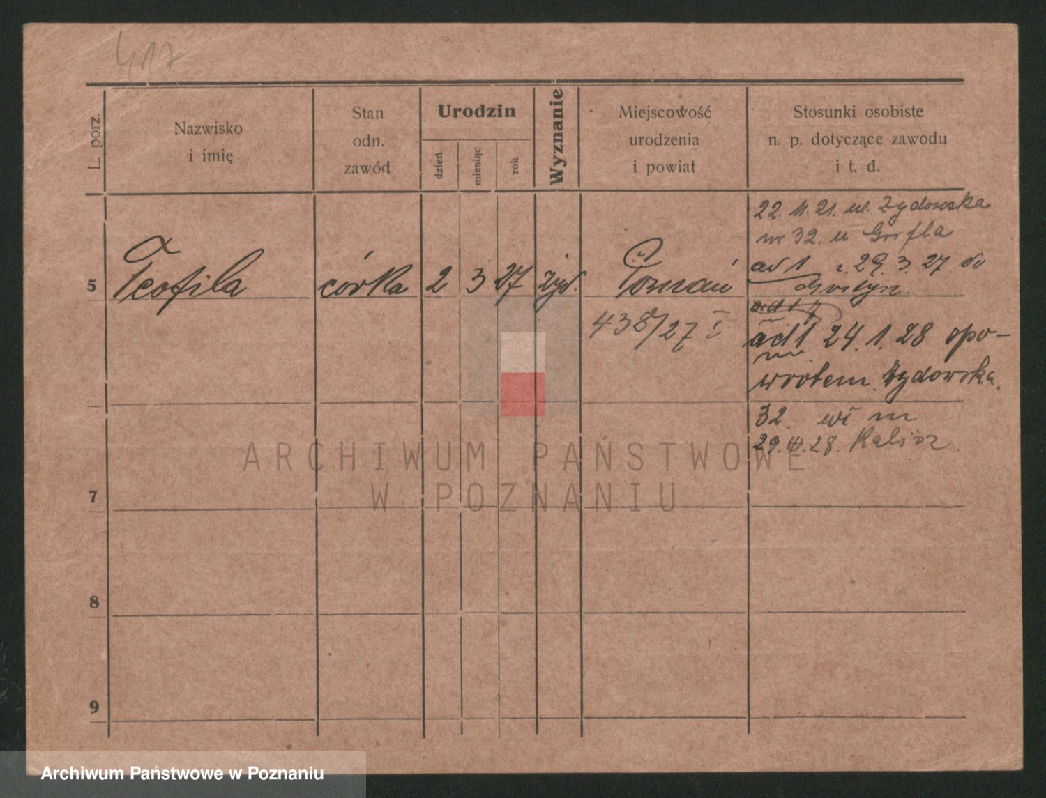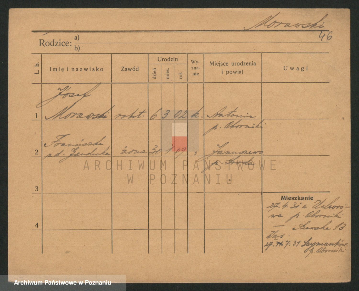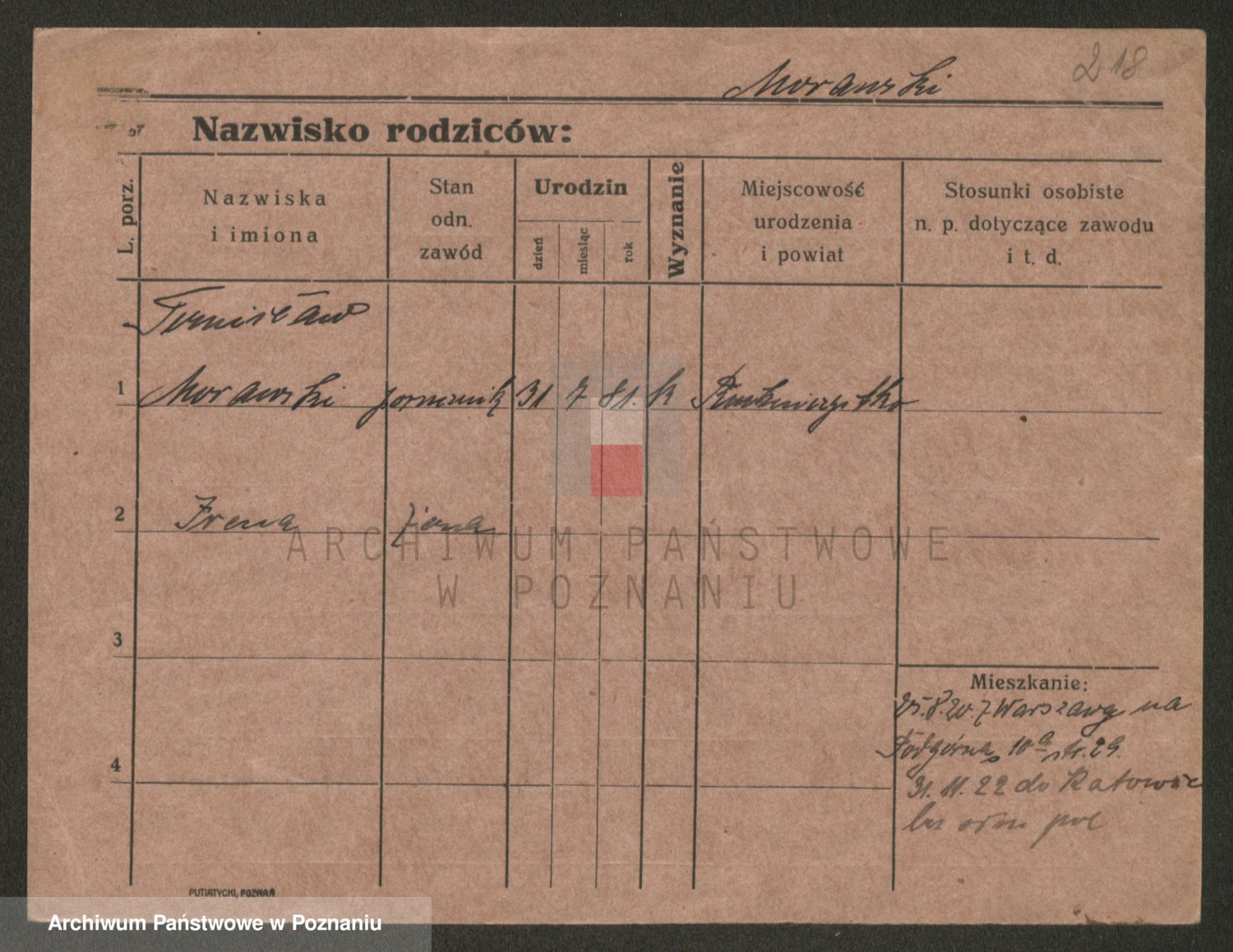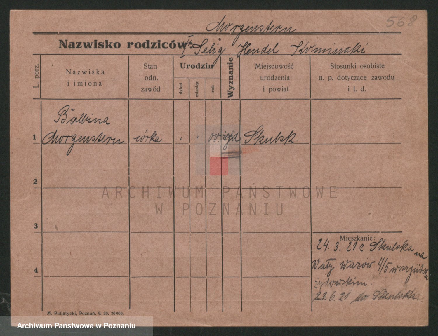Podgląd karty osobowej dostępny jest po kliknięciu na nazwisko lub ikonkę karty. Można dokonywać powiększenia (ikony na górze) lub przechodzić między kolejnymi skanami (strzałki po bokach).