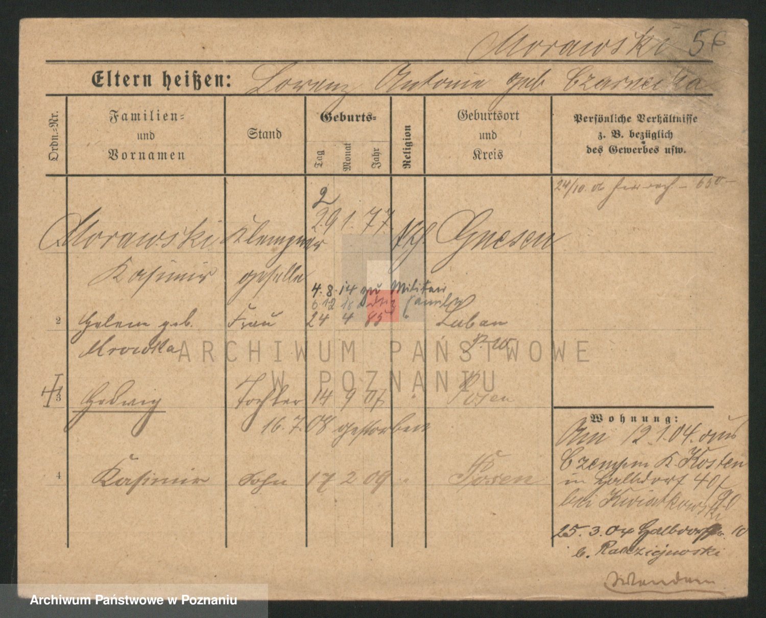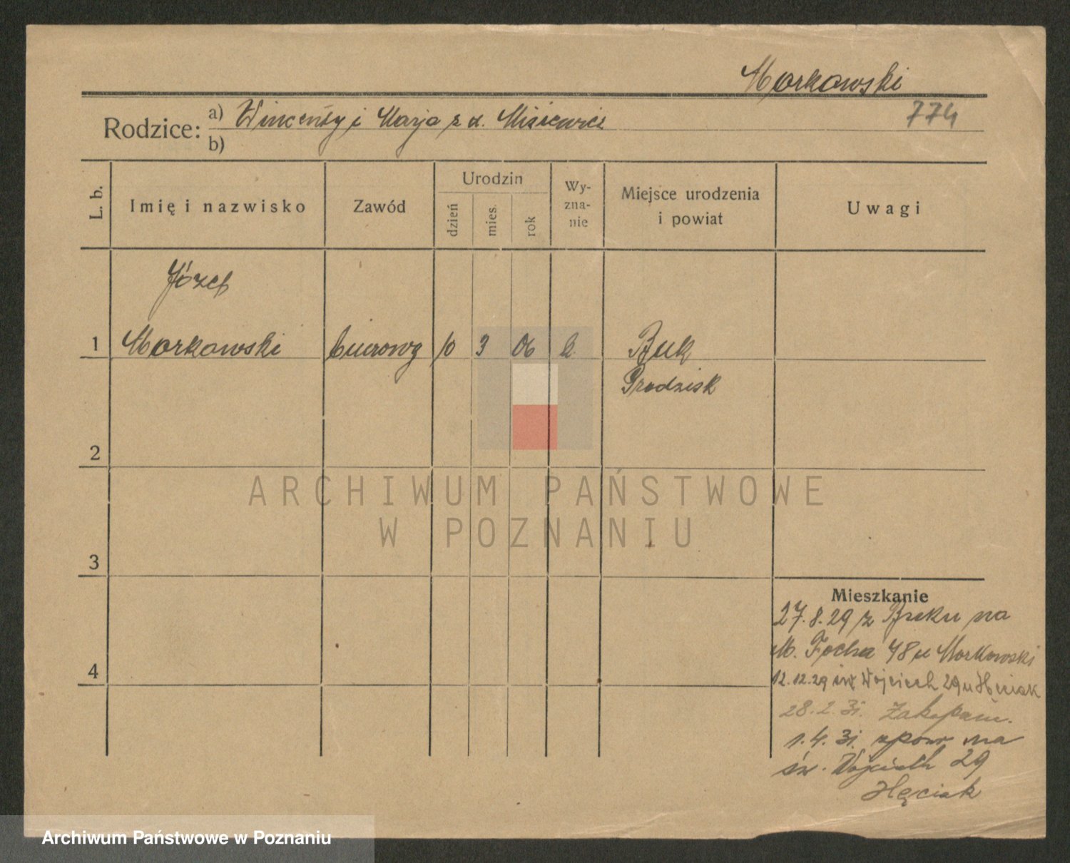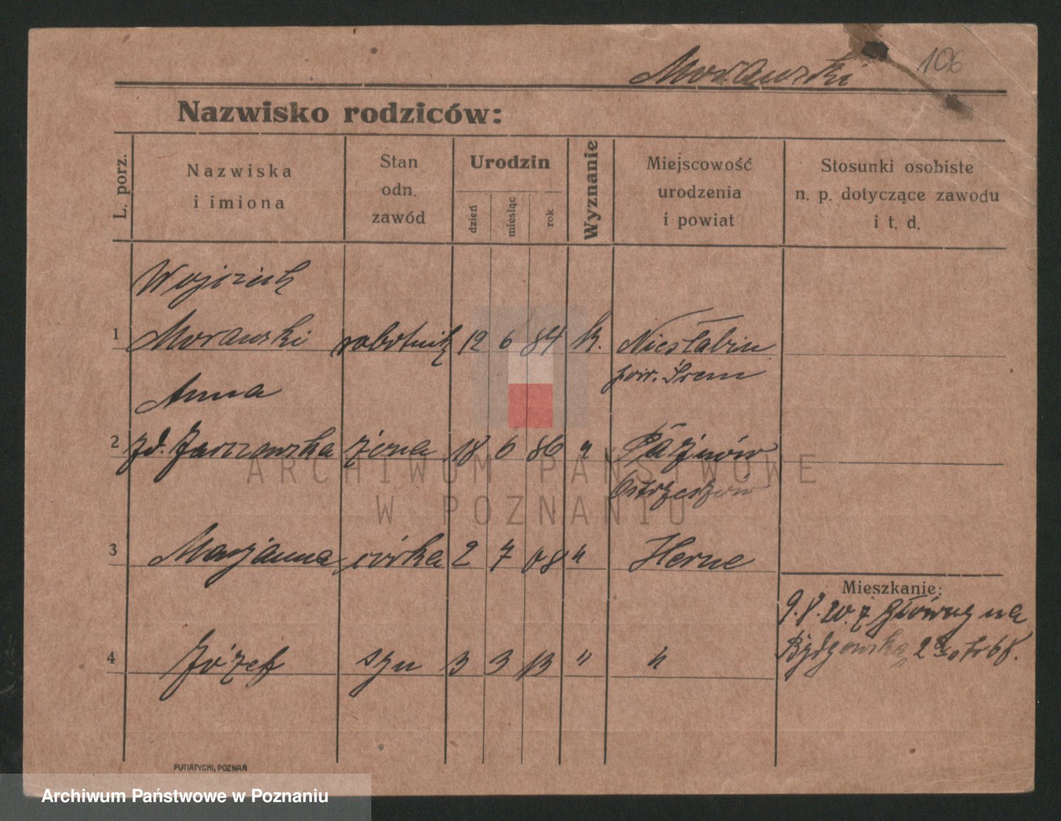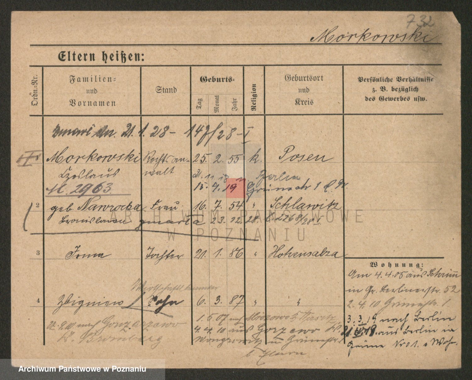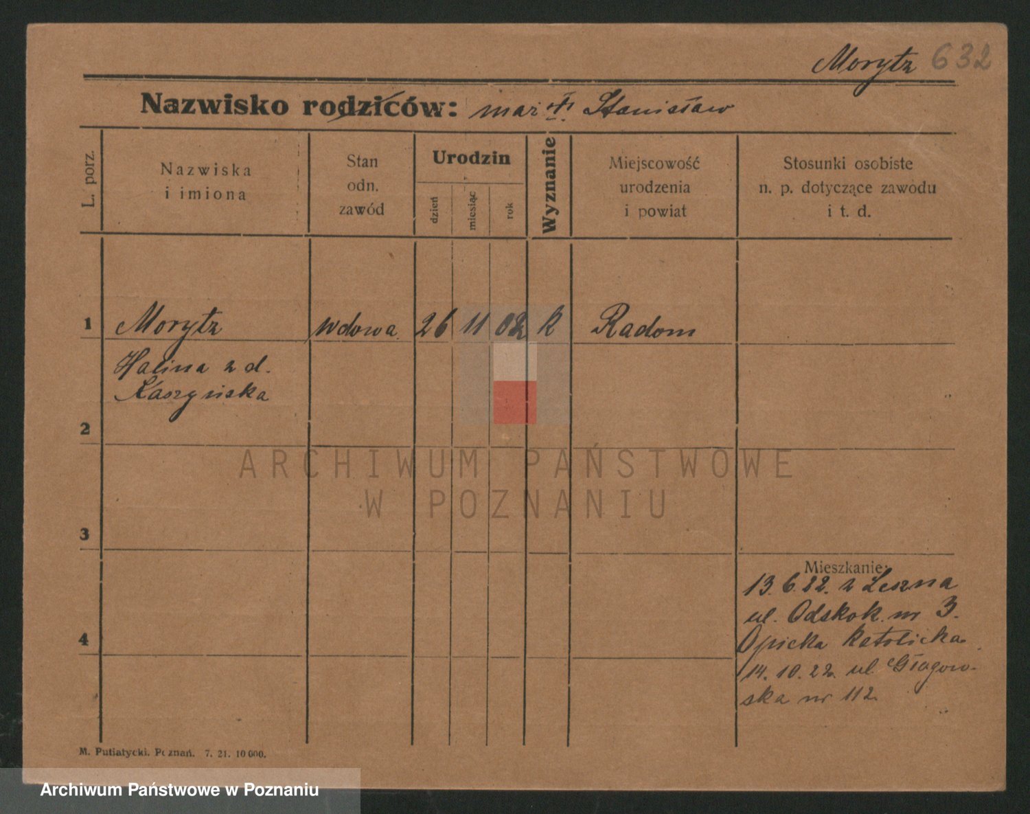 Podgląd karty osobowej dostępny jest po kliknięciu na nazwisko lub ikonkę karty. Można dokonywać powiększenia (ikony na górze) lub przechodzić między kolejnymi skanami (strzałki po bokach).