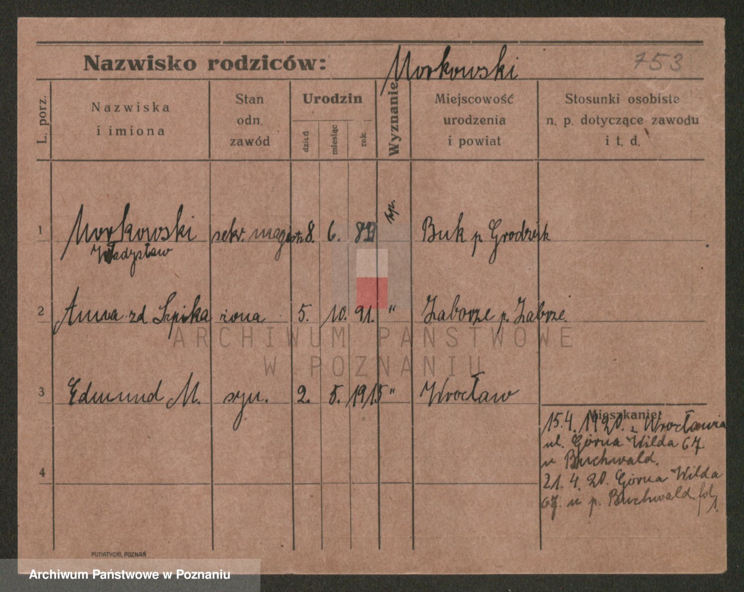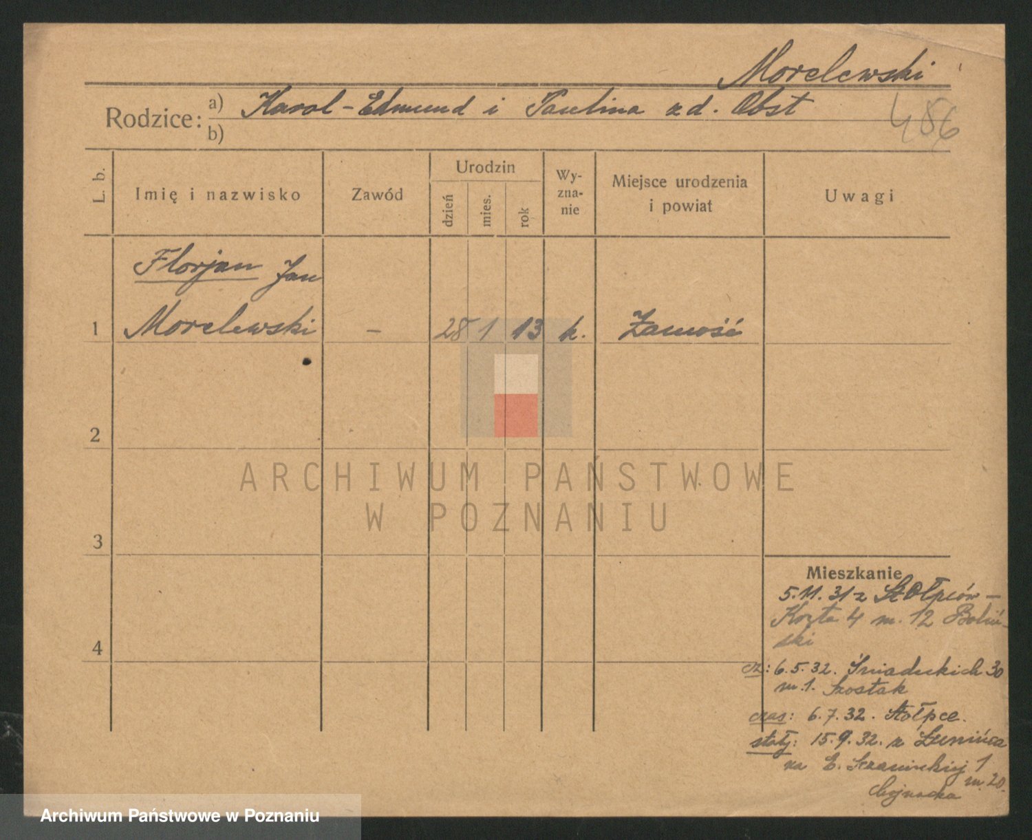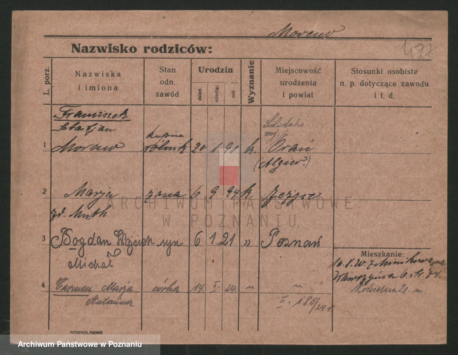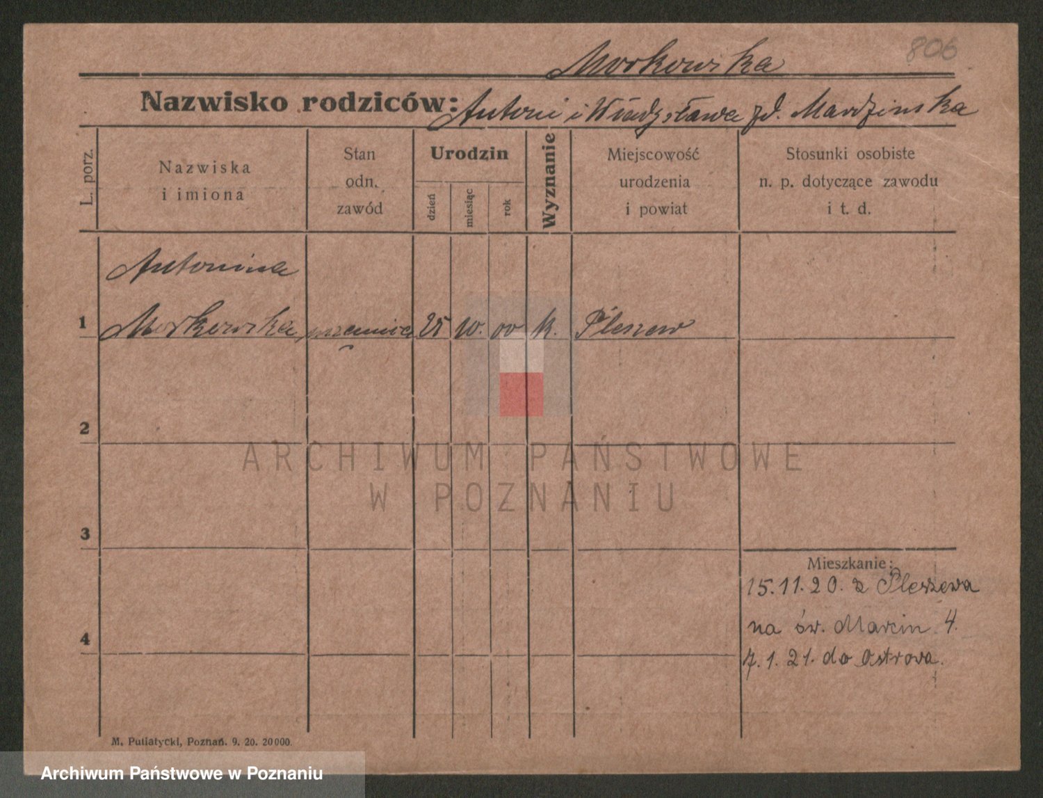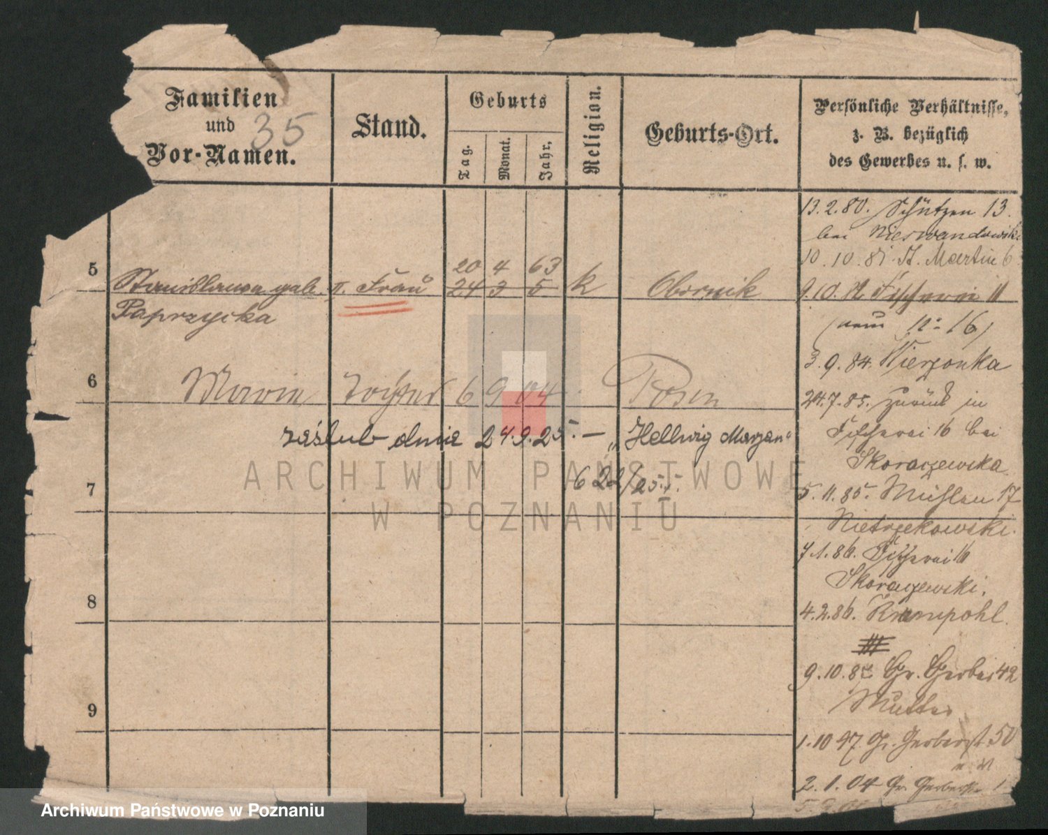 Podgląd karty osobowej dostępny jest po kliknięciu na nazwisko lub ikonkę karty. Można dokonywać powiększenia (ikony na górze) lub przechodzić między kolejnymi skanami (strzałki po bokach).