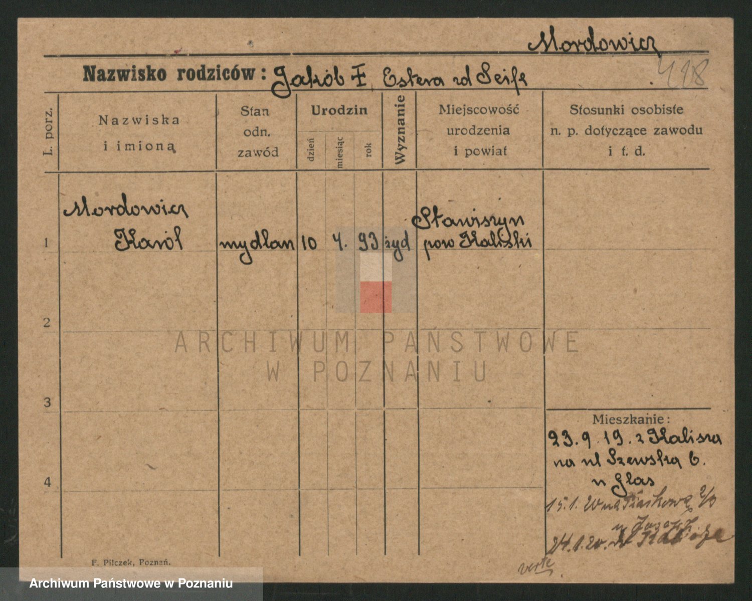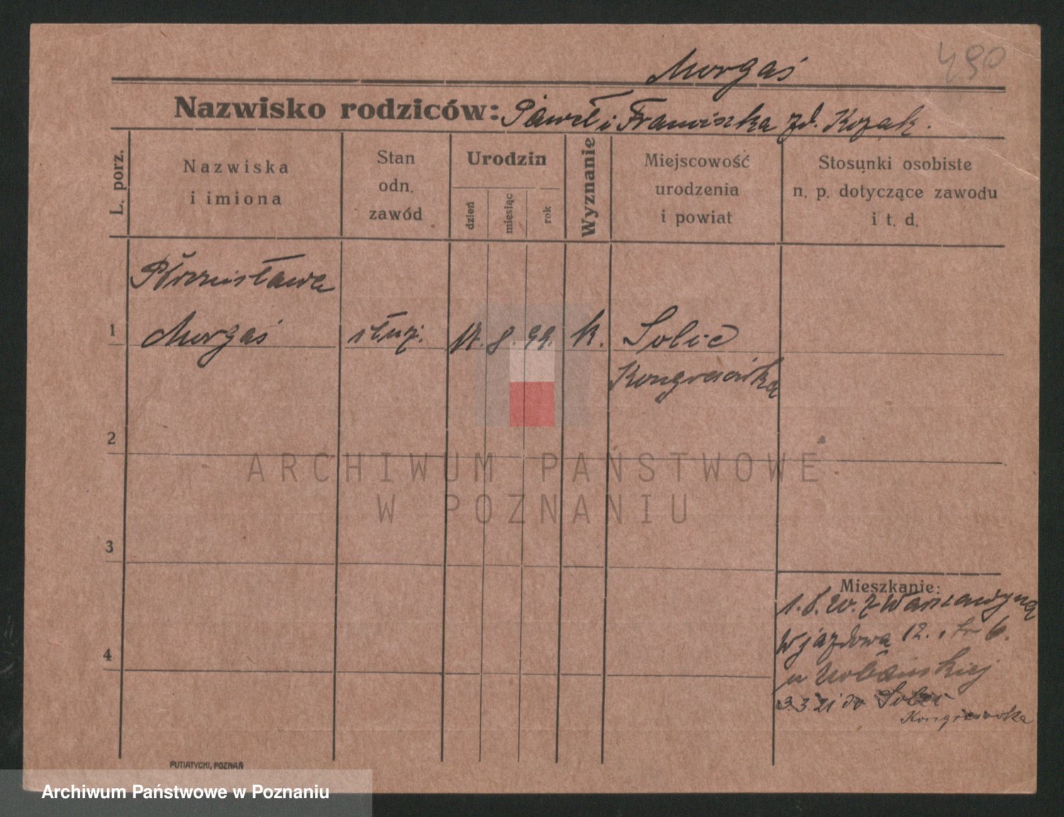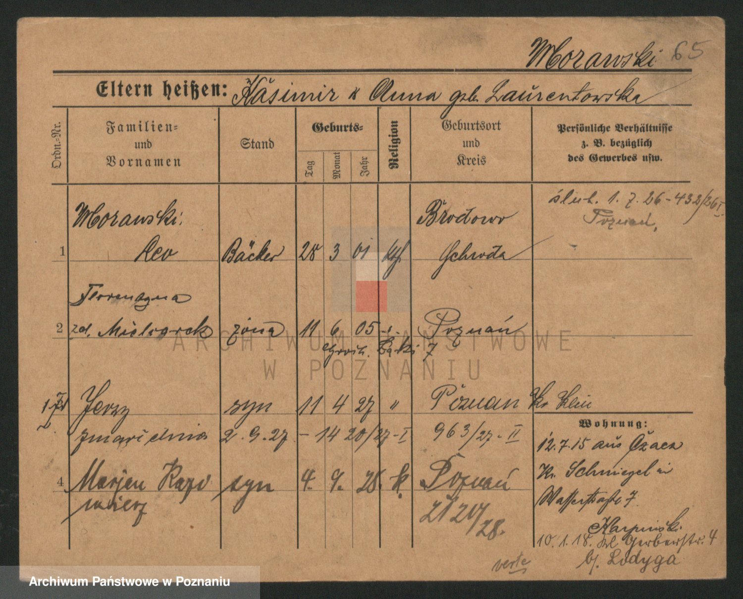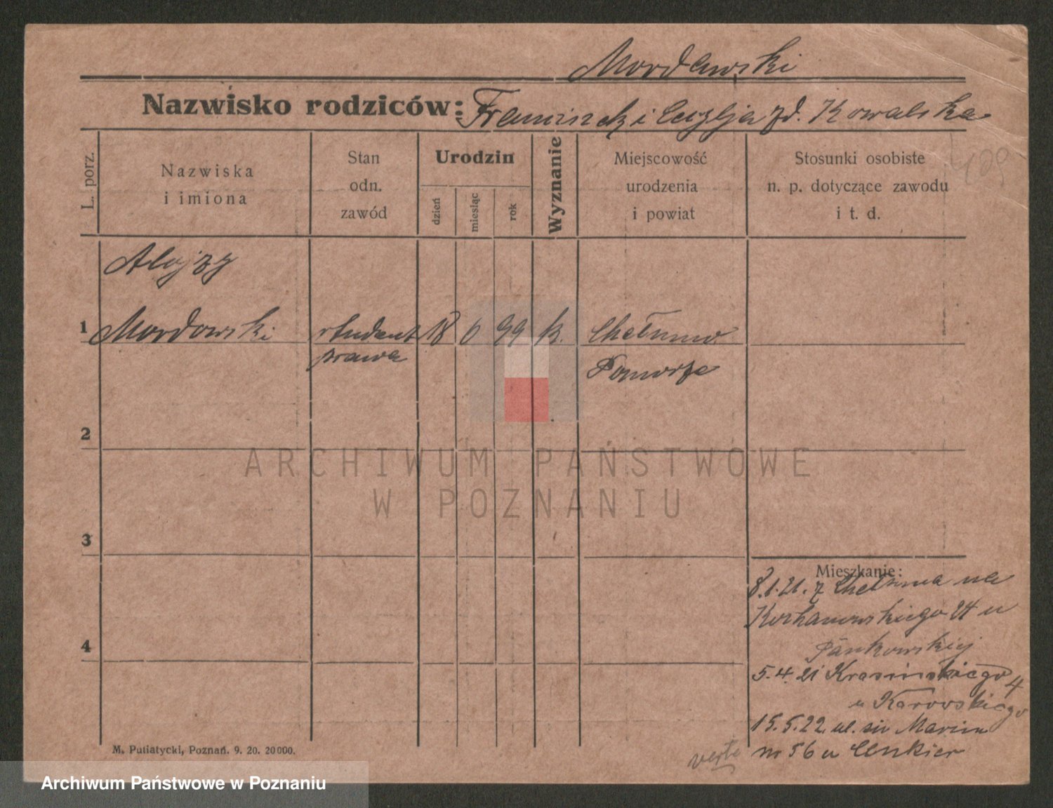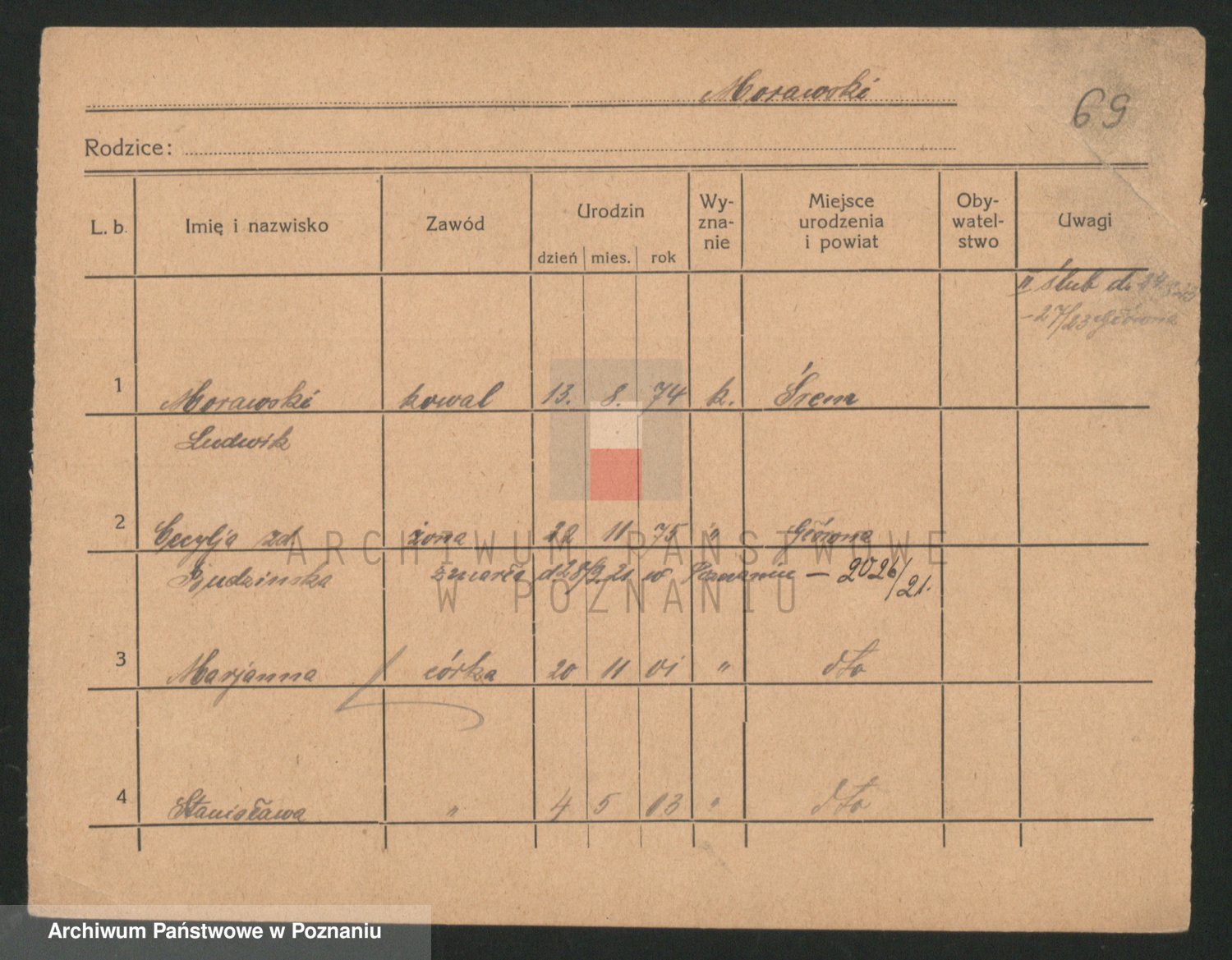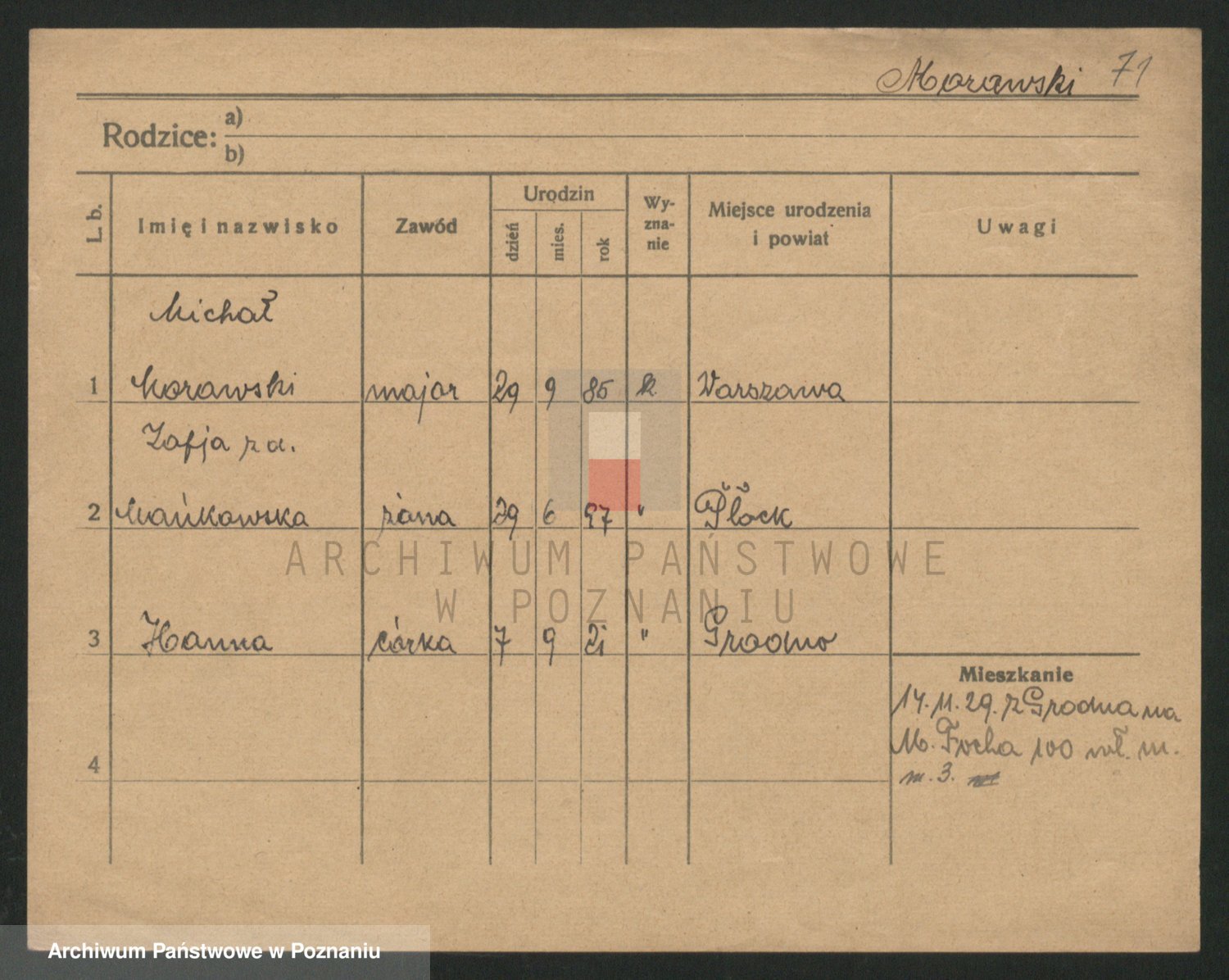 Podgląd karty osobowej dostępny jest po kliknięciu na nazwisko lub ikonkę karty. Można dokonywać powiększenia (ikony na górze) lub przechodzić między kolejnymi skanami (strzałki po bokach).