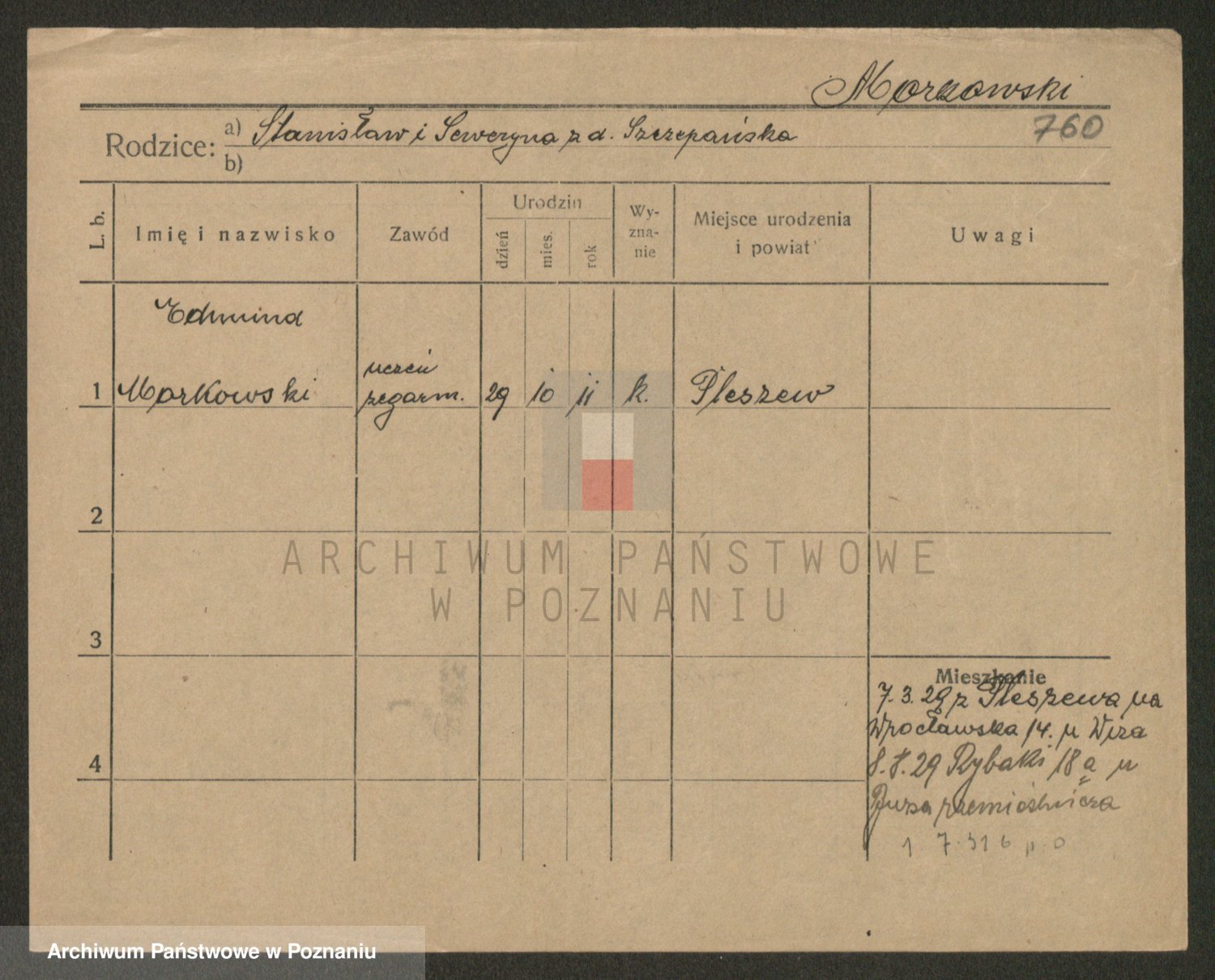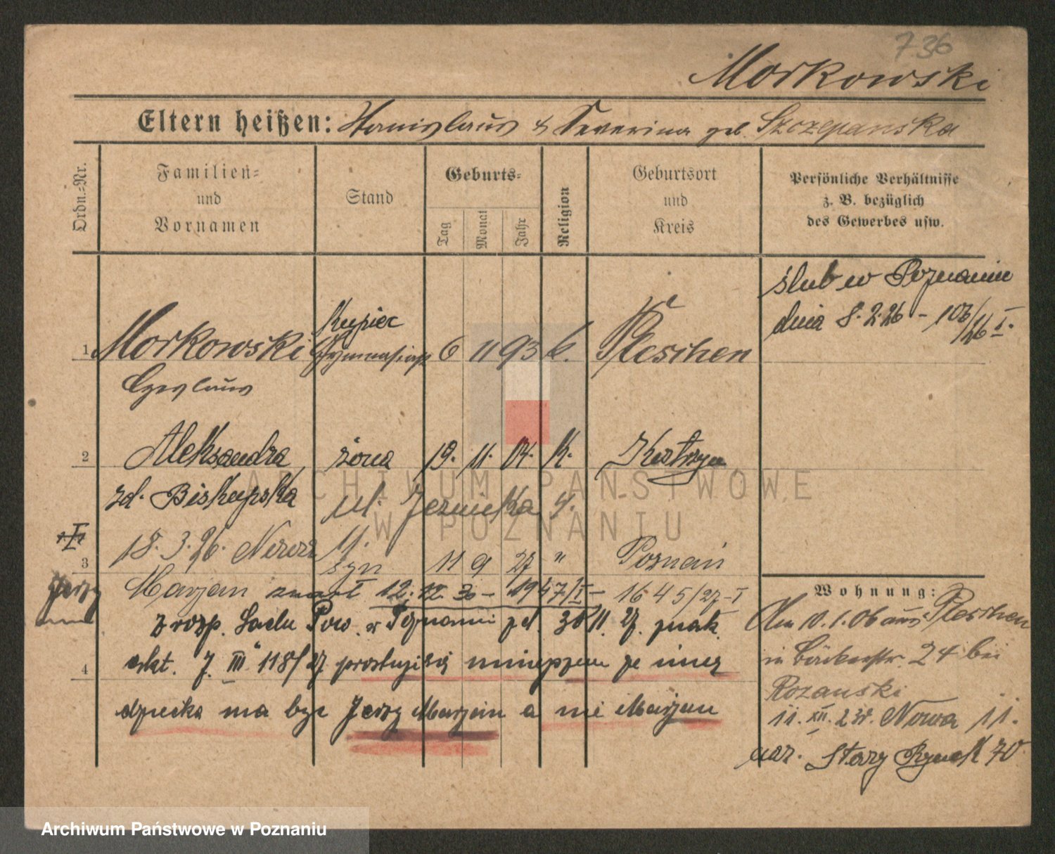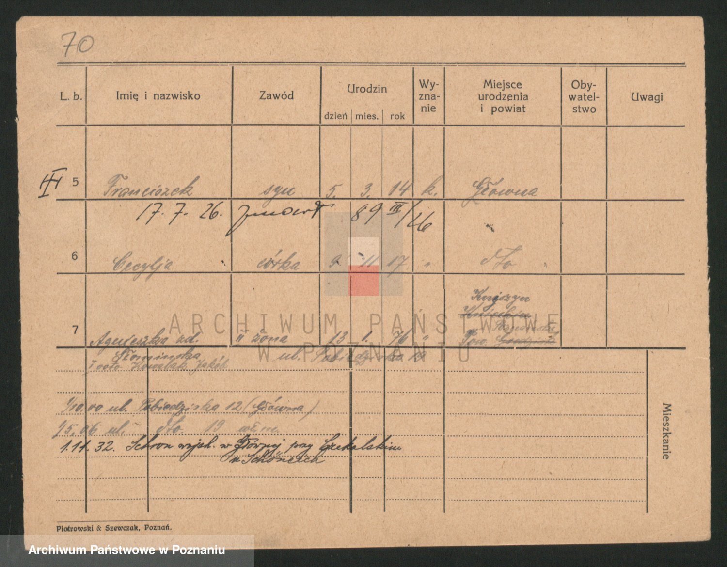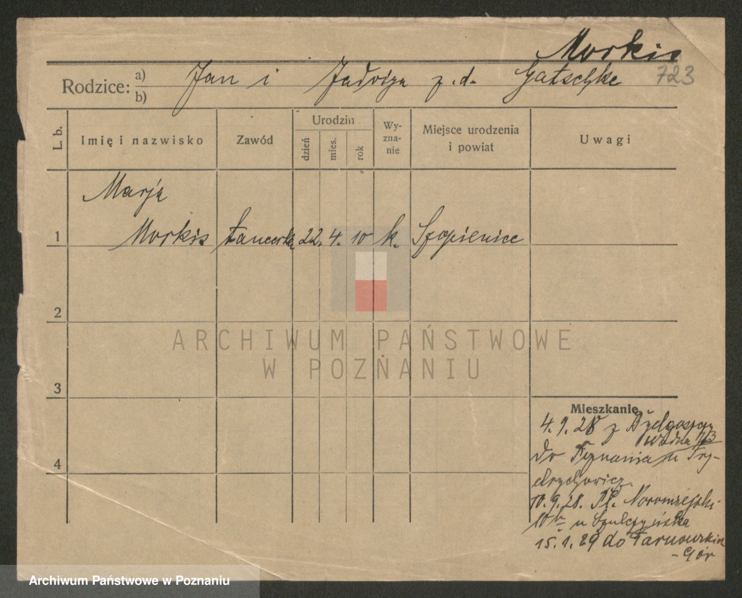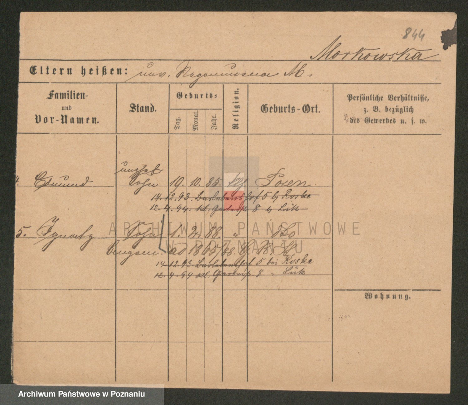 Podgląd karty osobowej dostępny jest po kliknięciu na nazwisko lub ikonkę karty. Można dokonywać powiększenia (ikony na górze) lub przechodzić między kolejnymi skanami (strzałki po bokach).