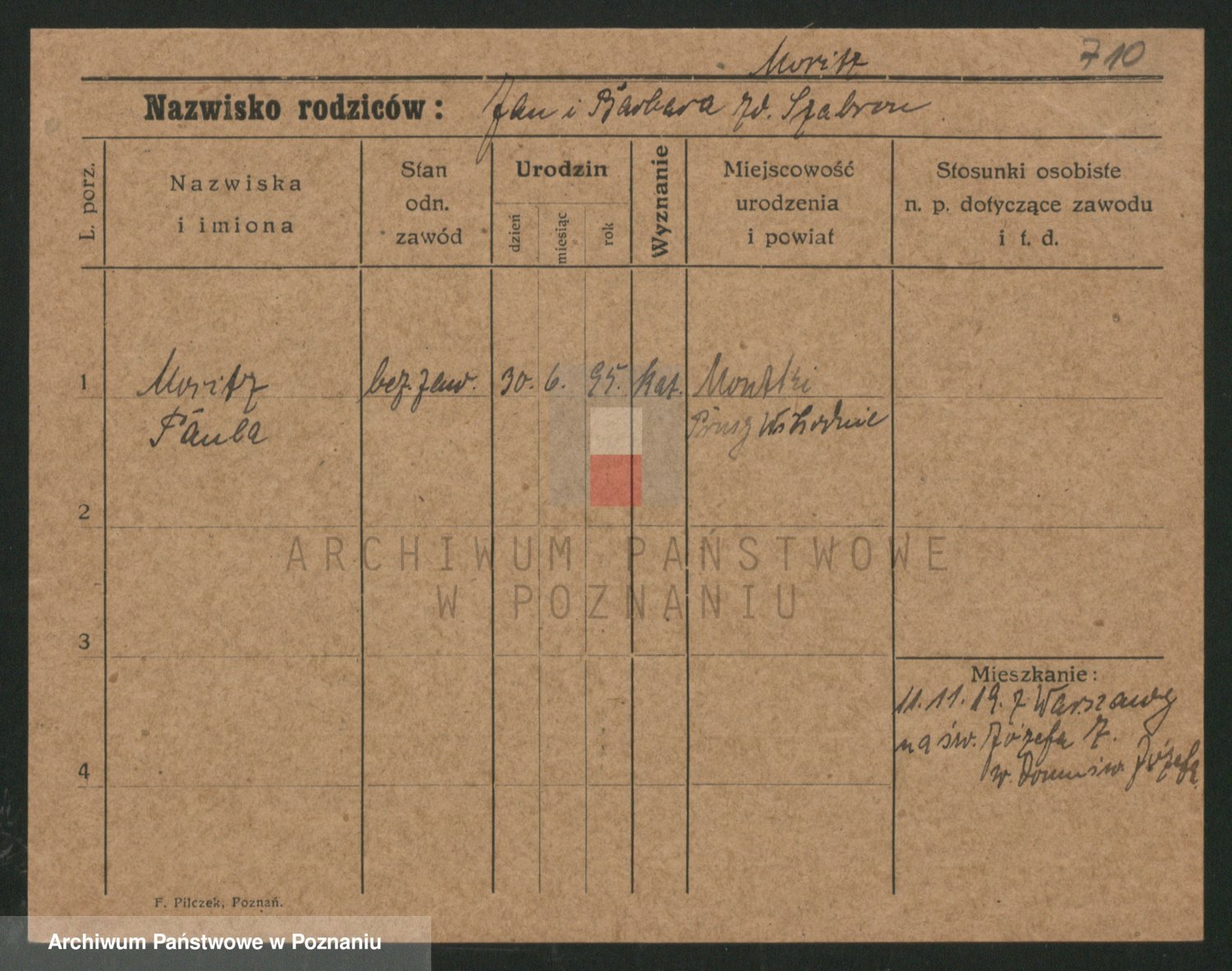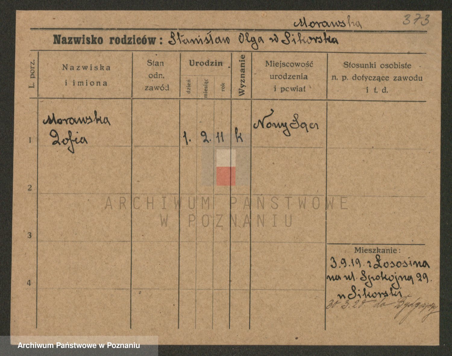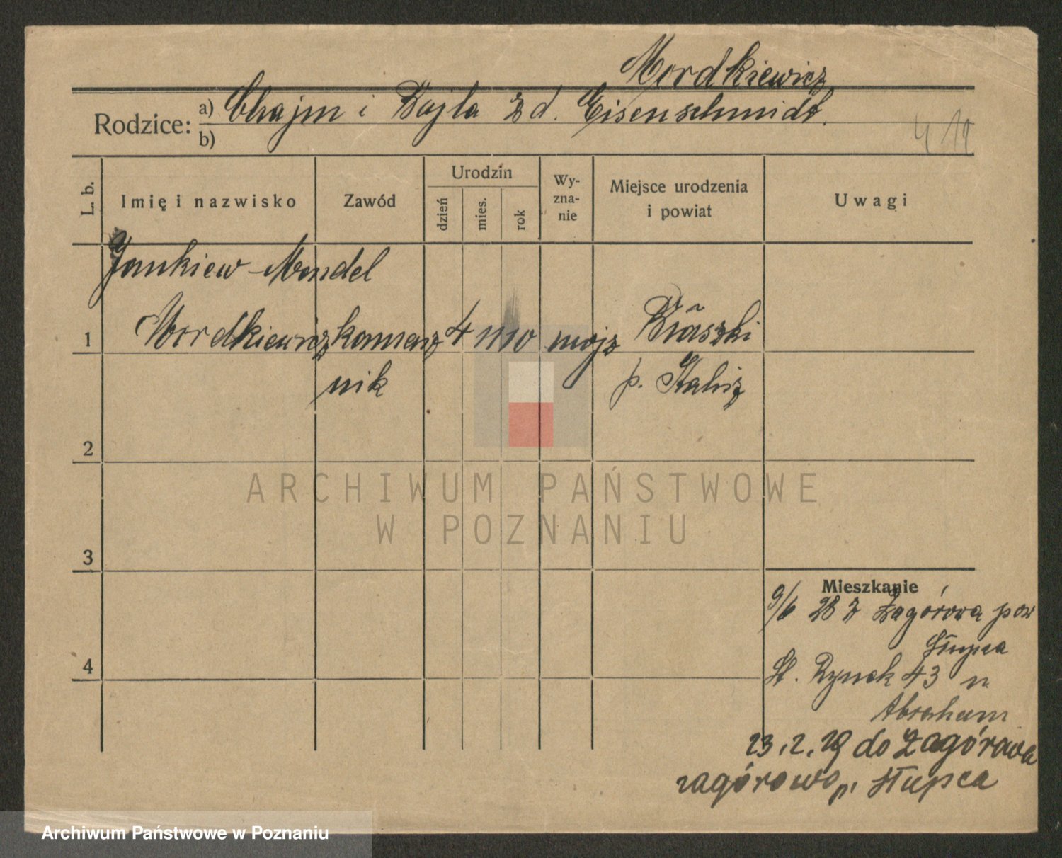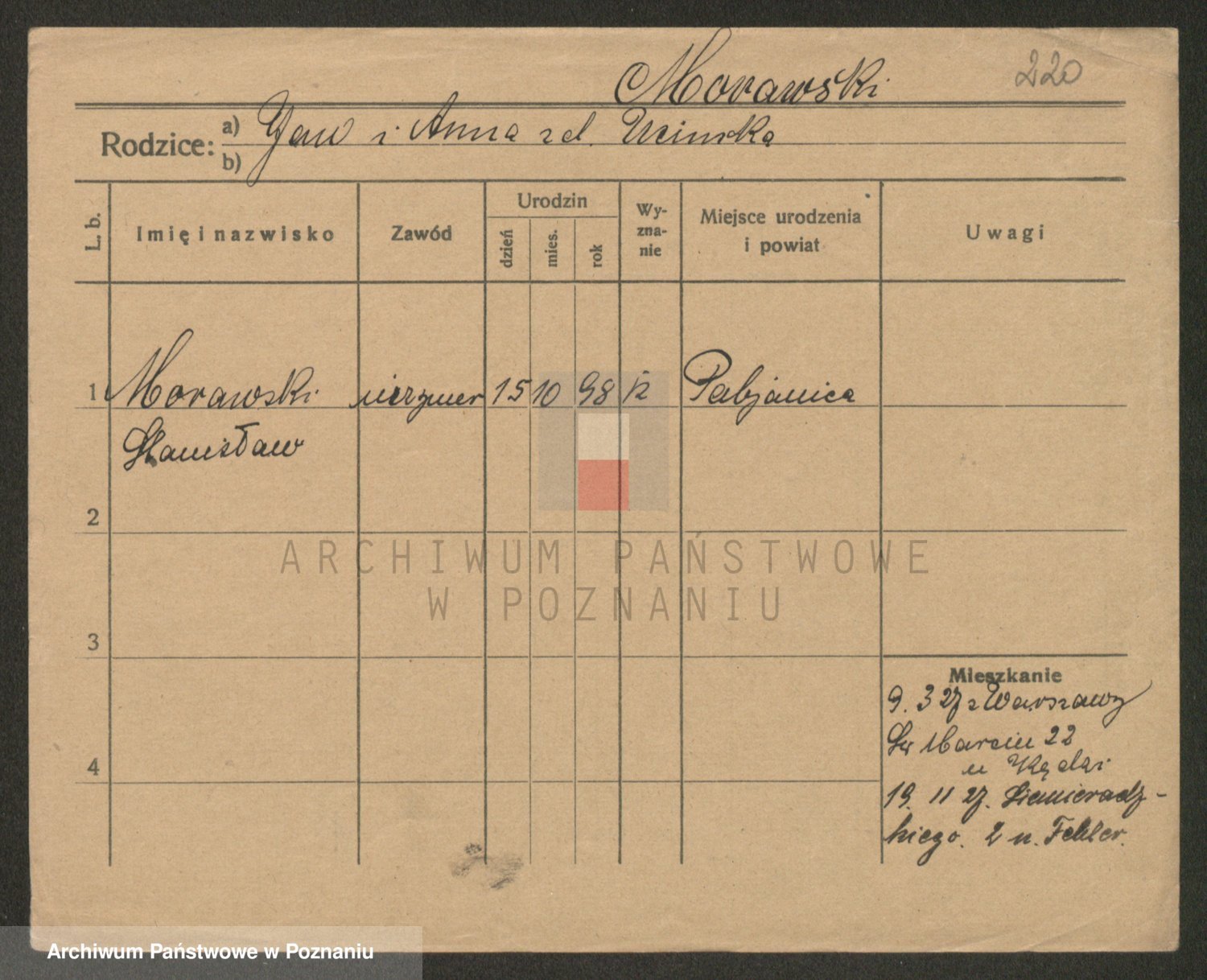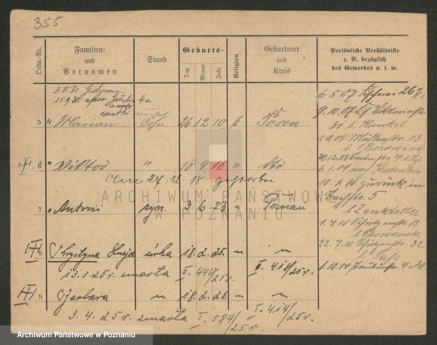 Podgląd karty osobowej dostępny jest po kliknięciu na nazwisko lub ikonkę karty. Można dokonywać powiększenia (ikony na górze) lub przechodzić między kolejnymi skanami (strzałki po bokach).
