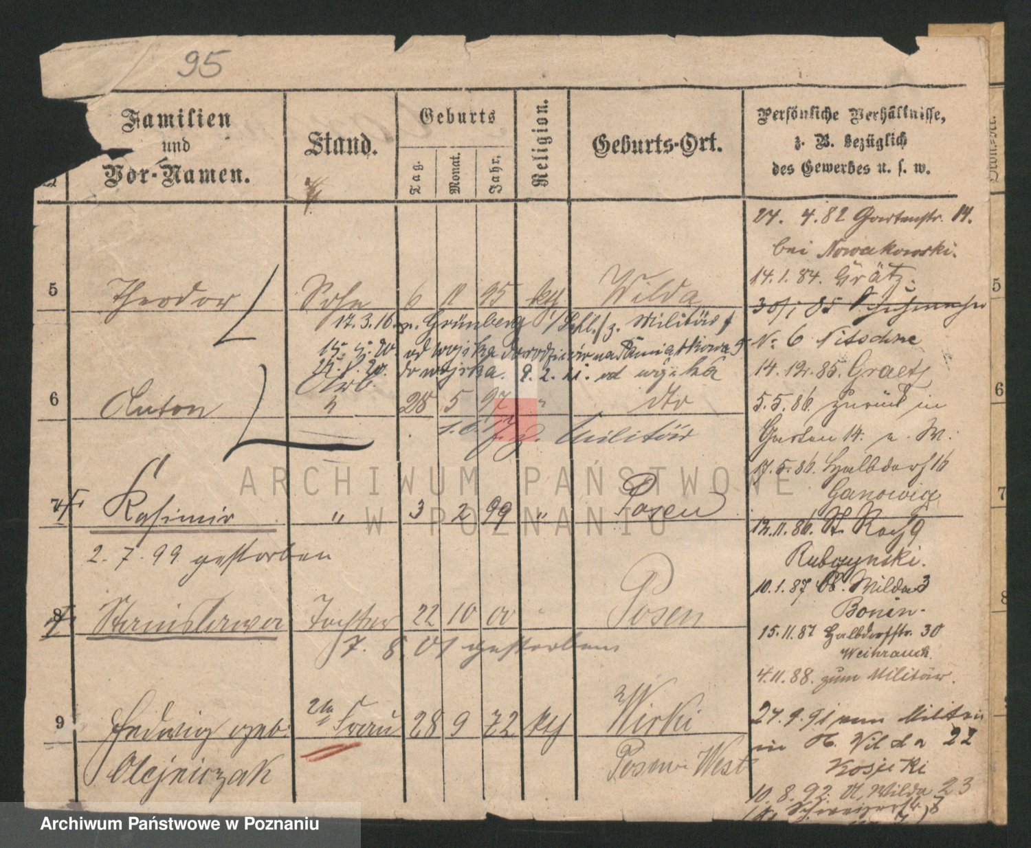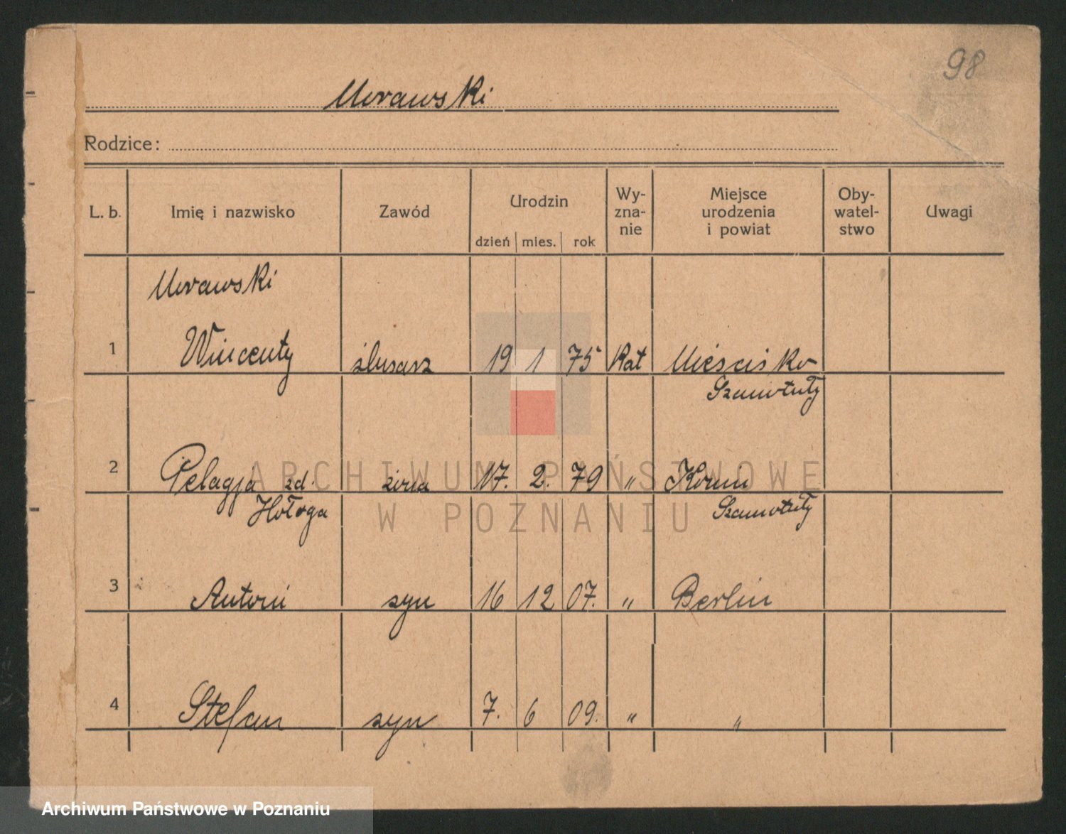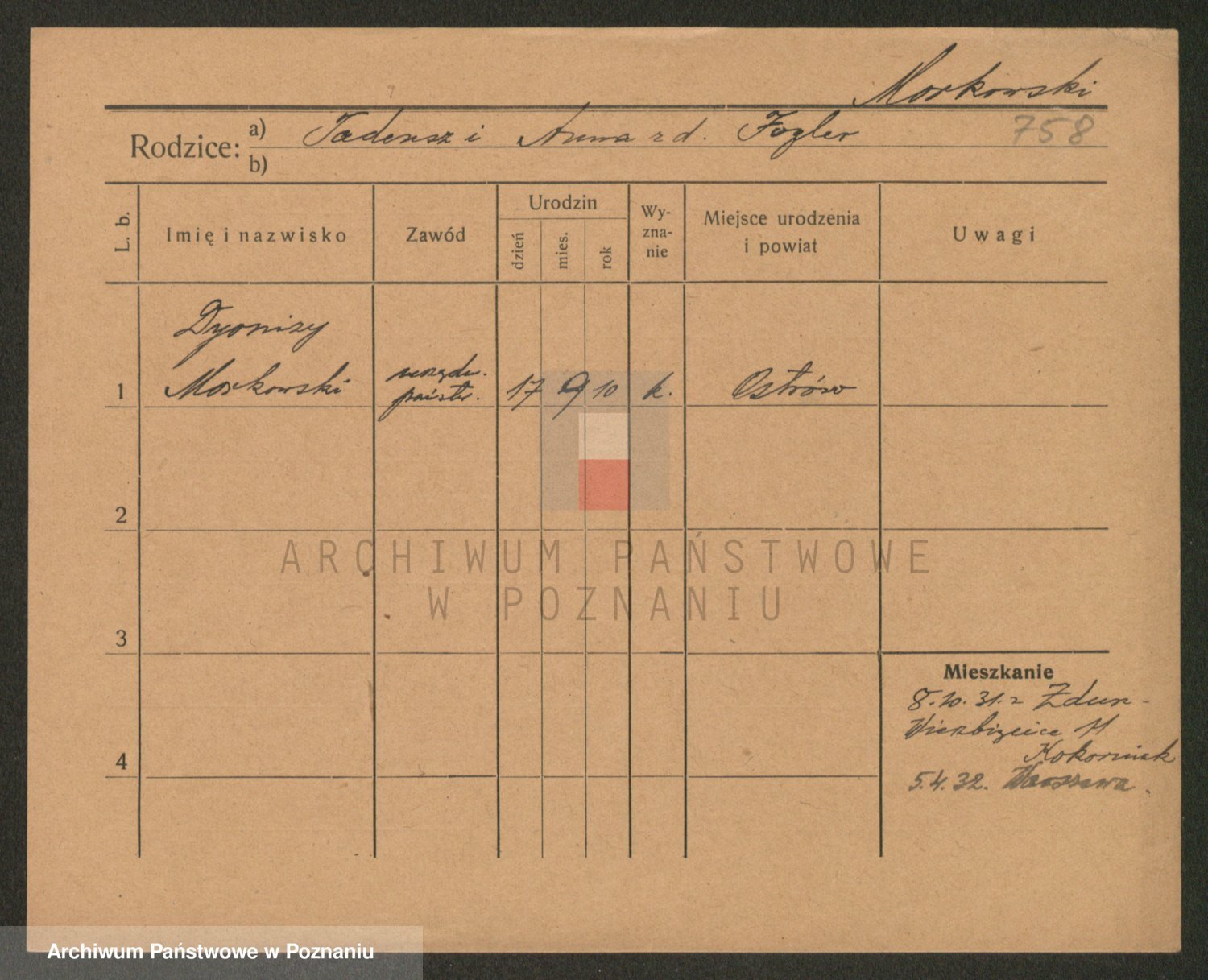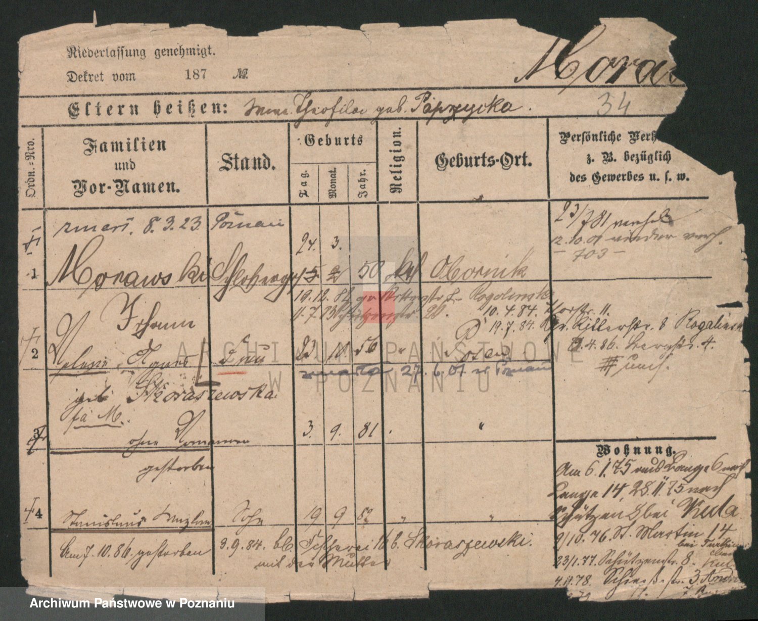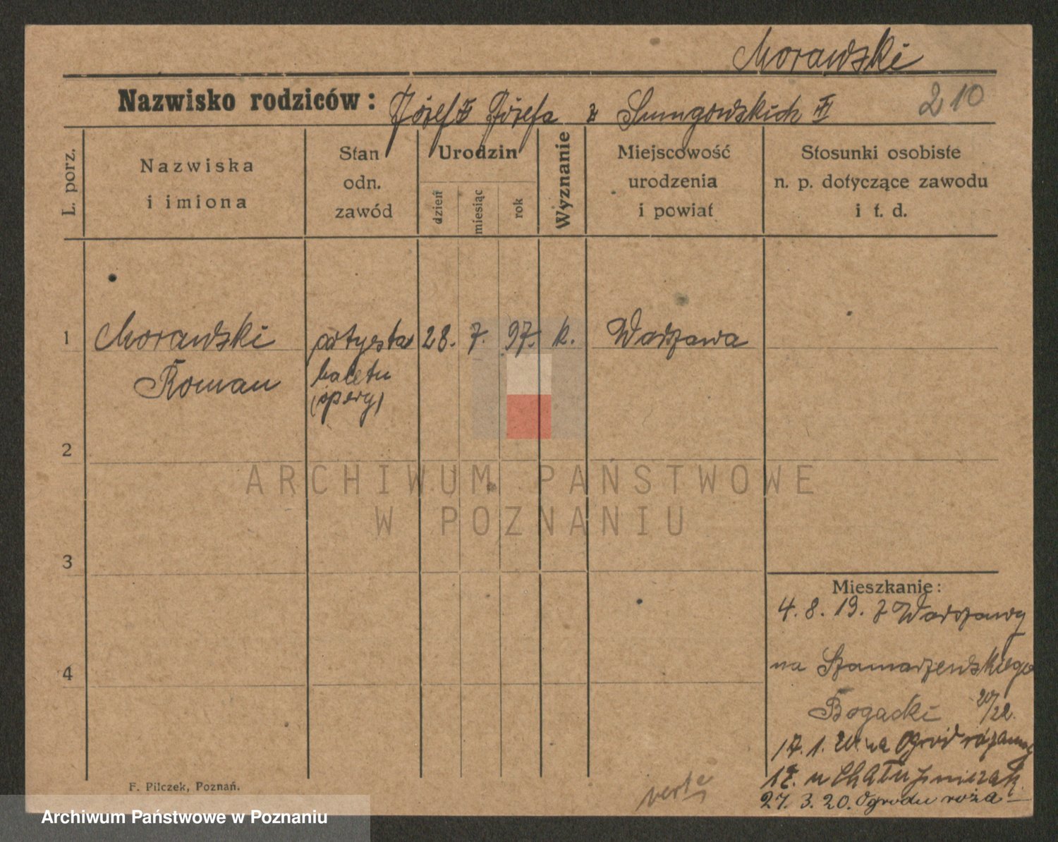 Podgląd karty osobowej dostępny jest po kliknięciu na nazwisko lub ikonkę karty. Można dokonywać powiększenia (ikony na górze) lub przechodzić między kolejnymi skanami (strzałki po bokach).