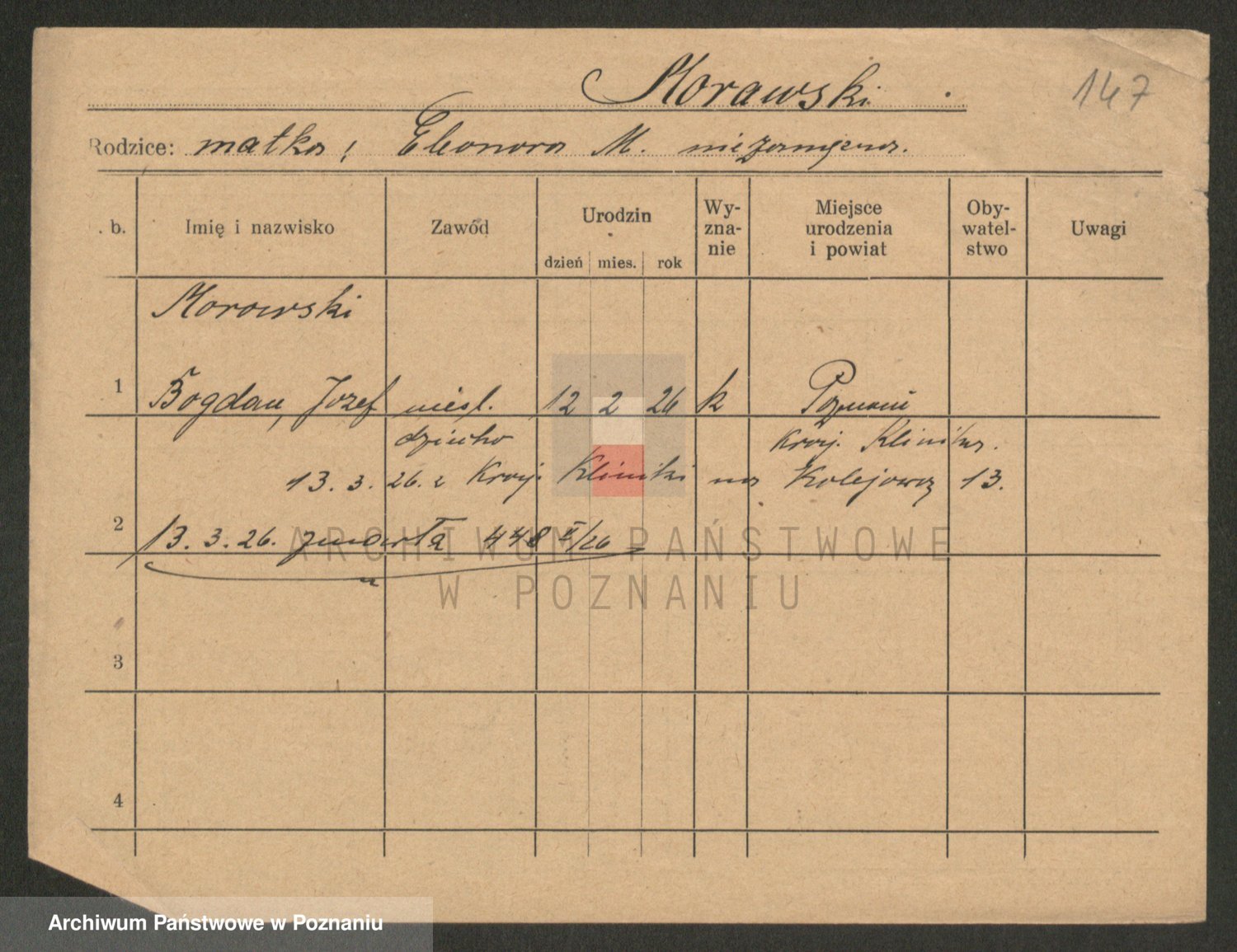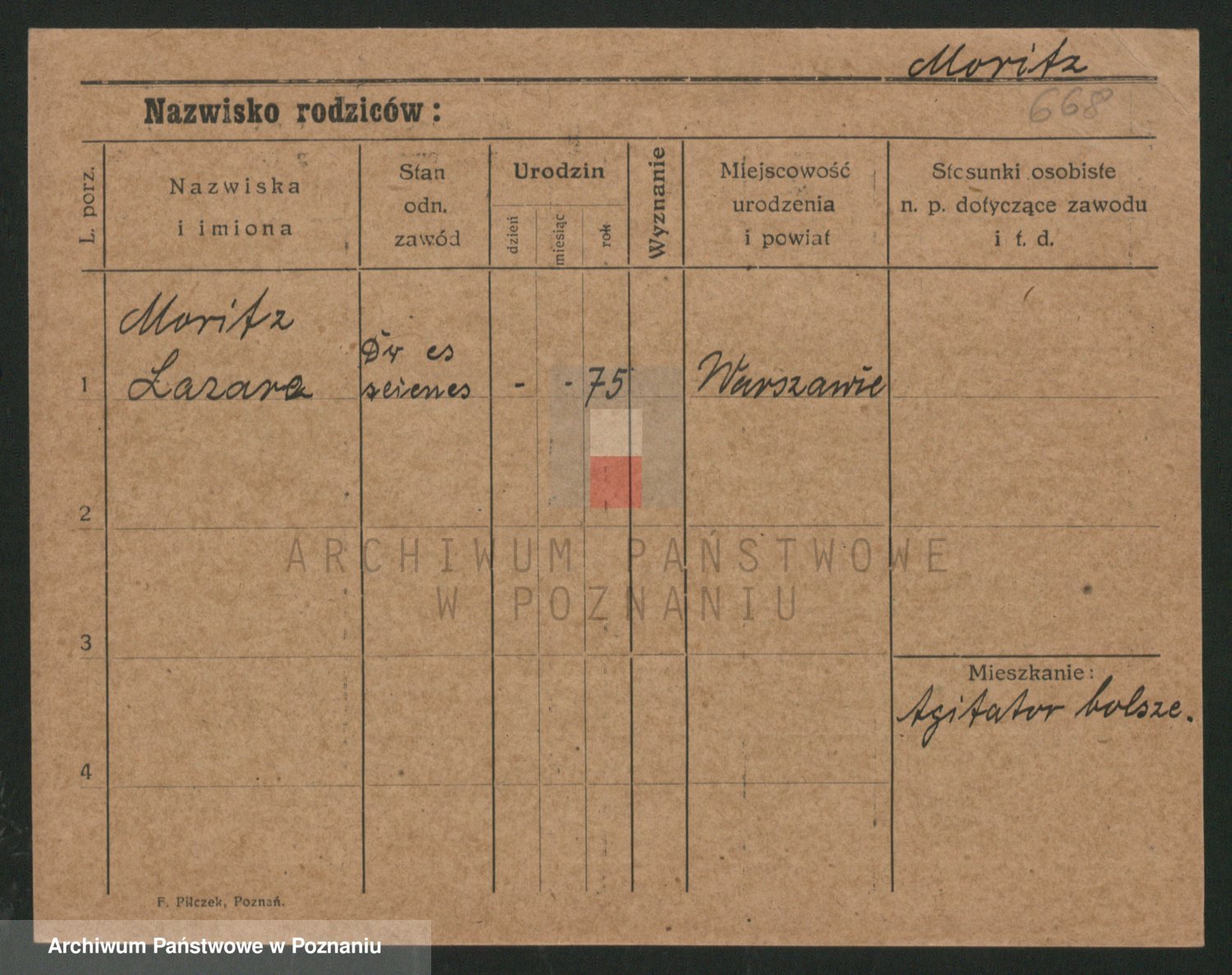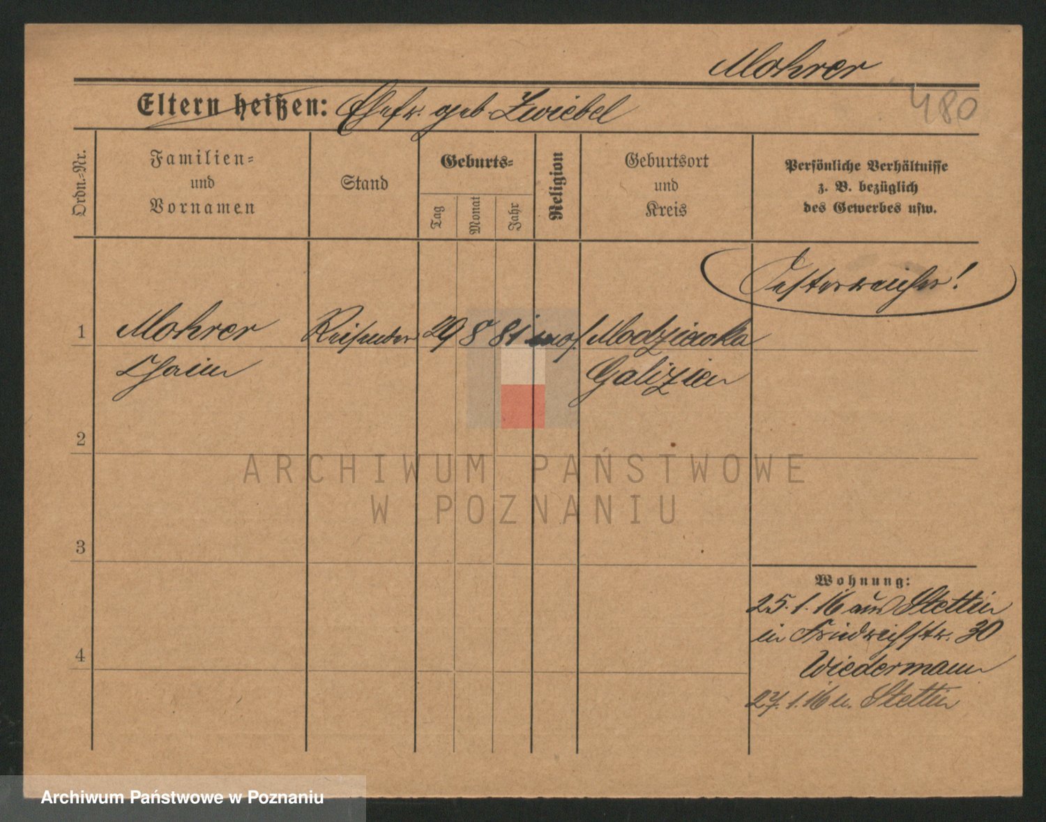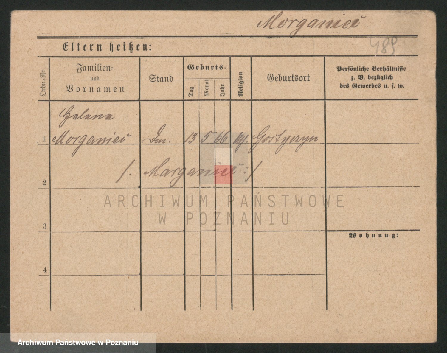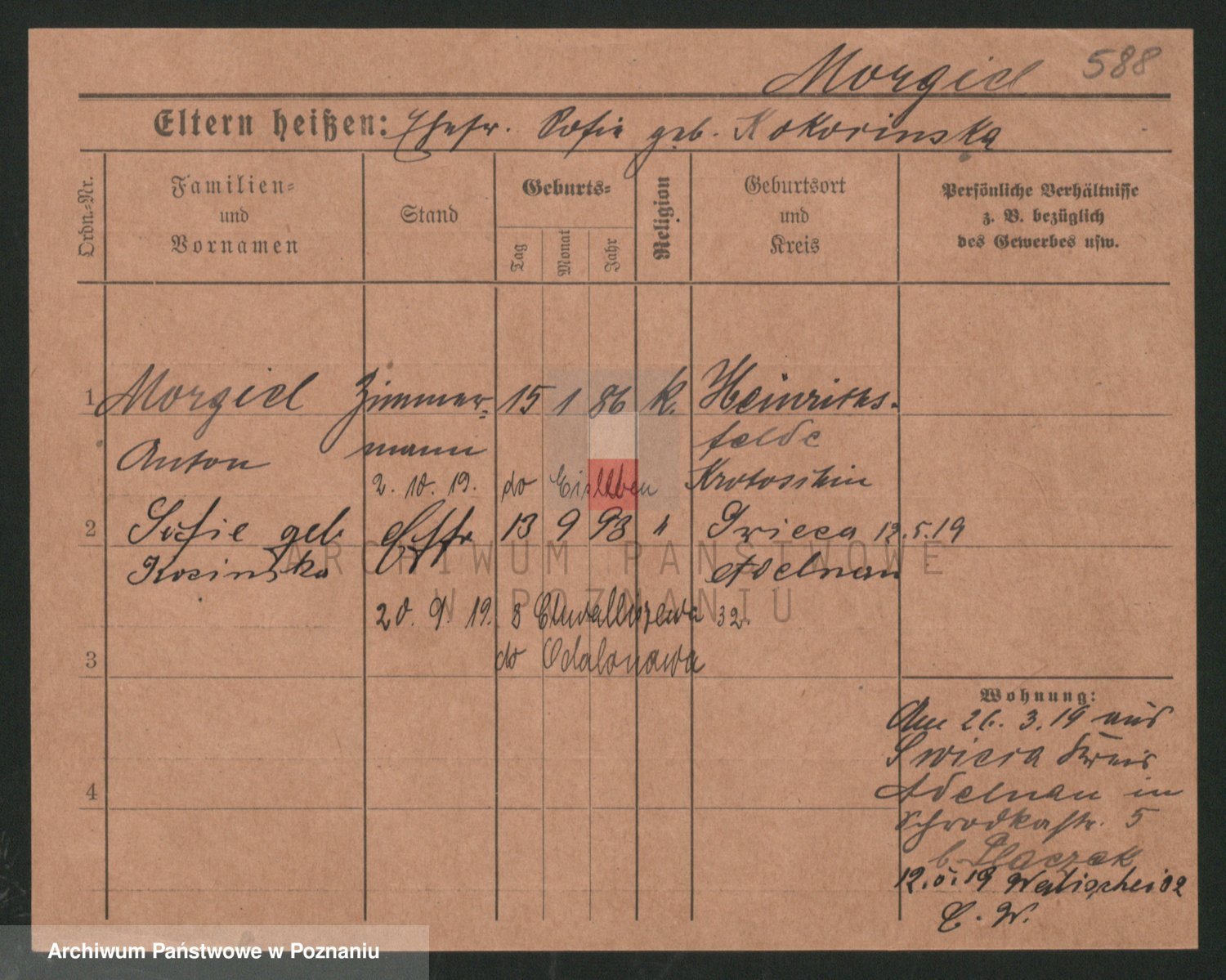 Podgląd karty osobowej dostępny jest po kliknięciu na nazwisko lub ikonkę karty. Można dokonywać powiększenia (ikony na górze) lub przechodzić między kolejnymi skanami (strzałki po bokach).