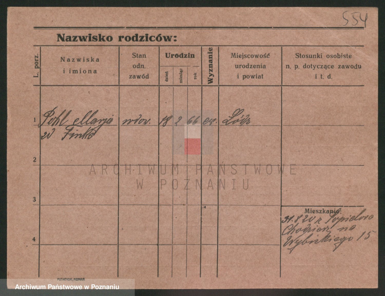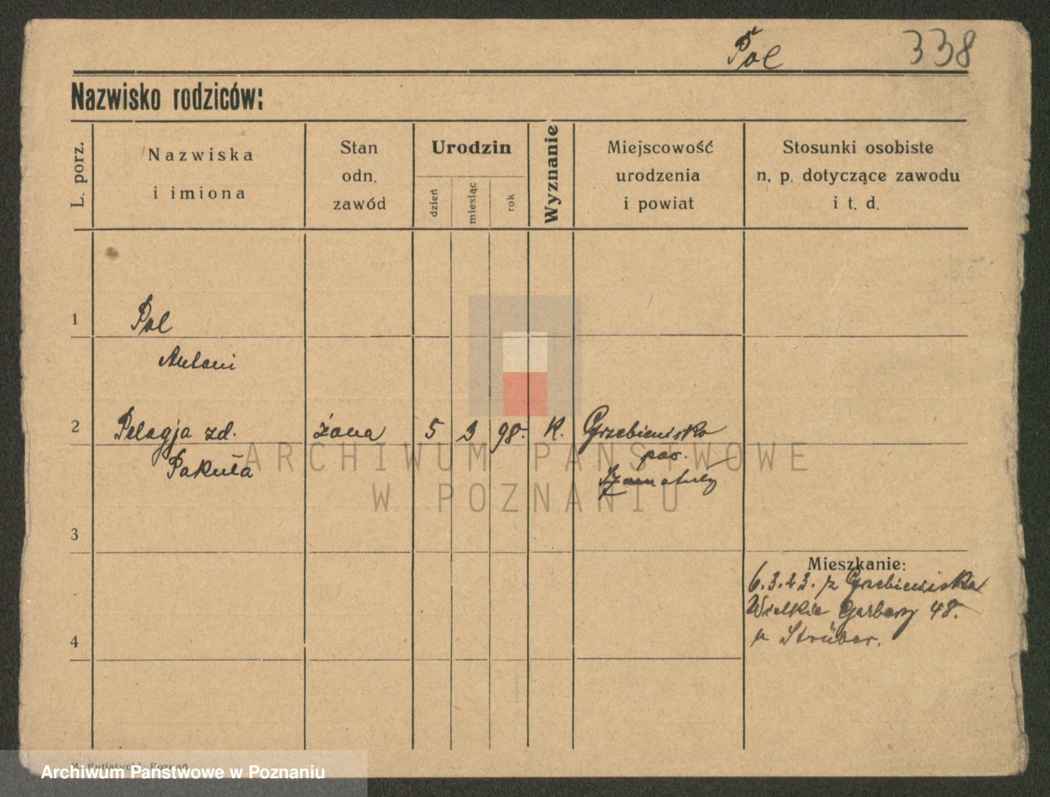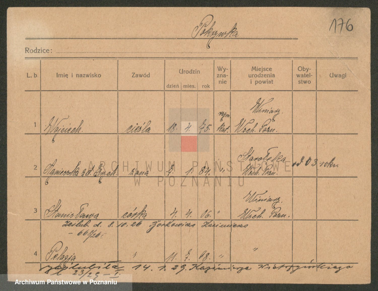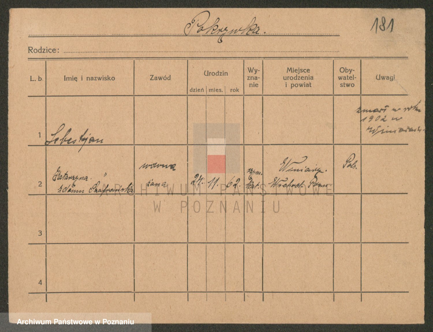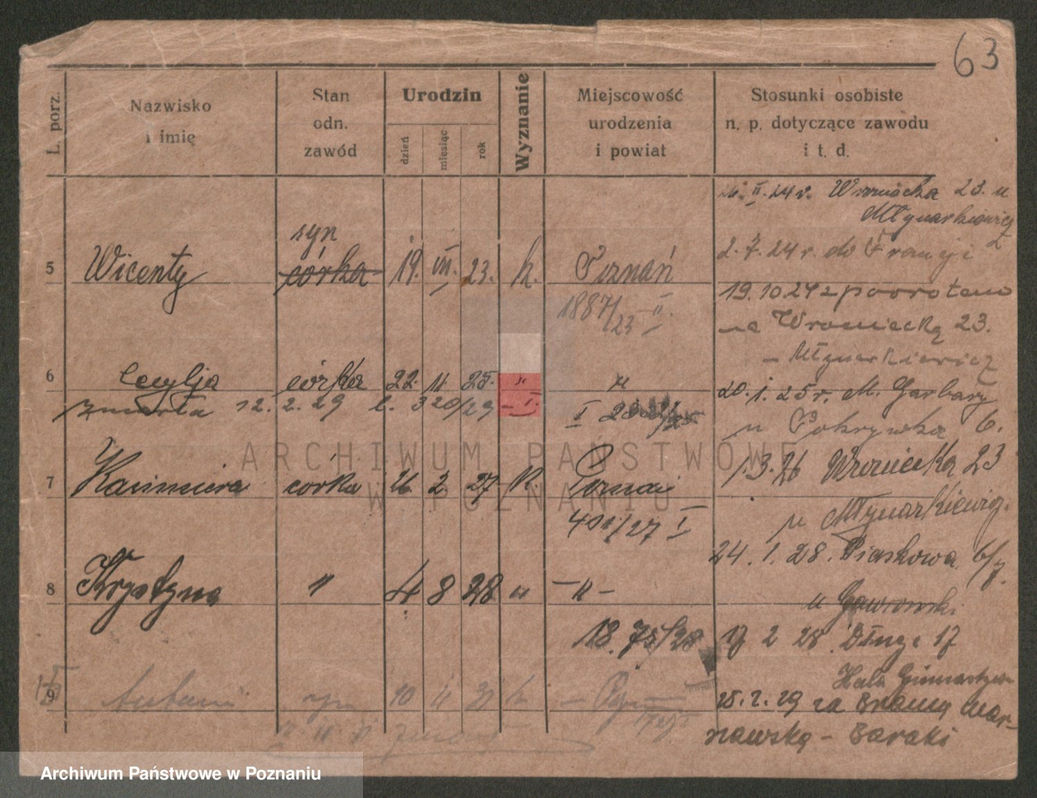 Podgląd karty osobowej dostępny jest po kliknięciu na nazwisko lub ikonkę karty. Można dokonywać powiększenia (ikony na górze) lub przechodzić między kolejnymi skanami (strzałki po bokach).