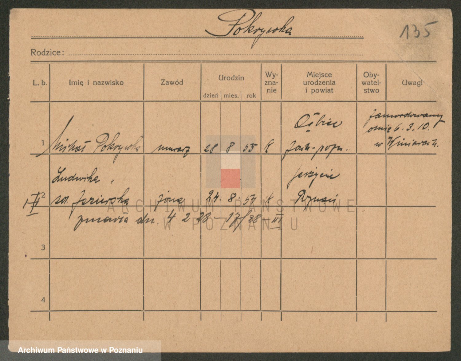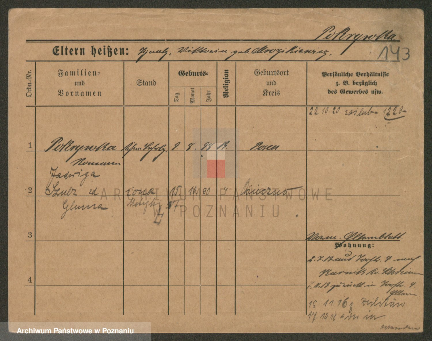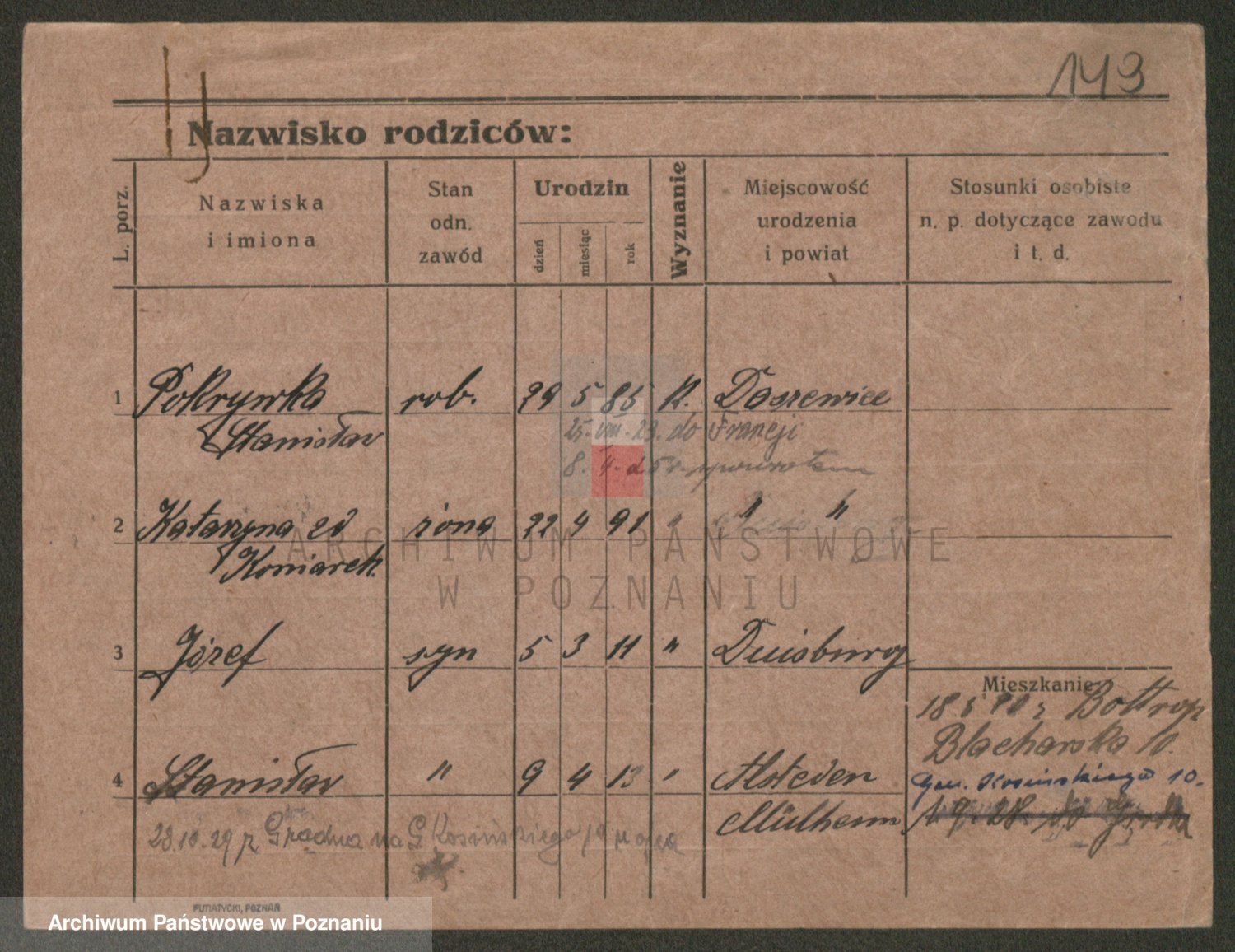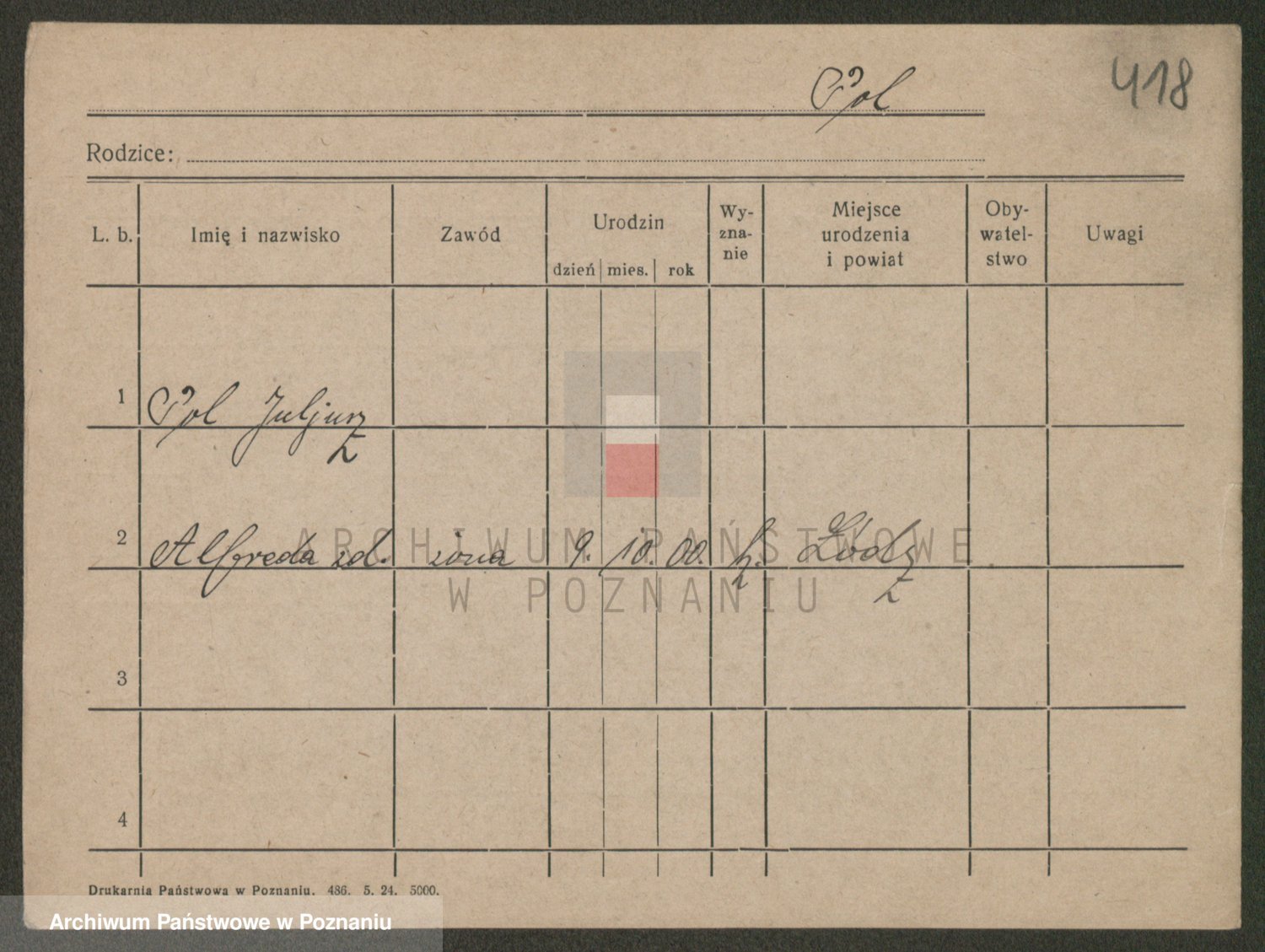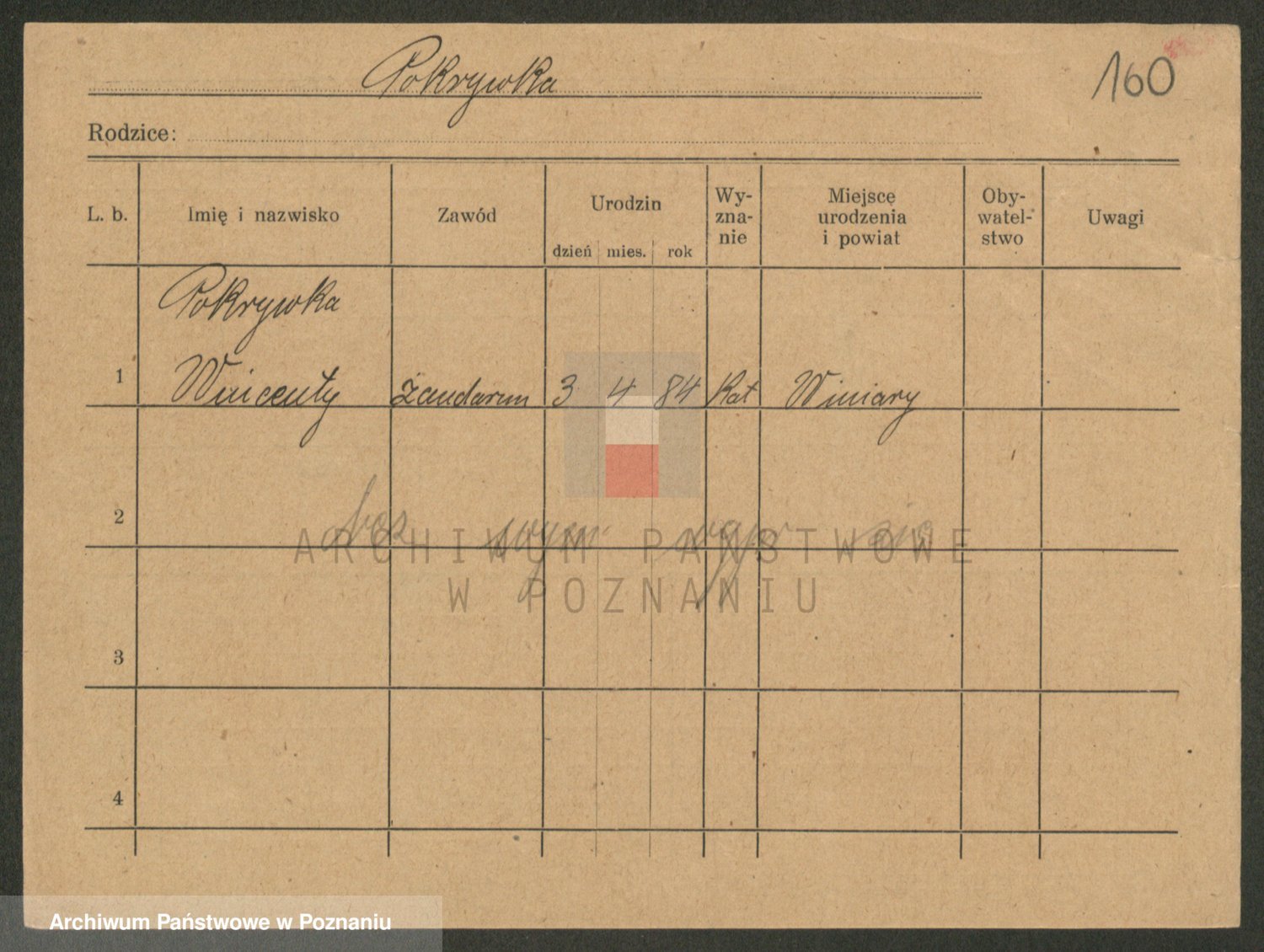 Podgląd karty osobowej dostępny jest po kliknięciu na nazwisko lub ikonkę karty. Można dokonywać powiększenia (ikony na górze) lub przechodzić między kolejnymi skanami (strzałki po bokach).