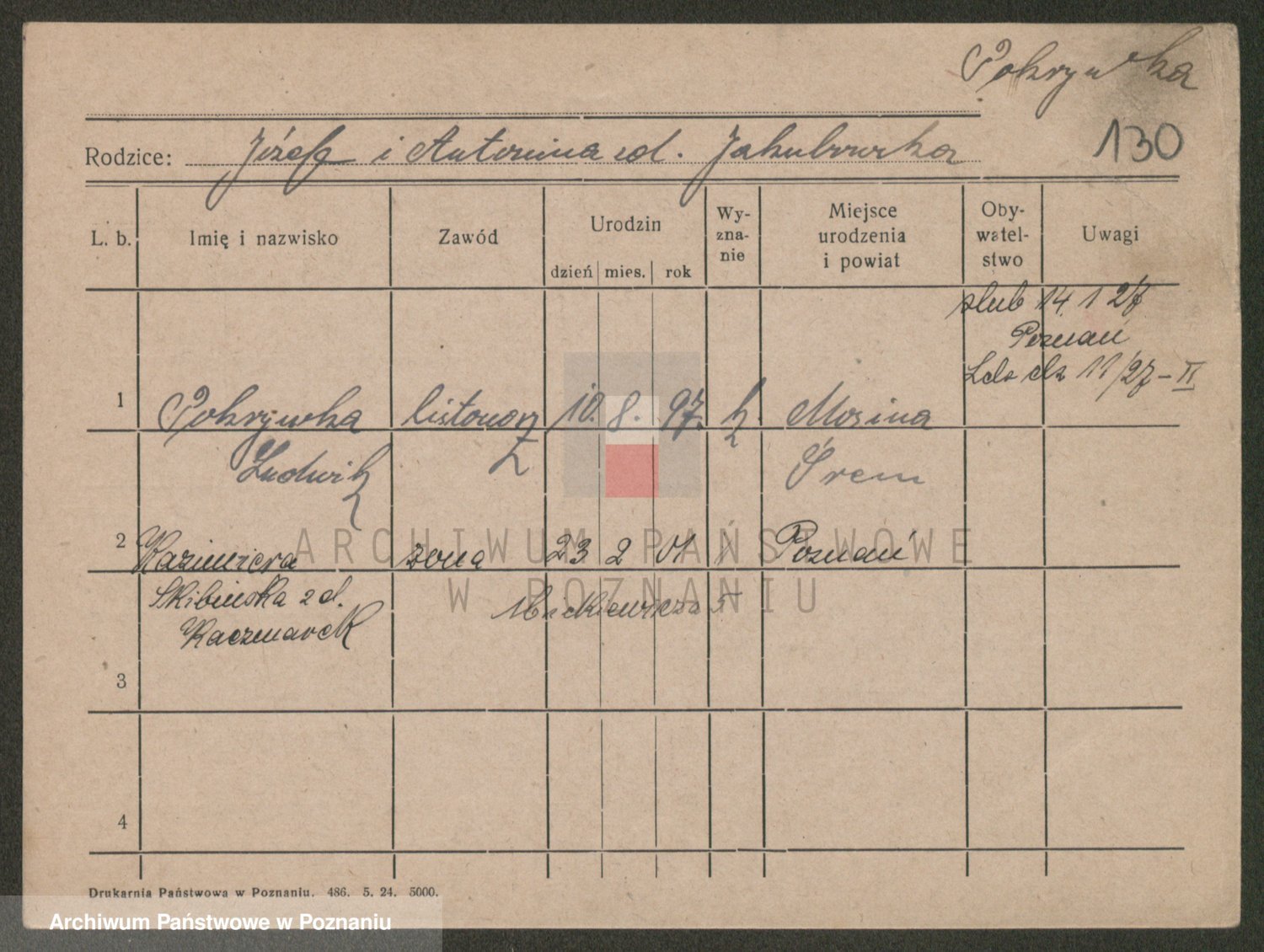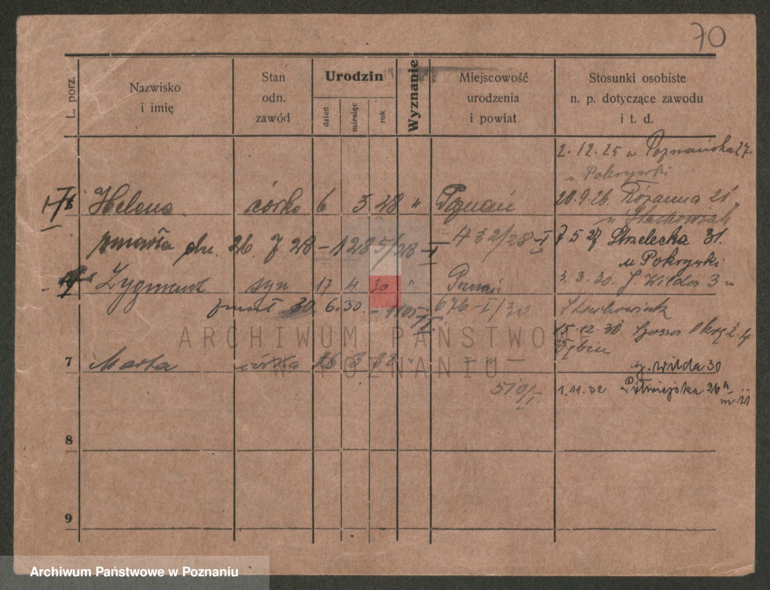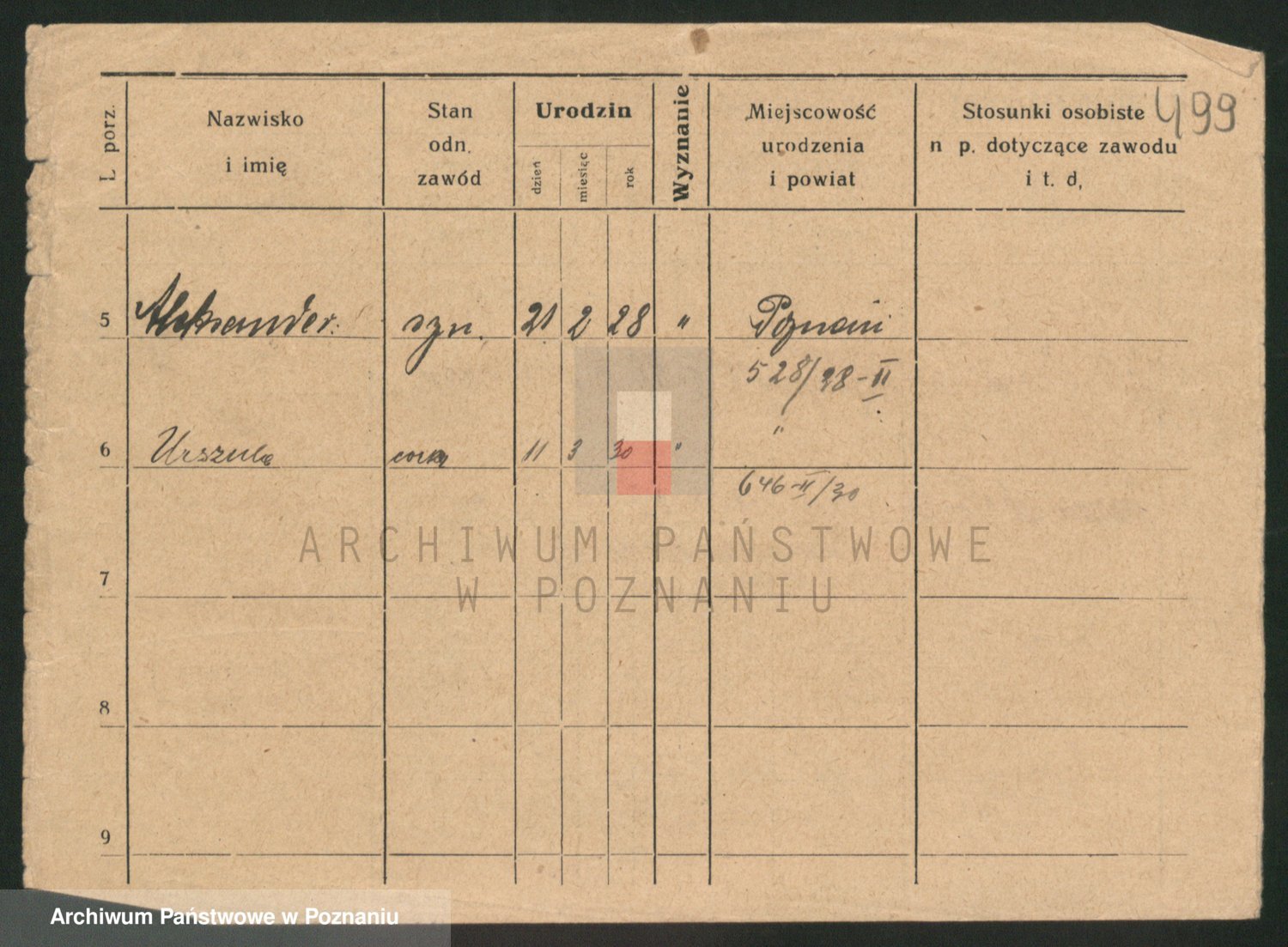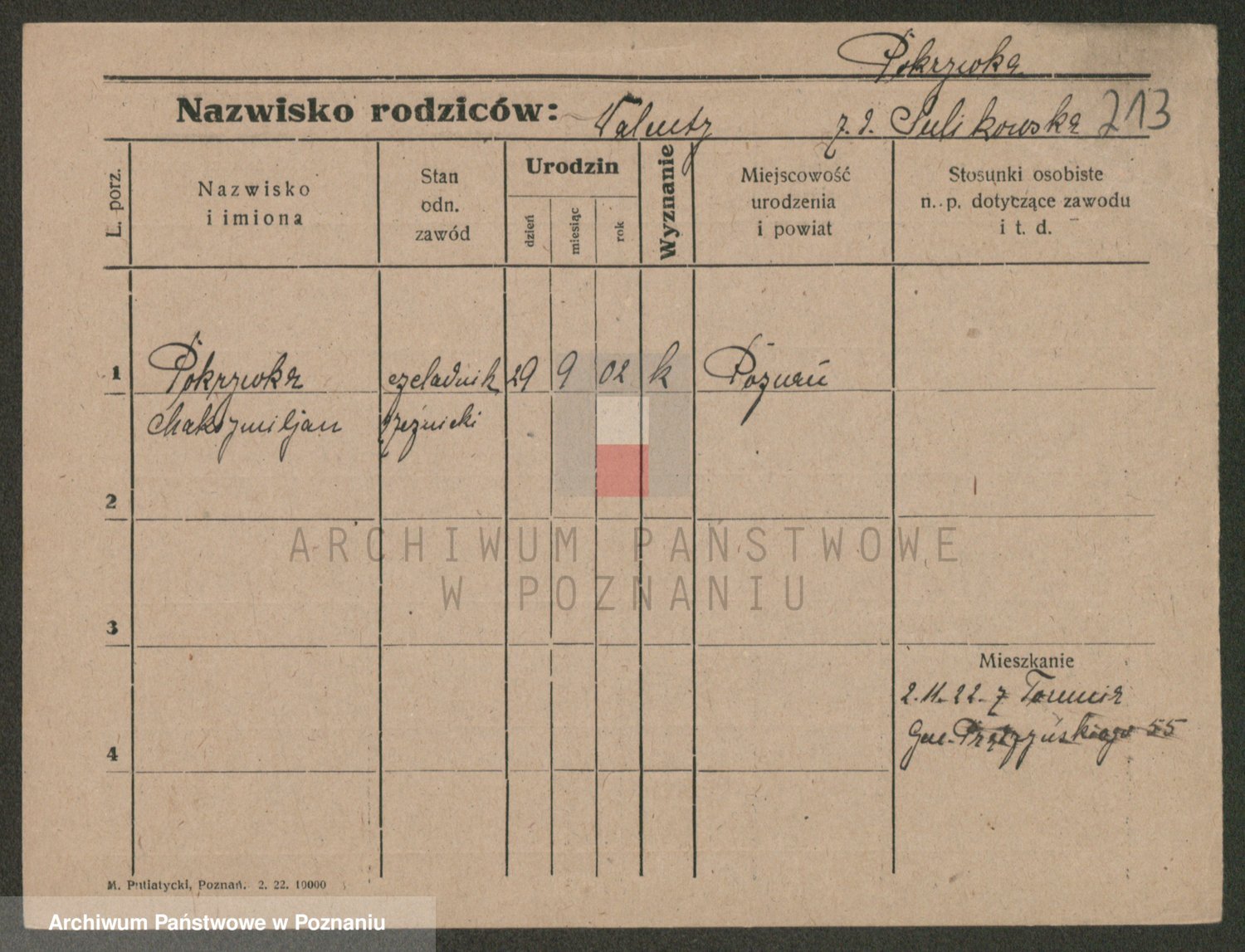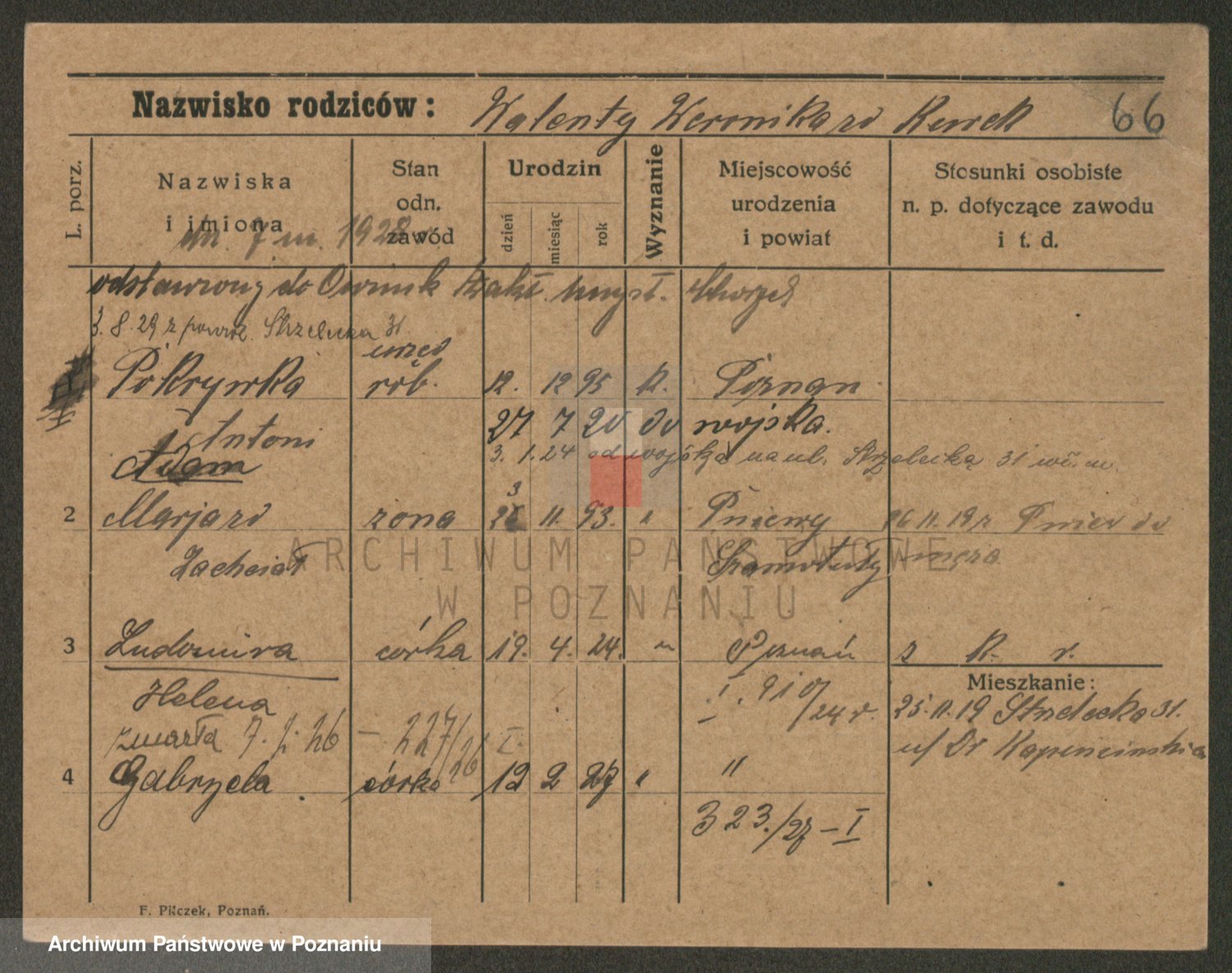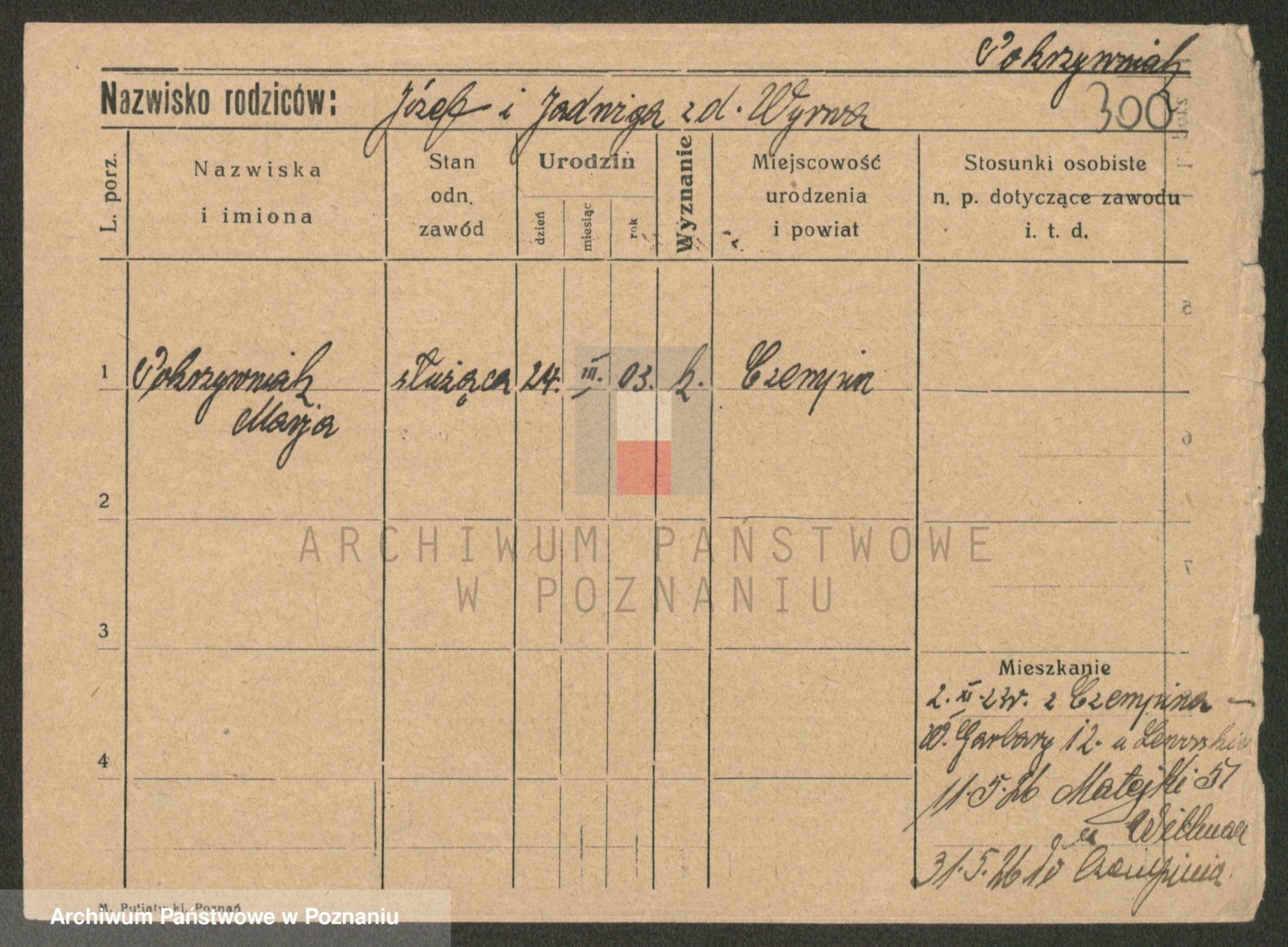 Podgląd karty osobowej dostępny jest po kliknięciu na nazwisko lub ikonkę karty. Można dokonywać powiększenia (ikony na górze) lub przechodzić między kolejnymi skanami (strzałki po bokach).