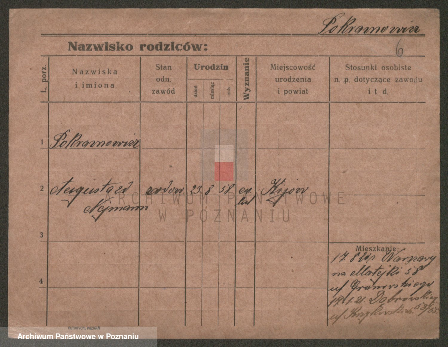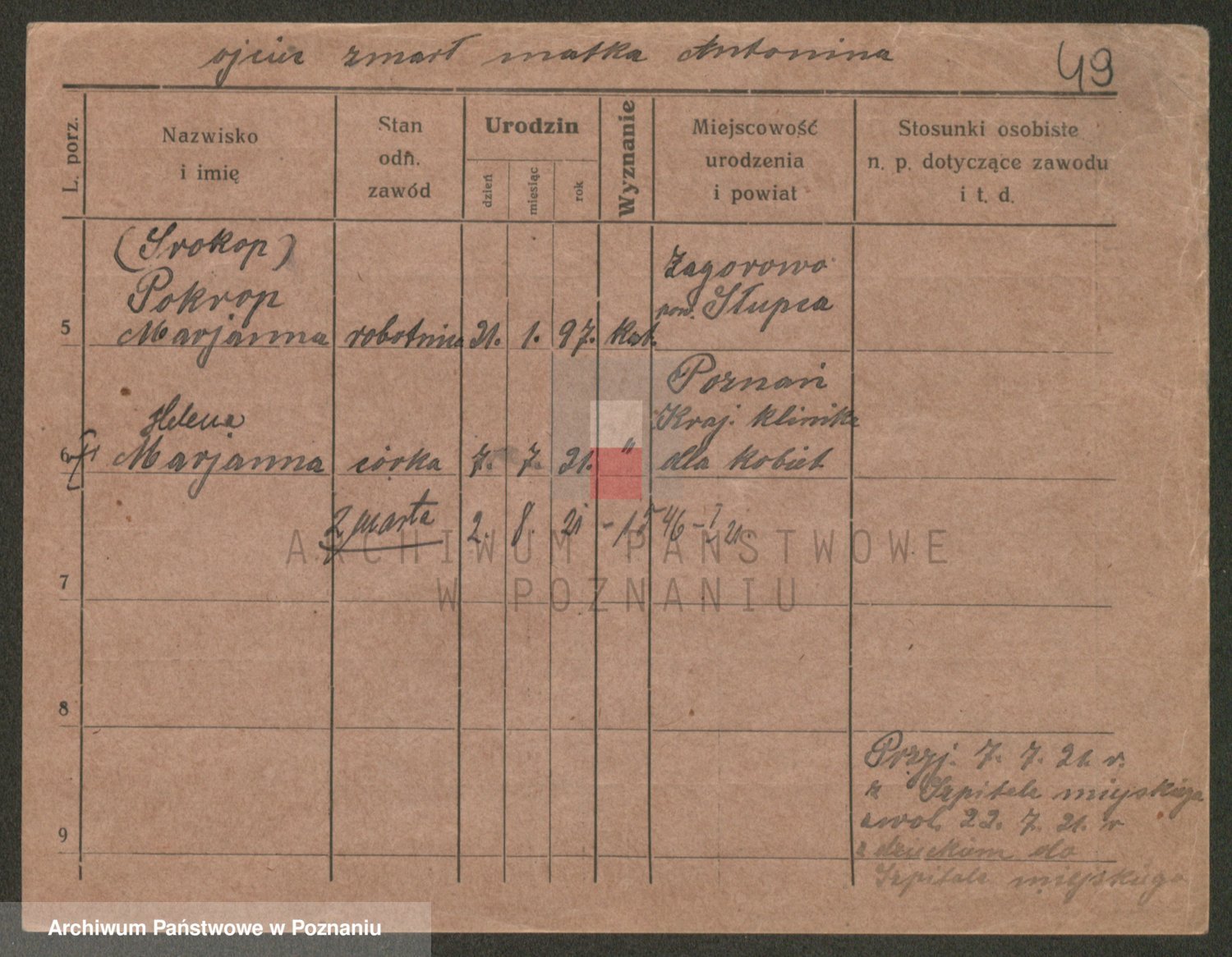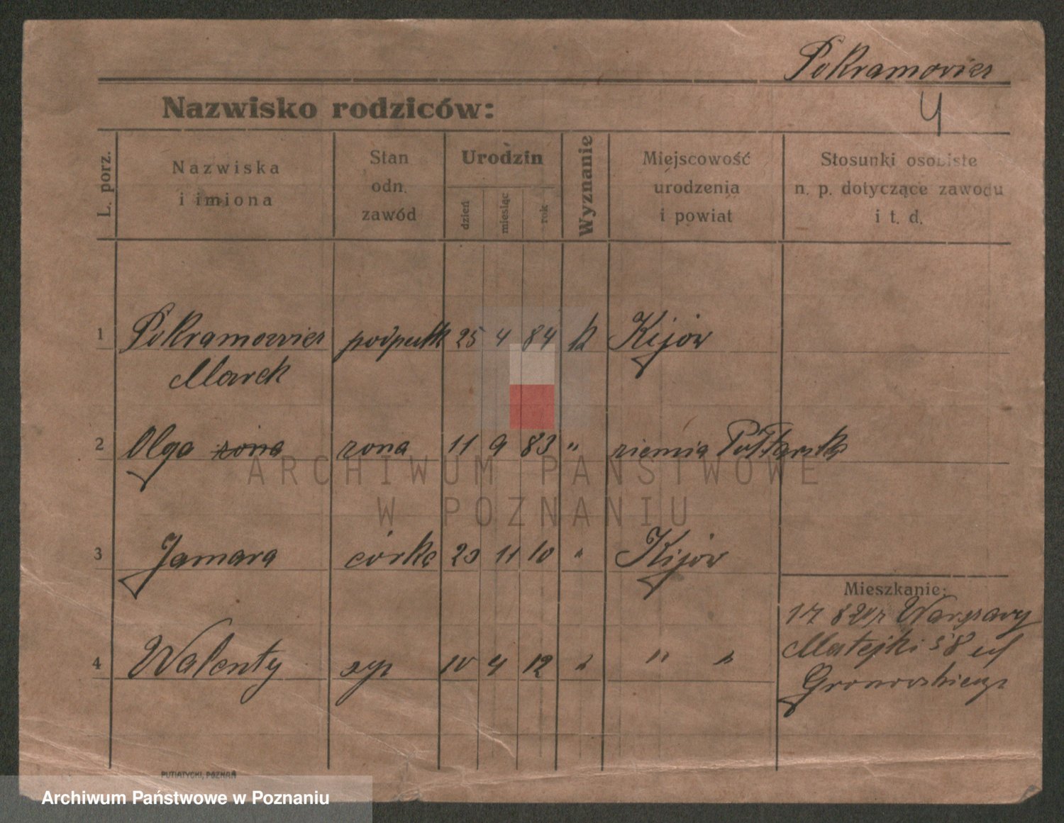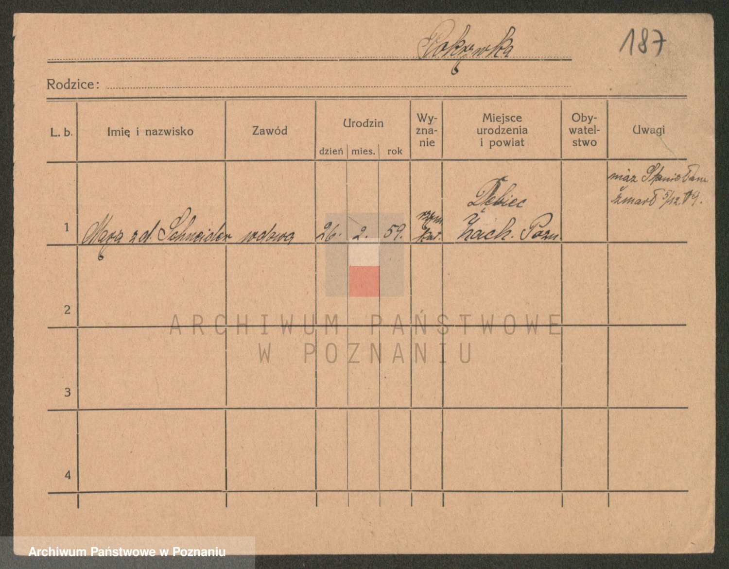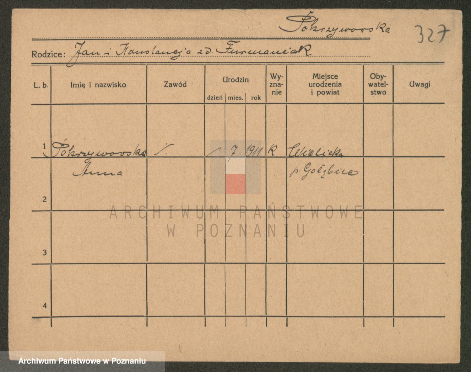 Podgląd karty osobowej dostępny jest po kliknięciu na nazwisko lub ikonkę karty. Można dokonywać powiększenia (ikony na górze) lub przechodzić między kolejnymi skanami (strzałki po bokach).