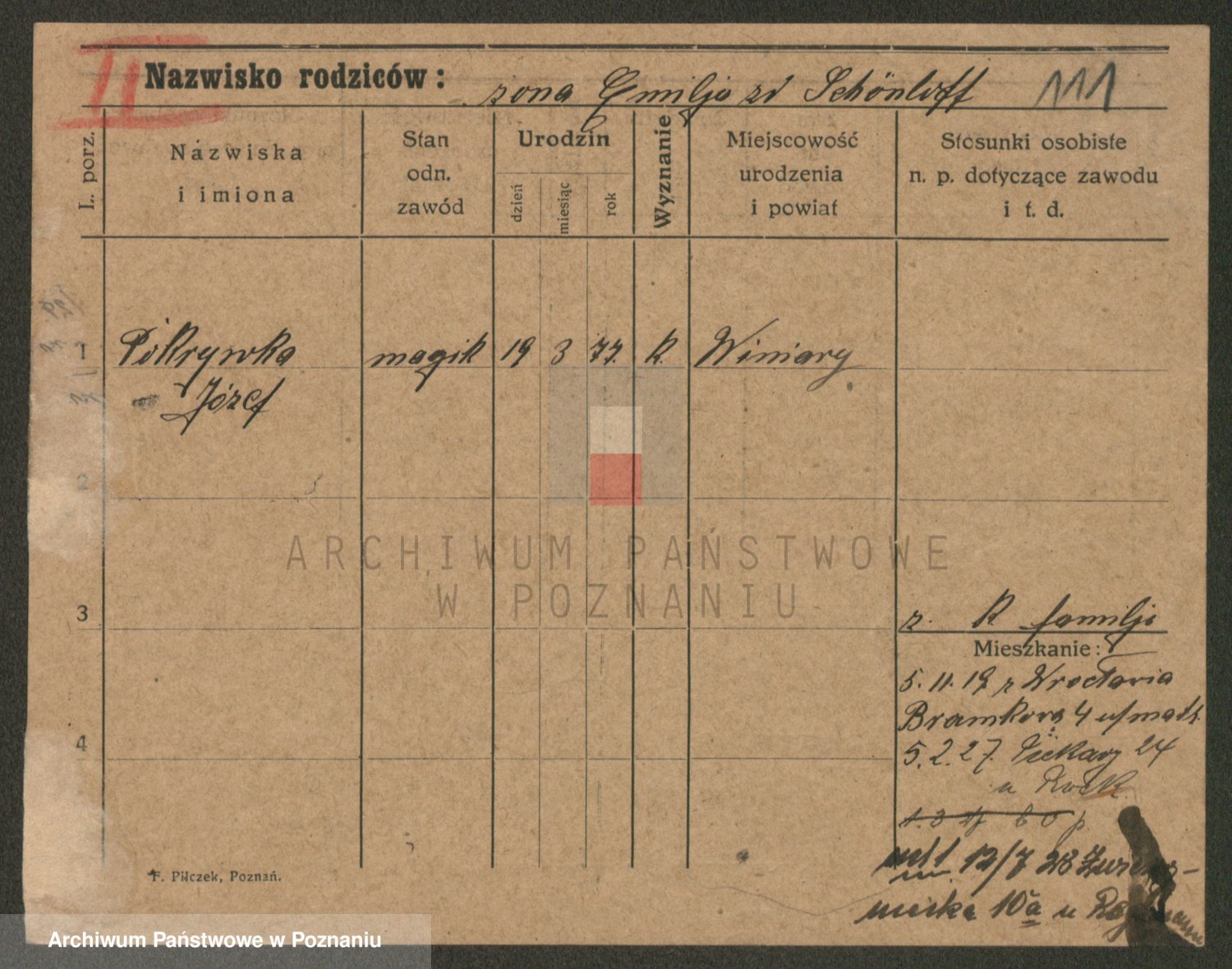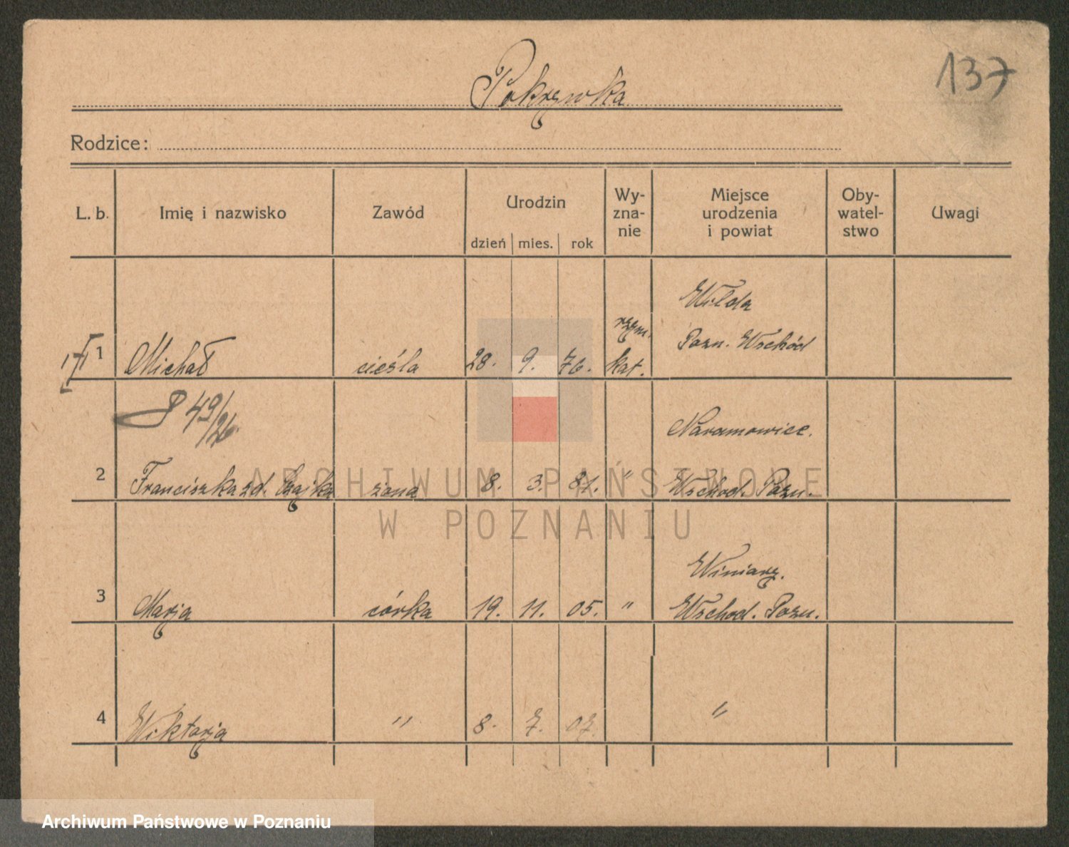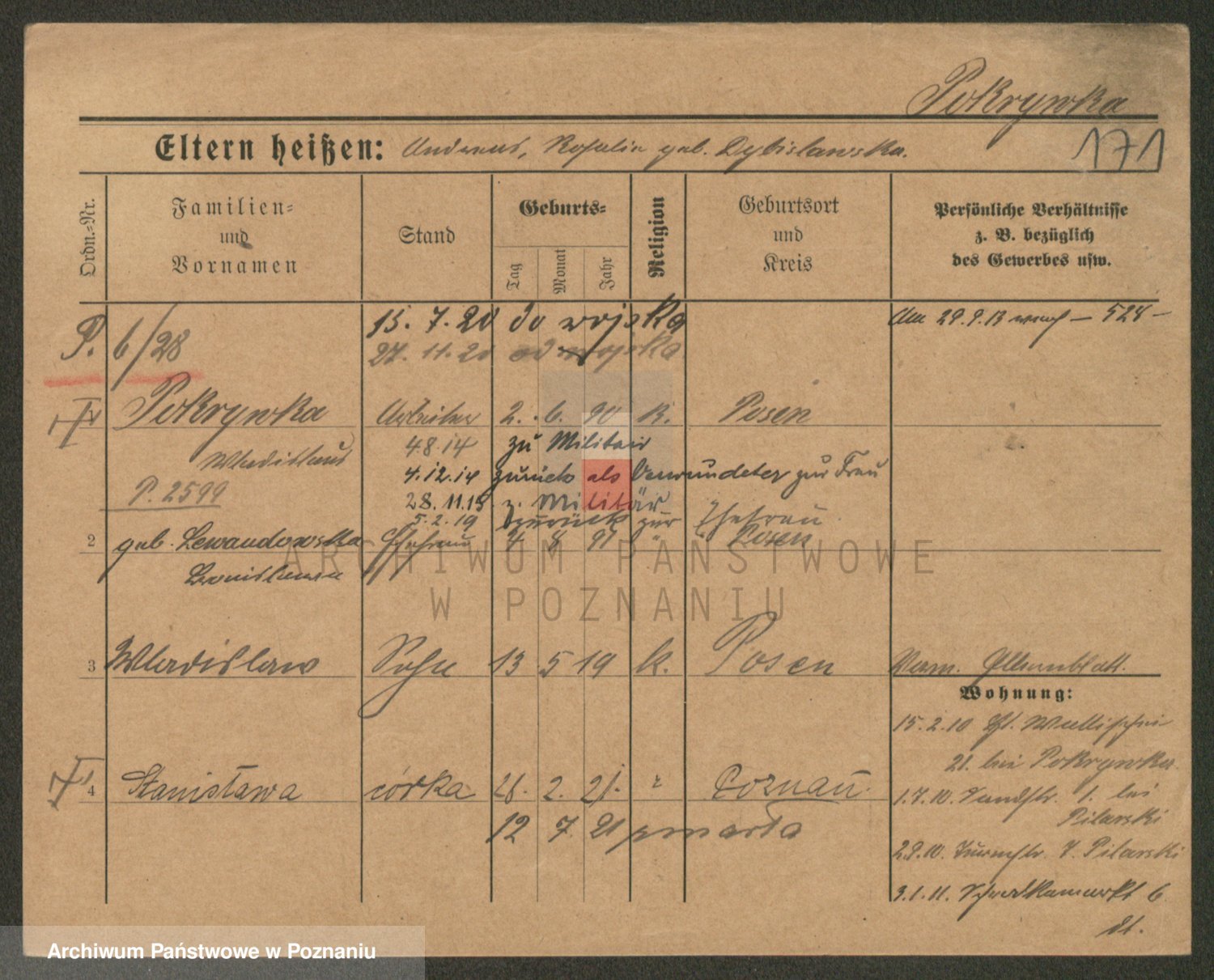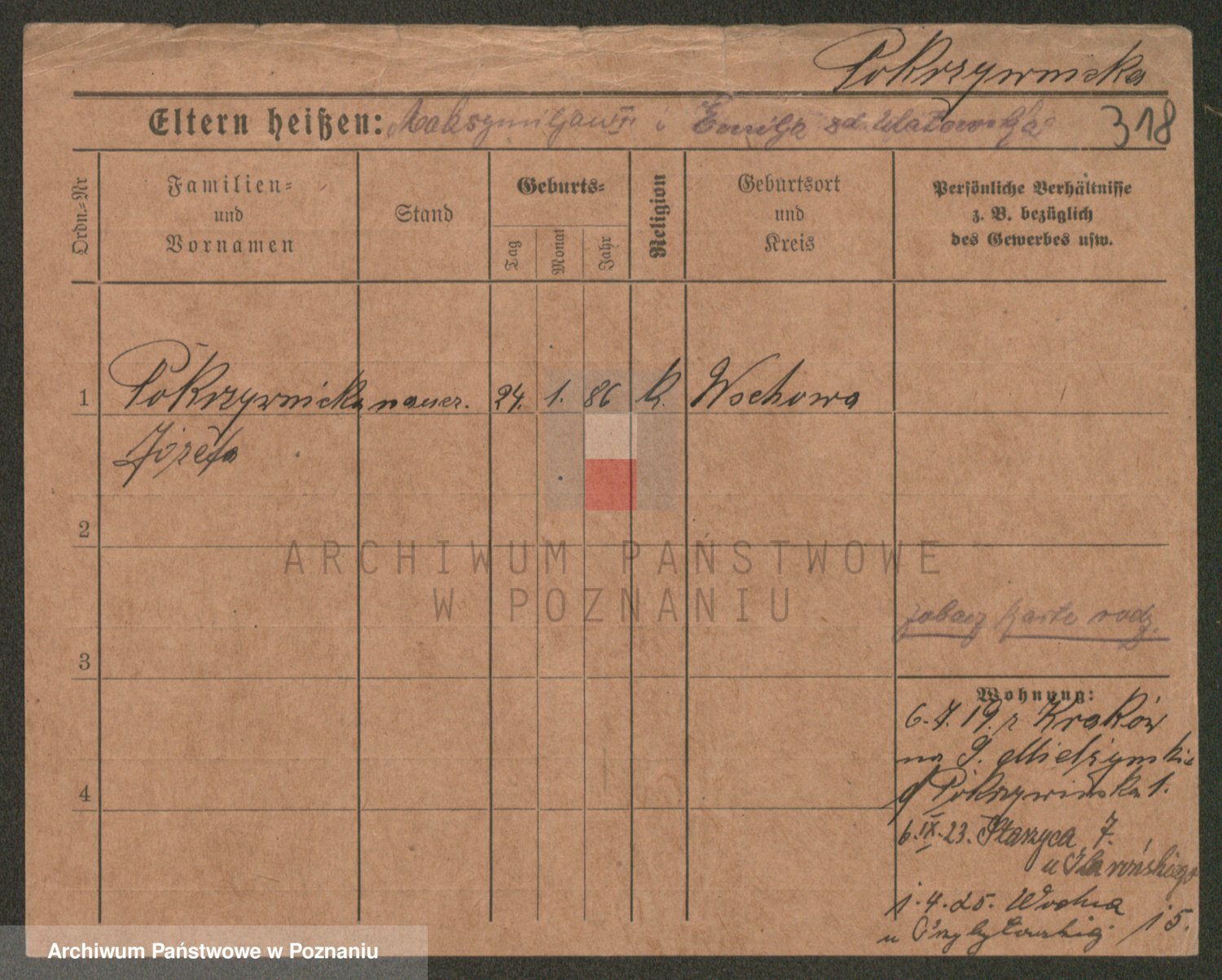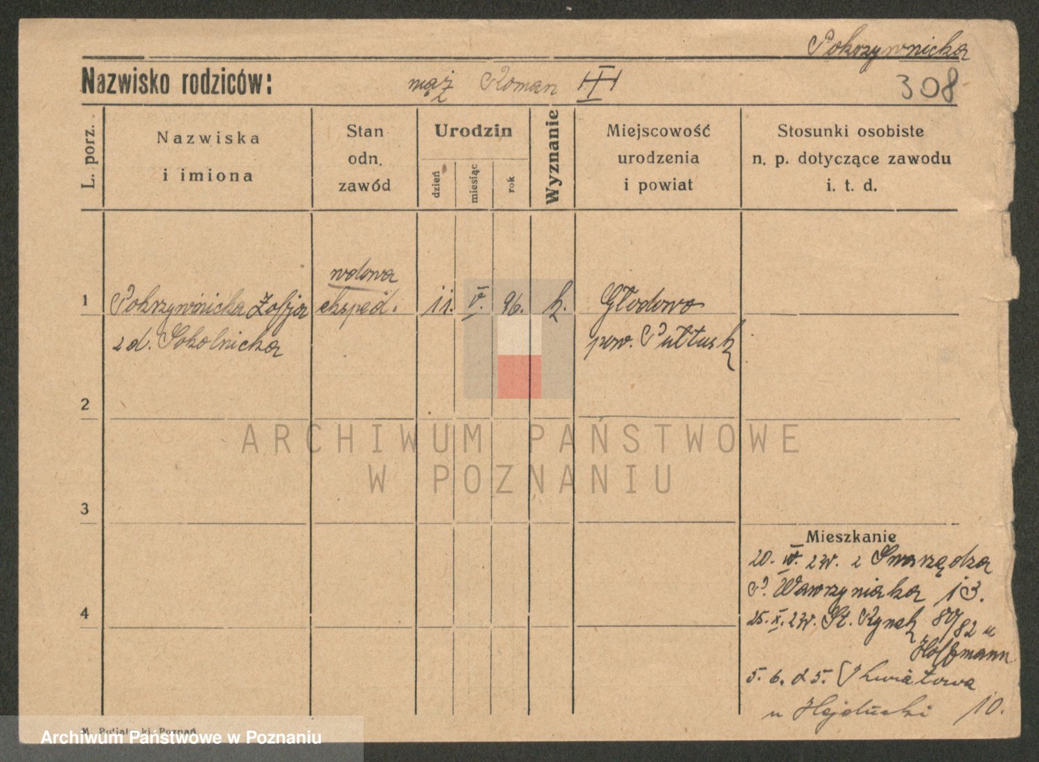 Podgląd karty osobowej dostępny jest po kliknięciu na nazwisko lub ikonkę karty. Można dokonywać powiększenia (ikony na górze) lub przechodzić między kolejnymi skanami (strzałki po bokach).