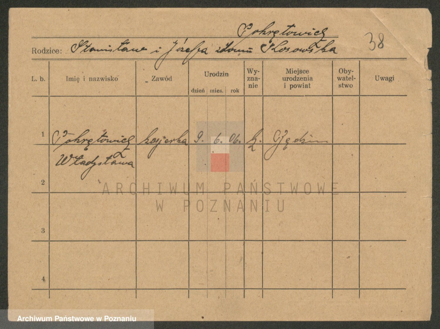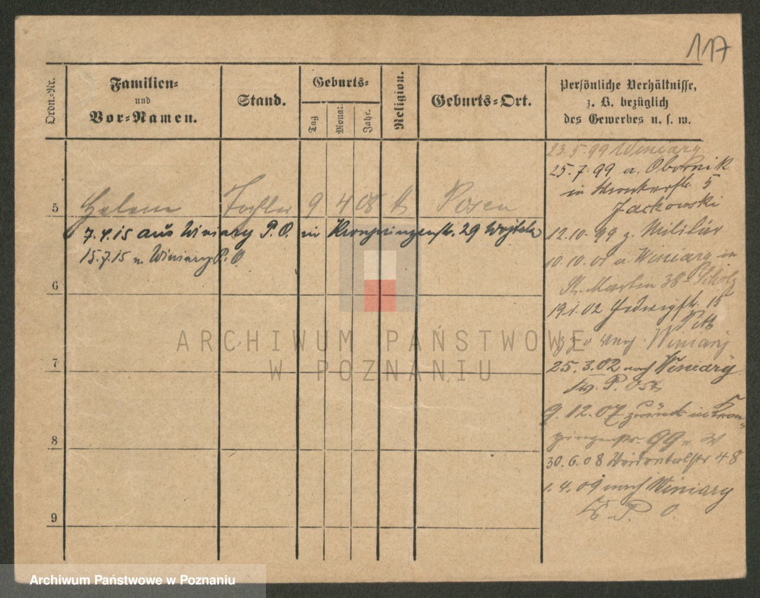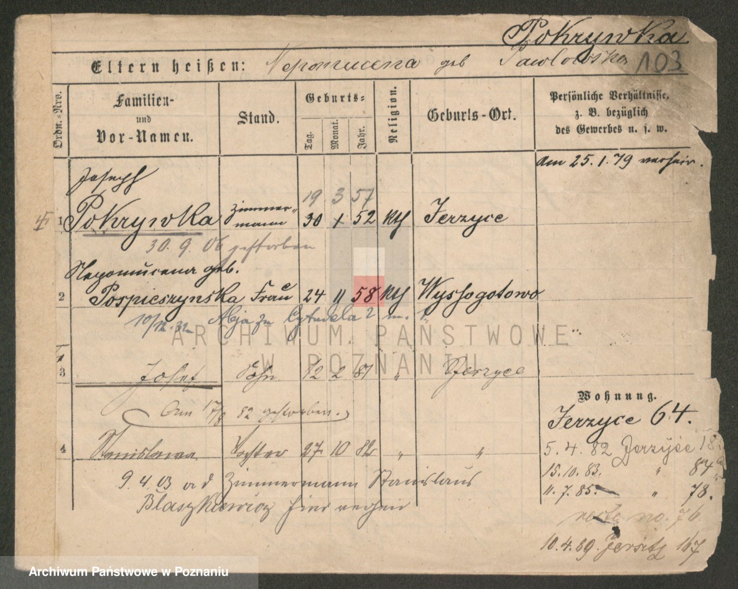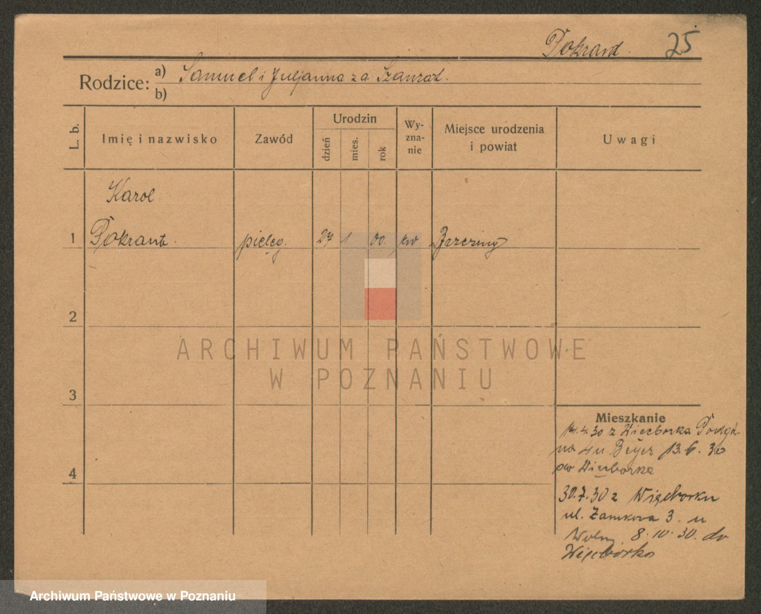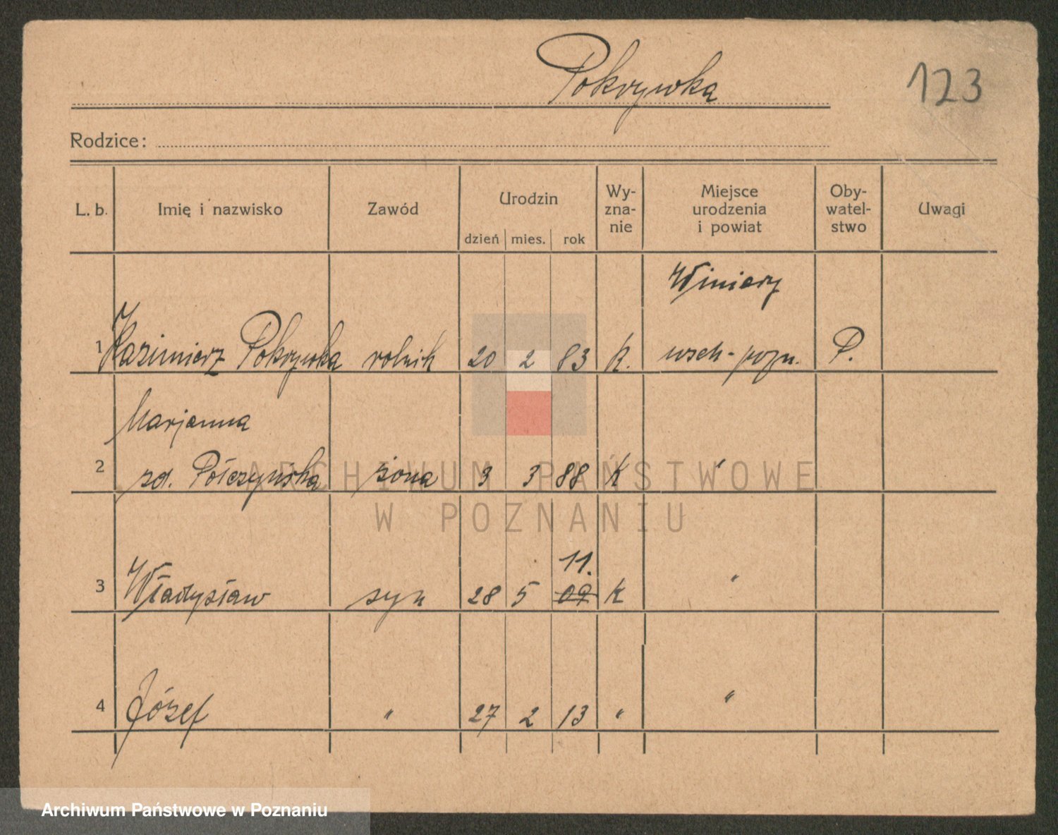 Podgląd karty osobowej dostępny jest po kliknięciu na nazwisko lub ikonkę karty. Można dokonywać powiększenia (ikony na górze) lub przechodzić między kolejnymi skanami (strzałki po bokach).