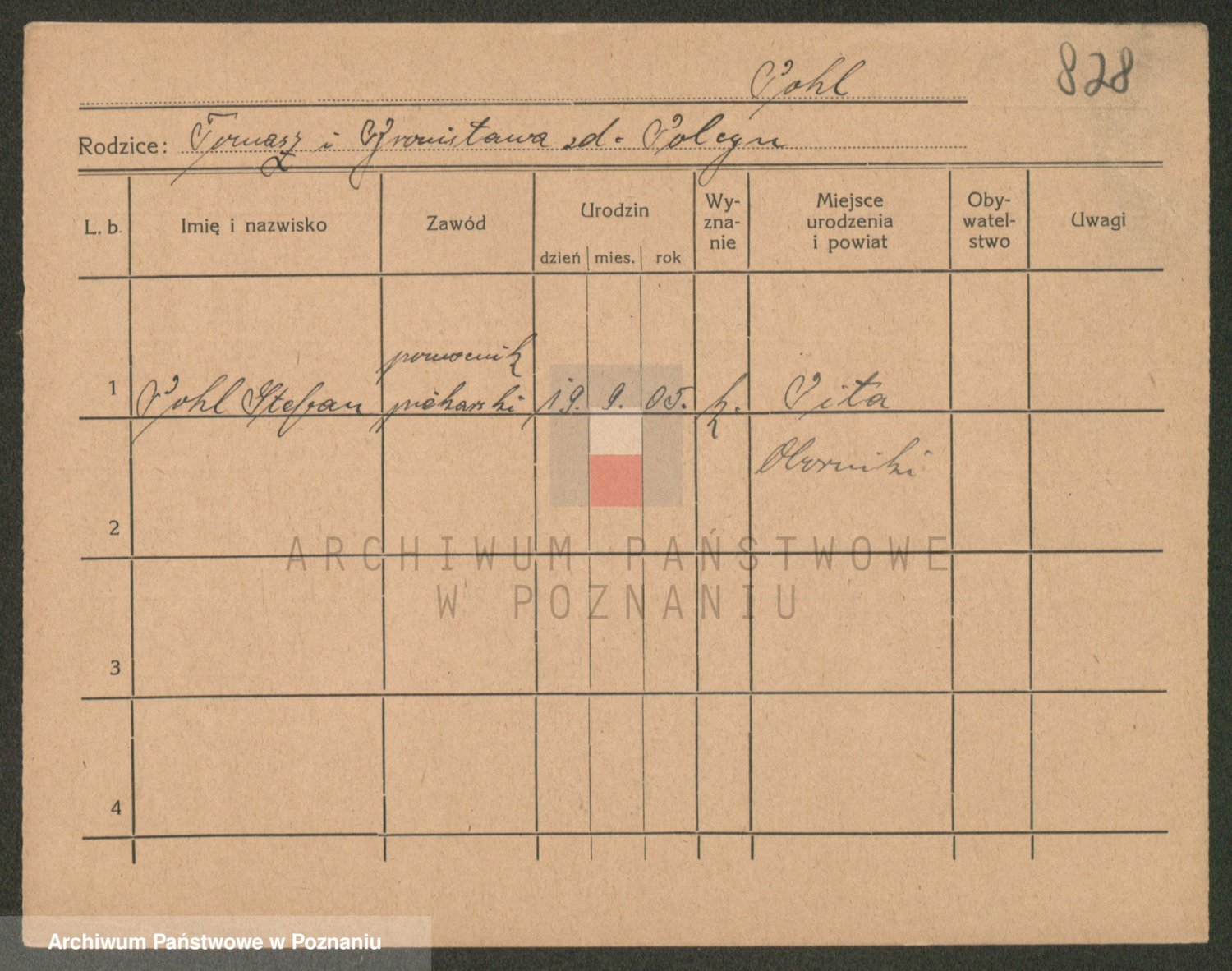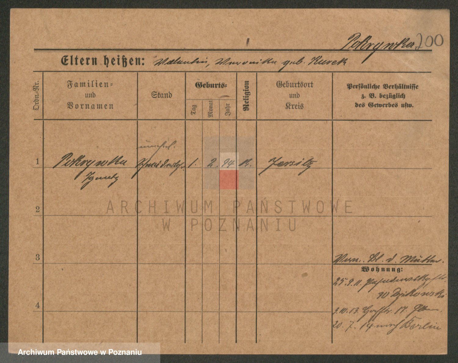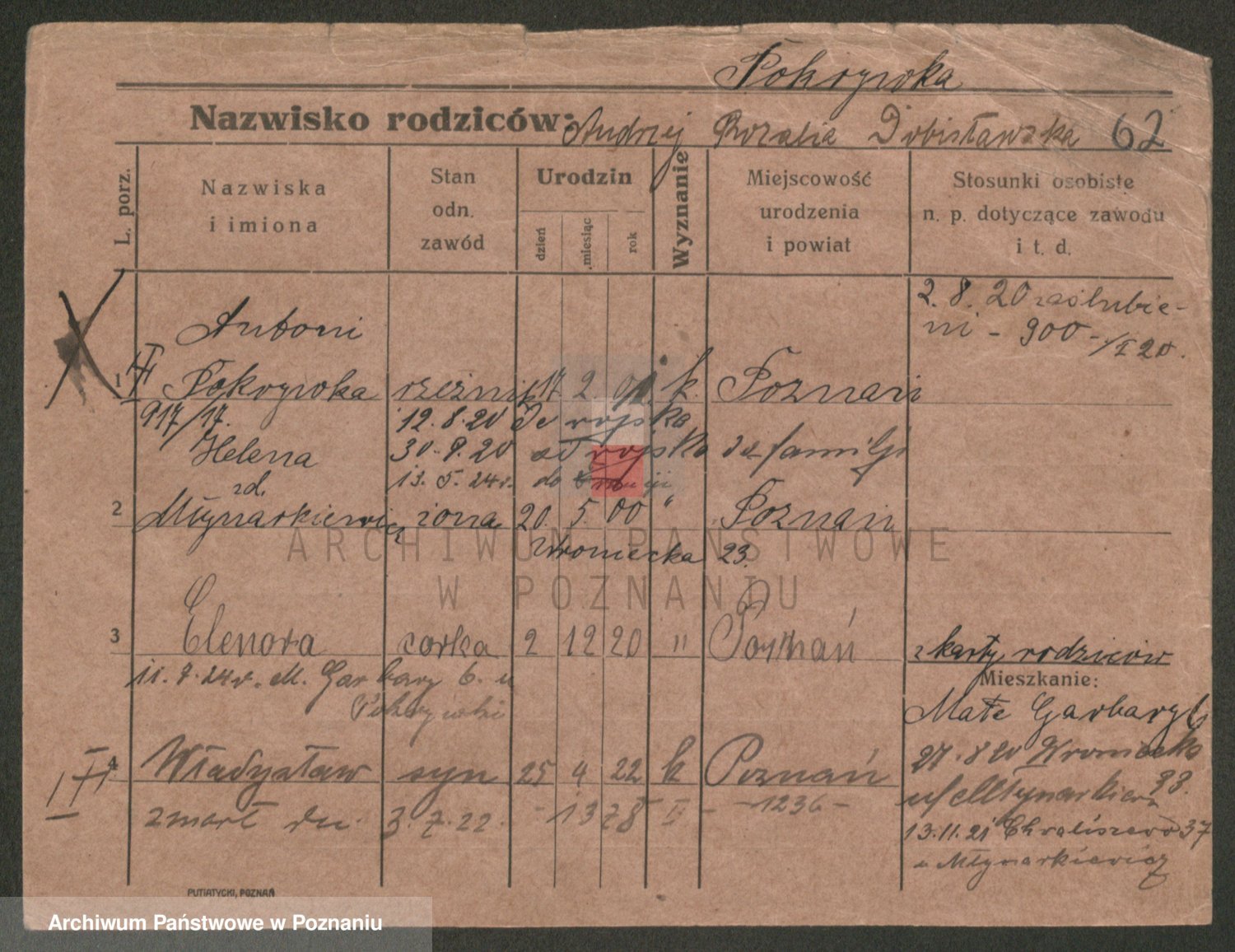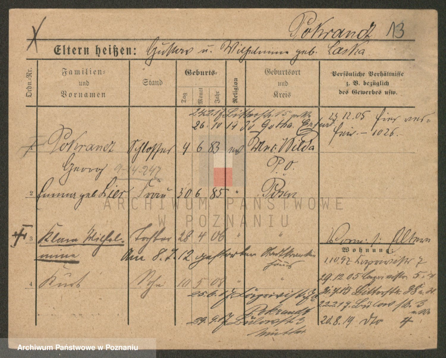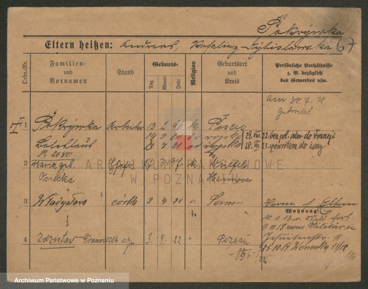 Podgląd karty osobowej dostępny jest po kliknięciu na nazwisko lub ikonkę karty. Można dokonywać powiększenia (ikony na górze) lub przechodzić między kolejnymi skanami (strzałki po bokach).