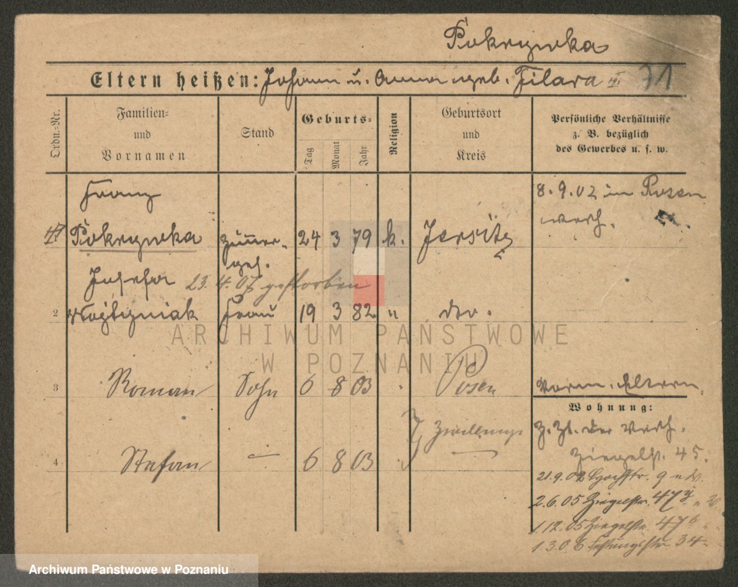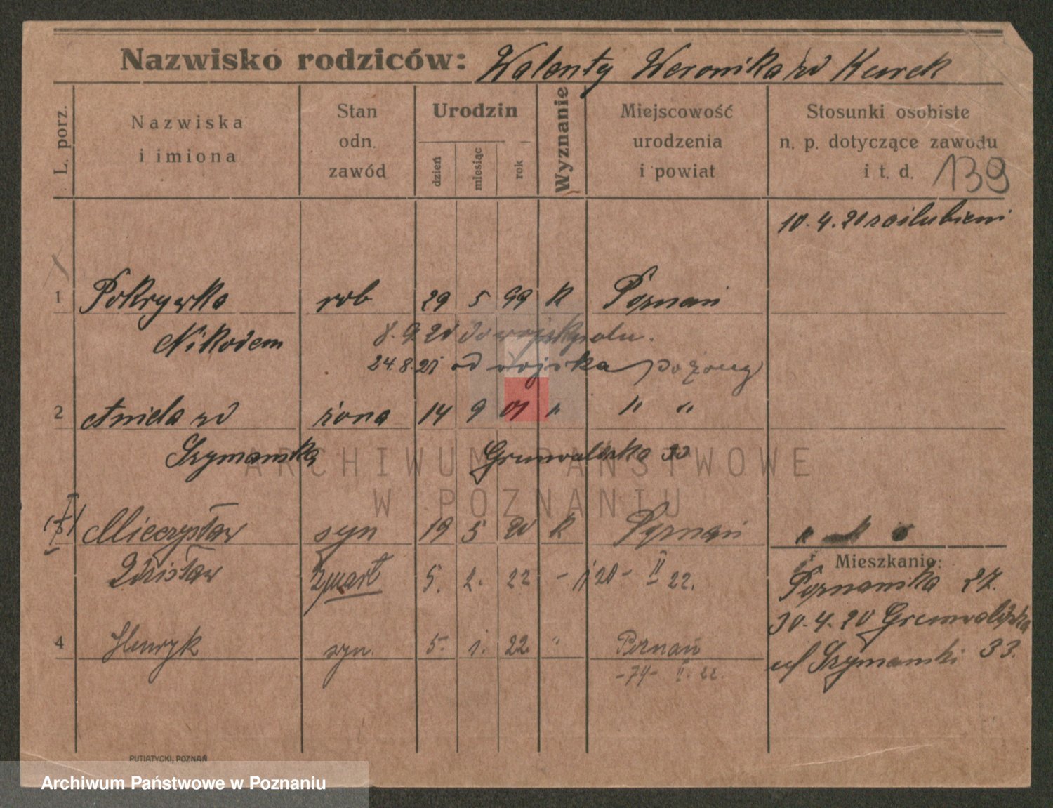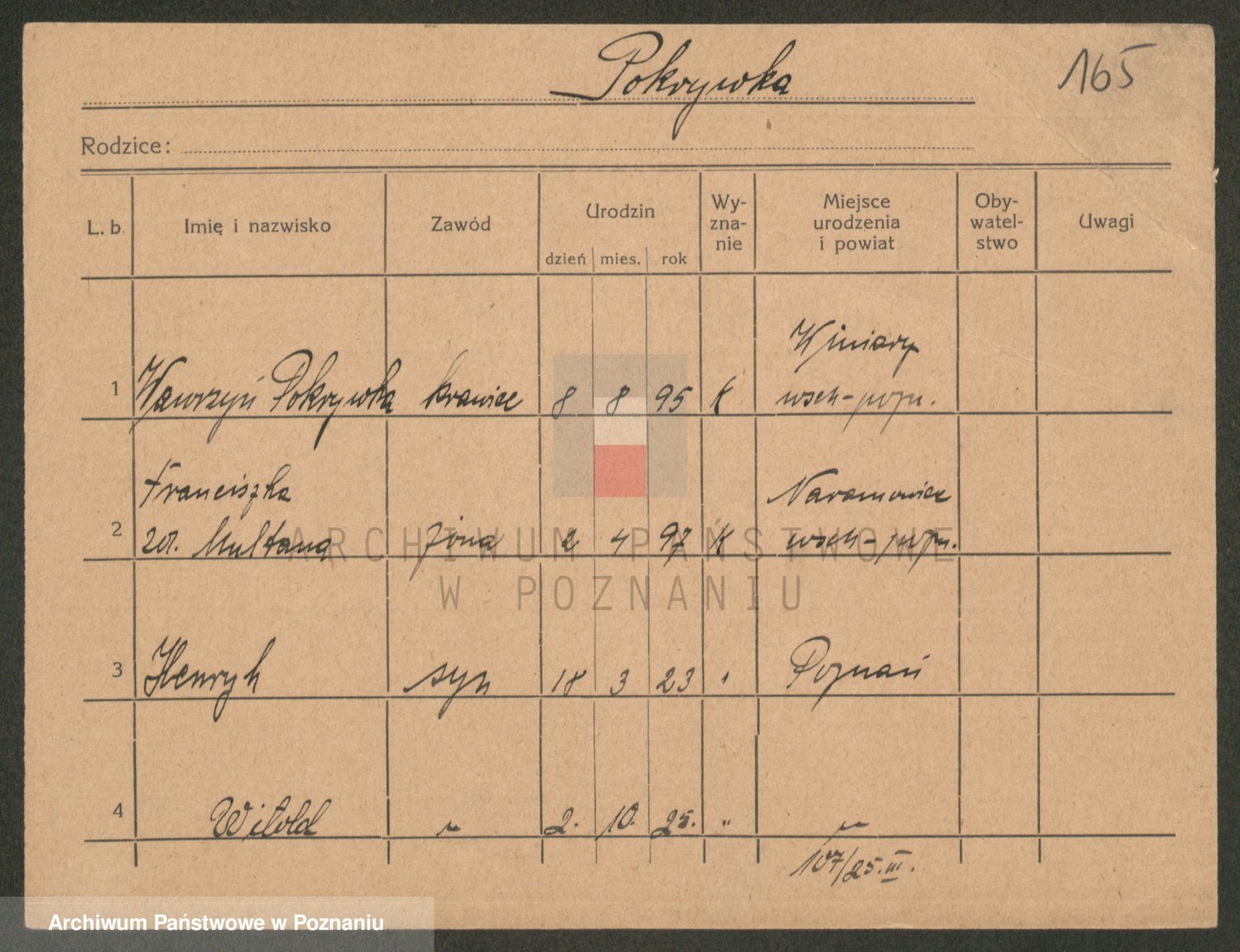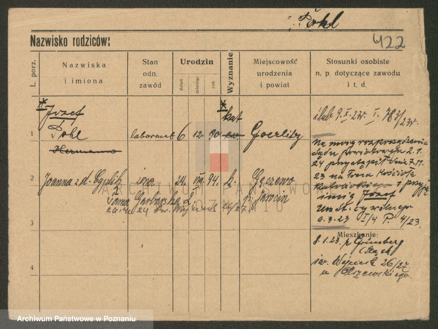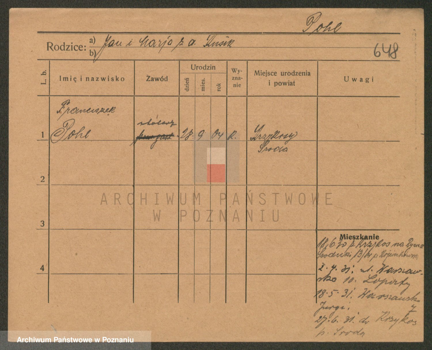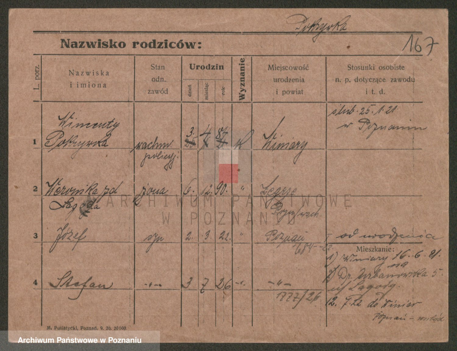 Podgląd karty osobowej dostępny jest po kliknięciu na nazwisko lub ikonkę karty. Można dokonywać powiększenia (ikony na górze) lub przechodzić między kolejnymi skanami (strzałki po bokach).