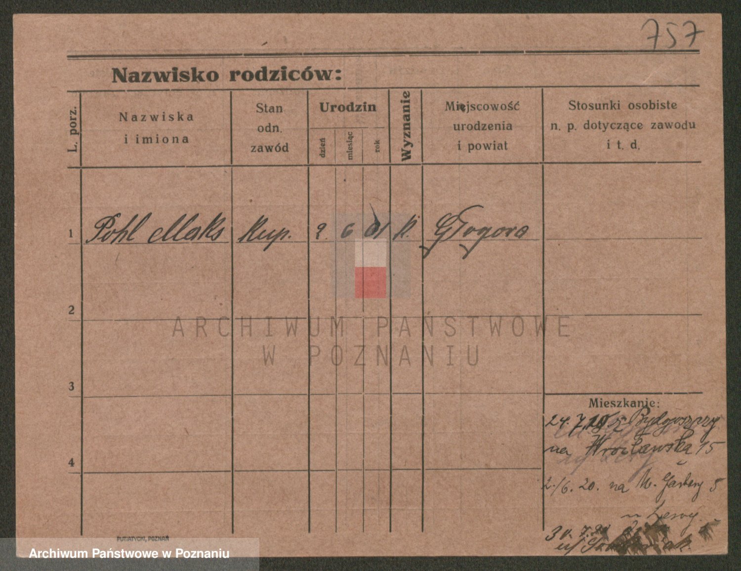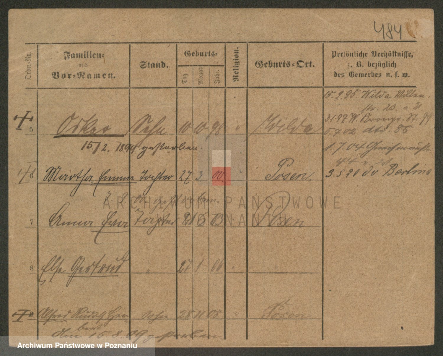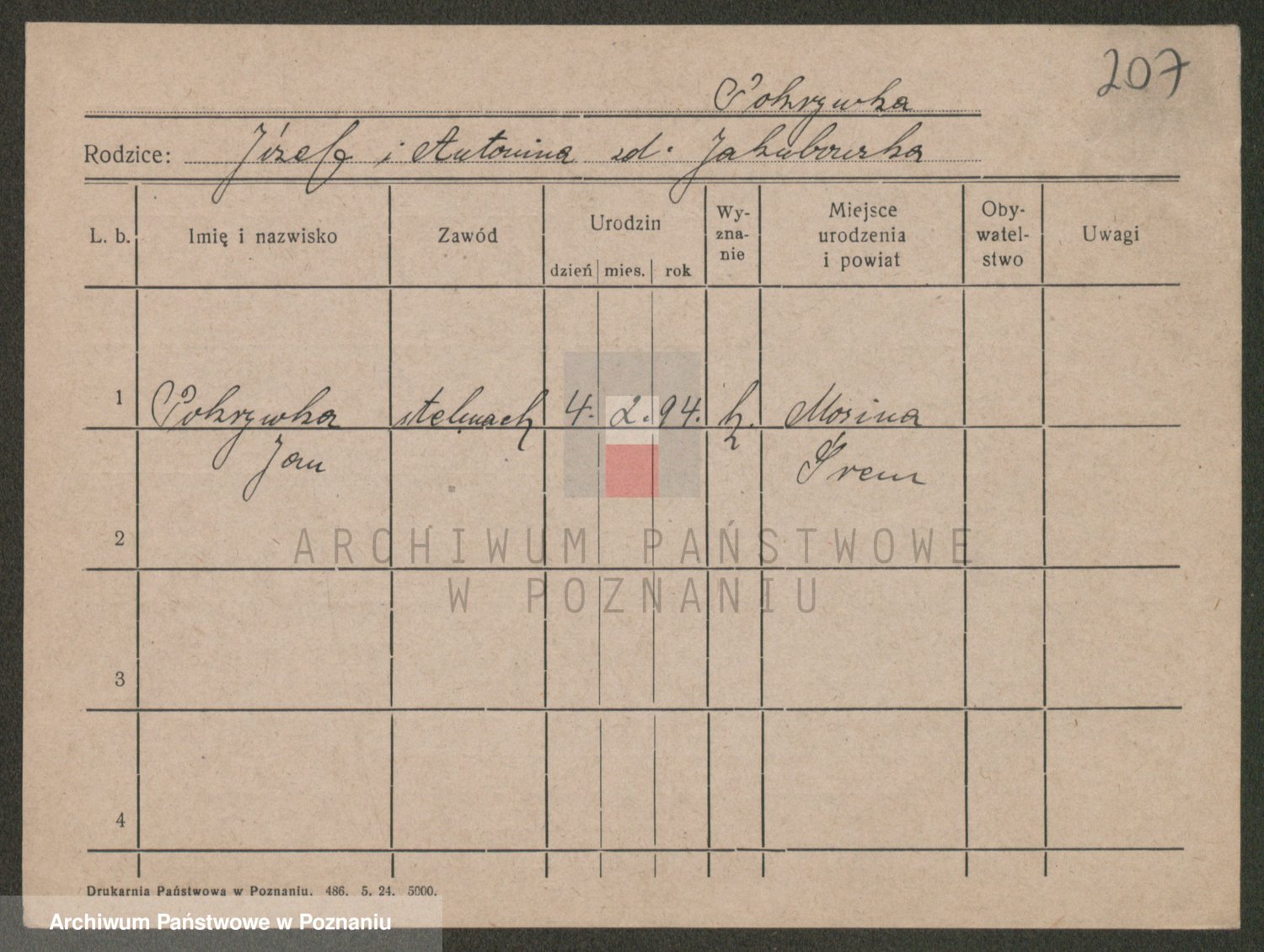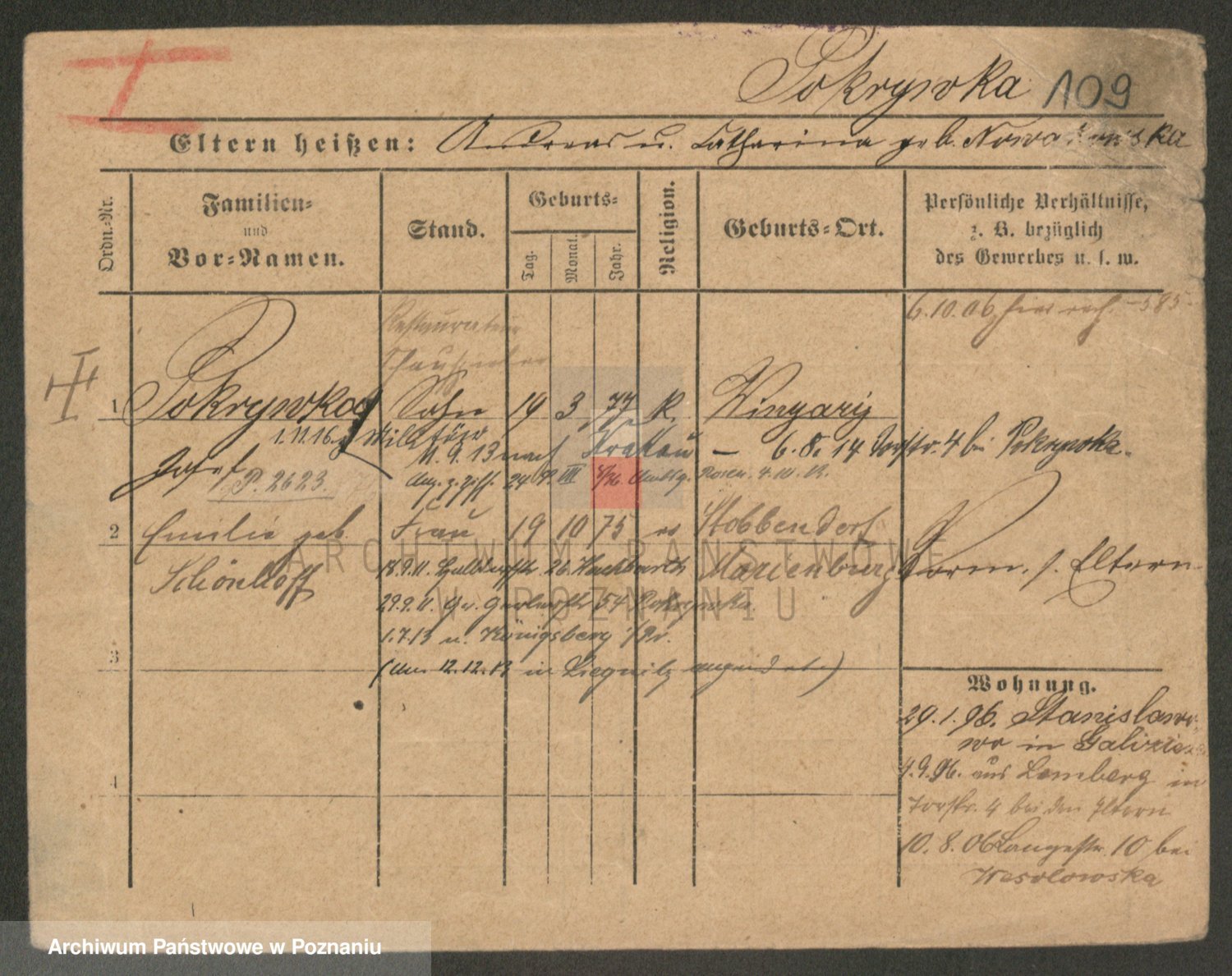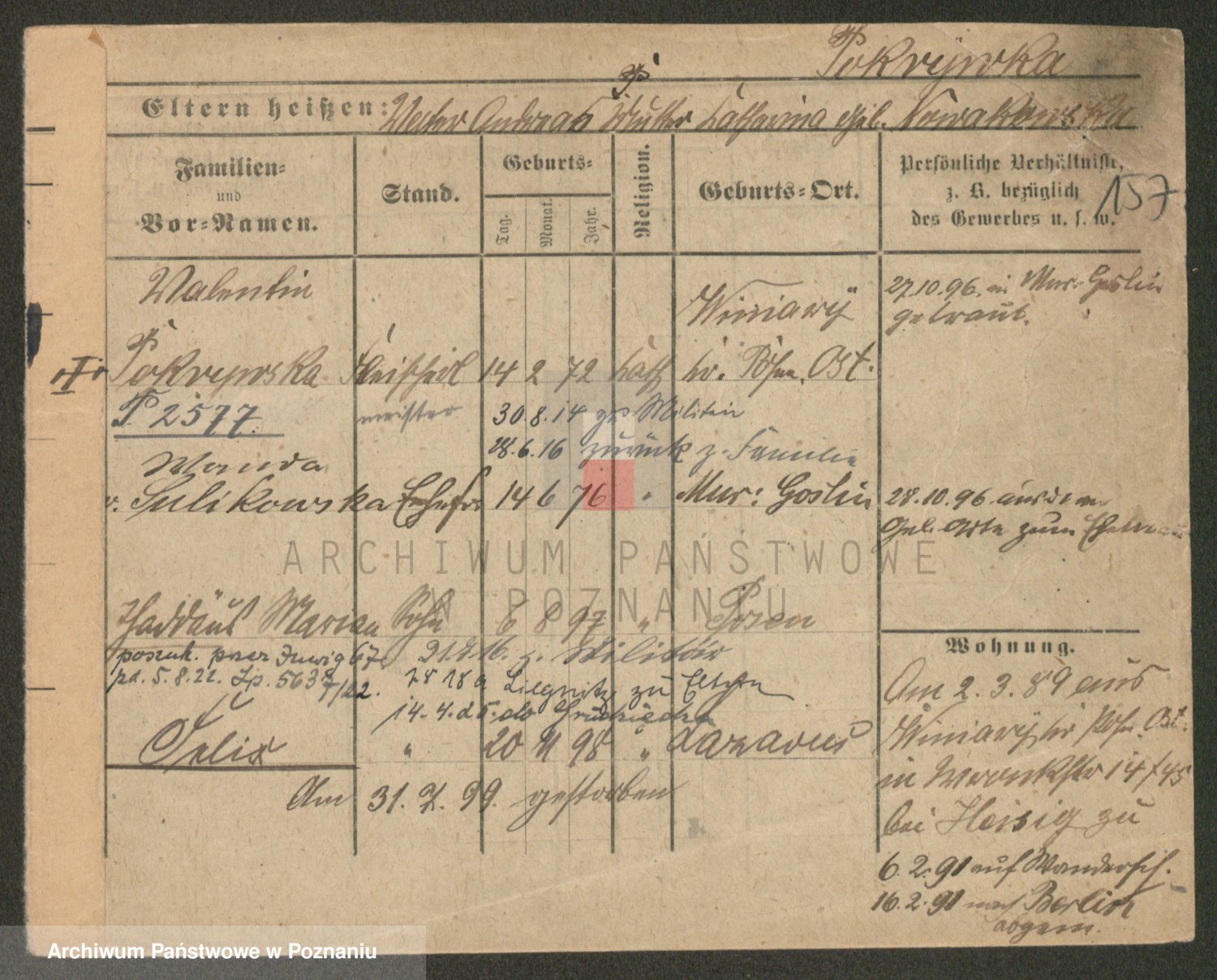 Podgląd karty osobowej dostępny jest po kliknięciu na nazwisko lub ikonkę karty. Można dokonywać powiększenia (ikony na górze) lub przechodzić między kolejnymi skanami (strzałki po bokach).