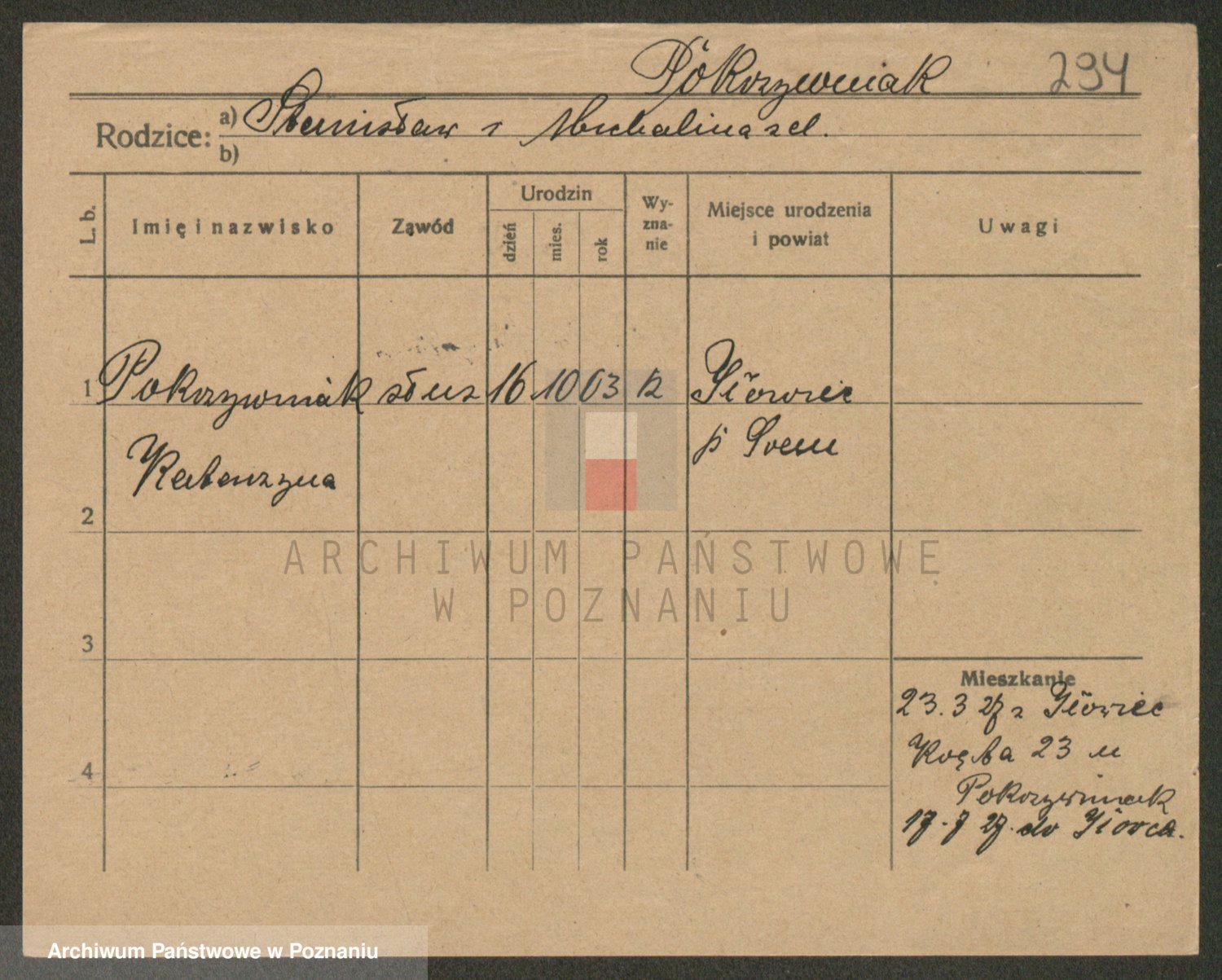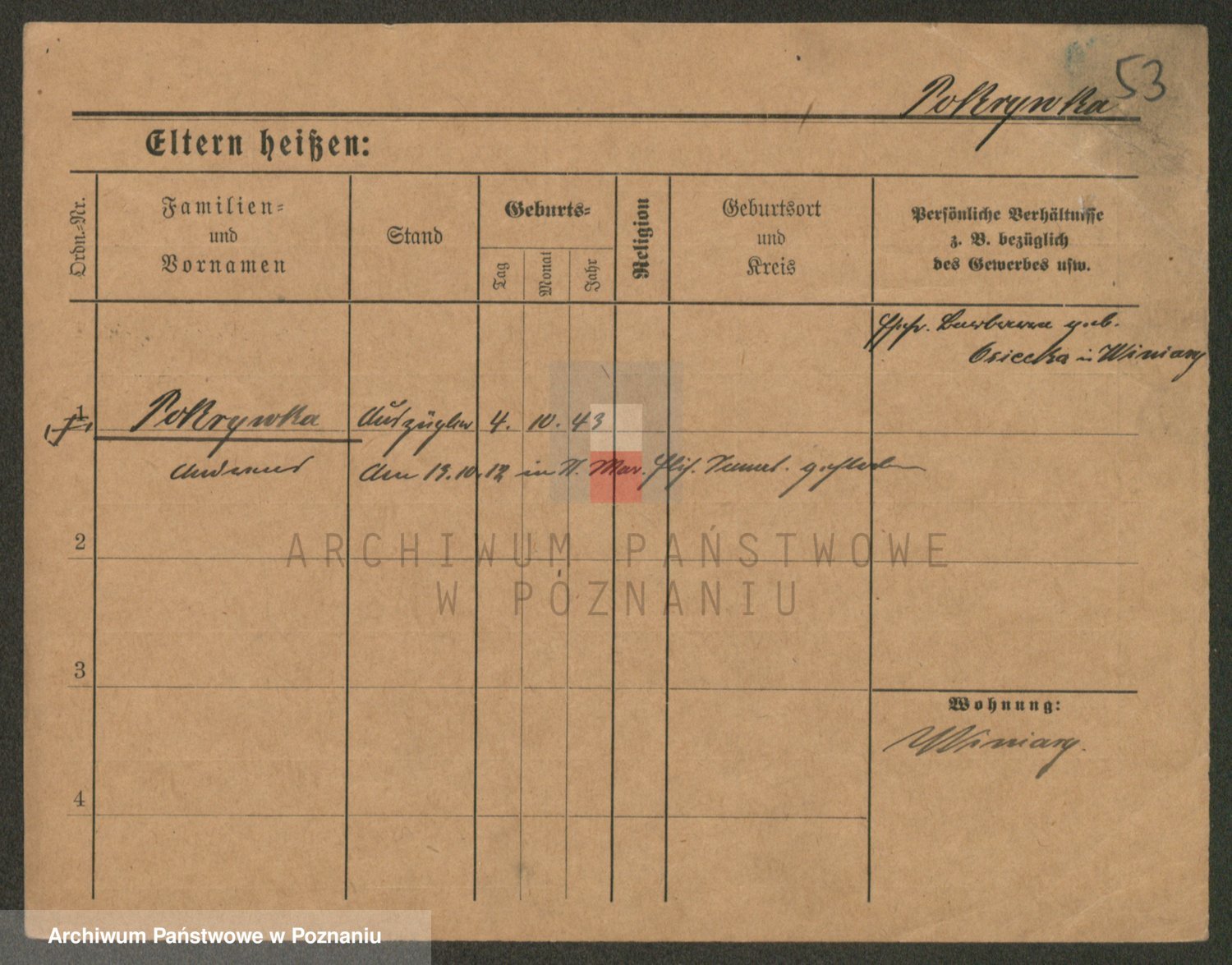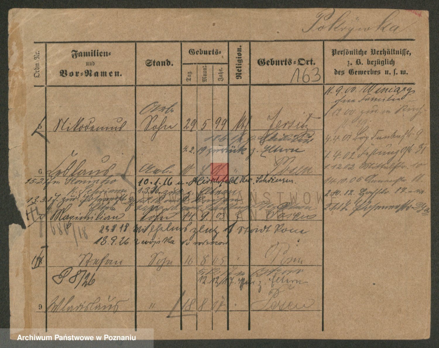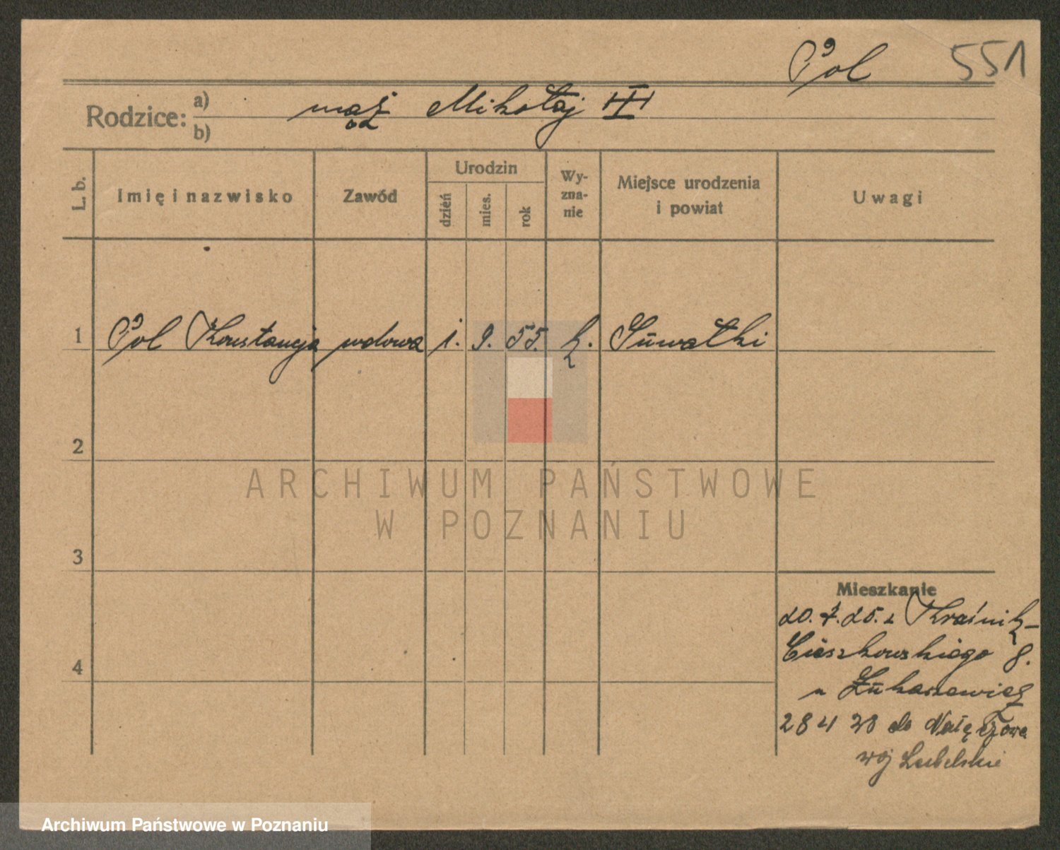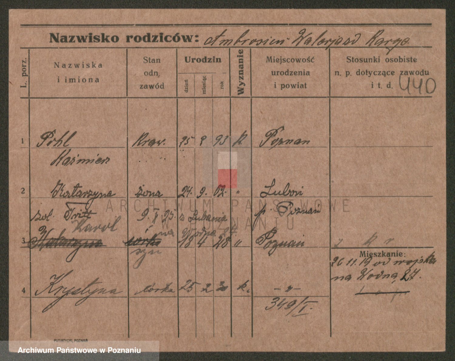 Podgląd karty osobowej dostępny jest po kliknięciu na nazwisko lub ikonkę karty. Można dokonywać powiększenia (ikony na górze) lub przechodzić między kolejnymi skanami (strzałki po bokach).