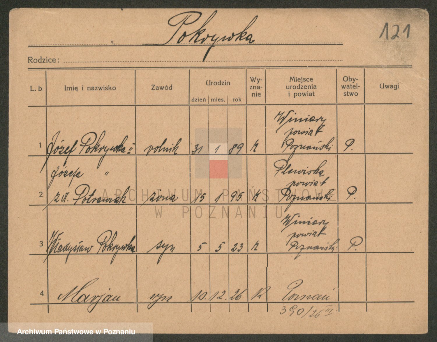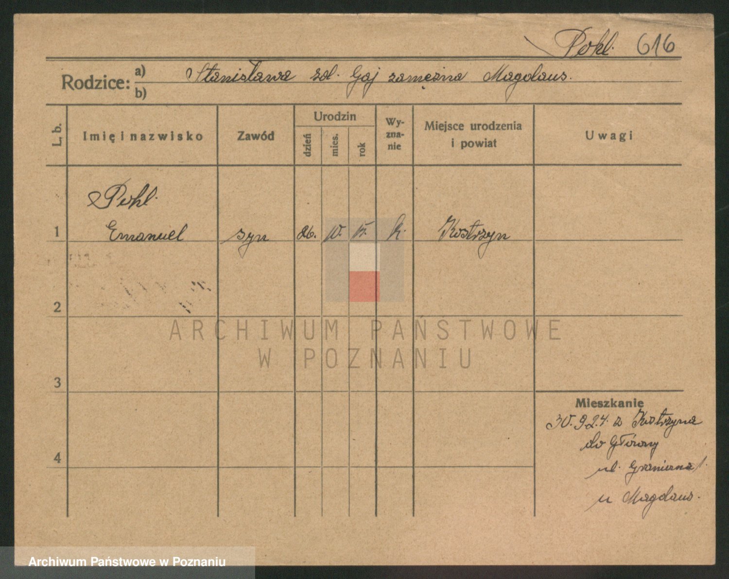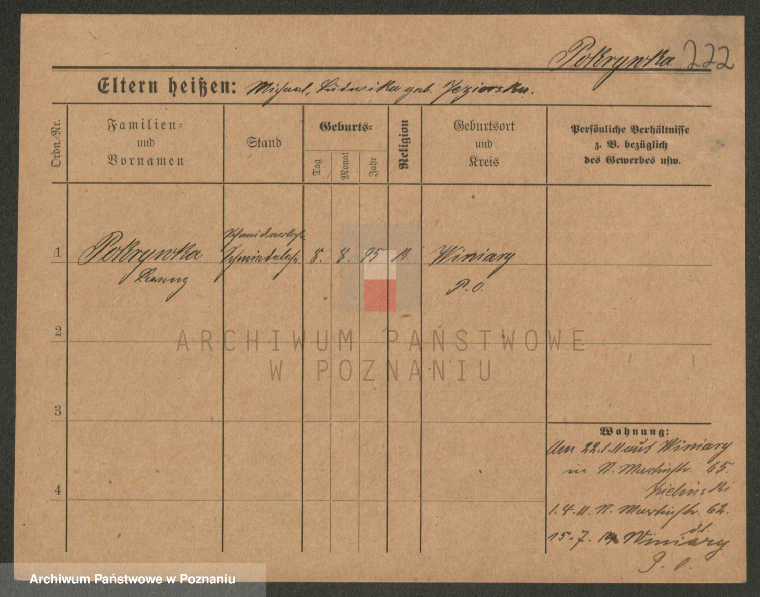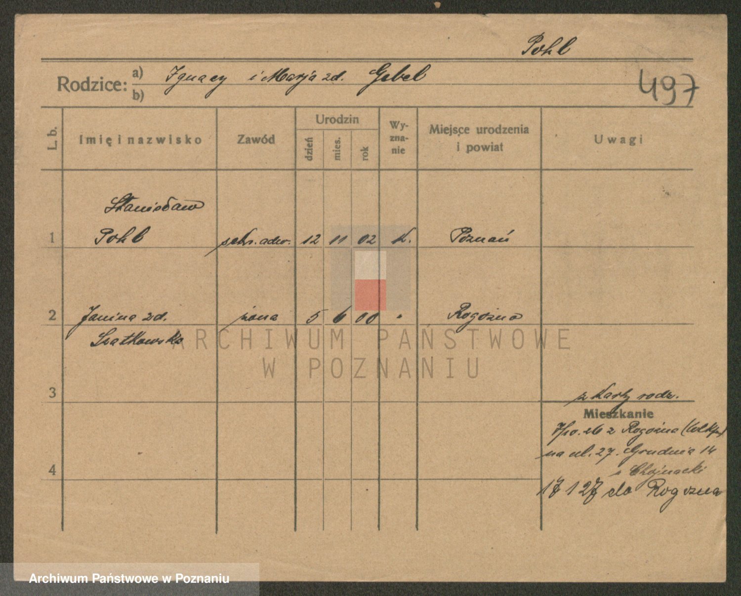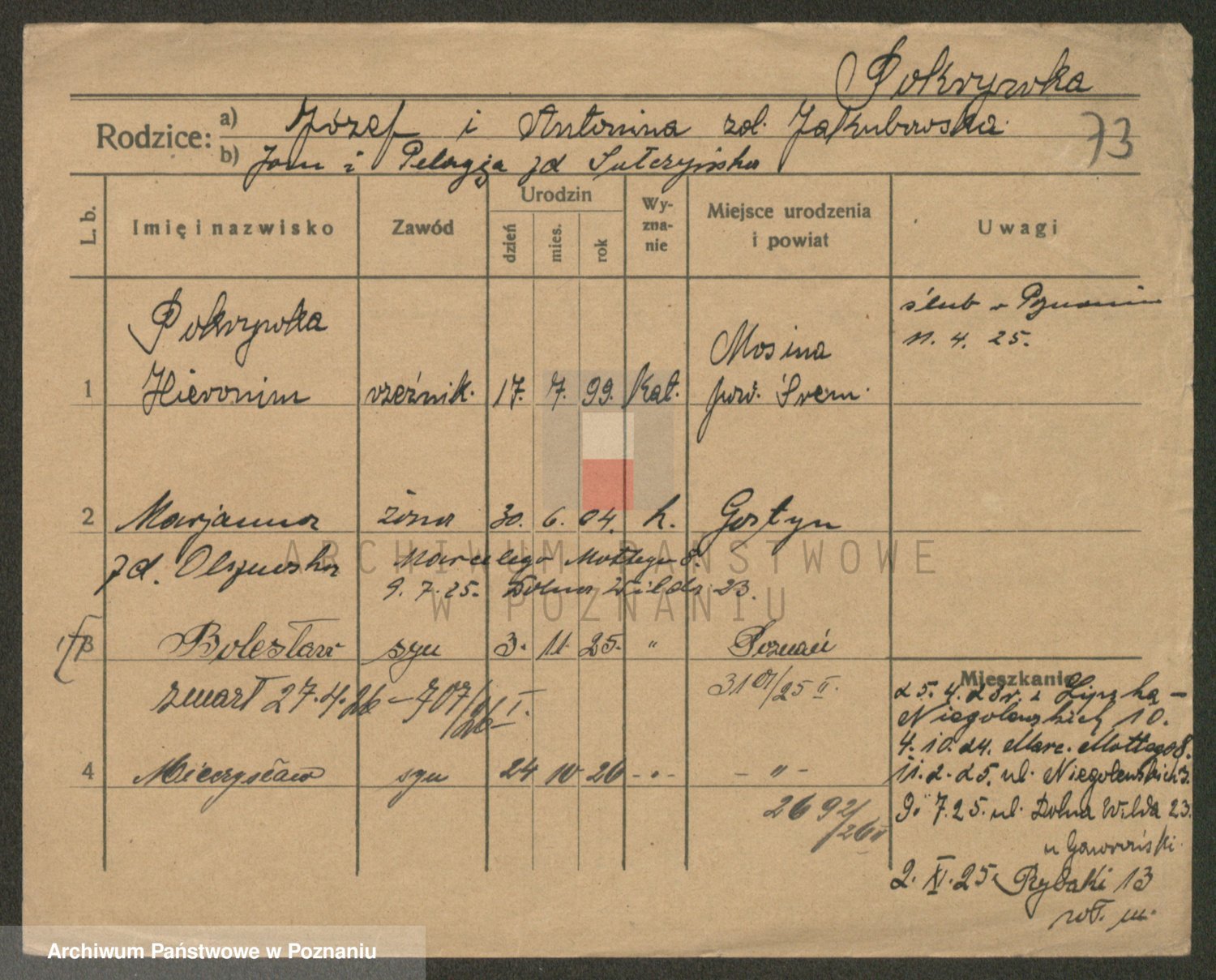Podgląd karty osobowej dostępny jest po kliknięciu na nazwisko lub ikonkę karty. Można dokonywać powiększenia (ikony na górze) lub przechodzić między kolejnymi skanami (strzałki po bokach).