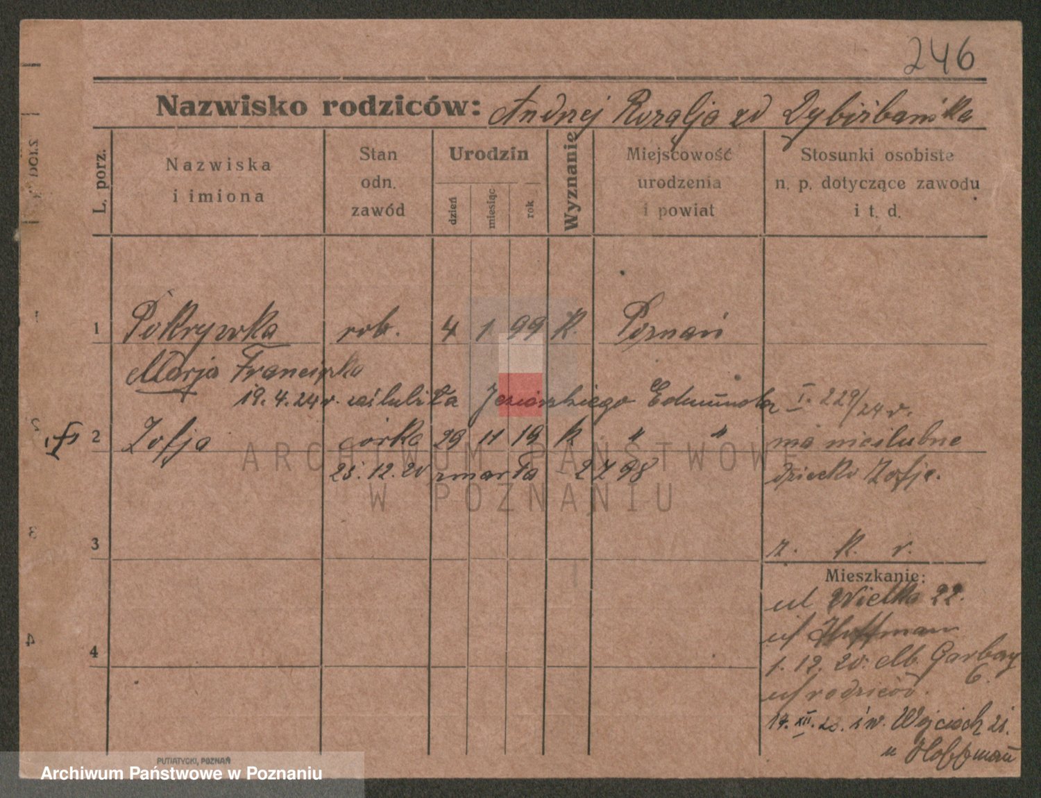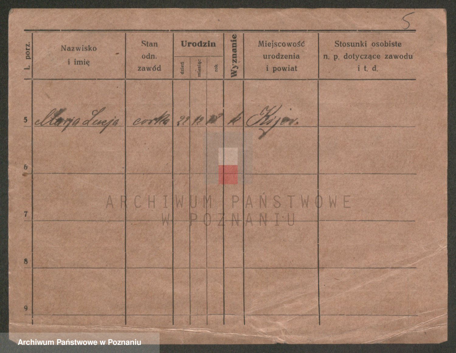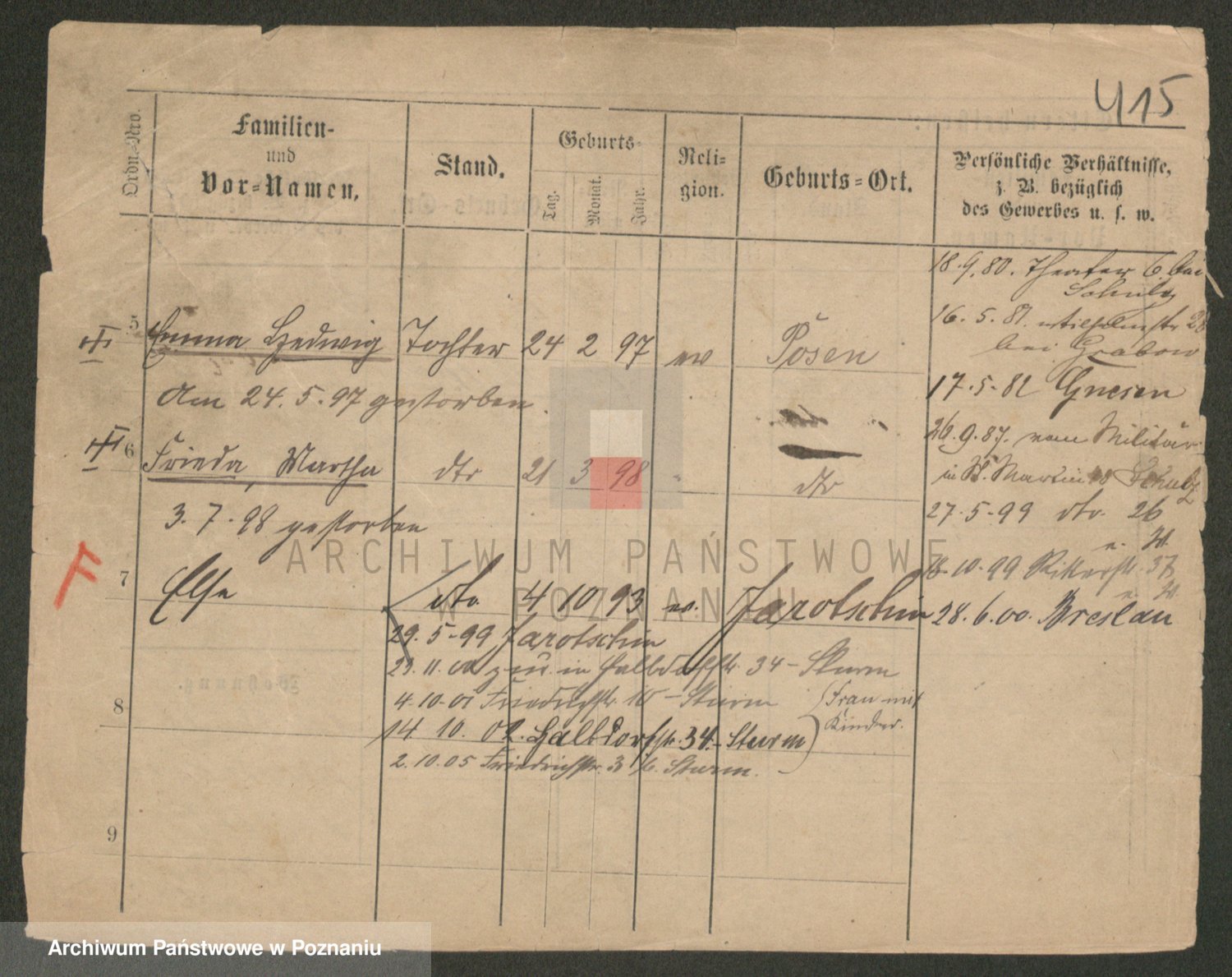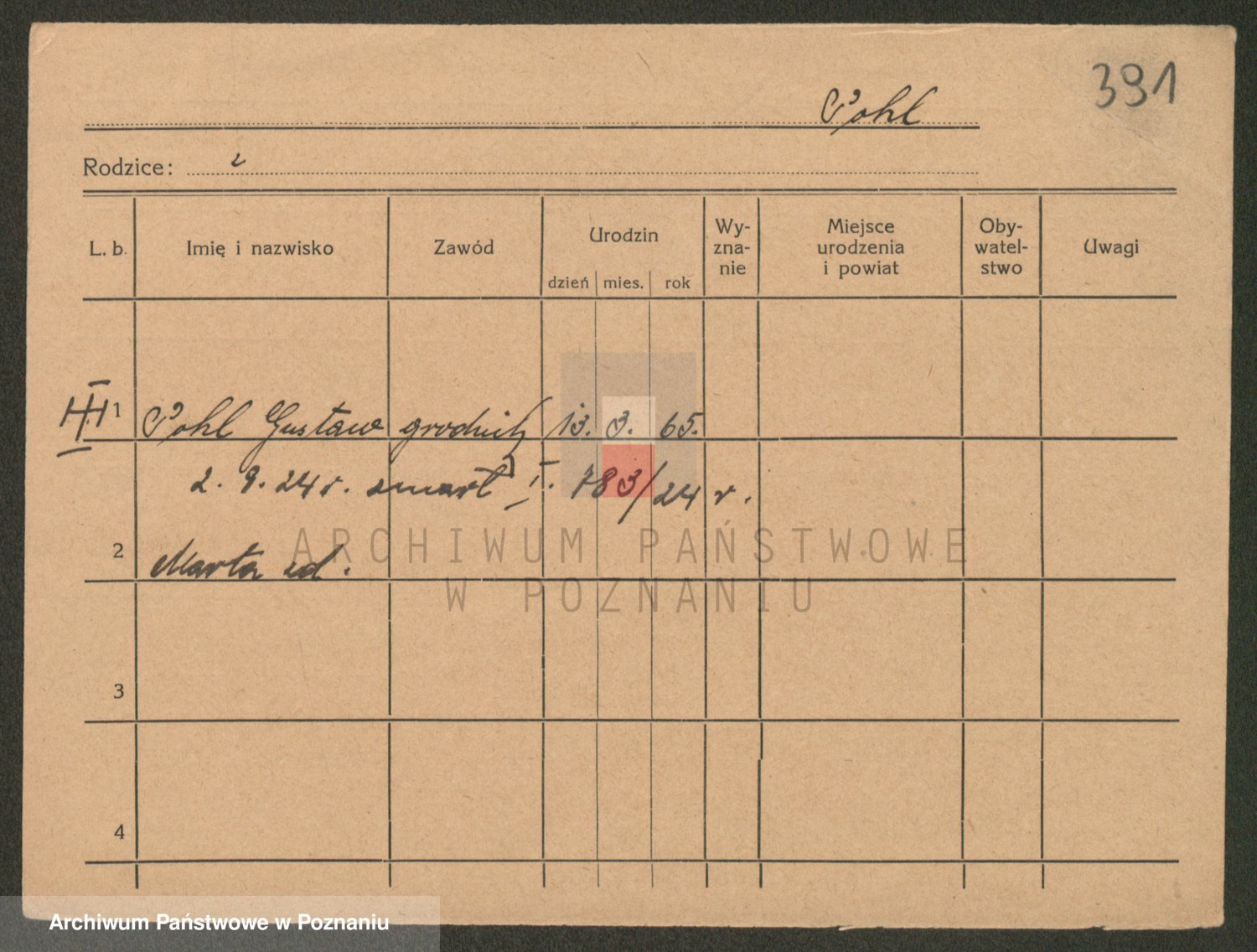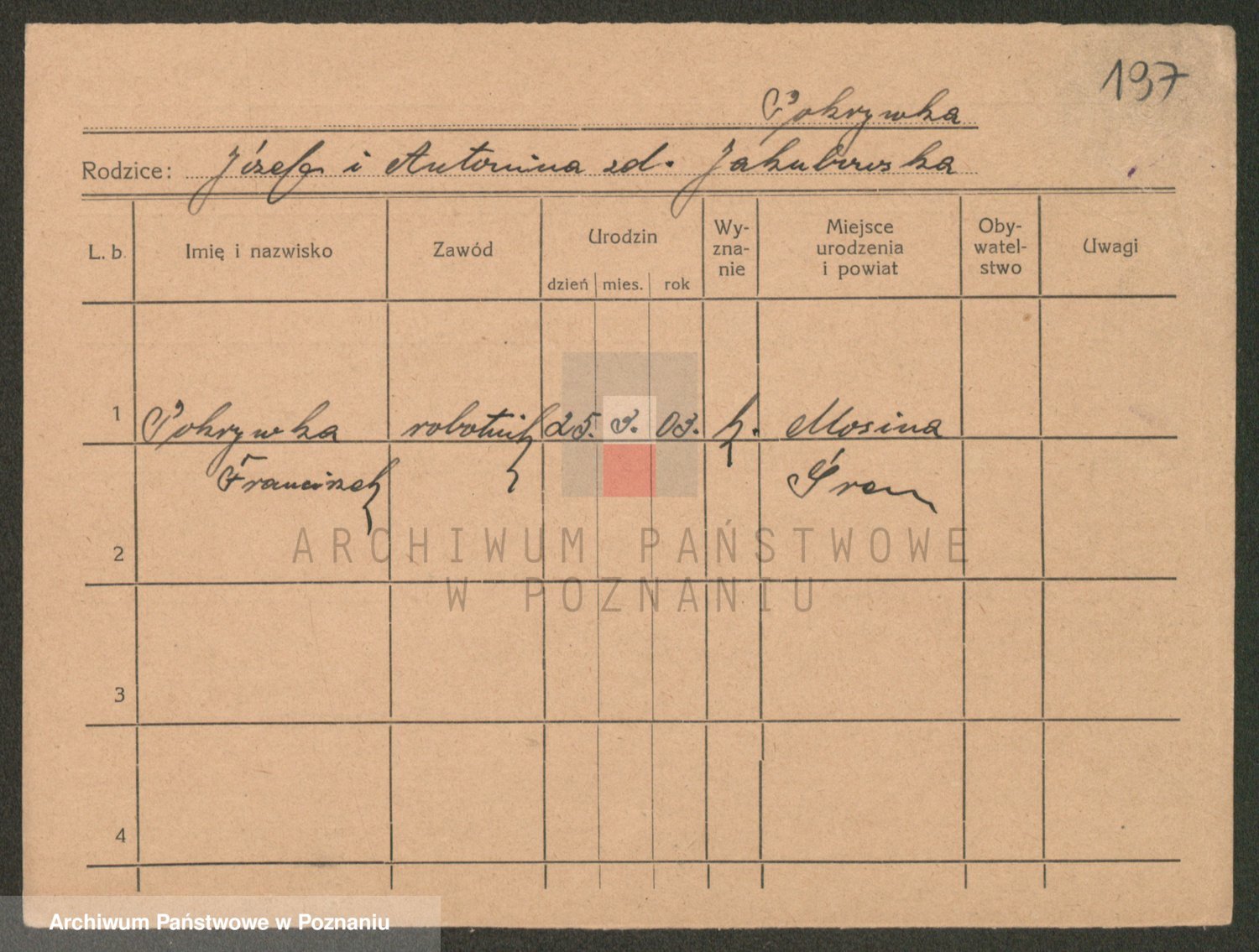 Podgląd karty osobowej dostępny jest po kliknięciu na nazwisko lub ikonkę karty. Można dokonywać powiększenia (ikony na górze) lub przechodzić między kolejnymi skanami (strzałki po bokach).