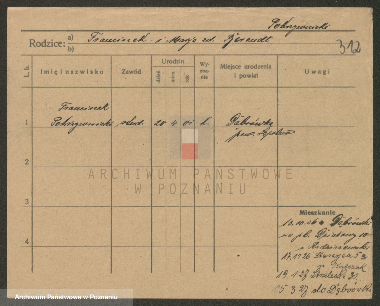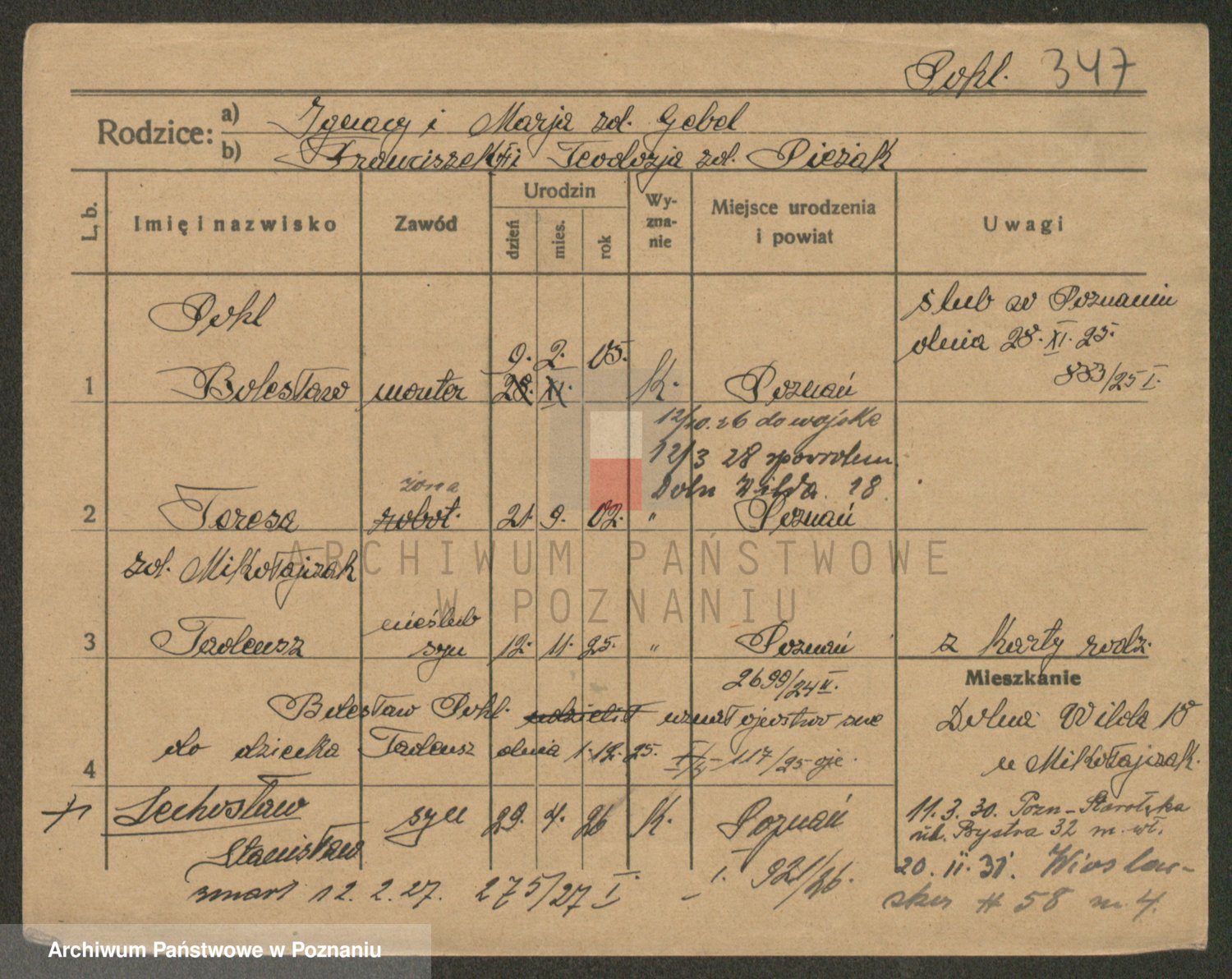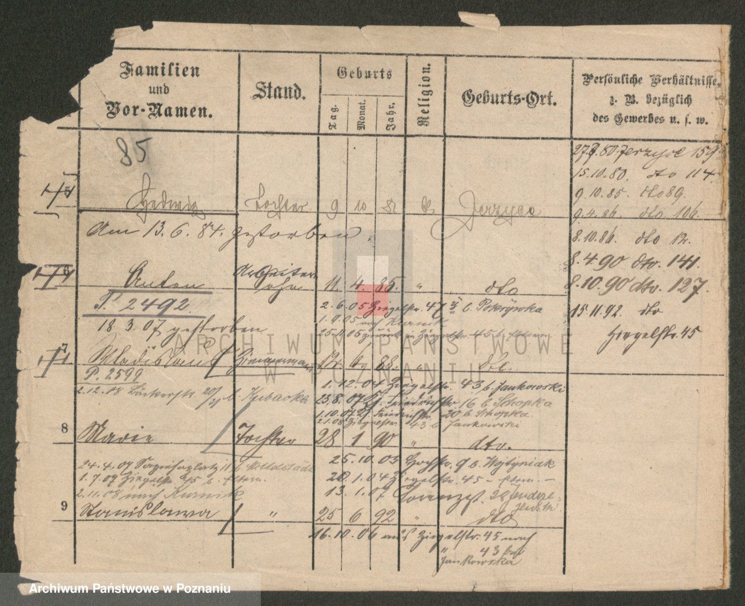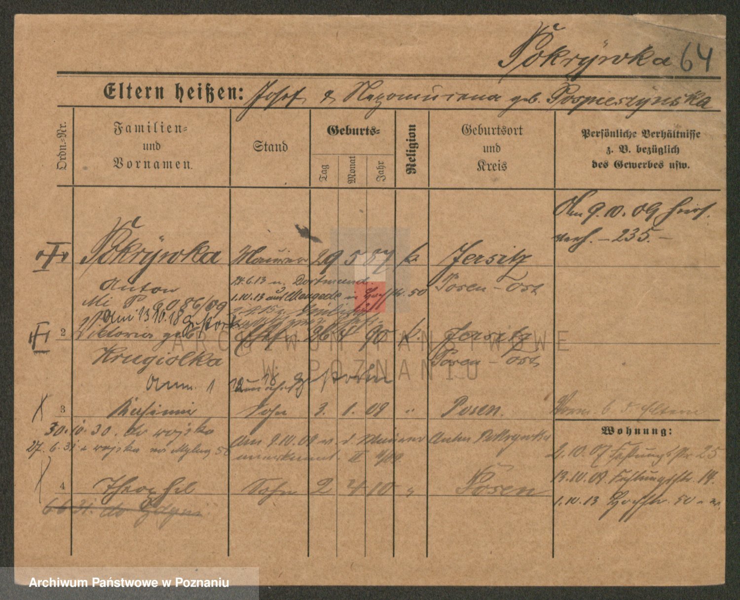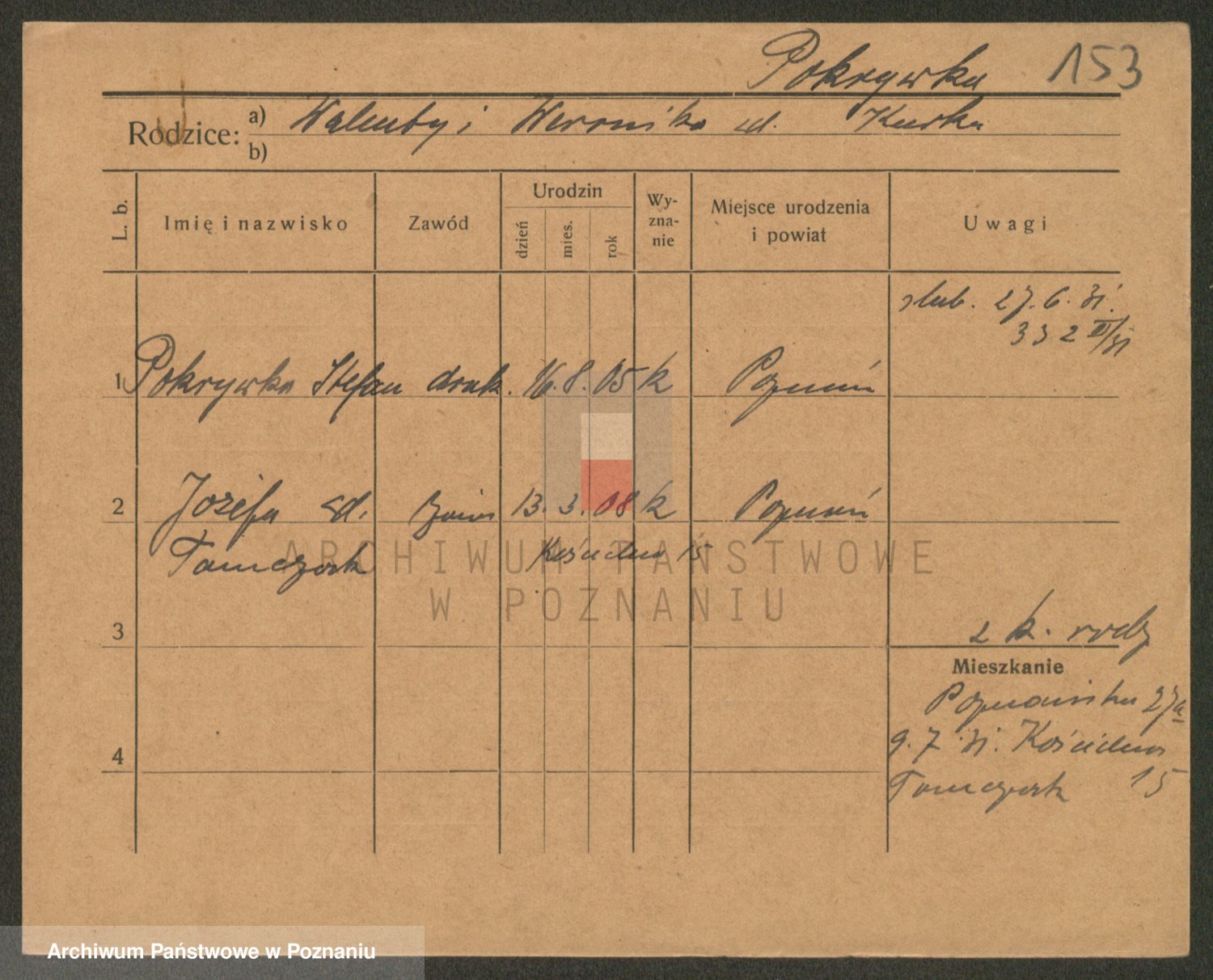 Podgląd karty osobowej dostępny jest po kliknięciu na nazwisko lub ikonkę karty. Można dokonywać powiększenia (ikony na górze) lub przechodzić między kolejnymi skanami (strzałki po bokach).