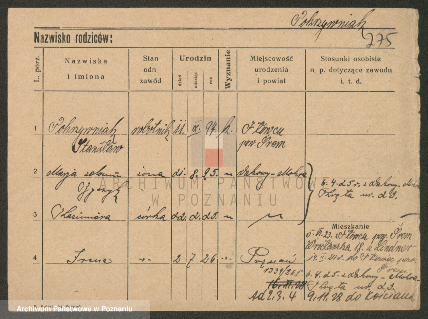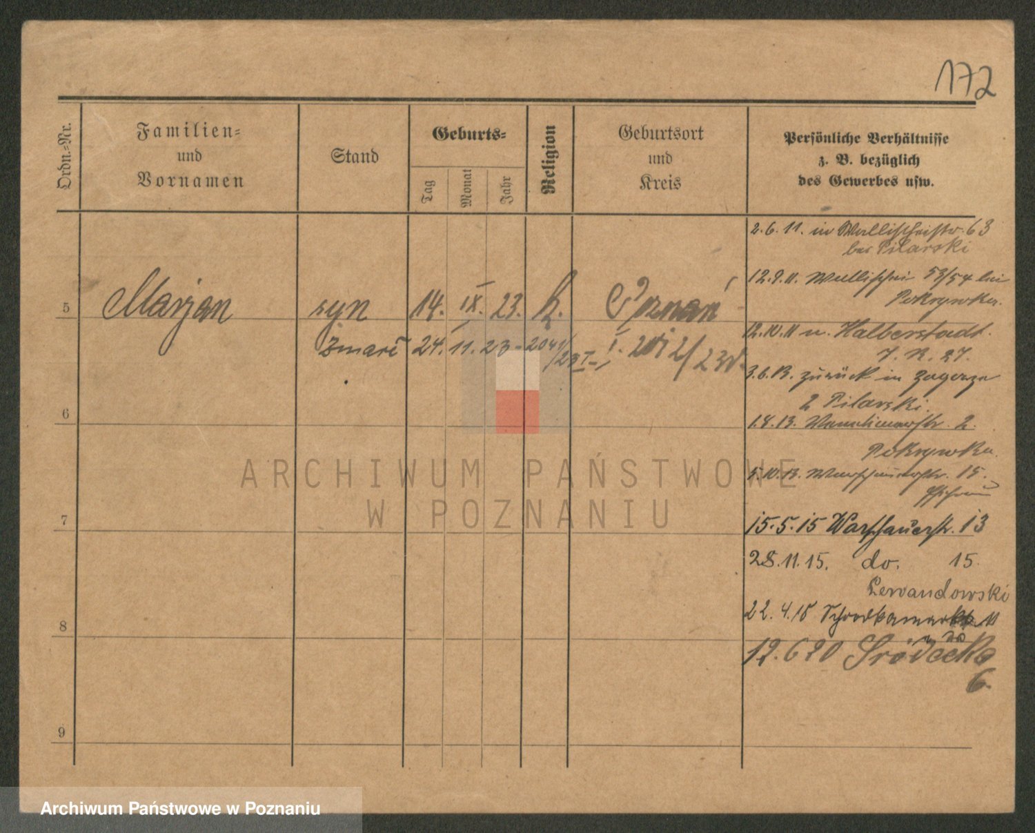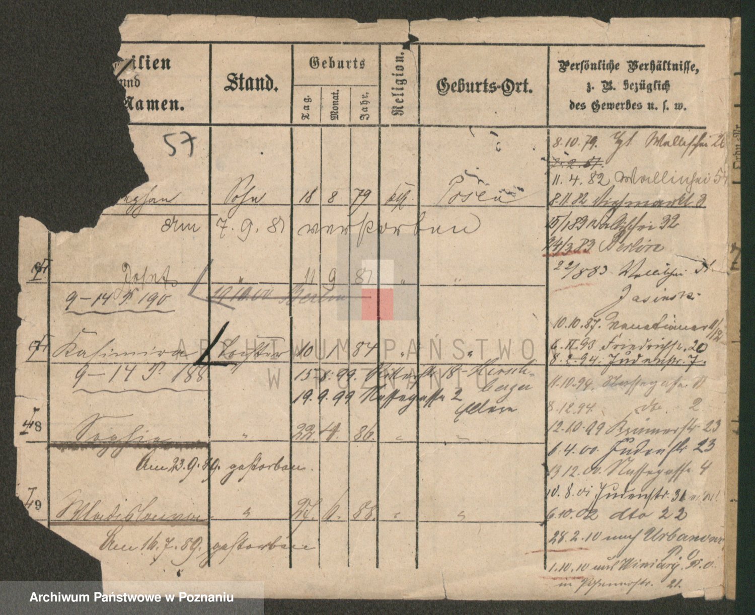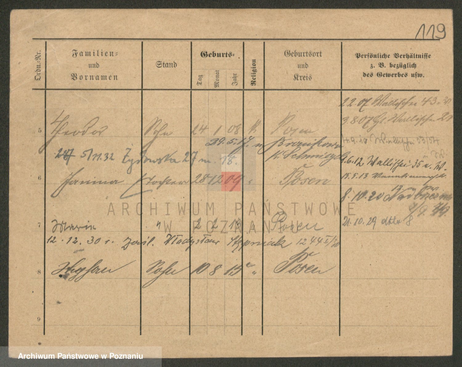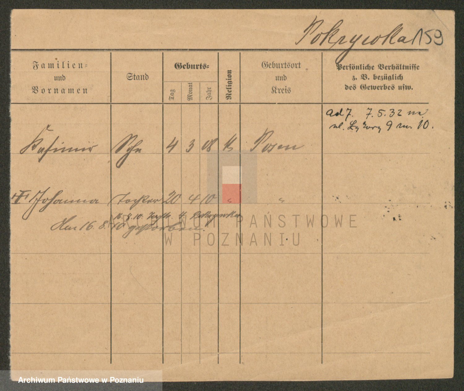 Podgląd karty osobowej dostępny jest po kliknięciu na nazwisko lub ikonkę karty. Można dokonywać powiększenia (ikony na górze) lub przechodzić między kolejnymi skanami (strzałki po bokach).