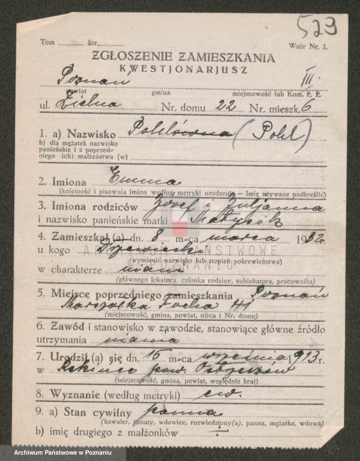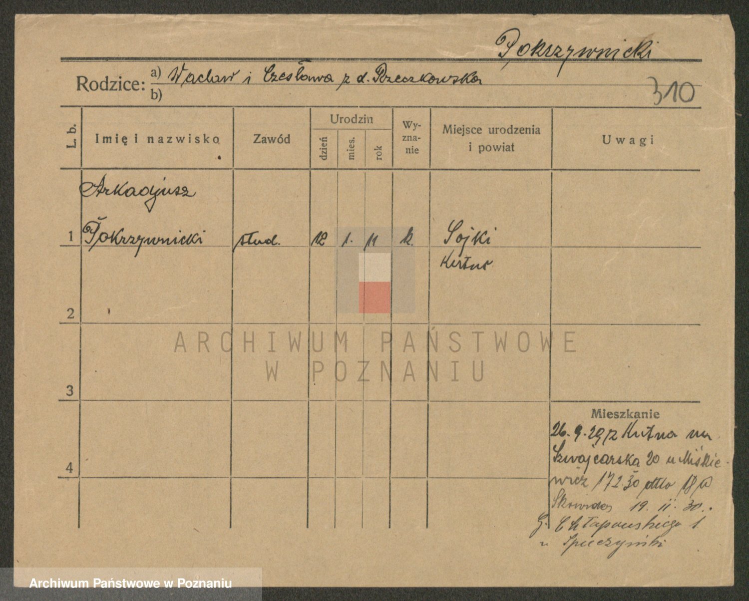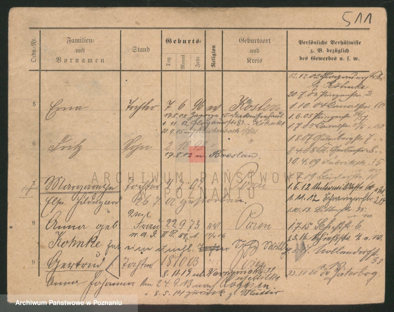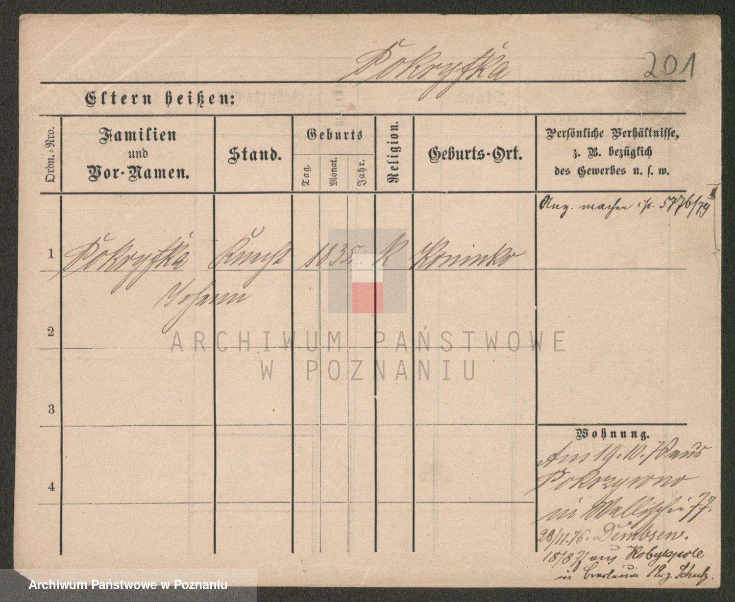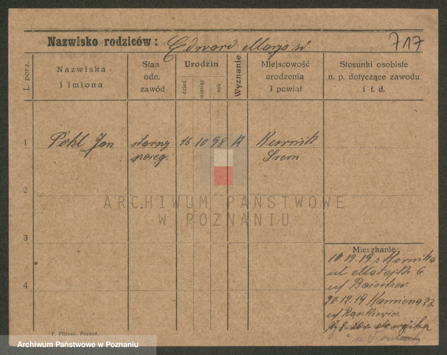 Podgląd karty osobowej dostępny jest po kliknięciu na nazwisko lub ikonkę karty. Można dokonywać powiększenia (ikony na górze) lub przechodzić między kolejnymi skanami (strzałki po bokach).