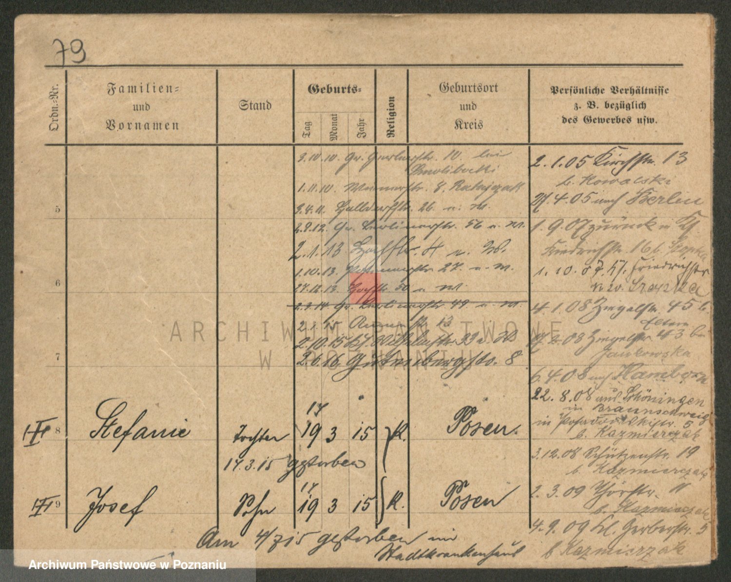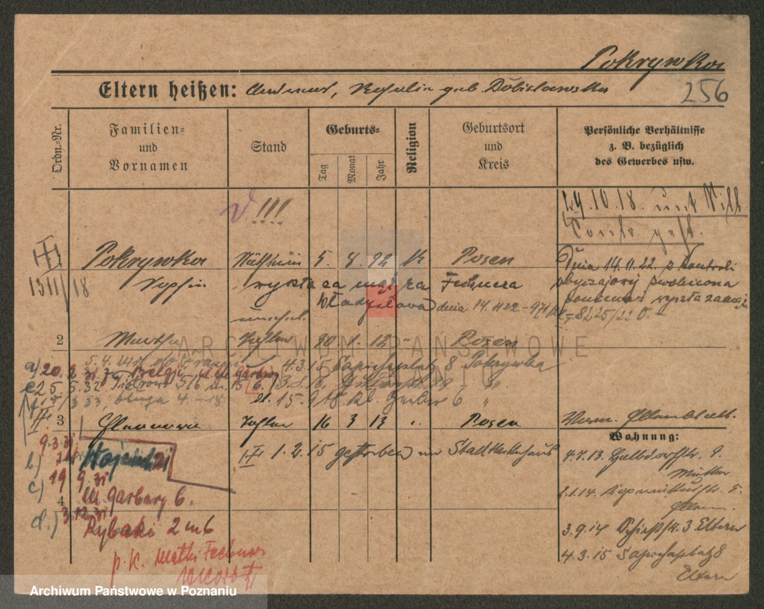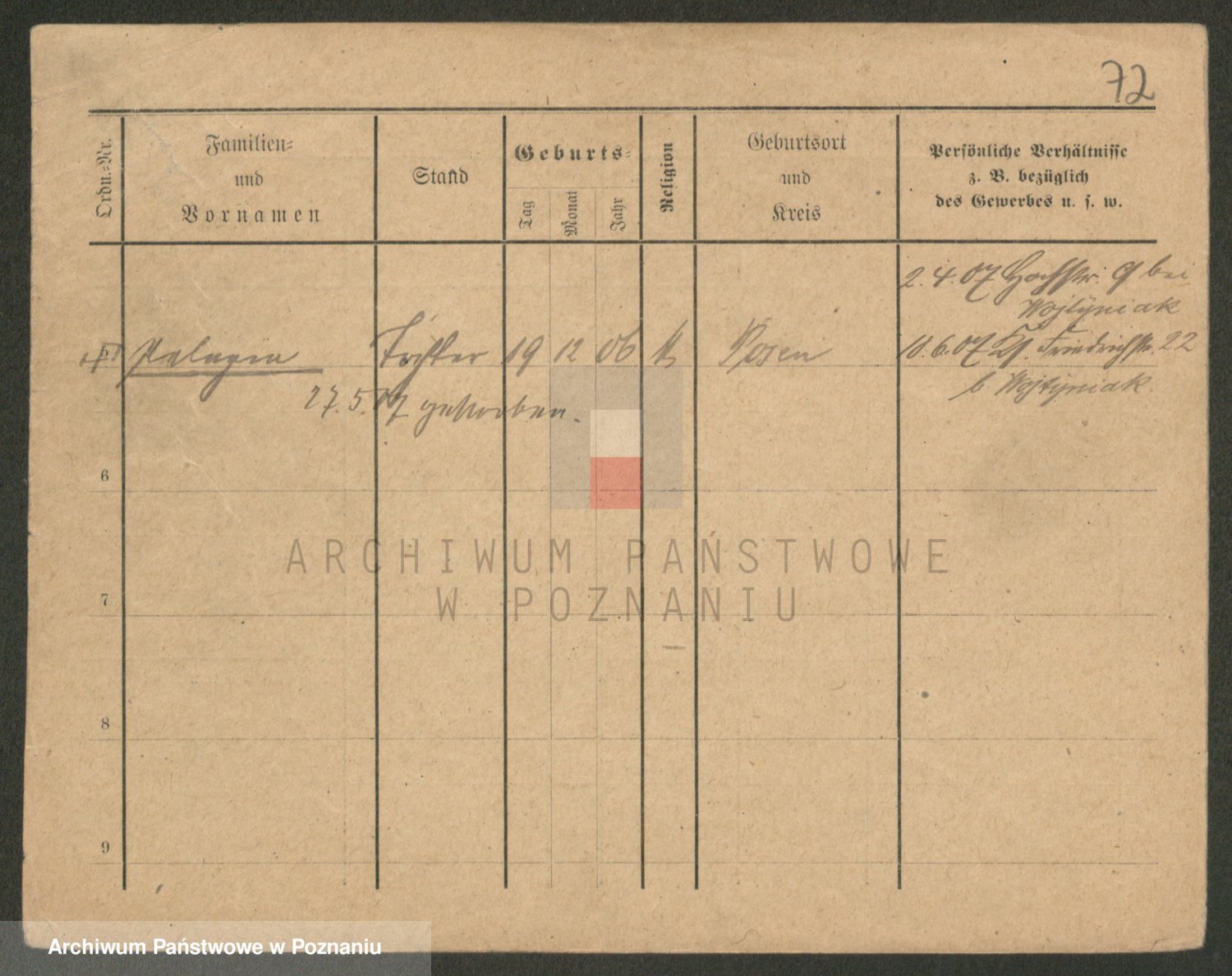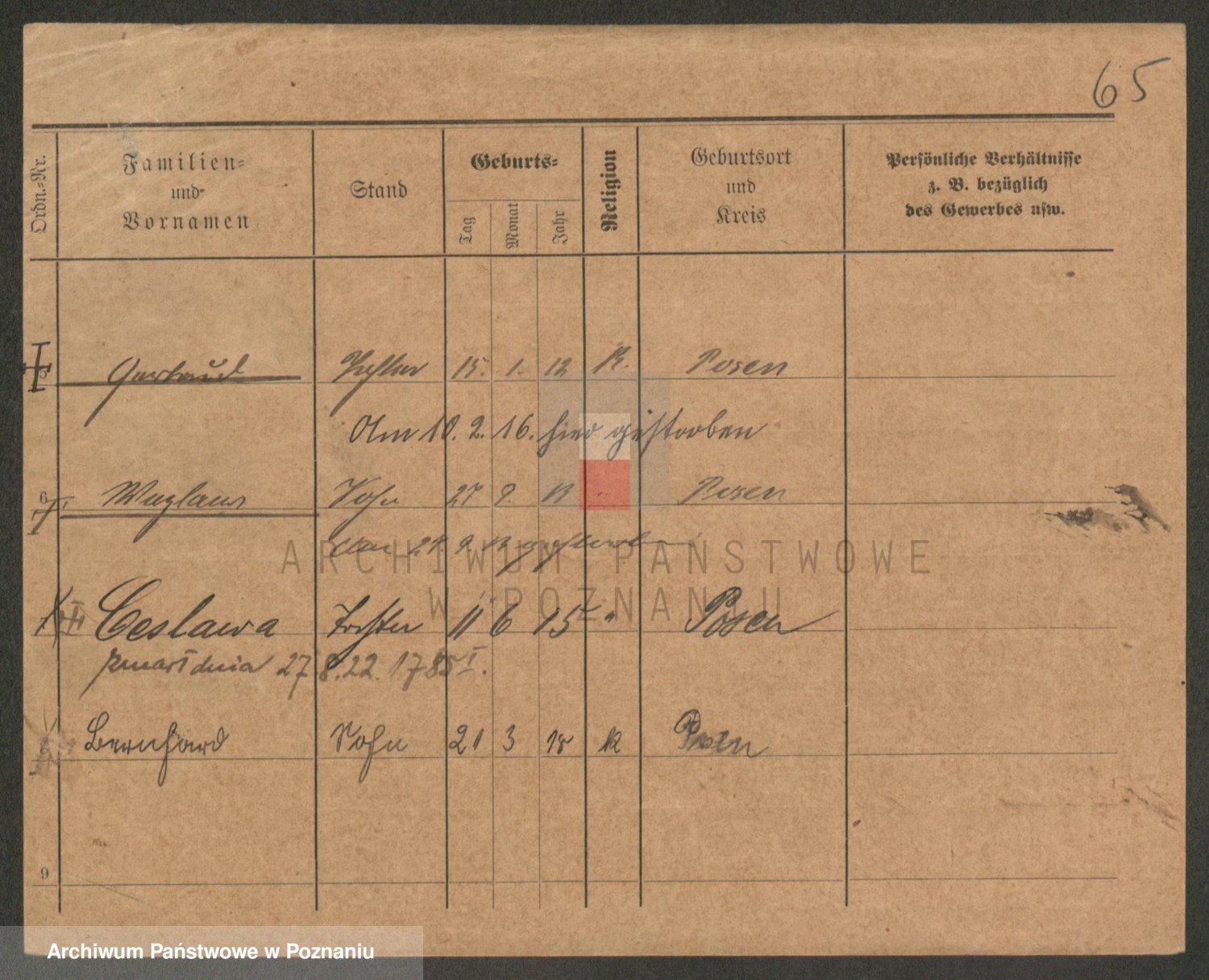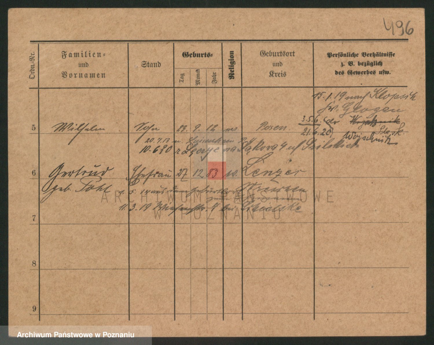 Podgląd karty osobowej dostępny jest po kliknięciu na nazwisko lub ikonkę karty. Można dokonywać powiększenia (ikony na górze) lub przechodzić między kolejnymi skanami (strzałki po bokach).