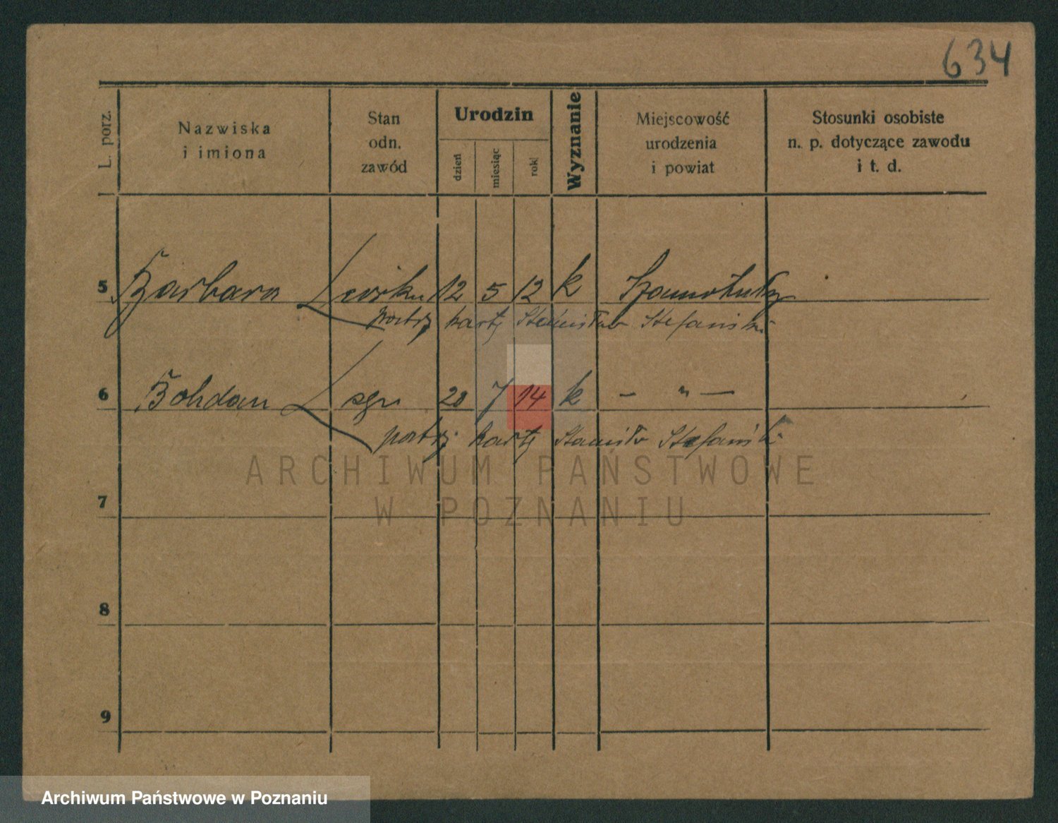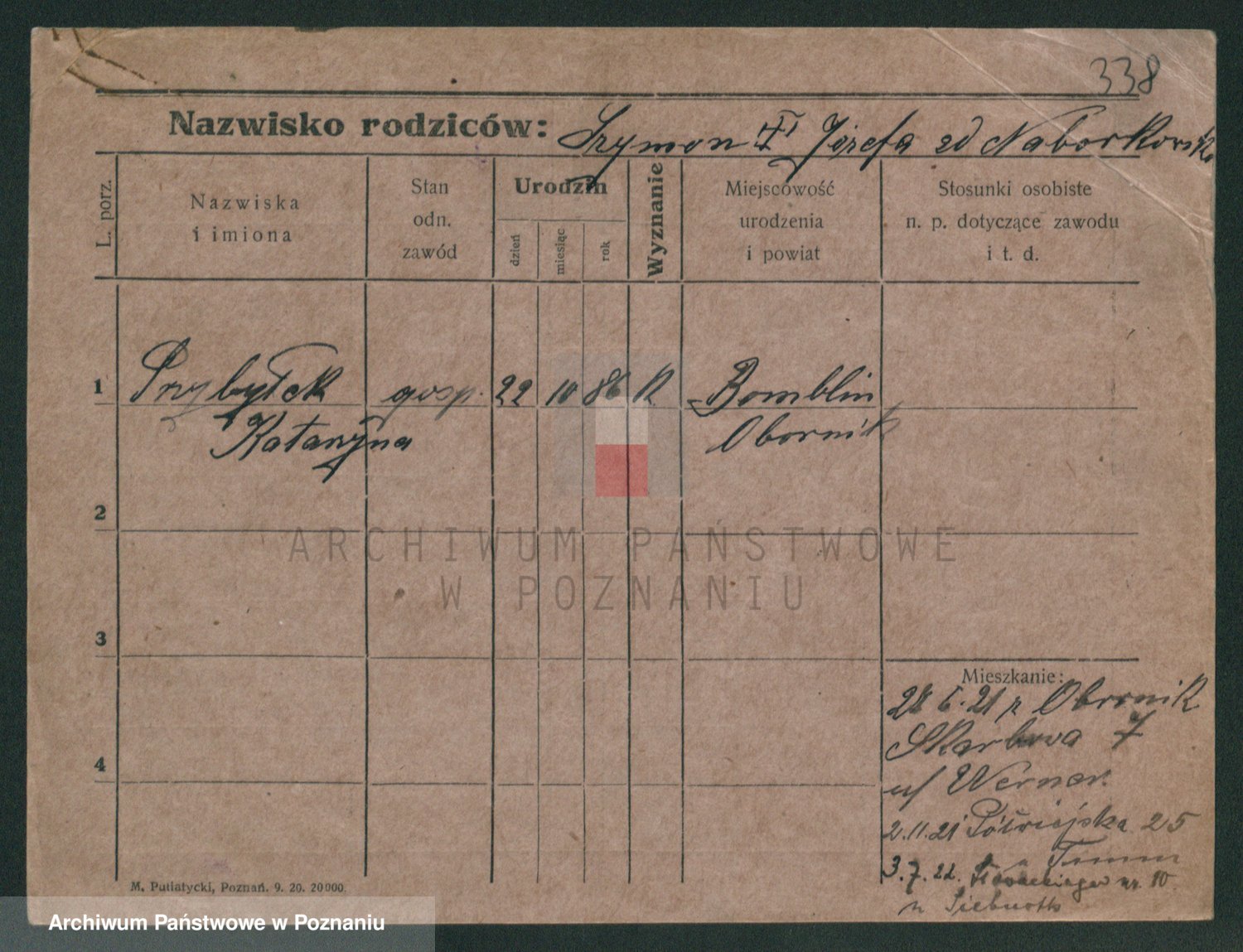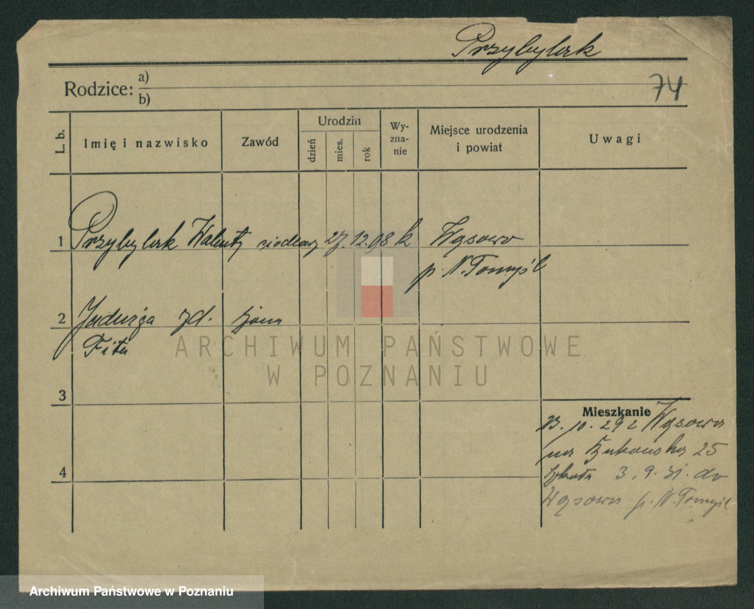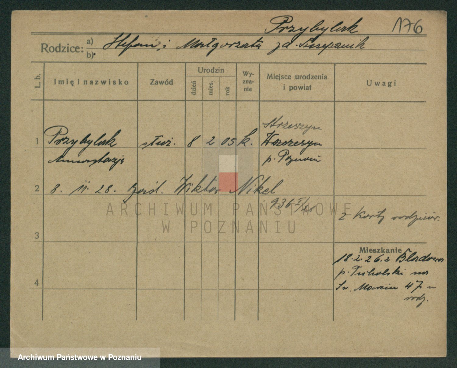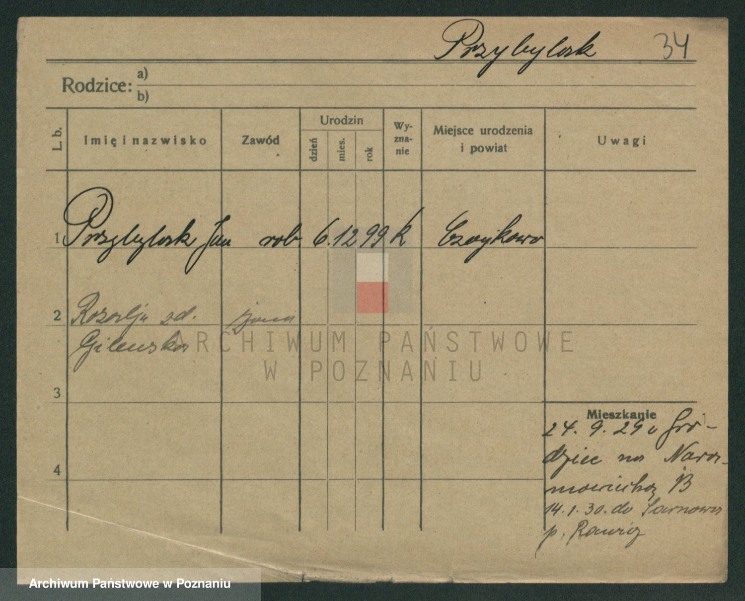 Podgląd karty osobowej dostępny jest po kliknięciu na nazwisko lub ikonkę karty. Można dokonywać powiększenia (ikony na górze) lub przechodzić między kolejnymi skanami (strzałki po bokach).