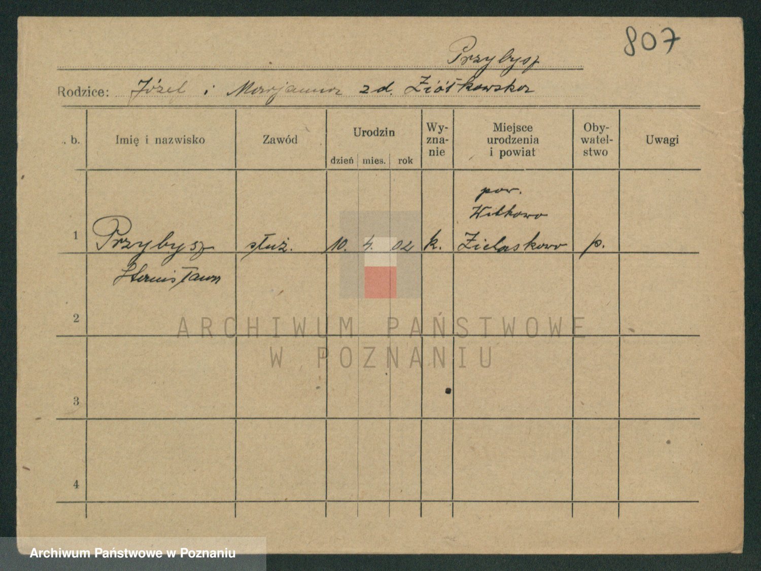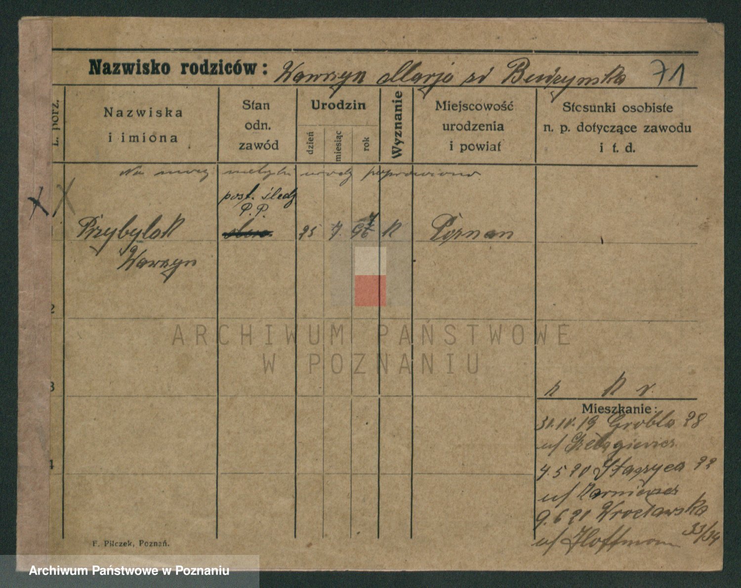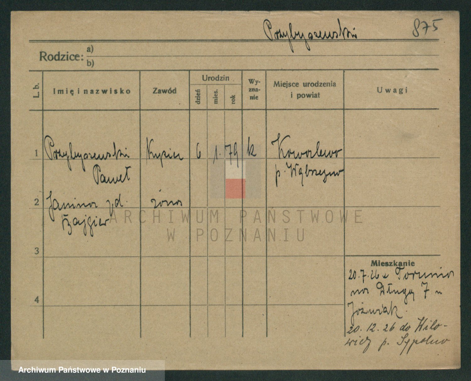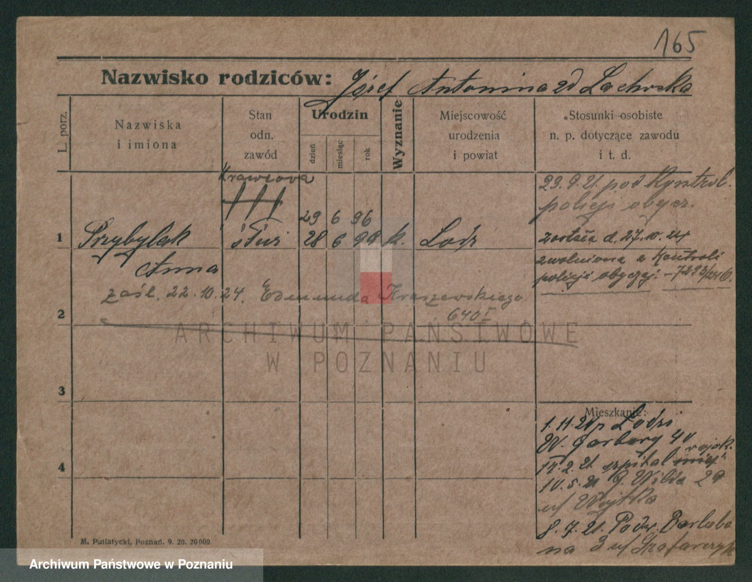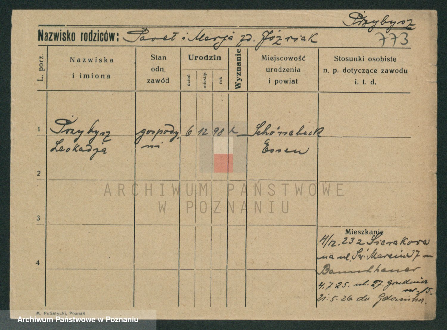 Podgląd karty osobowej dostępny jest po kliknięciu na nazwisko lub ikonkę karty. Można dokonywać powiększenia (ikony na górze) lub przechodzić między kolejnymi skanami (strzałki po bokach).