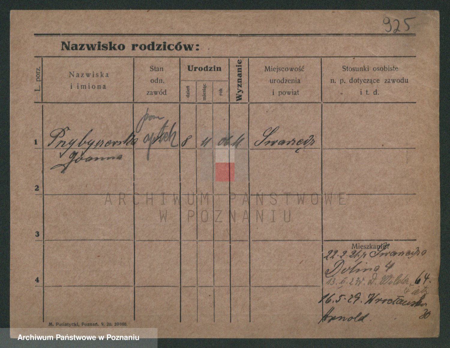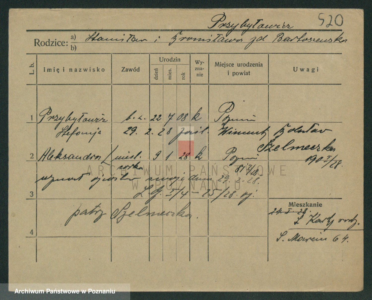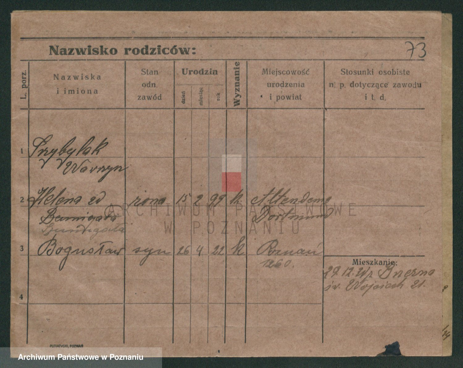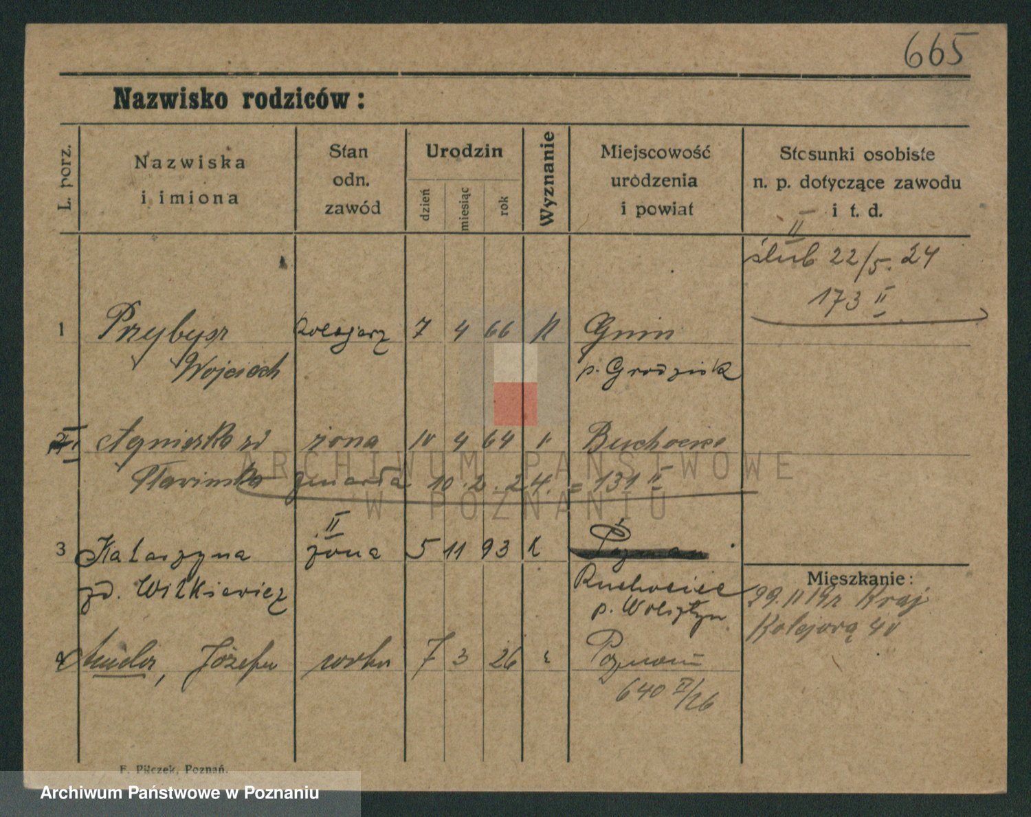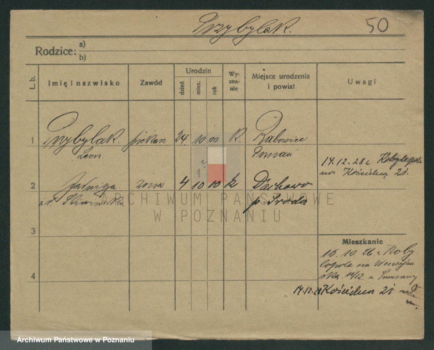 Podgląd karty osobowej dostępny jest po kliknięciu na nazwisko lub ikonkę karty. Można dokonywać powiększenia (ikony na górze) lub przechodzić między kolejnymi skanami (strzałki po bokach).