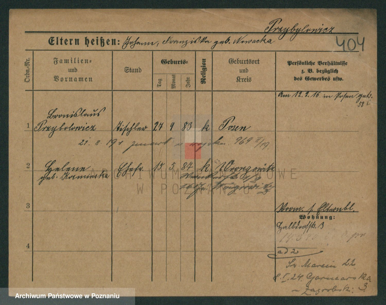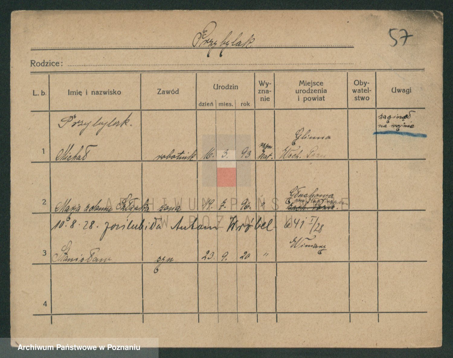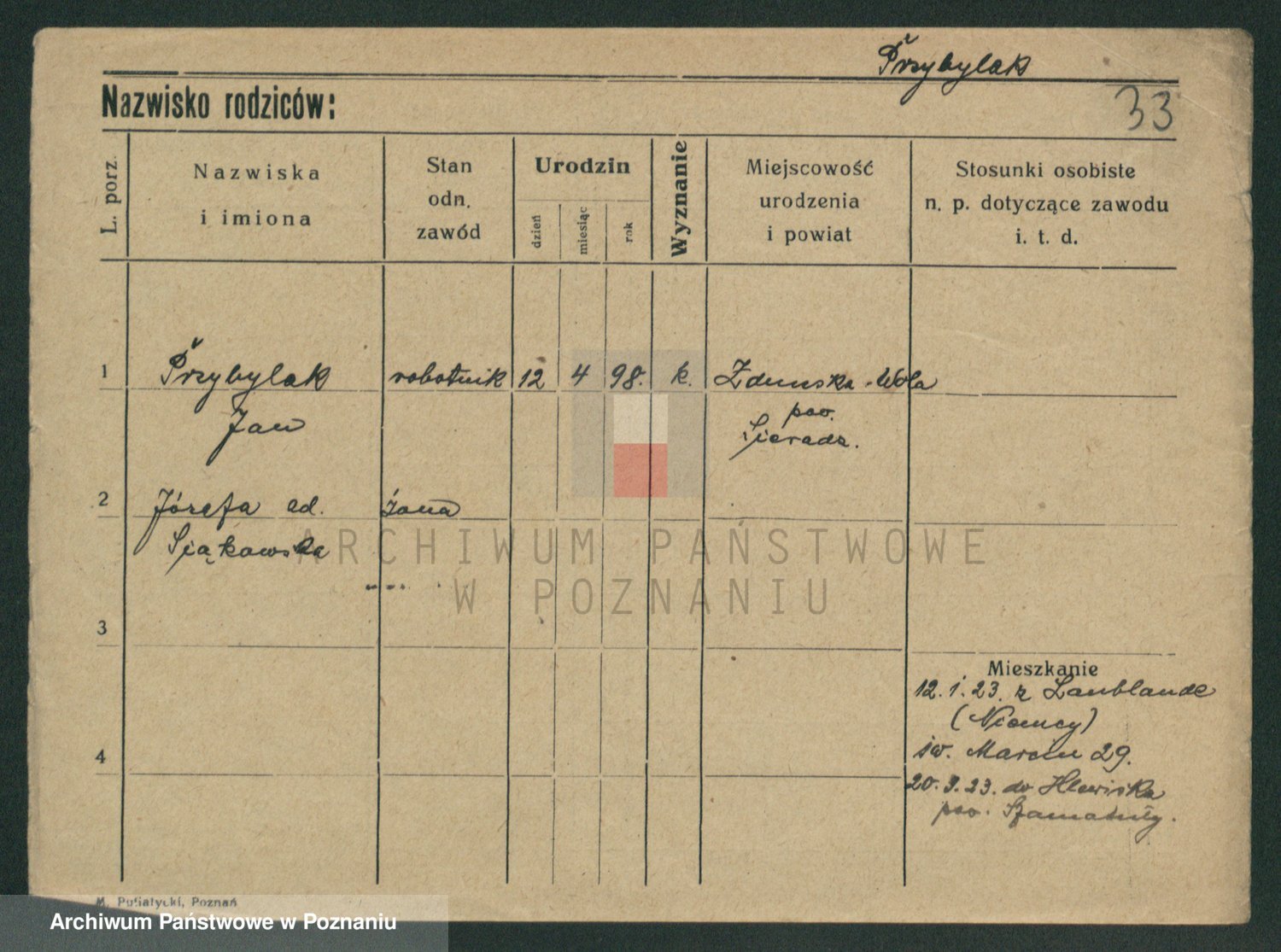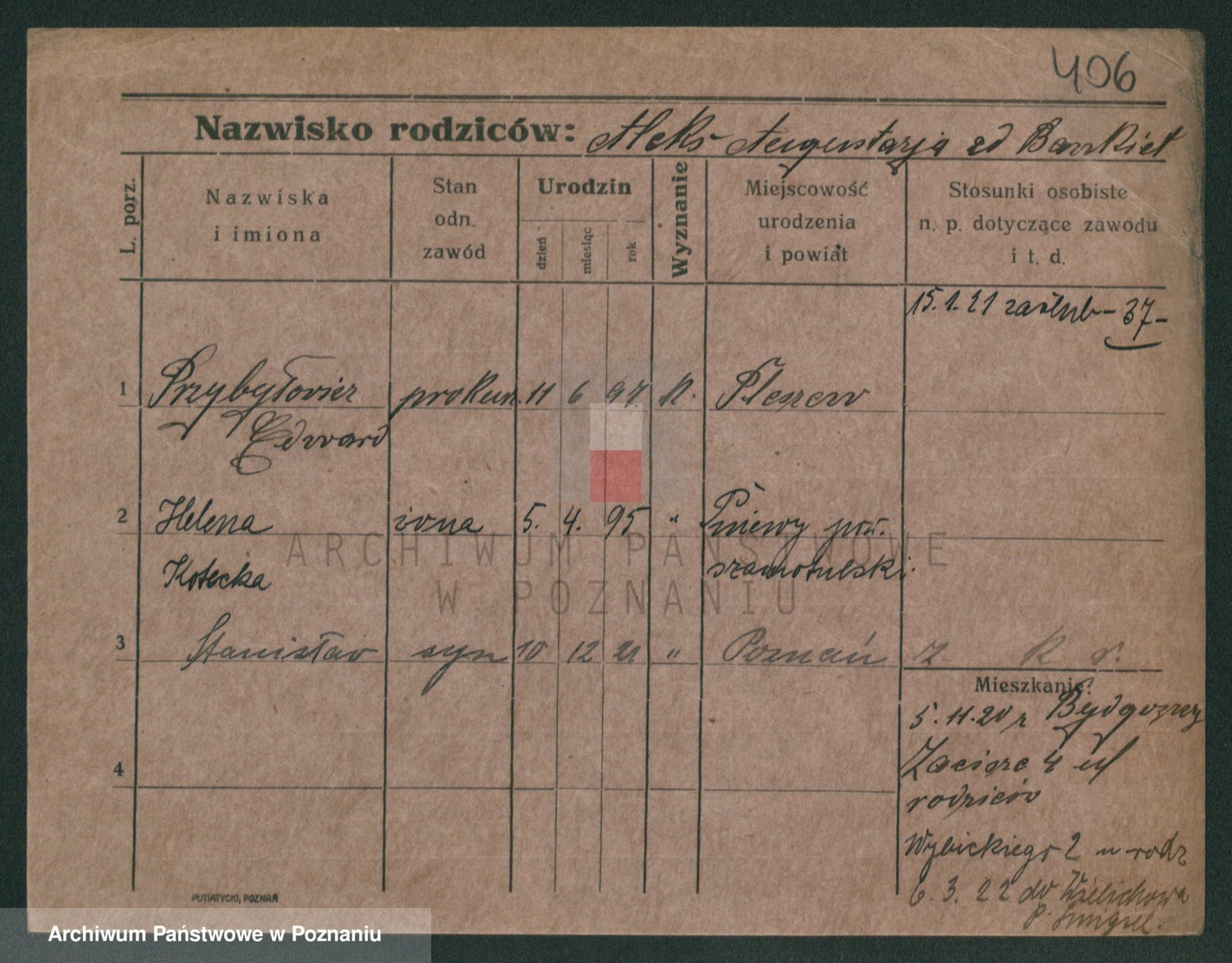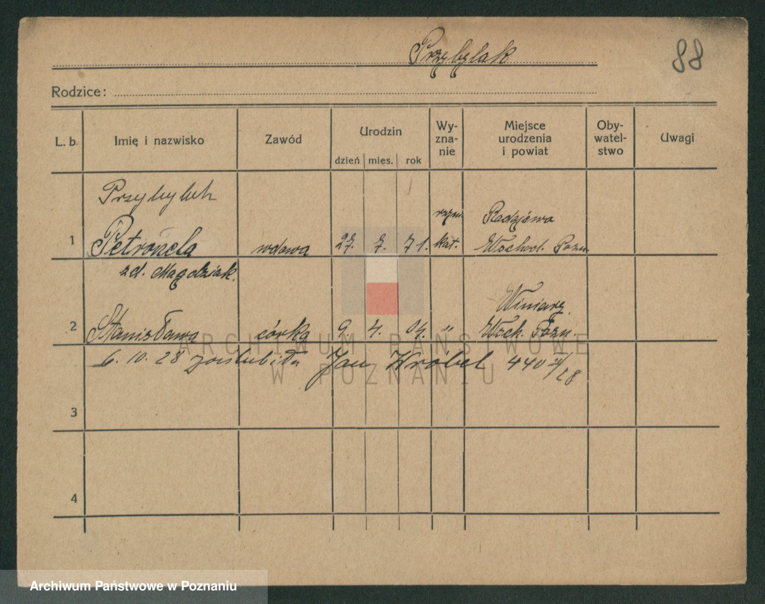 Podgląd karty osobowej dostępny jest po kliknięciu na nazwisko lub ikonkę karty. Można dokonywać powiększenia (ikony na górze) lub przechodzić między kolejnymi skanami (strzałki po bokach).
