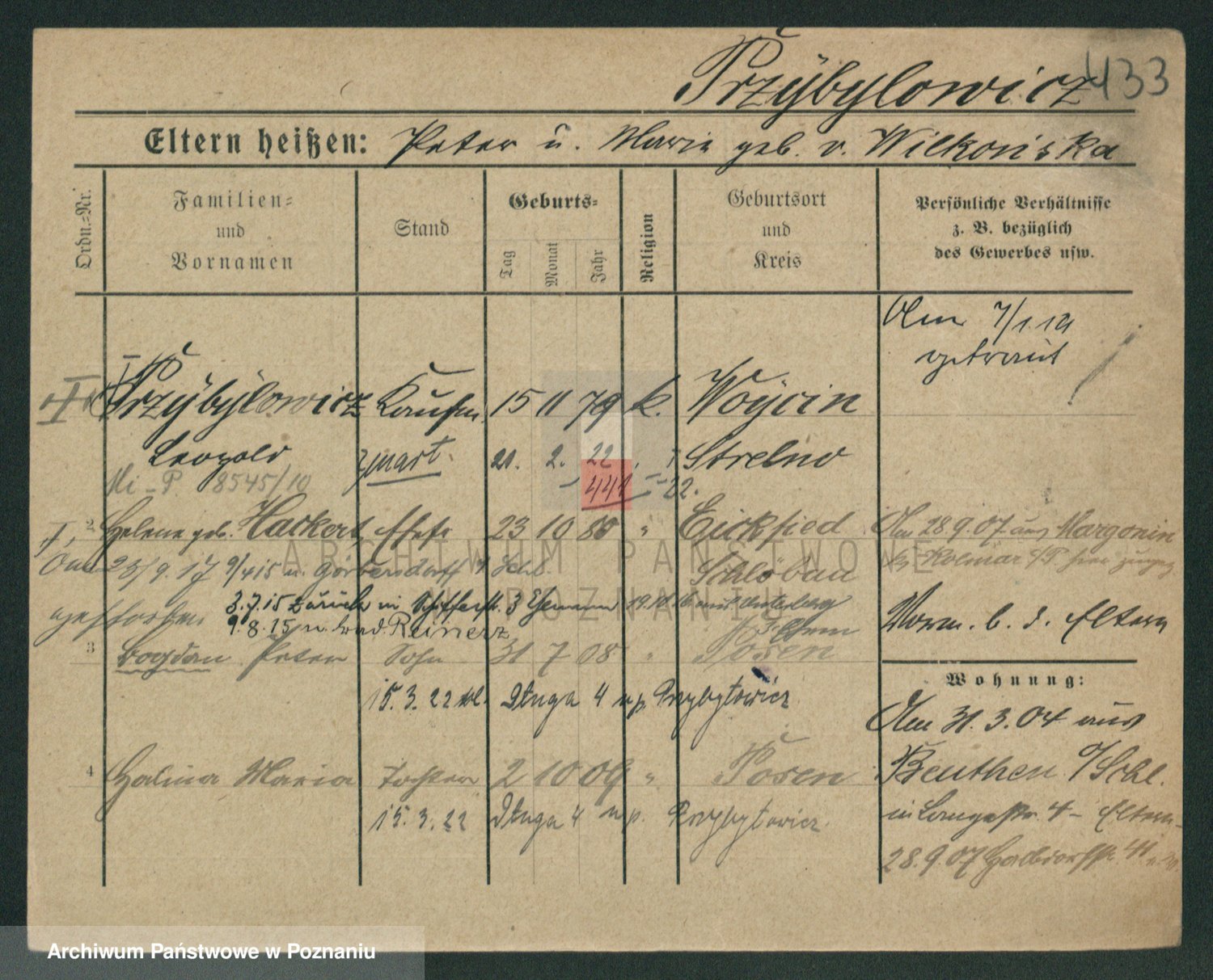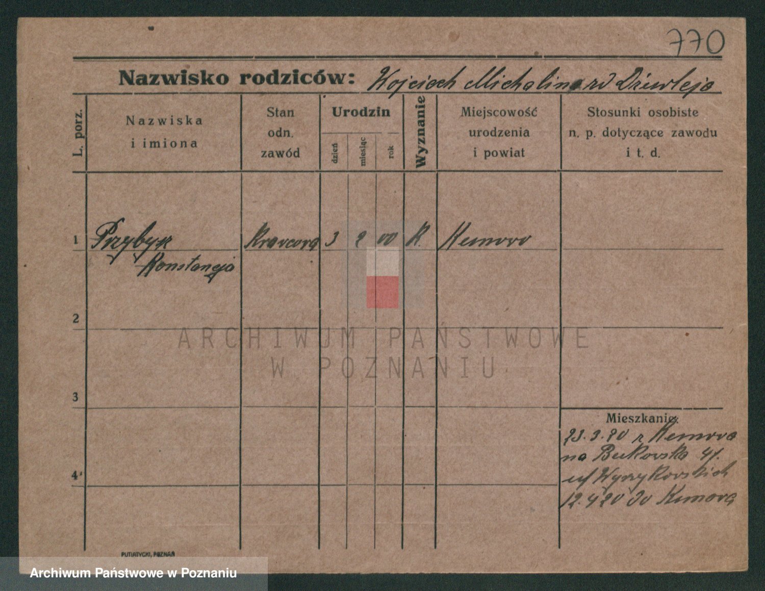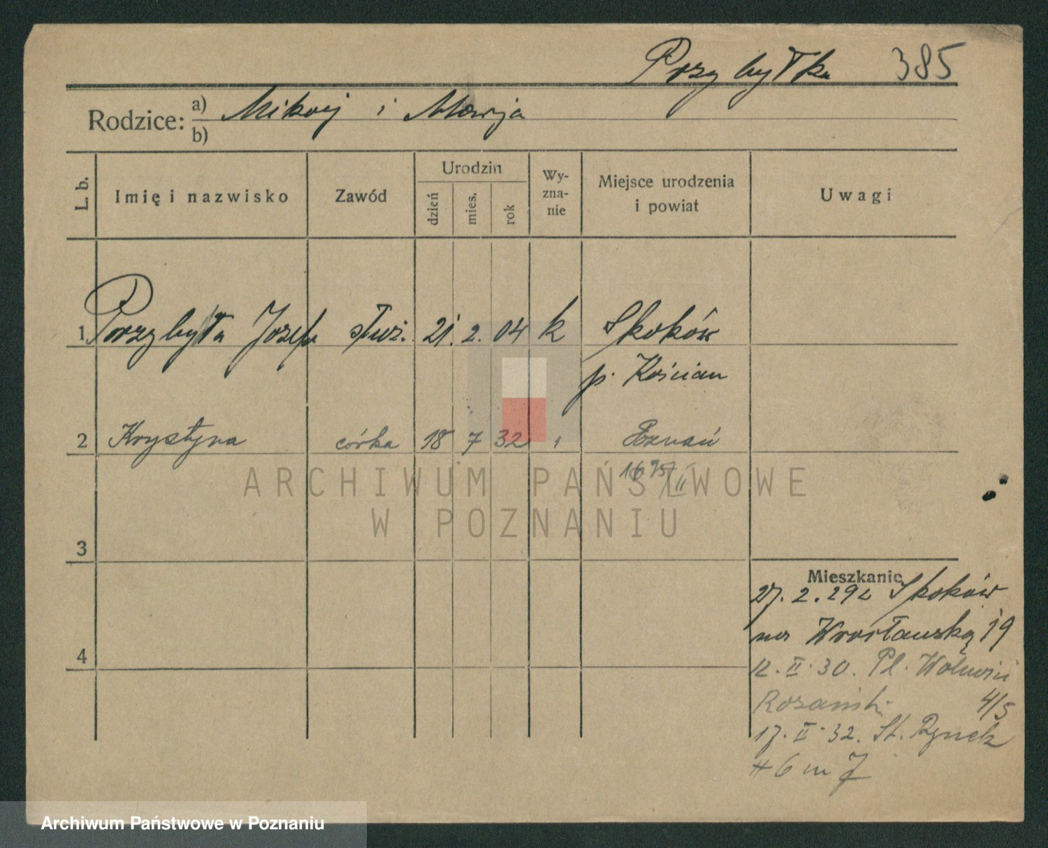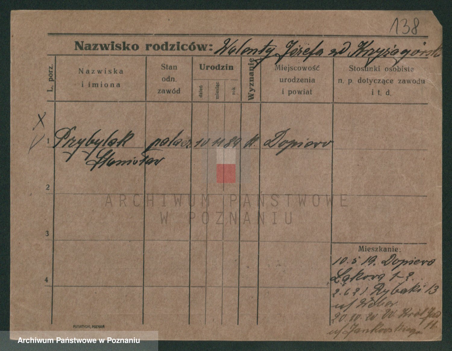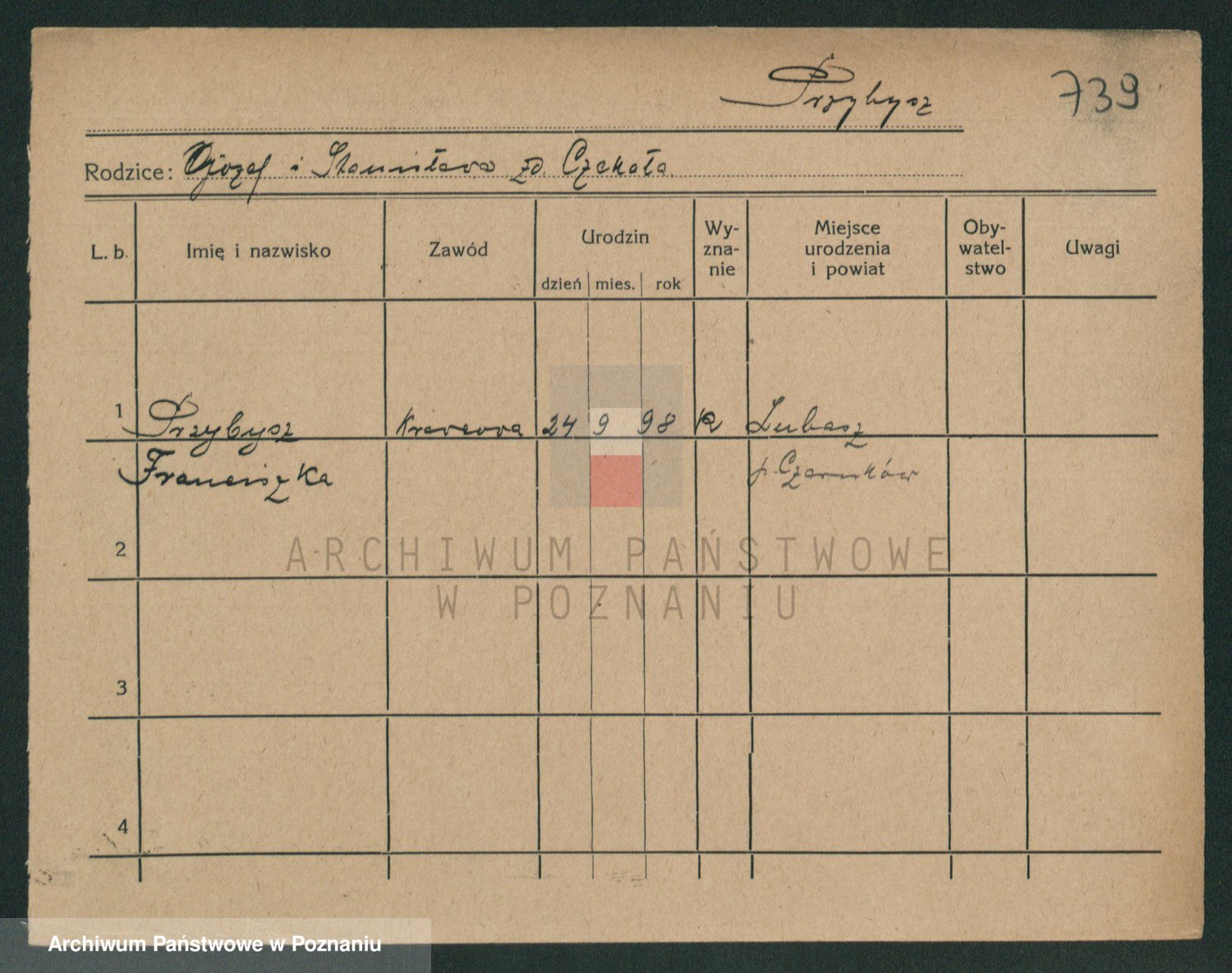 Podgląd karty osobowej dostępny jest po kliknięciu na nazwisko lub ikonkę karty. Można dokonywać powiększenia (ikony na górze) lub przechodzić między kolejnymi skanami (strzałki po bokach).