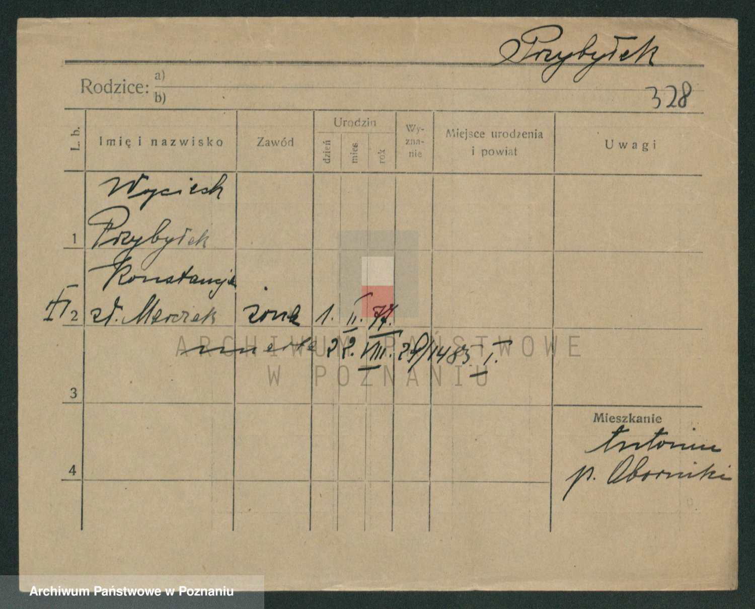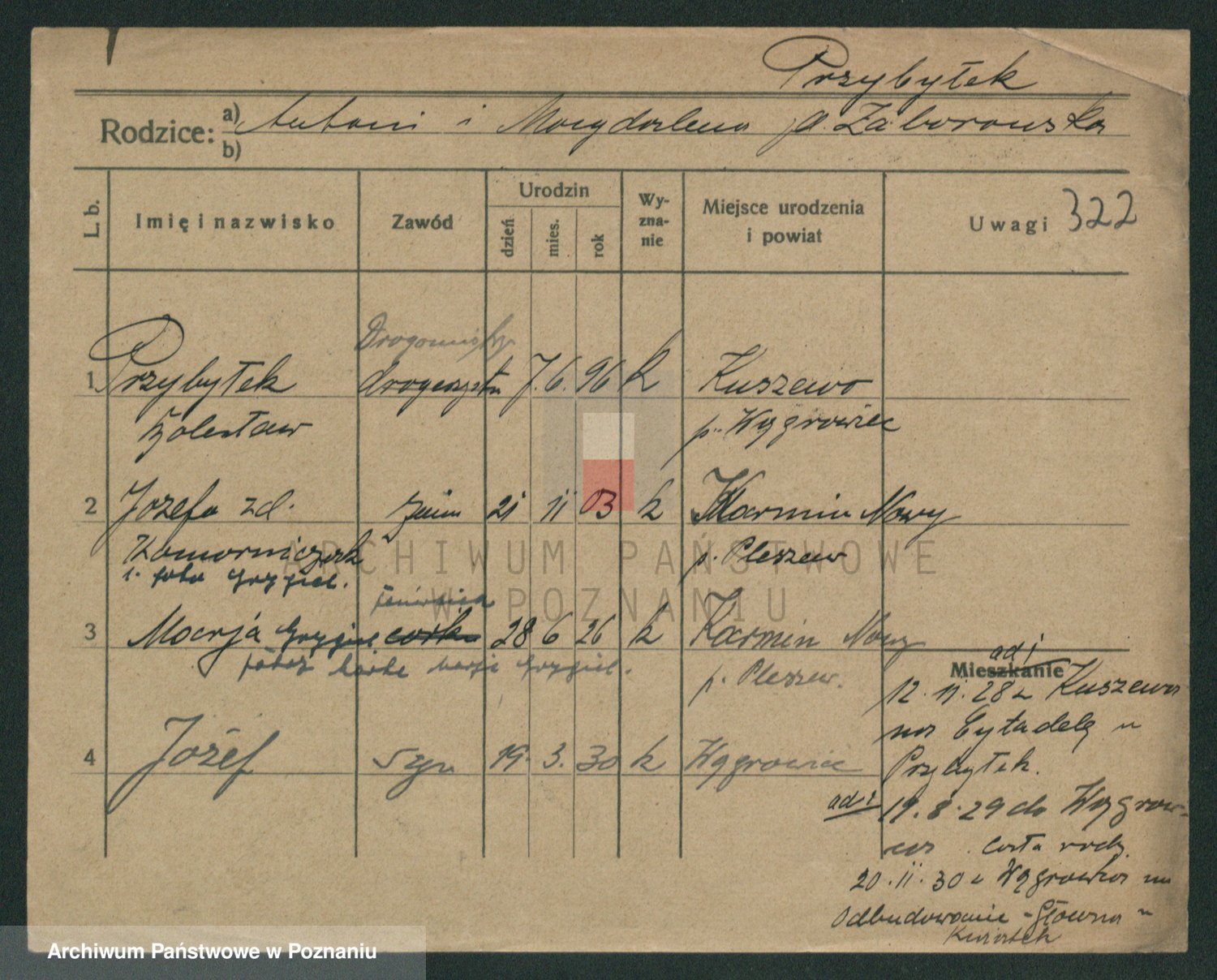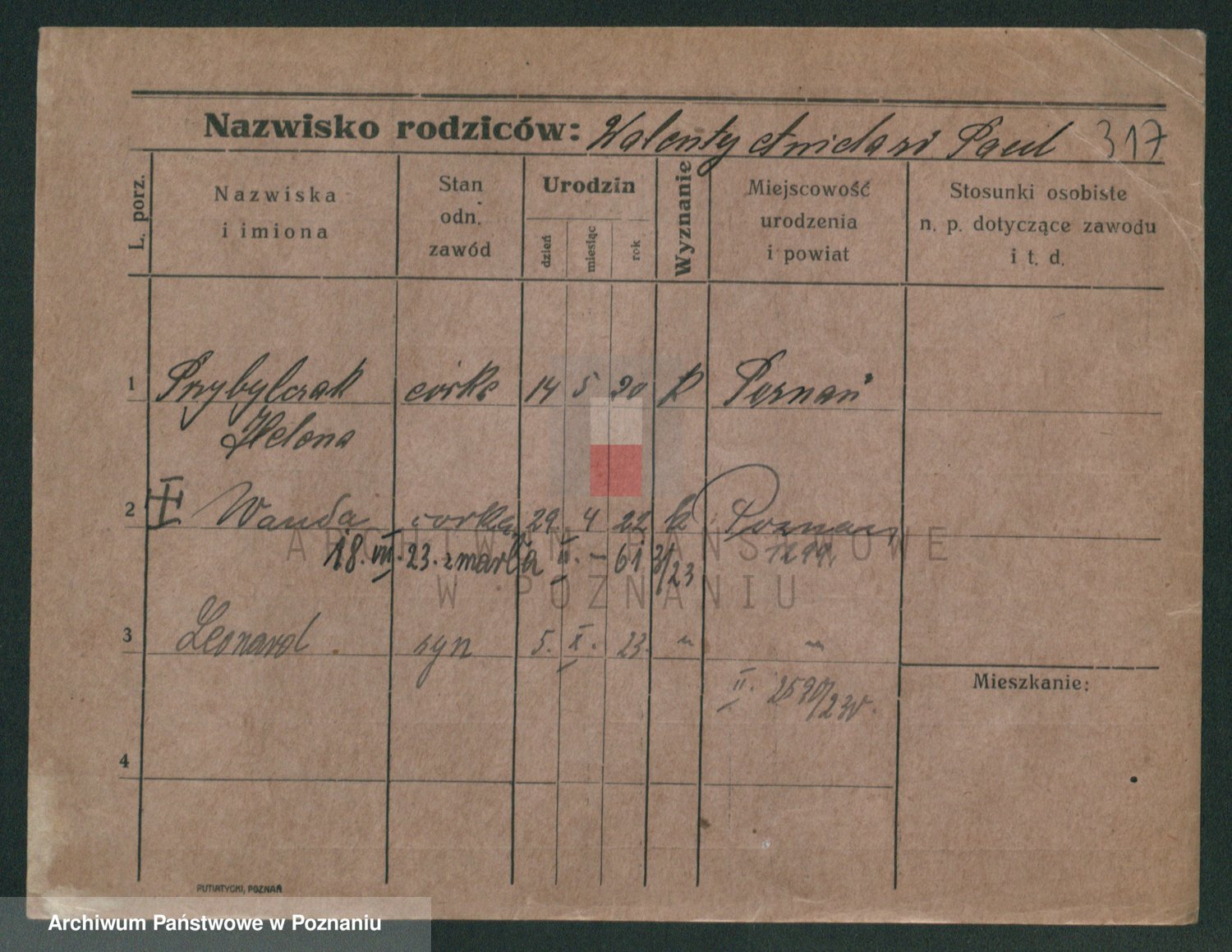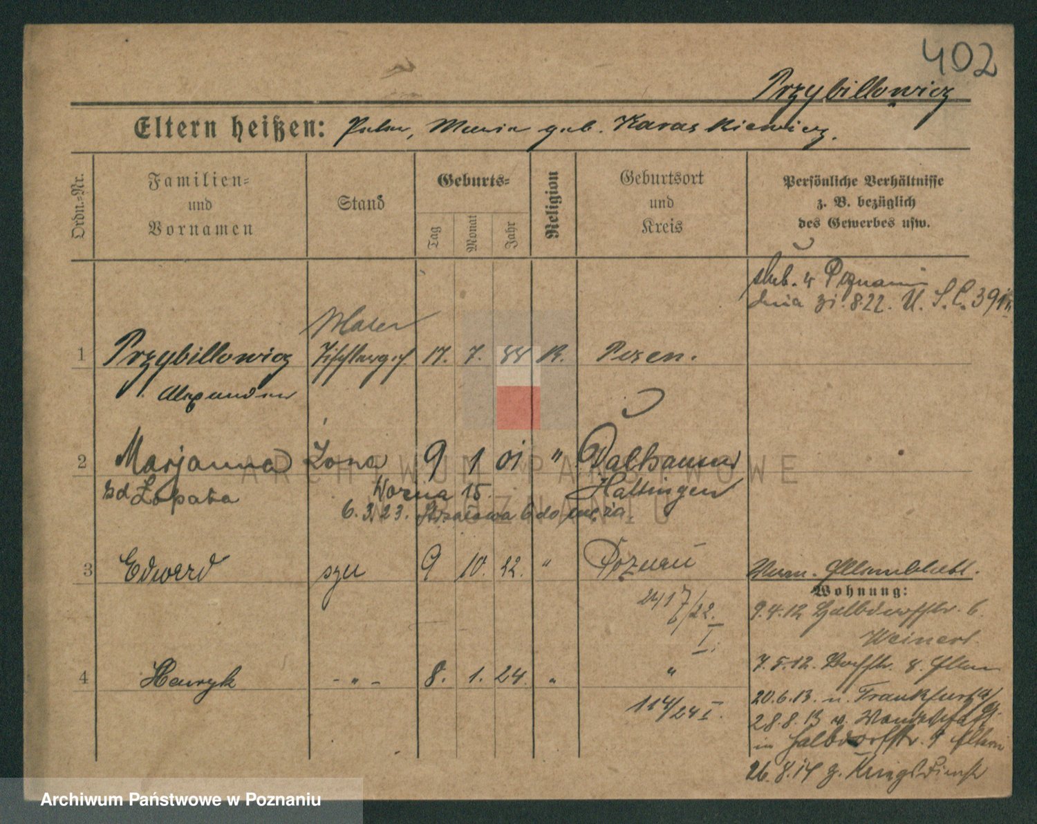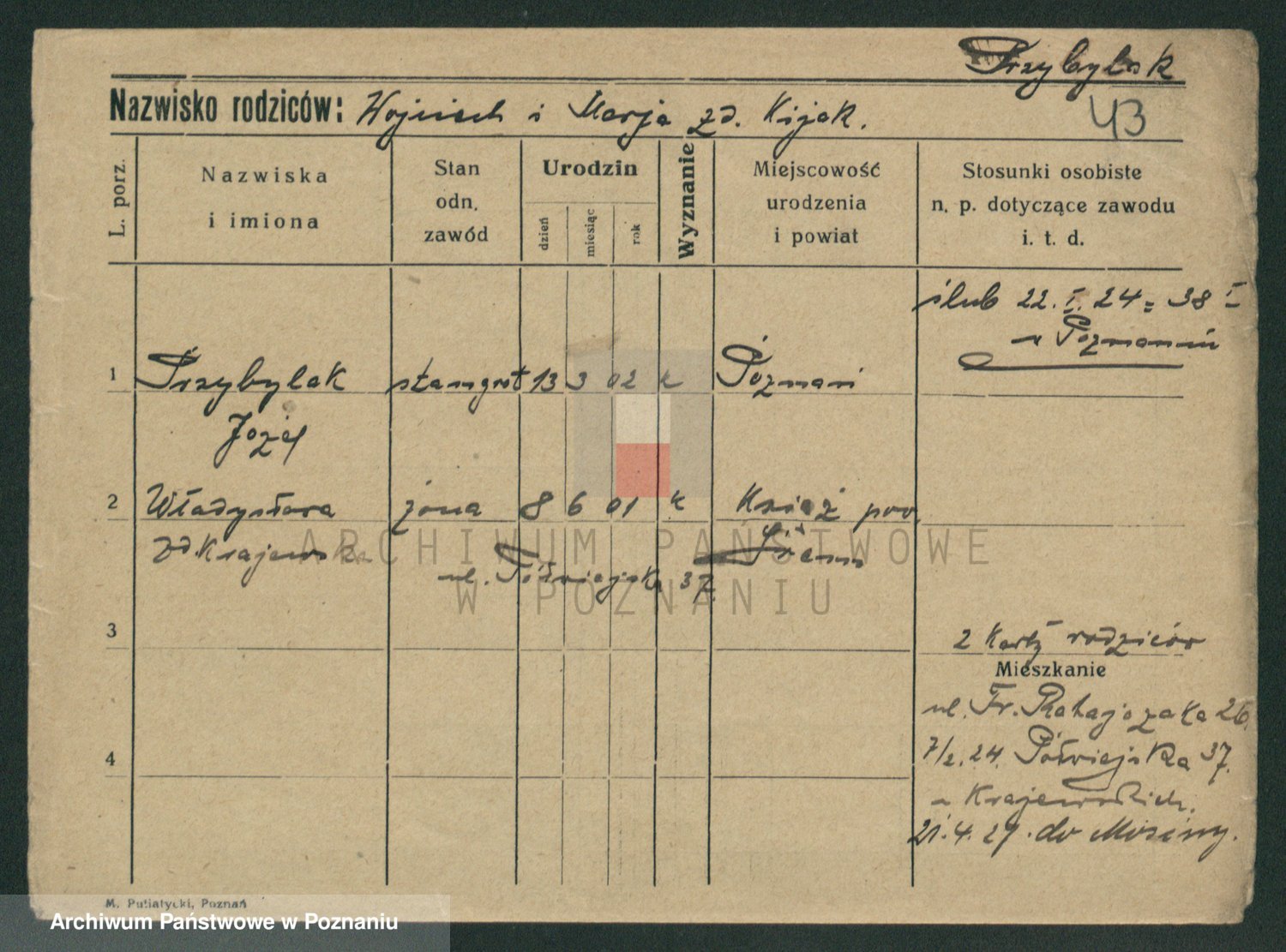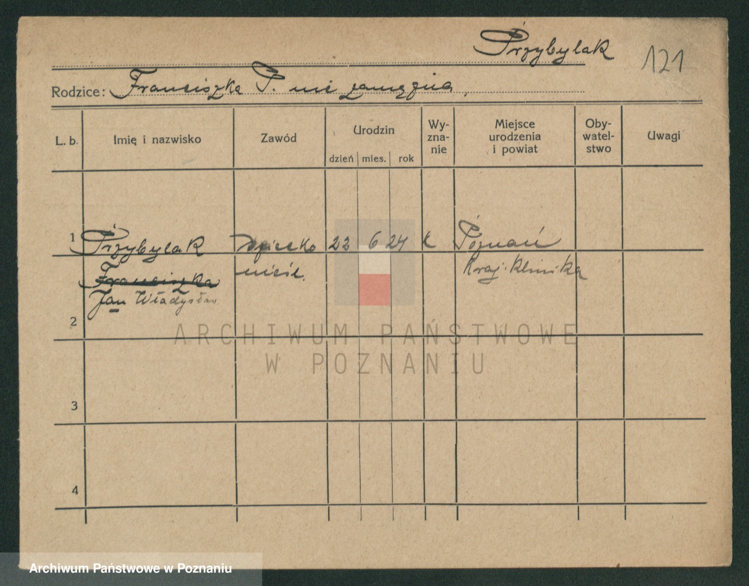 Podgląd karty osobowej dostępny jest po kliknięciu na nazwisko lub ikonkę karty. Można dokonywać powiększenia (ikony na górze) lub przechodzić między kolejnymi skanami (strzałki po bokach).